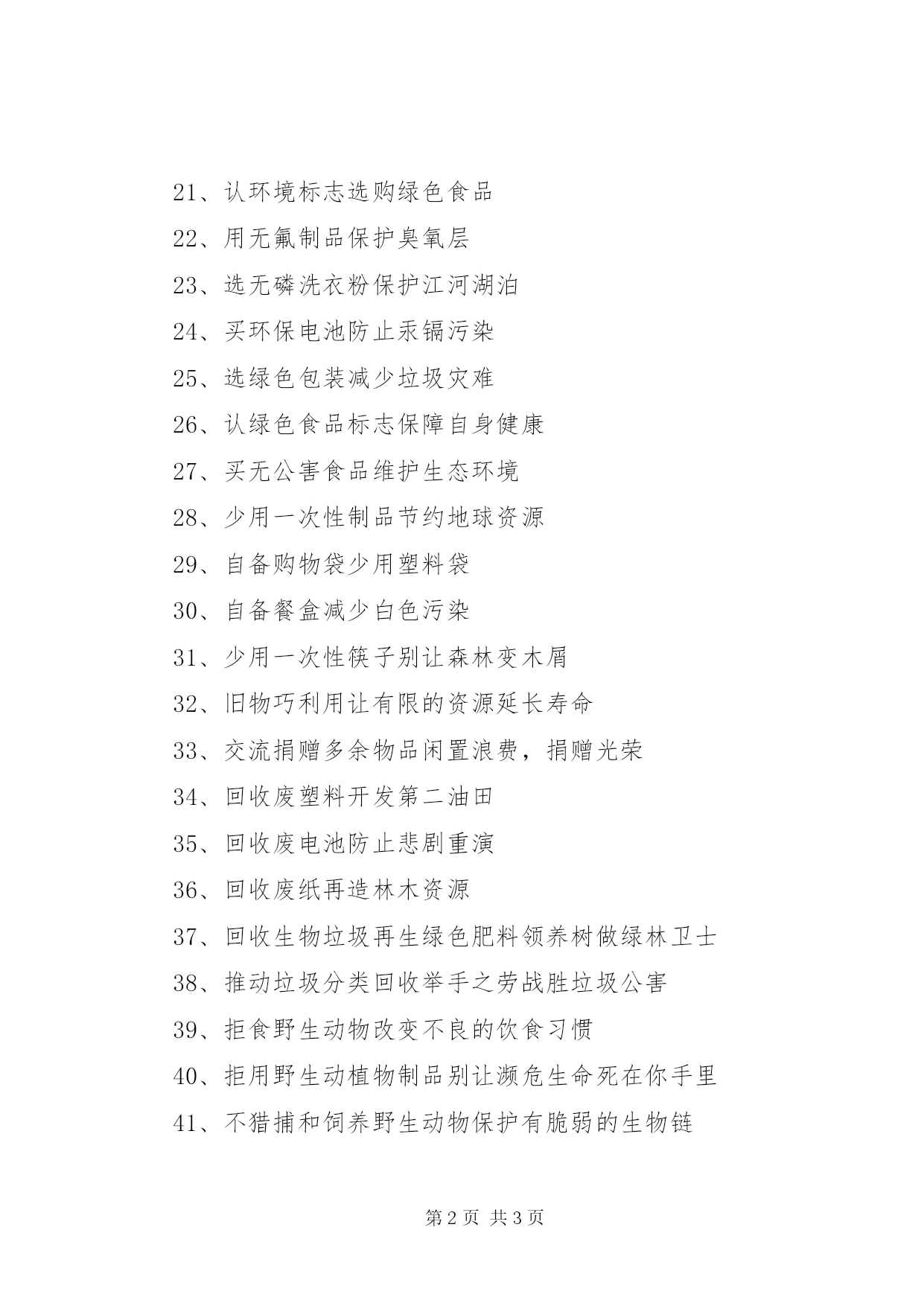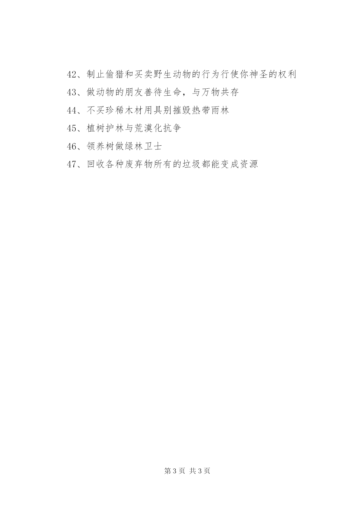 第PAGE\*Arabic\*MERGEFORMAT3页共NUMPAGES\*MERGEFORMAT3页公民环保行为规范标语大全1、关心大气质量别忘了你时刻都在呼吸2、监护水源保护水源就是保护生命3、一水多用让水重复使用4、阻止滴漏检查维修水龙头5、慎用清洁剂尽量用肥皂,减少水污染6、节水为荣随时关上水龙头,别让水白流。7、随手关灯省一度电,少一份污染8、节用电器为减缓地球温暖化出一把力9、减用空调降低能源消耗10、支持绿色照明人人都用节能灯11、利用可再生资源别等到能源耗竭的那一天12、做公交族以乘坐公共交通车为荣13、当自行车英雄保护大气,始于足下14、减少尾汽排放开车人的责任15、用无铅汽油开车人的选择16、使用再生纸减少森林砍伐17、替代贺年卡减轻地球负担18、节粮新时尚让节俭变成荣耀19、控制噪声污染让我们互相监督保护土地20、维护安宁环境让我们从自己做起21、认环境标志选购绿色食品22、用无氟制品保护臭氧层23、选无磷洗衣粉保护江河湖泊24、买环保电池防止汞镉污染25、选绿色包装减少垃圾灾难26、认绿色食品标志保障自身健康27、买无公害食品维护生态环境28、少用一次性制品节约地球资源29、自备购物袋少用塑料袋30、自备餐盒减少白色污染31、少用一次性筷子别让森林变木屑32、旧物巧利用让有限的资源延长寿命33、交流捐赠多余物品闲置浪费,捐赠光荣34、回收废塑料开发第二油田35、回收废电池防止悲剧重演36、回收废纸再造林木资源37、回收生物垃圾再生绿色肥料领养树做绿林卫士38、推动垃圾分类回收举手之劳战胜垃圾公害39、拒食野生动物改变不良的饮食习惯40、拒用野生动植物制品别让濒危生命死在你手里41、不猎捕和饲养野生动物保护有脆弱的生物链42、制止偷猎和买卖野生动物的行为行使你神圣的权利43、做动物的朋友善待生命,与万物共存44、不买珍稀木材用具别摧毁热带雨林45、植树护林与荒漠化抗争46、领养树做绿林卫士47、回收各种废弃物所有的垃圾都能变成资源