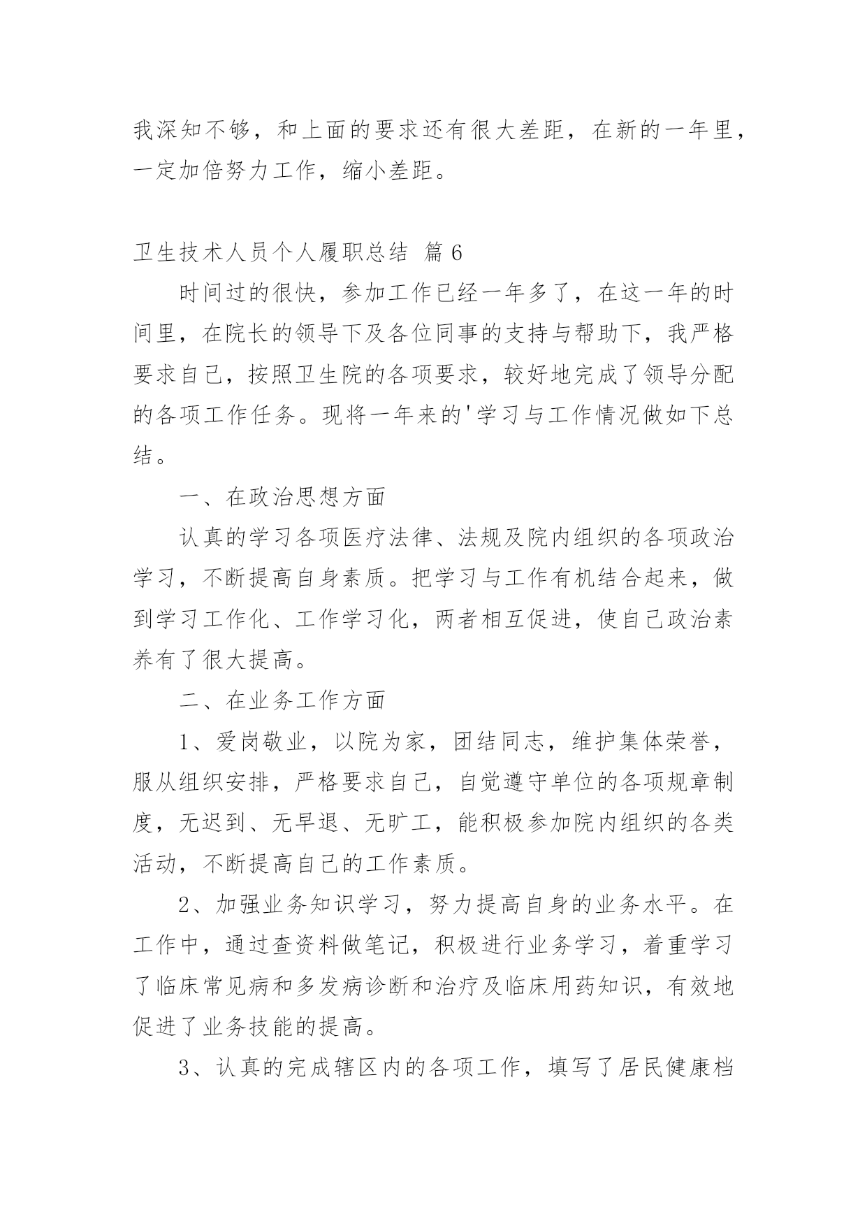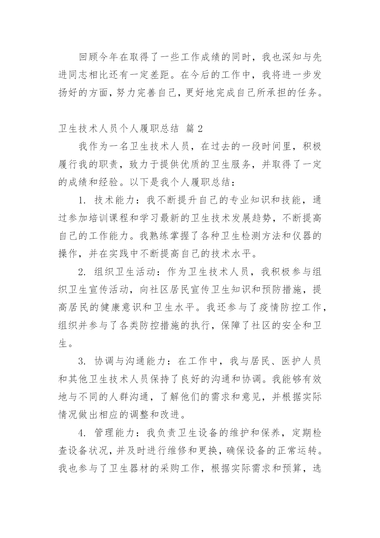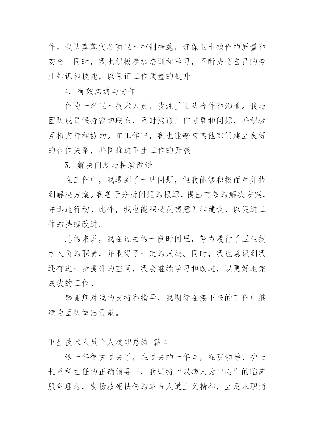 卫生技术人员个人履职总结篇1卫生技术人员个人履职总结合集10篇总结是对过去一定时期的工作、学习或思想情况进行回顾、分析,并做出客观评价的书面材料,它可以帮助我们总结以往思想,发扬成绩,让我们抽出时间写写总结吧。总结怎么写才能发挥它的作用呢?以下是小编为大家整理的卫生技术人员个人履职总结,欢迎阅读,希望大家能够喜欢。卫生技术人员个人履职总结篇120xx年我认真工作,加强理论学习,提高实践能力,较好的完成了所承担的各项工作任务。现将各方面情况简要总结如下:一、思想政治方面:思想上要求进步,政治觉悟高,努力保持共产党员的先进性和纯洁性。平时积极参加中心党组织举办的各类学习教育活动。认真参加学习,积极参加党组织的各类辅导活动。二、业务工作能力方面:积极参加职业卫生监管部门和上级疾控中心、本单位组织的各项业务培训,提高自己的专业技能以及履职能力。积极学习本科室业务相关的专业知识以及最新的法律、法规、标准等知识,努力做到结合实际应用。三、工作表现方面:责任心较强,对于自己承担的工作,努力做到保质保量完成;平时不无故迟到与早退。积极主动地做好办公室的卫生工作。在日常的工作中,工作态度认真、积极,敢于负责,不计较个人得失,工作勤勉,接待来访群众热情、耐心。四、工作成绩方面:职业病危害因素检测方面,全年先后参与职业病危害因素检测现场企业50余家。参加江苏省预防医学会“高级流行病学及公共卫生”研修班选拔考试,并被录取。3月21-4月10日参与放射工作人员体检与培训工作,共完成体检及培训人数千余人。4月放射技术资质、职业卫生技术资质培训报名。9月5-8日参加职业病诊断医师培训、放射技术服务资质培训。11月参与重点职业病调查,利用软件对重点职业病危害因素调查的数据进行录入与核对。12月底参加职业卫生专业技术人员培训。完成本年新购仪器设备的检定、确认、入库工作。按时完成职防科仪器设备的日常管理和维护工作,配合质管科,做好年度仪器设备检定、校准等日常仪器设备管理工作。参与本单位的.实验室认可、计量认证考核工作,完成自己所承担的任务。全年参与现场职业卫生现场调查收集整理材料,现场检测,完成职业病危害评价报告初稿4份。五、廉洁自律方面:严格遵守和执行本中心工作纪律,主动接受组织和人民群众的监督。廉洁奉公,不利用工作之便谋私利;节约水电,不贪图享受。日常工作过程中刻铭记自己是一名党员,以身作则,严格要求自己。回顾今年在取得了一些工作成绩的同时,我也深知与先进同志相比还有一定差距。在今后的工作中,我将进一步发扬好的方面,努力完善自己,更好地完成自己所承担的任务。卫生技术人员个人履职总结篇2我作为一名卫生技术人员,在过去的一段时间里,积极履行我的职责,致力于提供优质的卫生服务,并取得了一定的成绩和经验。以下是我个人履职总结:1.技术能力:我不断提升自己的专业知识和技能,通过参加培训课程和学习最新的卫生技术发展趋势,不断提高自己的工作能力。我熟练掌握了各种卫生检测方法和仪器的操作,并在实践中不断提高自己的技术水平。2.组织卫生活动:作为卫生技术人员,我积极参与组织卫生宣传活动,向社区居民宣传卫生知识和预防措施,提高居民的健康意识和卫生水平。我还参与了疫情防控工作,组织并参与了各类防控措施的执行,保障了社区的安全和卫生。3.协调与沟通能力:在工作中,我与居民、医护人员和其他卫生技术人员保持了良好的沟通和协调。我能够有效地与不同的人群沟通,了解他们的需求和意见,并根据实际情况做出相应的调整和改进。4.管理能力:我负责卫生设备的维护和保养,定期检查设备状况,并及时进行维修和更换,确保设备的正常运转。我也参与了卫生器材的采购工作,根据实际需求和预算,选择适合的.器材,并与供应商进行合作和协商。5.问题解决能力:在工作中,我经常面临各种问题和挑战,如卫生检测结果异常、设备故障等。我善于分析问题的原因,并采取相应的措施解决问题,保障卫生工作的正常进行。通过以上工作经历和所取得的成绩,我进一步锻炼了自己的专业素养和综合能力。在未来的工作中,我将继续努力提升自己的专业水平,为卫生服务做出积极贡献。卫生技术人员个人履职总结篇3在过去的一段时间里,我作为一名卫生技术人员,我努力工作,扎实完成了自己的职责。现在,我将总结我工作的成果,并向您汇报。1.履行日常职责作为卫生技术人员,我按时出勤,认真履行了日常的工作职责。我负责维护和管理卫生设备,确保其正常运行,并及时处理设备故障。同时,我负责监督和检查卫生操作的`执行情况,确保卫生操作符合相关规范和标准。2.提高工作效率为了提高工作效率,我积极采用改进措施,并应用新的卫生技术和设备,以提高工作质量。我与团队成员合作,共同研究问题,并提出解决方案,有效地提高了工作效率。3.保证工作质量在工作过程中,我注重细节并严格按照卫生标准进行操作。我