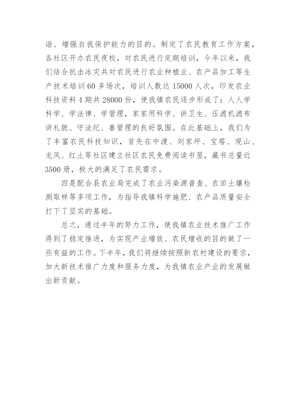 乡镇农业技术推广半年的工作总结乡镇农业技术推广半年的工作总结今年以来,我们围绕抗击冰灾、抗灾增收、发展优势产业,消除农业污染、保证农产品质量安全,推广农业实用新技术、减少农业投入、降低生产成本开展了各项实质性的工作。首先,我们从柑橘低产园改造入手,完成了1000亩密植橘园的密改稀、配合县农业局对全镇橘园、耕地实施测土配方施肥,完成农田土壤取样300多个,为指导全镇农作物合理施肥提供了可靠依据。同时,在全镇范内开展作物病虫综合防治,使全镇柑橘长势旺盛、着果良好,为大灾之年稳产增收打下坚实基础。此外,我们还根据我镇柑橘在生产上、生产技术水平不一致,产量效益悬殊太大,在经营上各自为政,规模效益难以发挥的实际。镇柑橘同业公会加大工作力度,加强体系建设,在进一步扩大镇柑橘同业公会的基础上,成功的引导龙凤、二天门、红土坡、荷花、永固等社区分别成立了以规范柑橘生产技术、加工技术、经营方式为目的柑橘专业合作社,形成了良好的产业体系和出口基地认证建设体系。其次,围绕保证城市蔬菜供给,开展了以刘家坪、中渡、宝塔、黄泥、双新、红土等社区为主的商品蔬菜生产基地建设,新扩蔬菜面积500亩,使全镇商品蔬菜面积达到3000亩,创造了大灾之年蔬菜头季亩产值4500元的好收益。为丰富县城蔬菜市场和城郊居民增收做出了重要贡献。滤布在此基础上,我们强化了刘家坪无公害蔬菜生产基地的管理,扩大了刘家坪蔬菜协会规模,使该基地生产、经营走上了良性发展轨道,并使该基地今年头季亩平产值达到了5000元的好效益,使这个国家级科技示范基地发挥了应有的示范效果。三是制定了《楚江镇民营农产品加工企业以奖代投方案》,鼓励和扶持本镇农民独资或合资从事农产品加工事业,完善了“双红柑橘打蜡加工厂”、“三江柑橘打蜡加工厂”、“红土柑橘打蜡加工厂”、“金湘源果蔬加工厂”的出口加工基地手续,扩建了“红阳柑橘打蜡加工厂”,使全镇年加工总量达到25000吨,可创产业附加值600万元。五是推进新型流通业发展,继续开展了王中东物流先进典型事迹宣传活动,引导有一定业务基础的农民进入新型流通行业搞活地方产品流通,促进产业发展。今年,全镇共培置柑橘通大户85个,其中:营销大户66个,营销总量可达1万吨,配载大户19个,汽运配载总量达3000多车次,运载总量可达9万吨。四是着力提高农民素质,顺利推进社会主义新农村建设的核心,为此,我们在制定社会主义新农村发展工作规划时,就把对农民的教育放在重中之重的位置,成立了以镇远教办为核心,并组织镇农技、畜牧、林业、农机、计生、司法所等站所参与的农民教育办公室,通过对农民的系统教育以达到:提高农民生产技术、经营、管理水平。改进生活方式、提高生活质量和自我保健能力。提高法制水平、促进社会和谐、增强自我保护能力的目的。制定了农民教育工作方案,各社区开办农民夜校,对农民进行定期培训,今年以来,我们结合抗击冰灾共对农民进行农业种植业、农产品加工等生产技术培训60多场次,培训人数达15000人次,印发农业科技资料4期共28000份,使我镇农民逐步形成了:人人学科学、学法律、学管理,家家用科学、讲卫生、压滤机滤布讲礼貌、守法纪、善管理的良好氛围。在此基础上,我们为了丰富农民科技知识,首先在中渡、刘家坪、宝塔、观山、龙凤、红土等社区建立社区农民免费阅读书屋,藏书总量近3500册,极大的满足了农民需求。四是配合县农业局完成了农业污染源普查、农田土壤检测取样等多项工作,为指导我镇科学施肥、农产品质量安全打下了坚实的基础。总之,通过半年的努力工作,使我镇农业技术推广工作得到了稳定推进,为实现产业增效、农民增收的目的做了一些有益的工作。下半年,我们将继续按照新农村建设的要求,加大新技术推广力度和服务力度,为我镇农业产业的发展做出新贡献。
