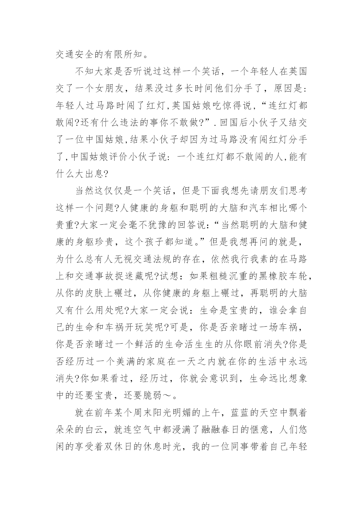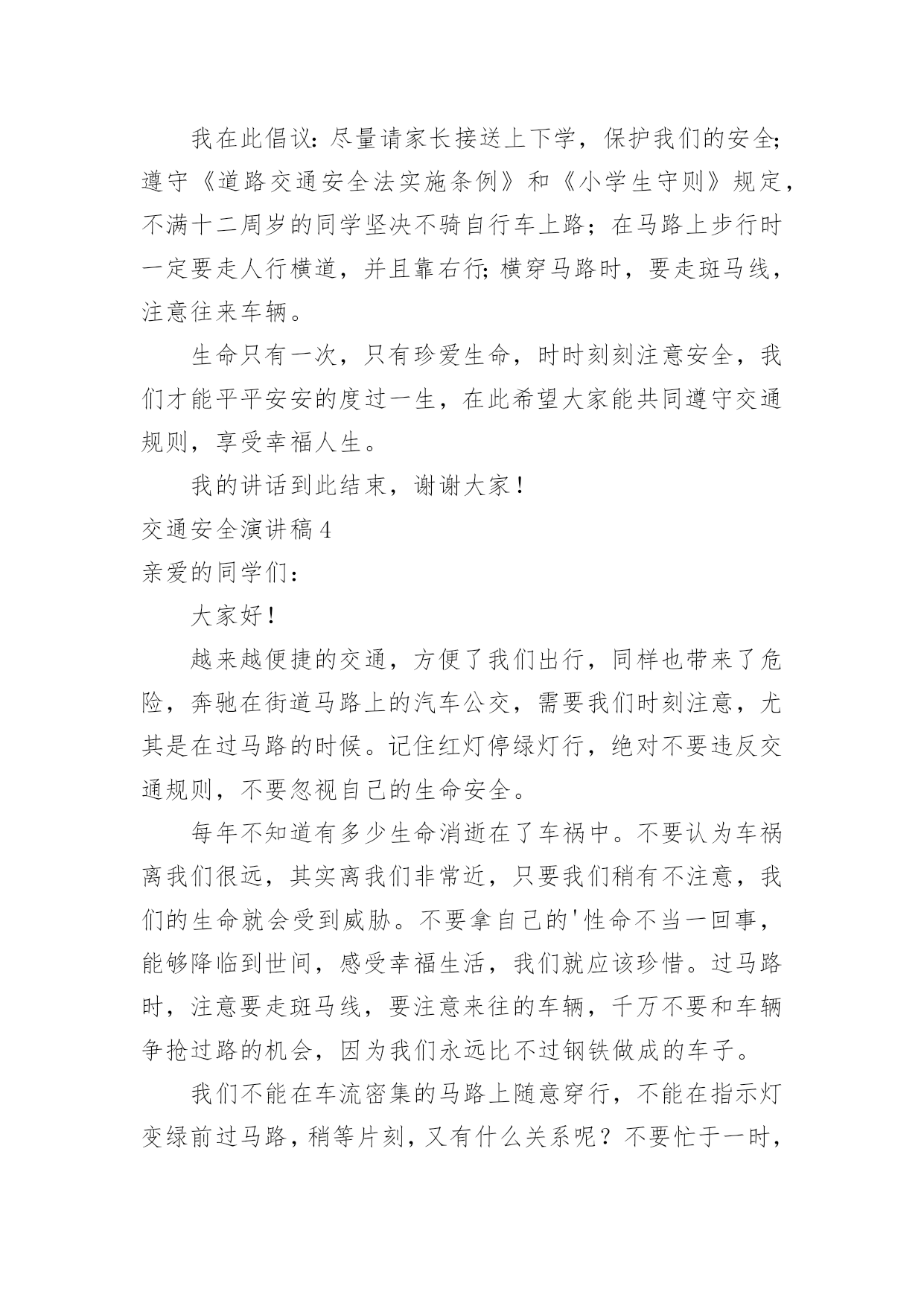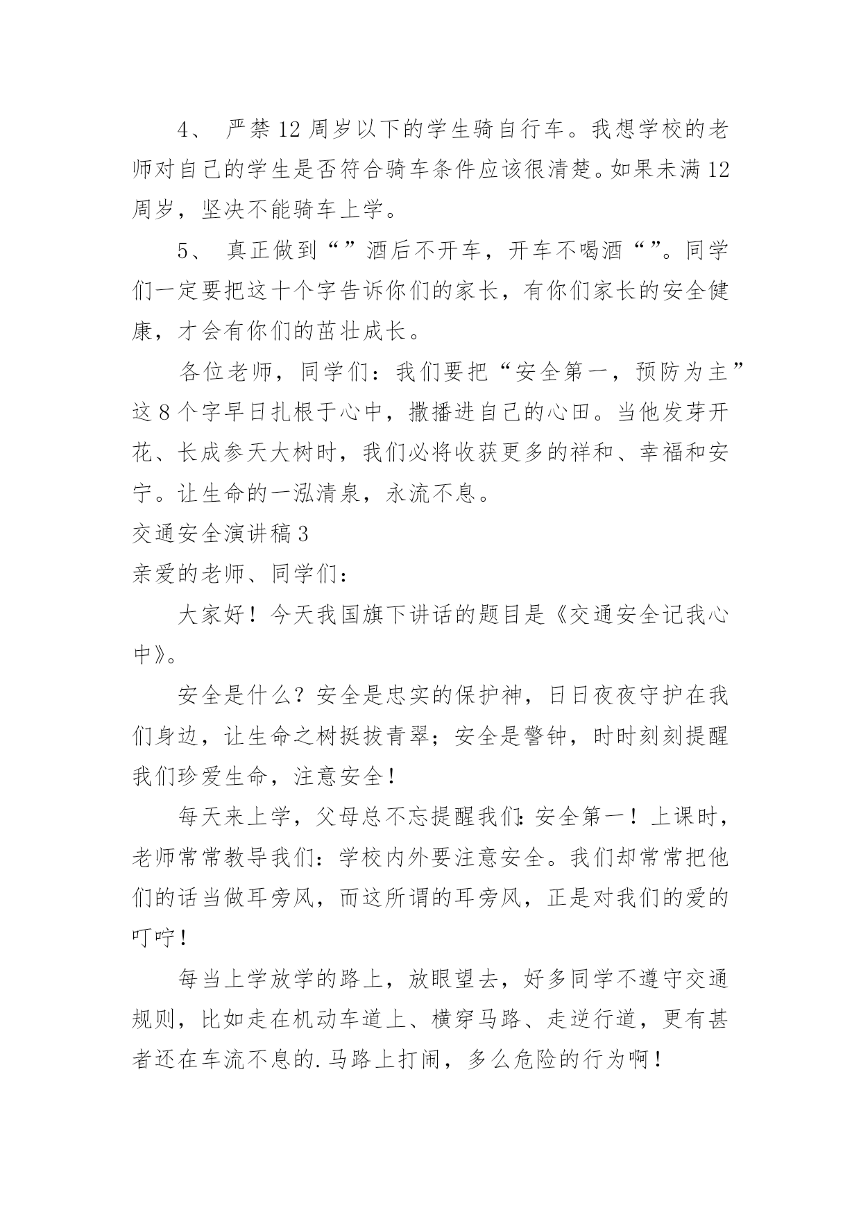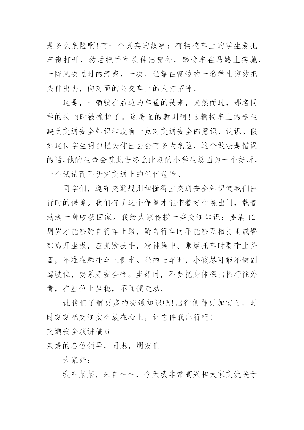 交通安全演讲稿交通安全演讲稿(优秀)好的演讲稿可以引导听众,使听众能更好地理解演讲的内容。在社会发展不断提速的今天,接触并使用演讲稿的人越来越多,那么一般演讲稿是怎么写的呢?以下是小编为大家整理的交通安全演讲稿,欢迎大家借鉴与参考,希望对大家有所帮助。交通安全演讲稿1敬爱的老师们,亲爱的同学们:大家好!“安全在我心,时刻要牢记!”全在我心中,学好安全,做到安全。今天,就让我们来学学安全,走入安全世界。安全有好多种,现在我就给你们讲四种安全:首先是步行安全常识,为什么要讲步行呢?因为在我们步行当中会遇到许多困难、事故、障碍需要我们去解决。当我们外出时,注意要走我们专用的'人行横道内,如果碰到没有人行横道的地方,要靠右侧行走。横过马路时,需走过街天桥、地下通道,当碰到没有天桥或地下通道的时候要走人行横道;在没划人行横道的地方横过马路时要左右看,注意来往车辆,请不要斜穿、猛跑;当在过十字路口时,要听从交通民警的指挥遵守交通信号。接下来,我就给你们讲一讲第二种安全,这个安全是骑车的安全常识,骑车上学或外出的同学们,出门前一定要先检查一下车辆的有些地方有所损坏,保证没有问题以后方可上路。在道路上要在非机动车到内行驶,路上没有画骑车车到,要靠右行走,不要逆行;不要扶着肩膀并行,手千万不要离开车把,会发生严重受伤,不攀爬其他任何车辆,不再人行道上骑车。第三种安全是驾车安全,在出门前认真检查车辆,一定要确认无故障后方可出车行动,行车时注意路上标牌,看好信号灯,不要违章,另外一定不要酒后驾车,酒后开车是很危险的。第四种常识是乘车安全常识,乘车时,要先下后上,一定要排队上车,不要乱拥乱挤,以免踩伤人或为小偷提供条件,这就是乱拥乱挤的后果,车停稳时才能上下车,不能抢车,有老人乘车时,主动给老人让座,上下车时主动扶老人。乘车时不能将头手伸出窗外,以免受到伤害。乘长途车时不要睡觉,以免在司机急刹车时,巨大的惯性可能给你造成伤害。安全的重要性是百分之百,要时刻牢记安全,人说:“没有一万,只有万一”,要把安全牢牢记在自己的心中。交通安全演讲稿2各位同学们:大家好,今天我们相聚在一起,我想老师和同学们的目的就在于加大交通安全的宣传力度、提高我们的交通安全意识,从而使我们的交通管理工作进行地更有效更彻底。而我认为这一切的最根本保证就是大家对交通法规的自觉遵守。随着时代的发展,交通在我们的日常生活中发挥着越来越重要的作用,随之而来的便是交通问题的日趋严重和交通管理手段及方式的日新月异的变化,在如此快节奏的背景下,可以说从你到我,从司机到行人,每一个人都穿梭在红绿灯的交替变换中。红绿灯似乎成了现代交通的代名词。人们就是这样在红绿灯下演绎着一个个属于自己的角色,演奏出一曲曲属于自己的生命交响乐!人的生命是最宝贵的,只有有了生命才能创造财富,才能使世界变得更加美好。只有同学们的欢声笑语、活泼身影,才能使我们的`校园充满阳光,生机勃勃。人的生命也是脆弱的,生命如果发生了什么意外,会留下永远的伤痕;健全身体一旦失去,将永远无法挽回。因此,我们应该好好珍惜我们生命中的每一天,在生活中注意安全,让自己安全健康的成长。让我们每一个人永远平安、快乐!让我们时刻牢记:珍爱生命,安全第一!所以,在此,在庄严的国旗下我们向全体师生发出倡议:1、我们要认真学习交通安全的法制法规,遵守交通规则。加强安全意识,树立交通安全文明公德;2、当我们徒步行走于人来车往的马路时,请时刻保持清醒的头脑,不在马路上嬉戏打闹;3、当我们过马路时,多一份谦让与耐心,不闯红灯,走人行横道,决不能为贪一时之快,横穿马路;4、严禁12周岁以下的学生骑自行车。我想学校的老师对自己的学生是否符合骑车条件应该很清楚。如果未满12周岁,坚决不能骑车上学。5、真正做到“”酒后不开车,开车不喝酒“”。同学们一定要把这十个字告诉你们的家长,有你们家长的安全健康,才会有你们的茁壮成长。各位老师,同学们:我们要把“安全第一,预防为主”这8个字早日扎根于心中,撒播进自己的心田。当他发芽开花、长成参天大树时,我们必将收获更多的祥和、幸福和安宁。让生命的一泓清泉,永流不息。交通安全演讲稿3亲爱的老师、同学们:大家好!今天我国旗下讲话的题目是《交通安全记我心中》。安全是什么?安全是忠实的保护神,日日夜夜守护在我们身边,让生命之树挺拔青翠;安全是警钟,时时刻刻提醒我们珍爱生命,注意安全!每天来上学,父母总不忘提醒我们:安全第一!上课时,老师常常教导我们:学校内外要注意安全。我们却常常把他们的话当做耳旁风,而这所谓的耳旁风,正是对我们的爱的叮咛!每当上学放学的路上,放眼望去,好多同学不遵守交通规则,比如走在机动车道上、横穿马路、走逆行道,更有甚者还在车流不息的.马路上打闹,多么危险的行为啊!我在此倡议:尽量请家长接送上下学,保护我们的安全;