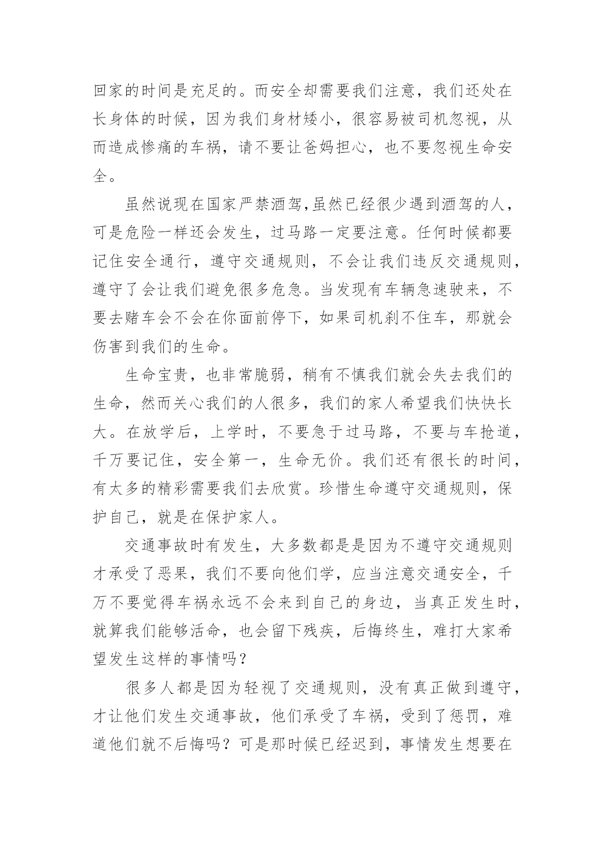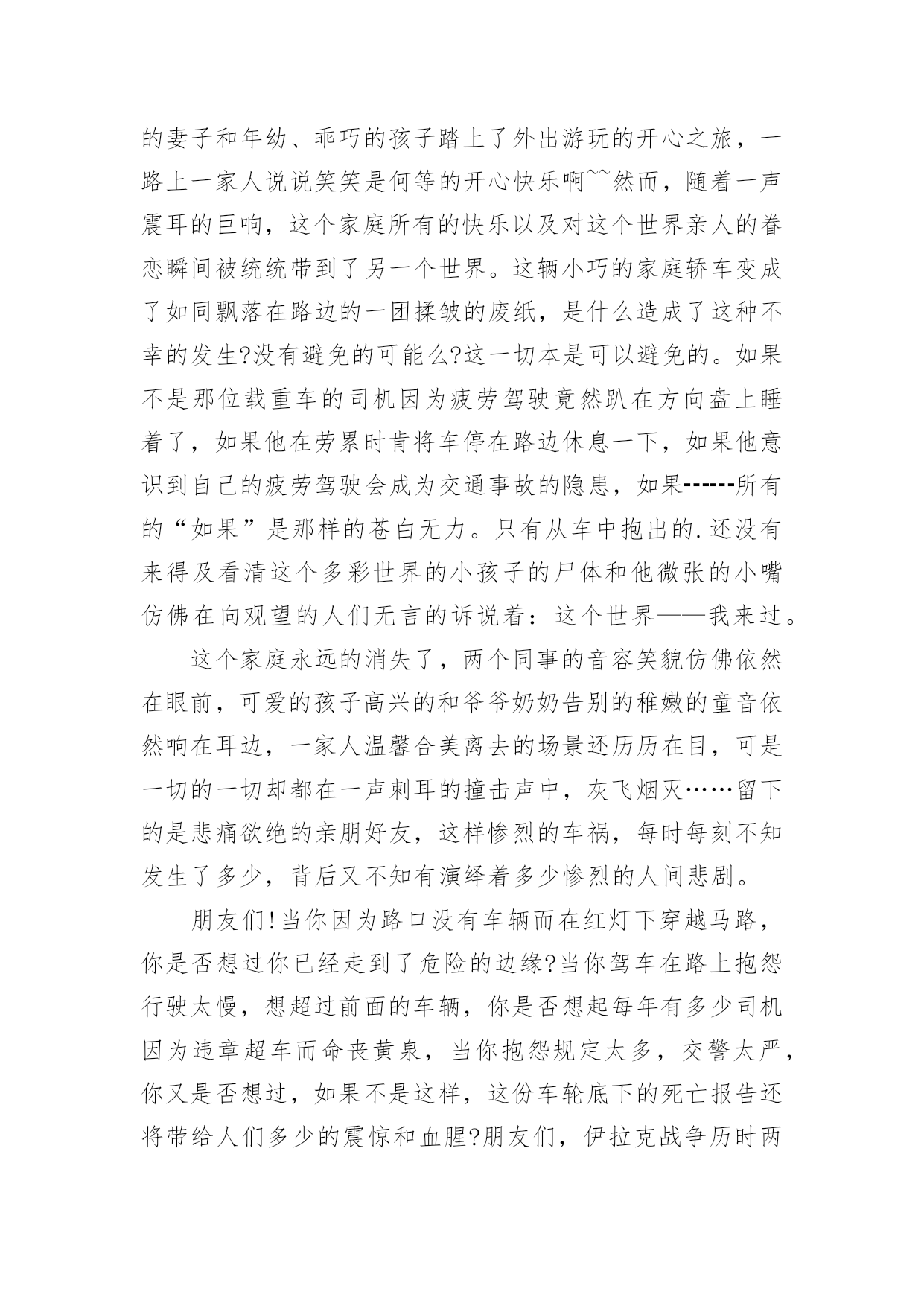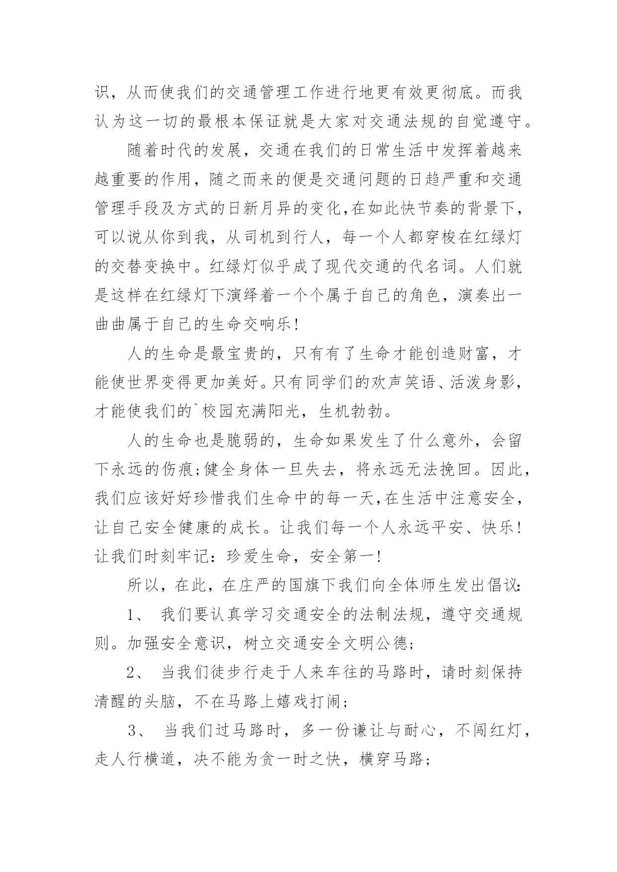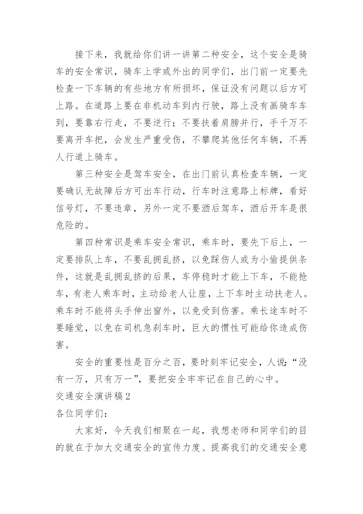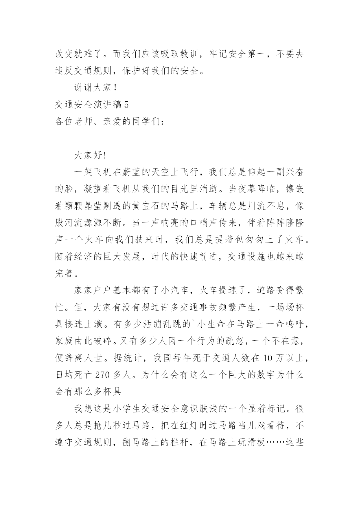 交通安全演讲稿交通安全演讲稿(优秀)好的演讲稿可以引导听众,使听众能更好地理解演讲的内容。在社会发展不断提速的今天,接触并使用演讲稿的人越来越多,那么一般演讲稿是怎么写的呢?以下是小编为大家整理的交通安全演讲稿,欢迎大家借鉴与参考,希望对大家有所帮助。交通安全演讲稿1敬爱的老师们,亲爱的同学们:大家好!“安全在我心,时刻要牢记!”全在我心中,学好安全,做到安全。今天,就让我们来学学安全,走入安全世界。安全有好多种,现在我就给你们讲四种安全:首先是步行安全常识,为什么要讲步行呢?因为在我们步行当中会遇到许多困难、事故、障碍需要我们去解决。当我们外出时,注意要走我们专用的'人行横道内,如果碰到没有人行横道的地方,要靠右侧行走。横过马路时,需走过街天桥、地下通道,当碰到没有天桥或地下通道的时候要走人行横道;在没划人行横道的地方横过马路时要左右看,注意来往车辆,请不要斜穿、猛跑;当在过十字路口时,要听从交通民警的指挥遵守交通信号。接下来,我就给你们讲一讲第二种安全,这个安全是骑车的安全常识,骑车上学或外出的同学们,出门前一定要先检查一下车辆的有些地方有所损坏,保证没有问题以后方可上路。在道路上要在非机动车到内行驶,路上没有画骑车车到,要靠右行走,不要逆行;不要扶着肩膀并行,手千万不要离开车把,会发生严重受伤,不攀爬其他任何车辆,不再人行道上骑车。第三种安全是驾车安全,在出门前认真检查车辆,一定要确认无故障后方可出车行动,行车时注意路上标牌,看好信号灯,不要违章,另外一定不要酒后驾车,酒后开车是很危险的。第四种常识是乘车安全常识,乘车时,要先下后上,一定要排队上车,不要乱拥乱挤,以免踩伤人或为小偷提供条件,这就是乱拥乱挤的后果,车停稳时才能上下车,不能抢车,有老人乘车时,主动给老人让座,上下车时主动扶老人。乘车时不能将头手伸出窗外,以免受到伤害。乘长途车时不要睡觉,以免在司机急刹车时,巨大的惯性可能给你造成伤害。安全的重要性是百分之百,要时刻牢记安全,人说:“没有一万,只有万一”,要把安全牢牢记在自己的心中。交通安全演讲稿2各位同学们:大家好,今天我们相聚在一起,我想老师和同学们的目的就在于加大交通安全的宣传力度、提高我们的交通安全意识,从而使我们的交通管理工作进行地更有效更彻底。而我认为这一切的最根本保证就是大家对交通法规的自觉遵守。随着时代的发展,交通在我们的日常生活中发挥着越来越重要的作用,随之而来的便是交通问题的日趋严重和交通管理手段及方式的日新月异的变化,在如此快节奏的背景下,可以说从你到我,从司机到行人,每一个人都穿梭在红绿灯的交替变换中。红绿灯似乎成了现代交通的代名词。人们就是这样在红绿灯下演绎着一个个属于自己的角色,演奏出一曲曲属于自己的生命交响乐!人的生命是最宝贵的,只有有了生命才能创造财富,才能使世界变得更加美好。只有同学们的欢声笑语、活泼身影,才能使我们的`校园充满阳光,生机勃勃。人的生命也是脆弱的,生命如果发生了什么意外,会留下永远的伤痕;健全身体一旦失去,将永远无法挽回。因此,我们应该好好珍惜我们生命中的每一天,在生活中注意安全,让自己安全健康的成长。让我们每一个人永远平安、快乐!让我们时刻牢记:珍爱生命,安全第一!所以,在此,在庄严的国旗下我们向全体师生发出倡议:1、我们要认真学习交通安全的法制法规,遵守交通规则。加强安全意识,树立交通安全文明公德;2、当我们徒步行走于人来车往的马路时,请时刻保持清醒的头脑,不在马路上嬉戏打闹;3、当我们过马路时,多一份谦让与耐心,不闯红灯,走人行横道,决不能为贪一时之快,横穿马路;4、严禁12周岁以下的学生骑自行车。我想学校的老师对自己的学生是否符合骑车条件应该很清楚。如果未满12周岁,坚决不能骑车上学。5、真正做到“”酒后不开车,开车不喝酒“”。同学们一定要把这十个字告诉你们的家长,有你们家长的安全健康,才会有你们的茁壮成长。各位老师,同学们:我们要把“安全第一,预防为主”这8个字早日扎根于心中,撒播进自己的心田。当他发芽开花、长成参天大树时,我们必将收获更多的祥和、幸福和安宁。让生命的一泓清泉,永流不息。交通安全演讲稿3亲爱的老师、同学们:大家好!今天我国旗下讲话的题目是《交通安全记我心中》。安全是什么?安全是忠实的保护神,日日夜夜守护在我们身边,让生命之树挺拔青翠;安全是警钟,时时刻刻提醒我们珍爱生命,注意安全!每天来上学,父母总不忘提醒我们:安全第一!上课时,老师常常教导我们:学校内外要注意安全。我们却常常把他们的话当做耳旁风,而这所谓的耳旁风,正是对我们的爱的叮咛!每当上学放学的路上,放眼望去,好多同学不遵守交通规则,比如走在机动车道上、横穿马路、走逆行道,更有甚者还在车流不息的.马路上打闹,多么危险的行为啊!我在此倡议:尽量请家长接送上下学,保护我们的安全;