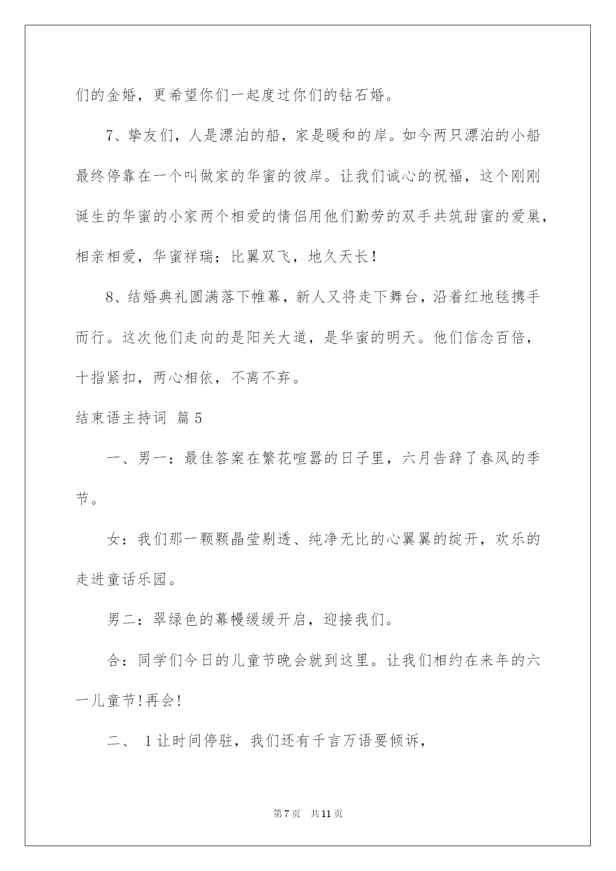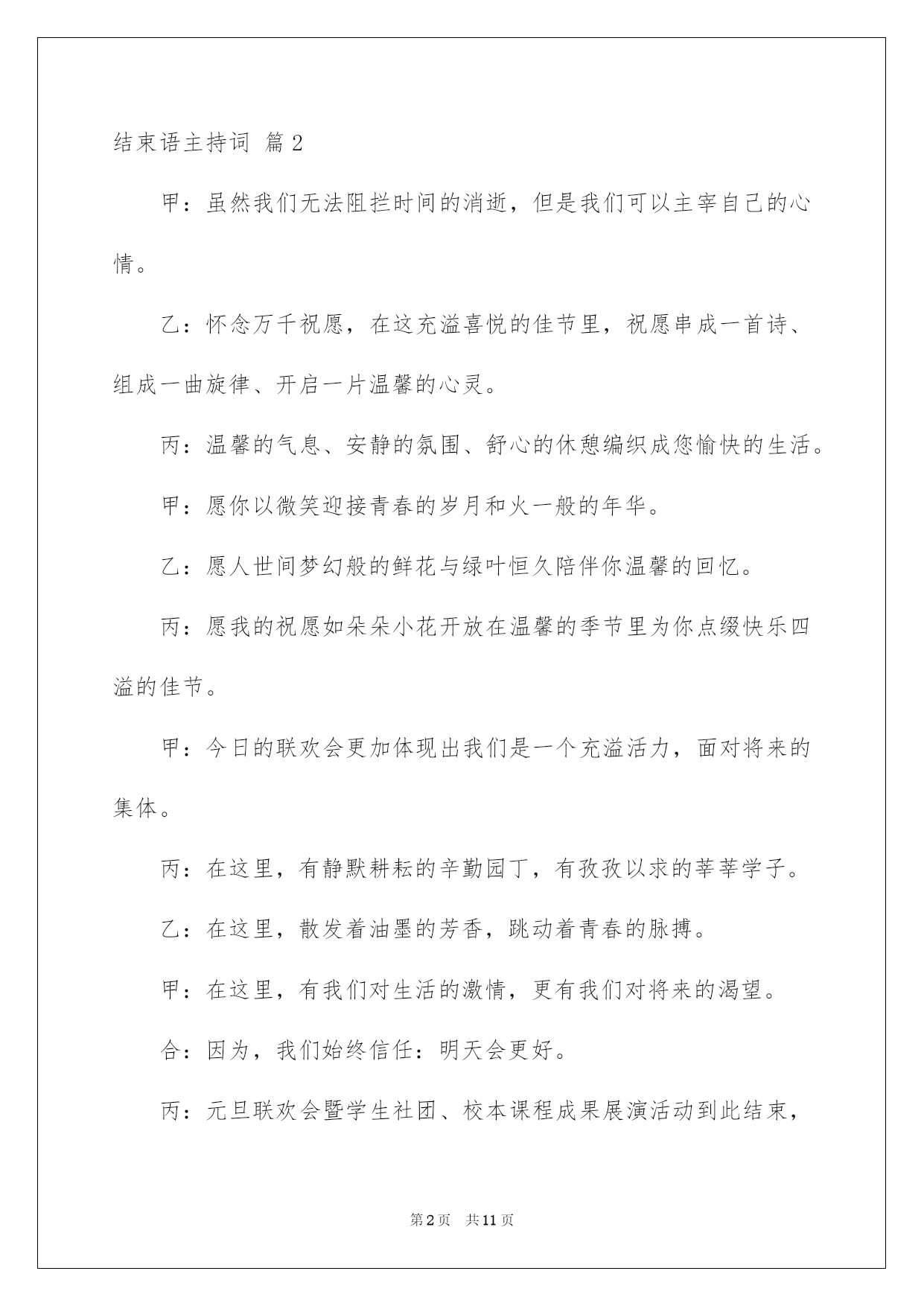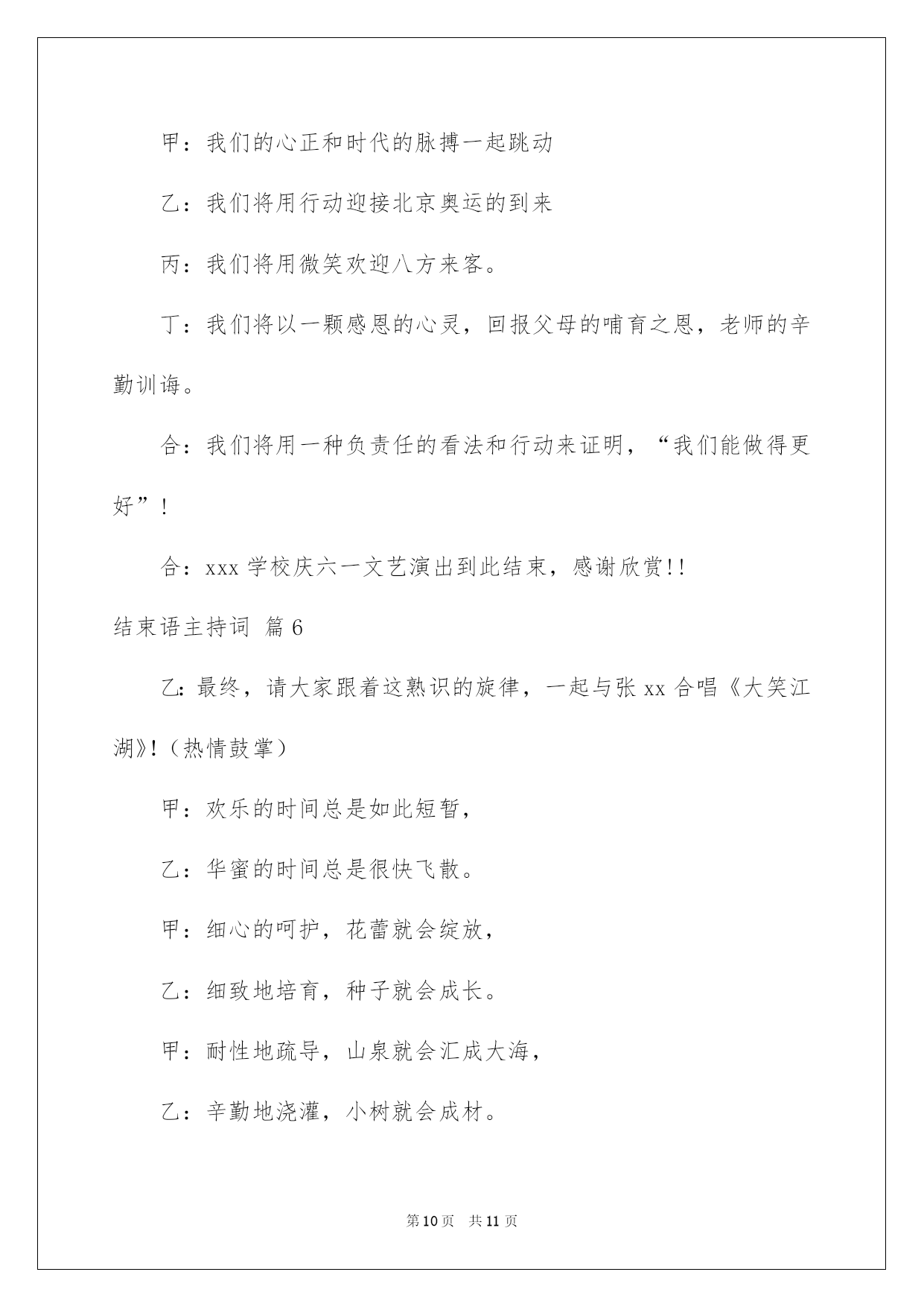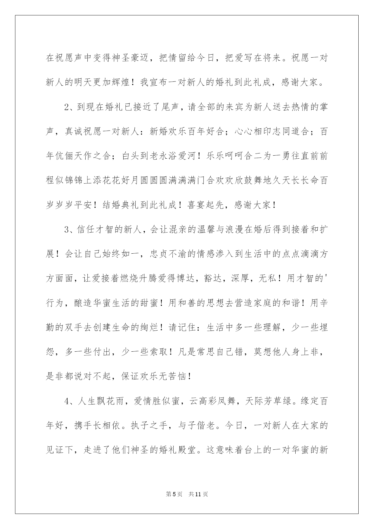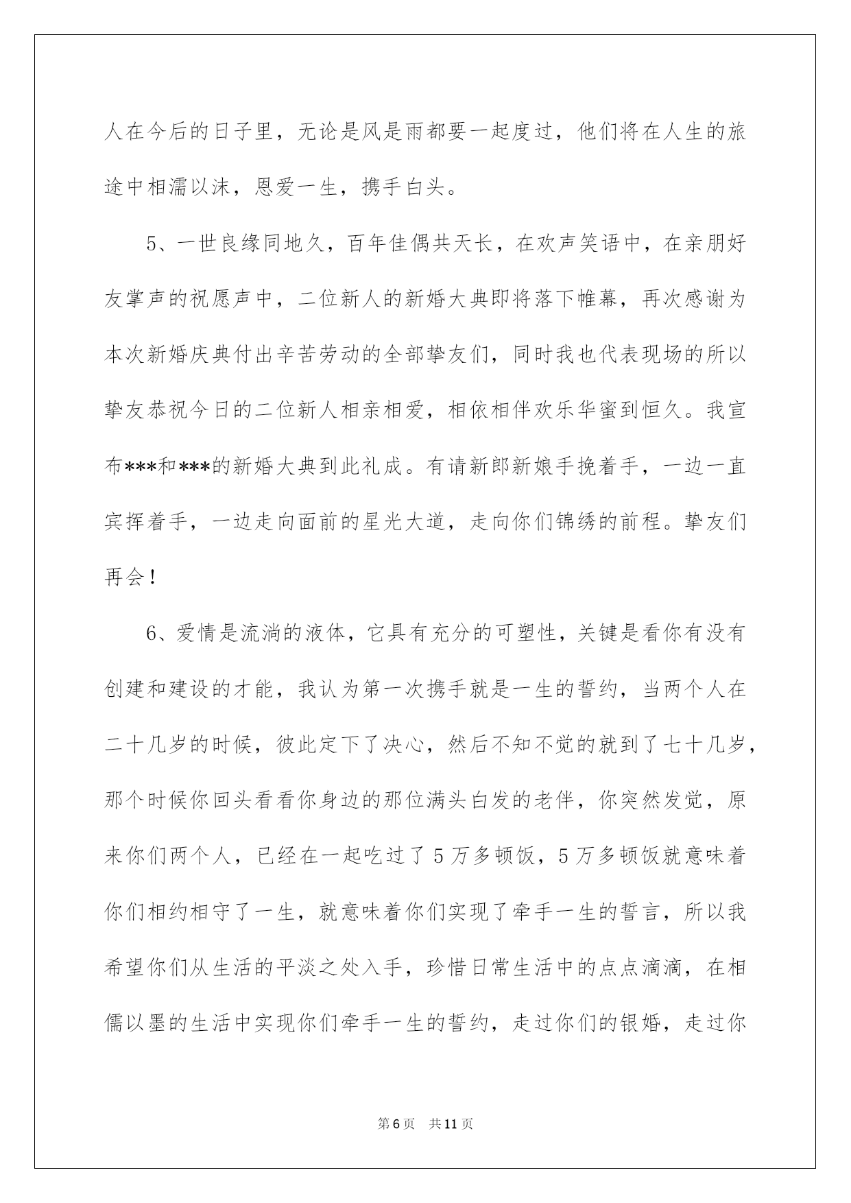 第PAGE\*Arabic\*MERGEFORMAT11页共NUMPAGES\*Arabic\*MERGEFORMAT11页第PAGE\*MERGEFORMAT11页共NUMPAGES\*MERGEFORMAT11页第PAGE\*MERGEFORMAT11页共NUMPAGES\*MERGEFORMAT11页第PAGE\*MERGEFORMAT11页共NUMPAGES\*MERGEFORMAT11页第PAGE\*MERGEFORMAT11页共NUMPAGES\*MERGEFORMAT11页第PAGE\*MERGEFORMAT11页共NUMPAGES\*MERGEFORMAT11页第PAGE\*MERGEFORMAT11页共NUMPAGES\*MERGEFORMAT11页第PAGE\*MERGEFORMAT11页共NUMPAGES\*MERGEFORMAT11页第PAGE\*MERGEFORMAT11页共NUMPAGES\*MERGEFORMAT11页第PAGE\*MERGEFORMAT11页共NUMPAGES\*MERGEFORMAT11页第PAGE\*MERGEFORMAT11页共NUMPAGES\*MERGEFORMAT11页2022结束语主持词关于结束语主持词范文锦集6篇主持词是主持人在节目进行过程中用于串联节目的串联词。在如今这个中国,主持词在各种活动中起到的作用越来越大,写主持词须要留意哪些问题呢?下面是我细心整理的结束语主持词6篇,仅供参考,大家一起来看看吧。结束语主持词篇1现在,让我们为华蜜的恋人起舞,为欢乐的爱侣歌颂,为火热的爱情举杯,愿他们的人生之路恒久洒满爱的阳光。好,各位来宾,敬爱的挚友们,今日的新婚庆典议式就短暂告一个段落,那么,接下来咱们要进行的是九八年钢城杯喝喜酒大赛,今日咱们的老东家打算了一些薄酒淡菜不呈敬意,那么在开局之前呢送我们在座的全部来宾一副对联。上联是:吃,吃尽席间美味不要怕累,下联是:喝,喝尽人间美酒不要喝醉,横批是赵本山的一句至理名言:吃好喝好!那么最终呢先给各位拜个早年:祝福我们在场的全部来宾全部的挚友们春节欢乐,家庭华蜜,生活美满,身体健康,万事如意!结束语主持词篇2甲:虽然我们无法阻拦时间的消逝,但是我们可以主宰自己的心情。乙:怀念万千祝愿,在这充溢喜悦的佳节里,祝愿串成一首诗、组成一曲旋律、开启一片温馨的心灵。丙:温馨的气息、安静的氛围、舒心的休憩编织成您愉快的生活。甲:愿你以微笑迎接青春的岁月和火一般的年华。乙:愿人世间梦幻般的鲜花与绿叶恒久陪伴你温馨的回忆。丙:愿我的祝愿如朵朵小花开放在温馨的季节里为你点缀快乐四溢的佳节。甲:今日的联欢会更加体现出我们是一个充溢活力,面对将来的集体。丙:在这里,有静默耕耘的辛勤园丁,有孜孜以求的莘莘学子。乙:在这里,散发着油墨的芳香,跳动着青春的脉搏。甲:在这里,有我们对生活的激情,更有我们对将来的渴望。合:因为,我们始终信任:明天会更好。丙:元旦联欢会暨学生社团、校本课程成果展演活动到此结束,再次祝大家元旦欢乐,万事如意,心想事成。合:让我们明年再见!结束语主持词篇3甲:多么动人的夜晚,多么难忘的时间。虽然我们无法阻拦时间的消逝,但是我们可以主宰自己的心情;乙:今日的联欢会更加体现出****是一个充溢活力,面对将来的集体;甲:在这里,校训“读好书,做好人”为我们指明白努力的方向,催人上进,激昂人心;乙:在这里,有静默耕耘的辛勤园丁,有孜孜以求的莘莘学子;甲:在这里,散发着油墨的芳香,跳动着青春的脉搏;献祝愿,祝愿网乙:在这里,有我们对生活的激情,更有我们对将来的渴望;合:因为,我们始终信任:明天会更好!甲:今日的联欢会到此结束,再次祝大家新年欢乐,万事如意,心想事成!结束语:余:南丁格尔如同一座不朽的丰碑,矗立于护理行业的山峰颠顶;汪:南丁格尔又似一棵长青的大树,繁衍出护理行业的滴翠绿叶。邓:红色的五月,南丁格尔精神呼喊我们脚踏实地前行;申:激情的五月,神州大地荡漾着生命的追求和欢欣。余:“天使颂”文艺晚会要和大家说再见了,而真情无限,欢乐无境,祝愿恒久!汪:挚友们,让我们再次对每一位辛勤工作的医护工作者表达我们崇高的敬意!邓:感谢为本次晚会付出辛勤劳动的全部演职人员,感谢参与晚会的全部来宾挚友。结束语主持词篇41、走到一起来,汇成快乐的海,走到一起来,凝合真诚的爱,让爱恒久与我们同在,伴随华蜜的人生绽放光彩。婚礼的过程是短暂的,我们对新人的祝愿是恒久的,就让我们用最热情的掌声诚心祝愿一对新人心连心,心贴心,心心相印,永结同心。祝愿全部的来宾一年四季都平安,东西南北发大财!挚友们,陈