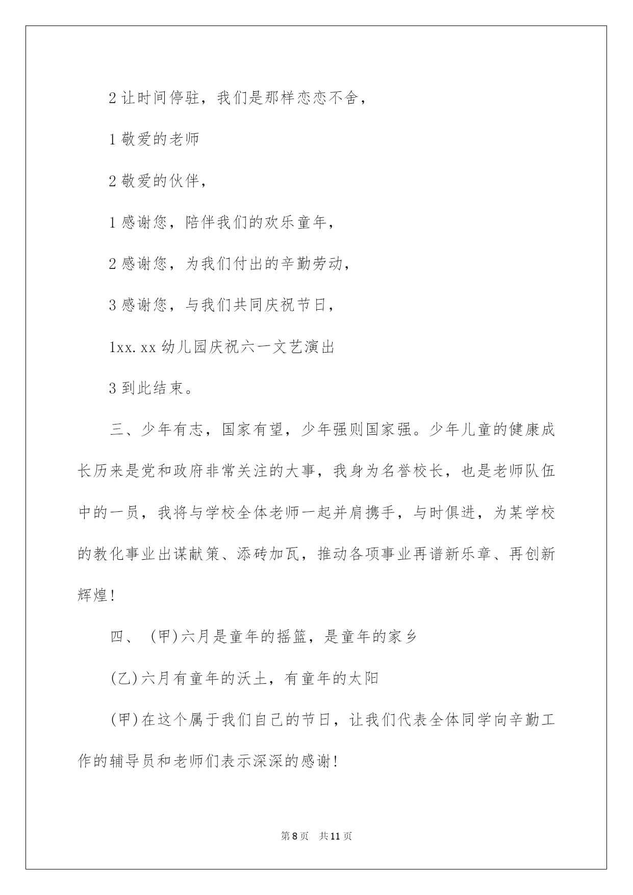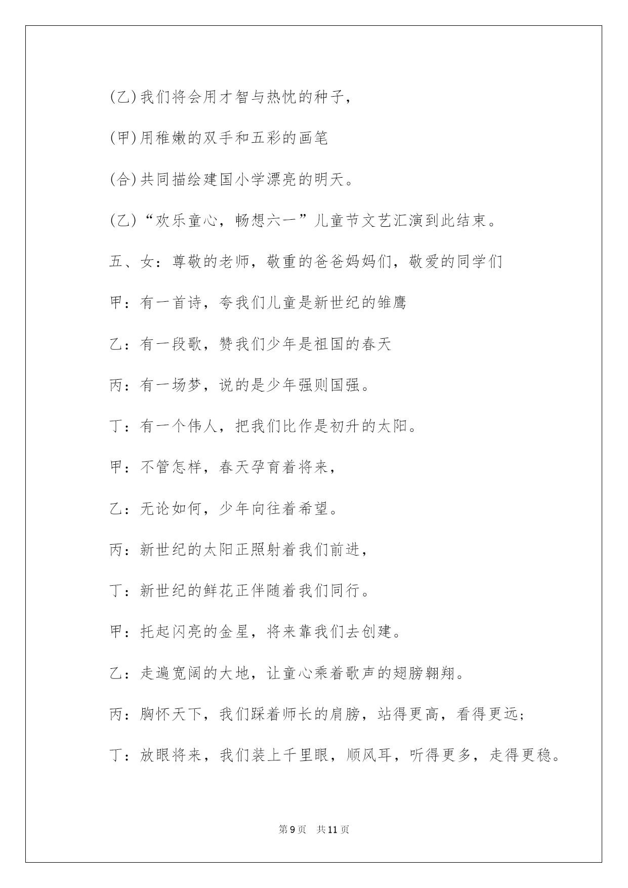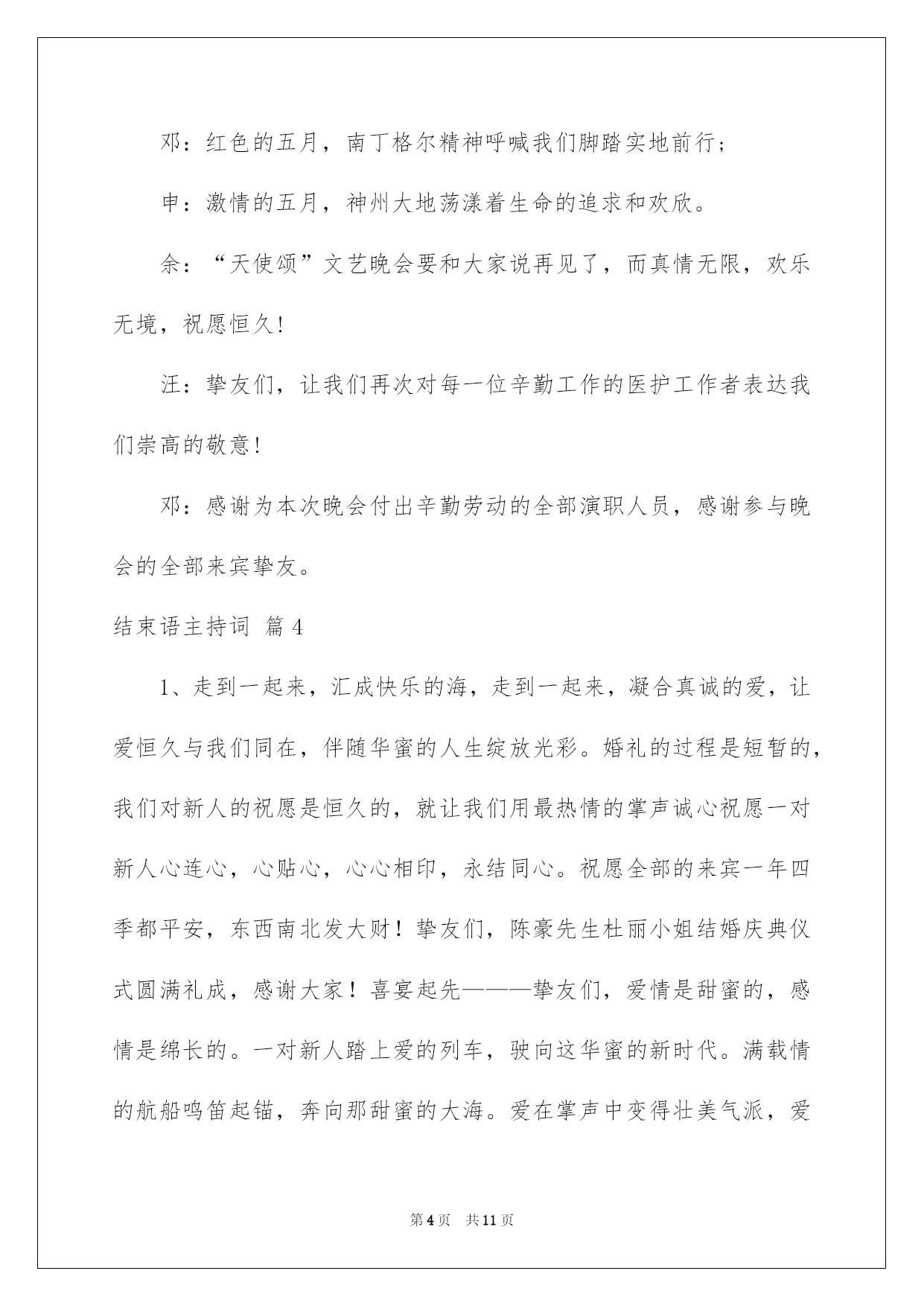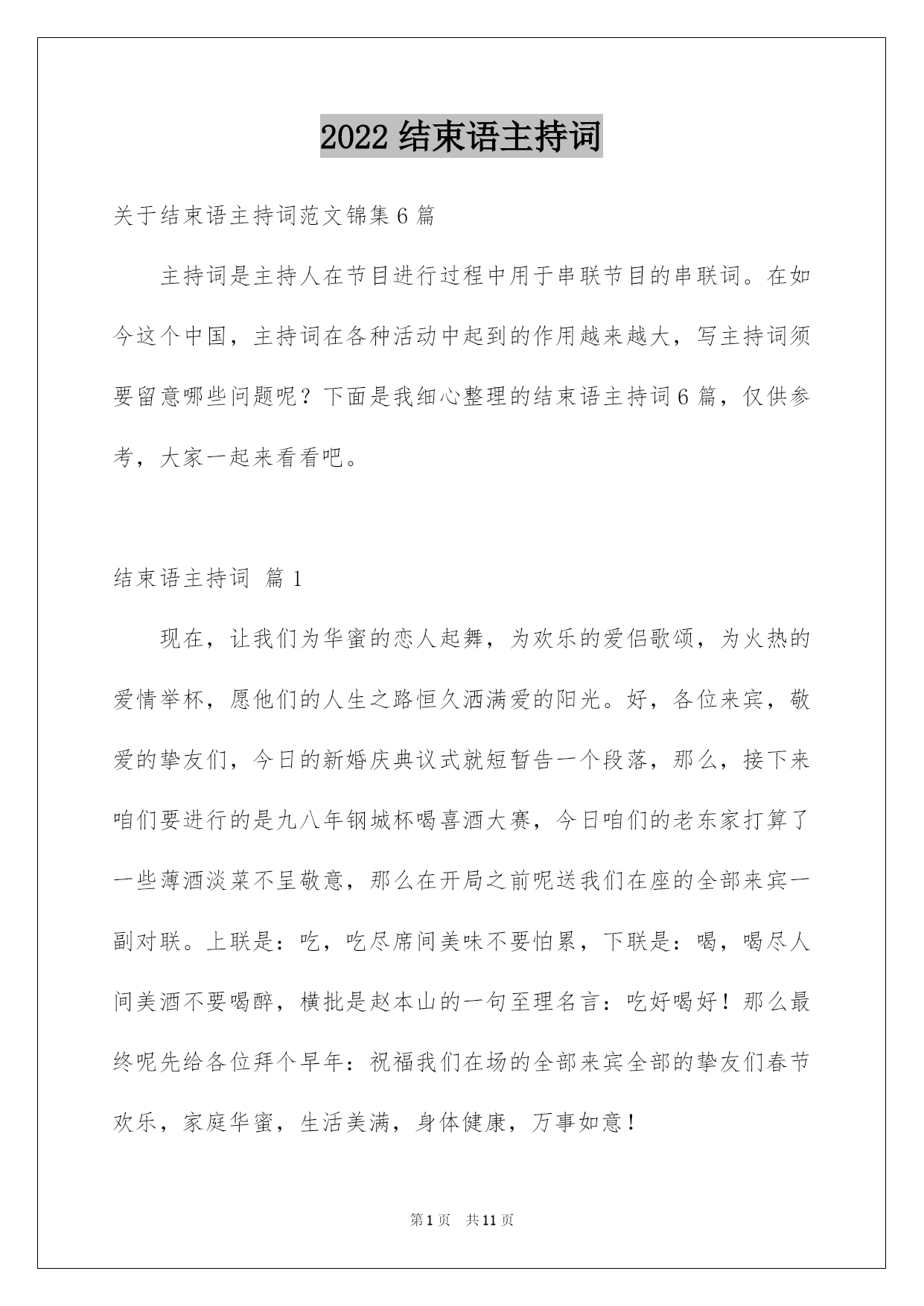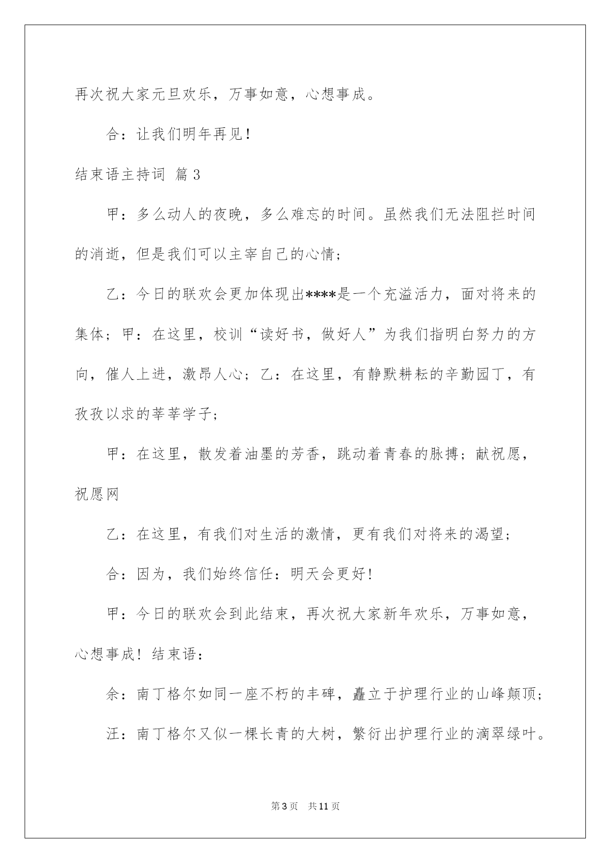 第PAGE\*Arabic\*MERGEFORMAT11页共NUMPAGES\*Arabic\*MERGEFORMAT11页第PAGE\*MERGEFORMAT11页共NUMPAGES\*MERGEFORMAT11页第PAGE\*MERGEFORMAT11页共NUMPAGES\*MERGEFORMAT11页第PAGE\*MERGEFORMAT11页共NUMPAGES\*MERGEFORMAT11页第PAGE\*MERGEFORMAT11页共NUMPAGES\*MERGEFORMAT11页第PAGE\*MERGEFORMAT11页共NUMPAGES\*MERGEFORMAT11页第PAGE\*MERGEFORMAT11页共NUMPAGES\*MERGEFORMAT11页第PAGE\*MERGEFORMAT11页共NUMPAGES\*MERGEFORMAT11页第PAGE\*MERGEFORMAT11页共NUMPAGES\*MERGEFORMAT11页第PAGE\*MERGEFORMAT11页共NUMPAGES\*MERGEFORMAT11页第PAGE\*MERGEFORMAT11页共NUMPAGES\*MERGEFORMAT11页2022结束语主持词关于结束语主持词范文锦集6篇主持词是主持人在节目进行过程中用于串联节目的串联词。在如今这个中国,主持词在各种活动中起到的作用越来越大,写主持词须要留意哪些问题呢?下面是我细心整理的结束语主持词6篇,仅供参考,大家一起来看看吧。结束语主持词篇1现在,让我们为华蜜的恋人起舞,为欢乐的爱侣歌颂,为火热的爱情举杯,愿他们的人生之路恒久洒满爱的阳光。好,各位来宾,敬爱的挚友们,今日的新婚庆典议式就短暂告一个段落,那么,接下来咱们要进行的是九八年钢城杯喝喜酒大赛,今日咱们的老东家打算了一些薄酒淡菜不呈敬意,那么在开局之前呢送我们在座的全部来宾一副对联。上联是:吃,吃尽席间美味不要怕累,下联是:喝,喝尽人间美酒不要喝醉,横批是赵本山的一句至理名言:吃好喝好!那么最终呢先给各位拜个早年:祝福我们在场的全部来宾全部的挚友们春节欢乐,家庭华蜜,生活美满,身体健康,万事如意!结束语主持词篇2甲:虽然我们无法阻拦时间的消逝,但是我们可以主宰自己的心情。乙:怀念万千祝愿,在这充溢喜悦的佳节里,祝愿串成一首诗、组成一曲旋律、开启一片温馨的心灵。丙:温馨的气息、安静的氛围、舒心的休憩编织成您愉快的生活。甲:愿你以微笑迎接青春的岁月和火一般的年华。乙:愿人世间梦幻般的鲜花与绿叶恒久陪伴你温馨的回忆。丙:愿我的祝愿如朵朵小花开放在温馨的季节里为你点缀快乐四溢的佳节。甲:今日的联欢会更加体现出我们是一个充溢活力,面对将来的集体。丙:在这里,有静默耕耘的辛勤园丁,有孜孜以求的莘莘学子。乙:在这里,散发着油墨的芳香,跳动着青春的脉搏。甲:在这里,有我们对生活的激情,更有我们对将来的渴望。合:因为,我们始终信任:明天会更好。丙:元旦联欢会暨学生社团、校本课程成果展演活动到此结束,再次祝大家元旦欢乐,万事如意,心想事成。合:让我们明年再见!结束语主持词篇3甲:多么动人的夜晚,多么难忘的时间。虽然我们无法阻拦时间的消逝,但是我们可以主宰自己的心情;乙:今日的联欢会更加体现出****是一个充溢活力,面对将来的集体;甲:在这里,校训“读好书,做好人”为我们指明白努力的方向,催人上进,激昂人心;乙:在这里,有静默耕耘的辛勤园丁,有孜孜以求的莘莘学子;甲:在这里,散发着油墨的芳香,跳动着青春的脉搏;献祝愿,祝愿网乙:在这里,有我们对生活的激情,更有我们对将来的渴望;合:因为,我们始终信任:明天会更好!甲:今日的联欢会到此结束,再次祝大家新年欢乐,万事如意,心想事成!结束语:余:南丁格尔如同一座不朽的丰碑,矗立于护理行业的山峰颠顶;汪:南丁格尔又似一棵长青的大树,繁衍出护理行业的滴翠绿叶。邓:红色的五月,南丁格尔精神呼喊我们脚踏实地前行;申:激情的五月,神州大地荡漾着生命的追求和欢欣。余:“天使颂”文艺晚会要和大家说再见了,而真情无限,欢乐无境,祝愿恒久!汪:挚友们,让我们再次对每一位辛勤工作的医护工作者表达我们崇高的敬意!邓:感谢为本次晚会付出辛勤劳动的全部演职人员,感谢参与晚会的全部来宾挚友。结束语主持词篇41、走到一起来,汇成快乐的海,走到一起来,凝合真诚的爱,让爱恒久与我们同在,伴随华蜜的人生绽放光彩。婚礼的过程是短暂的,我们对新人的祝愿是恒久的,就让我们用最热情的掌声诚心祝愿一对新人心连心,心贴心,心心相印,永结同心。祝愿全部的来宾一年四季都平安,东西南北发大财!挚友们,陈