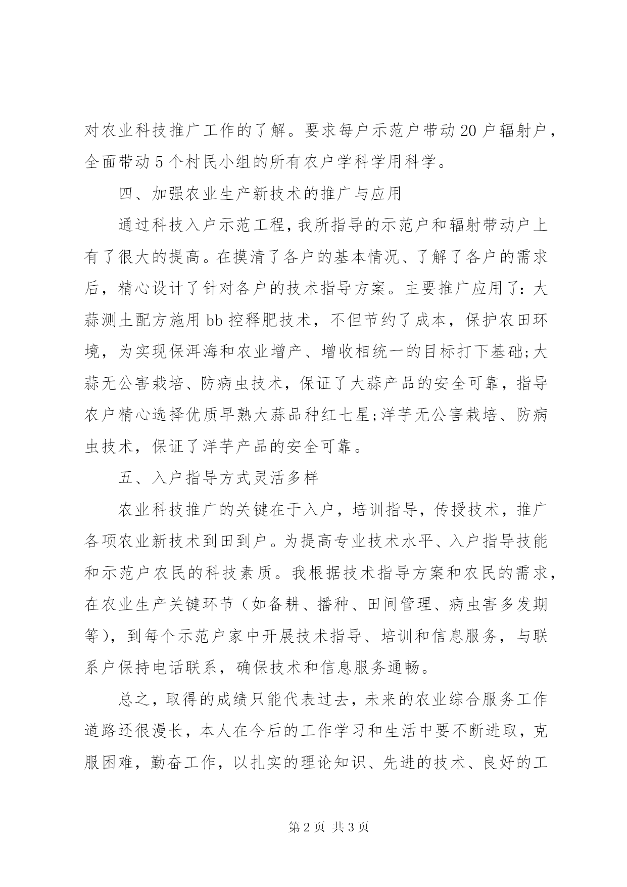 第PAGE\*Arabic\*MERGEFORMAT3页共NUMPAGES\*MERGEFORMAT3页农业技术人员个人工作自我总结一、积极参加业务学习,提高自己的业务素质开展科技入户示范工程后,积极参加了县农业局组织的培训学习,更新了自己的知识,提高自己的业务素质,增强自己指导示范户的服务能力。二、加强宣传、营造氛围农业科技推广是传统农业向现代农业转变的机制创新,为争取社会各界对农业科技推广的支持,使全社会特别是广大农民更多地了解和积极参与农业科技推广工程,采取黑板报、标语等多种形式宣传农业科技推广工作,宣传农业科技示XX县区的政策,宣传面向市场的现代农业生产技术蚕豆无公害栽培技术、大蒜高产无公害栽培技术、洋芋无公害栽培技术等,取得了较好的效果。三、精心选择高素质科技示范户农业科技推广在我镇以种植业为主,科技示范户理所当然的要有一定的种植水平,同时要有较强的号召力和影响力,能够将先进的农业科技在周边群众中推广开来。经过综合考虑,选择了以马军营、纪庄西胡庄、赵官营、宋庄小组的10户素质较高的农户,作为科技示范户。对10户示范户进行挨家挨户走访,详细了解各农户的基本情况,了解他们对农业生产技术的需求,摸清当地耕作制度,并登记示范户的相关信息,收集他们对农技推广工作的各种意见、建议。同时做好宣传工作,加强科技示范户对农业科技推广工作的了解。要求每户示范户带动20户辐射户,全面带动5个村民小组的所有农户学科学用科学。四、加强农业生产新技术的推广与应用通过科技入户示范工程,我所指导的示范户和辐射带动户上有了很大的提高。在摸清了各户的基本情况、了解了各户的需求后,精心设计了针对各户的技术指导方案。主要推广应用了:大蒜测土配方施用bb控释肥技术,不但节约了成本,保护农田环境,为实现保洱海和农业增产、增收相统一的目标打下基础;大蒜无公害栽培、防病虫技术,保证了大蒜产品的安全可靠,指导农户精心选择优质早熟大蒜品种红七星;洋芋无公害栽培、防病虫技术,保证了洋芋产品的安全可靠。五、入户指导方式灵活多样农业科技推广的关键在于入户,培训指导,传授技术,推广各项农业新技术到田到户。为提高专业技术水平、入户指导技能和示范户农民的科技素质。我根据技术指导方案和农民的需求,在农业生产关键环节(如备耕、播种、田间管理、病虫害多发期等),到每个示范户家中开展技术指导、培训和信息服务,与联系户保持电话联系,确保技术和信息服务通畅。总之,取得的成绩只能代表过去,未来的农业综合服务工作道路还很漫长,本人在今后的工作学习和生活中要不断进取,克服困难,勤奋工作,以扎实的理论知识、先进的技术、良好的工作作风为xx镇涉农相关产业的发展作出应有的贡献。