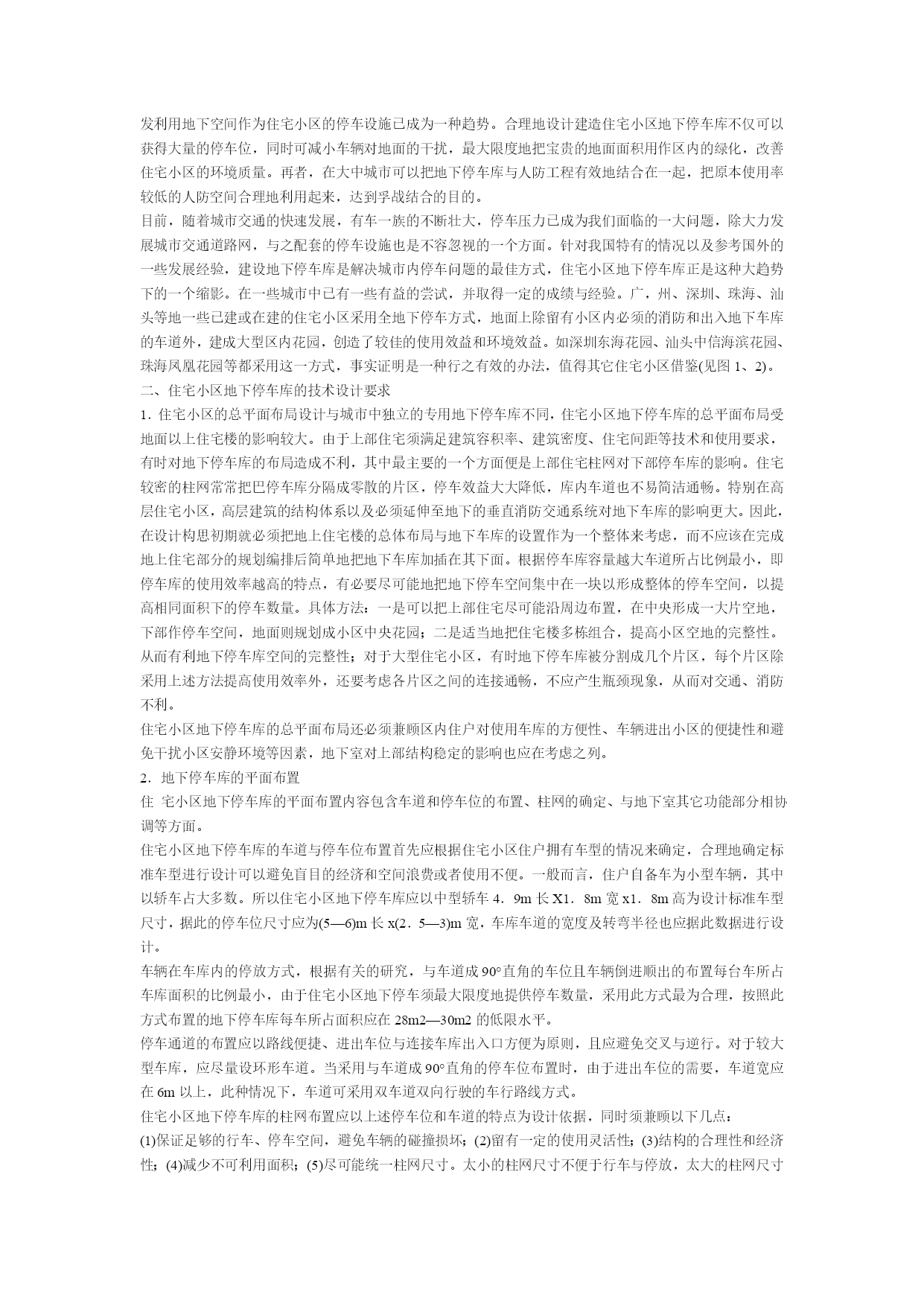 用于出租的地下停车场,建筑面积应当计入可售面积。1、国家税务总局《房地产开发经营业务企业HYPERLINK"http://www.keb123.com/nssw1/Index.html"\t"_blank"所得税处理办法》(国税发[2009]31号)文第十七条规定:企业在开发区内建造的会所、物业管理场所、电站、热力站、水厂、文体场馆、幼儿园等配套设施,按以下规定进行处理:(一)属于非营利性且产权属于全体业主的,或无偿赠与地方政府、公用事业单位的,可将其视为公共配套设施,其建造费用按公共配套设施费的有关规定进行处理。(二)属于营利性的,或产权归企业所有的,或未明确产权归属的,或无偿赠与地方政府、公用事业单位以外其他单位的,应当单独核算其成本。除企业自用应按建造固定资产进行处理外,其他一律按建造开发产品进行处理。2、该出租的地下车库属于第二种性质,应当视同建造开发产品进行处理,所以地下停车场计入可售面积,应当分摊取得土地使用权所支付的金额。一般车的转弯半径6米垂直式车位的尺寸为6米X(2.5——3米),最小不能小于5.3米X2.4米地下停车库车位数<=50辆时只要单车道就可以(要设红绿灯),当>50辆车要设置双车道单车道4米,双车道7米建筑规范都有,一般地下车位按建筑面积的话,在45平米----50平米/个,设计时要注意一个主要问题,进深一般在6米,核心控制是柱距,大于8.1米可以停3辆轿车,小于的话只能停2辆.停车难问题已成为摆在社会需求上的大问题,许多住宅小区利用地下空间修建停车库来缓解压力。本文作者根据实例和经验,总结了住宅小区地下停车库设计的一些特点,并对此提出一些可行的设计建议,值得设计师们借鉴。随着国内城市建设的发展,许多城市都在大规模地建造居民住宅小区以改善城市居民的居住质量,随之而来的居住区停车问题已成为曰益突出的矛盾,重视和解决这一矛盾是目前住宅小区设计中的当务之急。一、住宅小区停车难的现状与前景前几年建成的住宅小区大多采用地面停车场或小区内路边停车的形式,由于当时居民拥有汽车量有限,尚能满足停车要求。随着经济发展和城市居民生活水平的提高,这几年小汽车已逐步进入平常家庭。特别在大中型城市及地区,私有汽车的数量已达相当的水平,原有的小区设计已不能满足停车要求,车辆占道或占用区内绿地的情况屡见不鲜,导致小区内管理困难、环境恶化。针对我国城市用地紧张、人口数量密度大的特点,国内的住宅小区建筑密度一般都较大,因此,单一发展地面停车或地上多层停车库不是最佳的方案。在不增加地面建筑密度和不减少地面绿化面积的前提下,开发利用地下空间作为住宅小区的停车设施已成为一种趋势。合理地设计建造住宅小区地下停车库不仅可以获得大量的停车位,同时可减小车辆对地面的干扰,最大限度地把宝贵的地面面积用作区内的绿化,改善住宅小区的环境质量。再者,在大中城市可以把地下停车库与人防工程有效地结合在一起,把原本使用率较低的人防空间合理地利用起来,达到孚战结合的目的。目前,随着城市交通的快速发展,有车一族的不断壮大,停车压力已成为我们面临的一大问题,除大力发展城市交通道路网,与之配套的停车设施也是不容忽视的一个方面。针对我国特有的情况以及参考国外的一些发展经验,建设地下停车库是解决城市内停车问题的最佳方式,住宅小区地下停车库正是这种大趋势下的一个缩影。在一些城市中已有一些有益的尝试,并取得一定的成绩与经验。广,州、深圳、珠海、汕头等地一些已建或在建的住宅小区采用全地下停车方式,地面上除留有小区内必须的消防和出入地下车库的车道外,建成大型区内花园,创造了较佳的使用效益和环境效益。如深圳东海花园、汕头中信海滨花园、珠海凤凰花园等都采用这一方式,事实证明是一种行之有效的办法,值得其它住宅小区借鉴(见图1、2)。二、住宅小区地下停车库的技术设计要求1.住宅小区的总平面布局设计与城市中独立的专用地下停车库不同,住宅小区地下停车库的总平面布局受地面以上住宅楼的影响较大。由于上部住宅须满足建筑容积率、建筑密度、住宅间距等技术和使用要求,有时对地下停车库的布局造成不利,其中最主要的一个方面便是上部住宅柱网对下部停车库的影响。住宅较密的柱网常常把巴停车库分隔成零散的片区,停车效益大大降低,库内车道也不易简洁通畅。特别在高层住宅小区,高层建筑的结构体系以及必须延伸至地下的垂直消防交通系统对地下车库的影响更大。因此,在设计构思初期就必须把地上住宅楼的总体布局与地下车库的设置作为一个整体来考虑,而不应该在完成地上住宅部分的规划编排后简单地把地下车库加插在其下面。根据停车库容量越大车道所占比例最小,即停车库的使用效率越高的特点,有必要尽可能地把地下停车空间集中在一块以形成整体的停车空间,以提高相同面积下的停车数量。具体方法:一是可以把上部住宅尽可能沿周