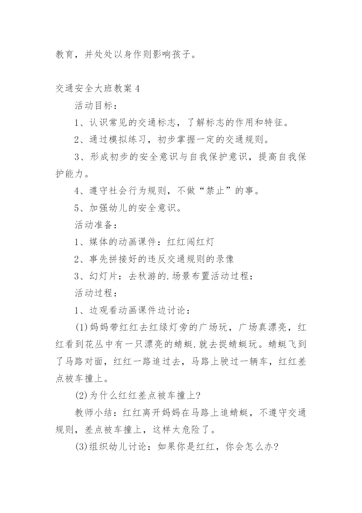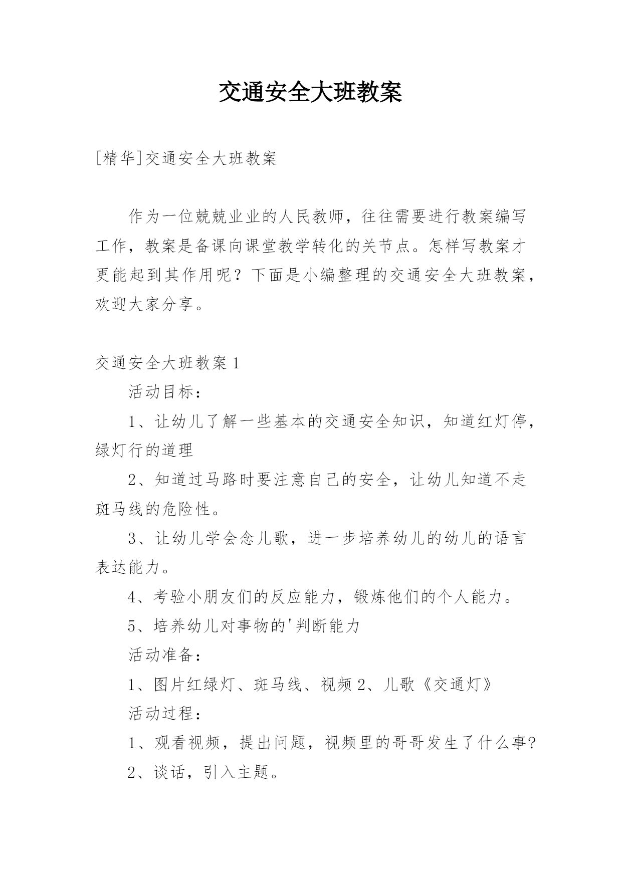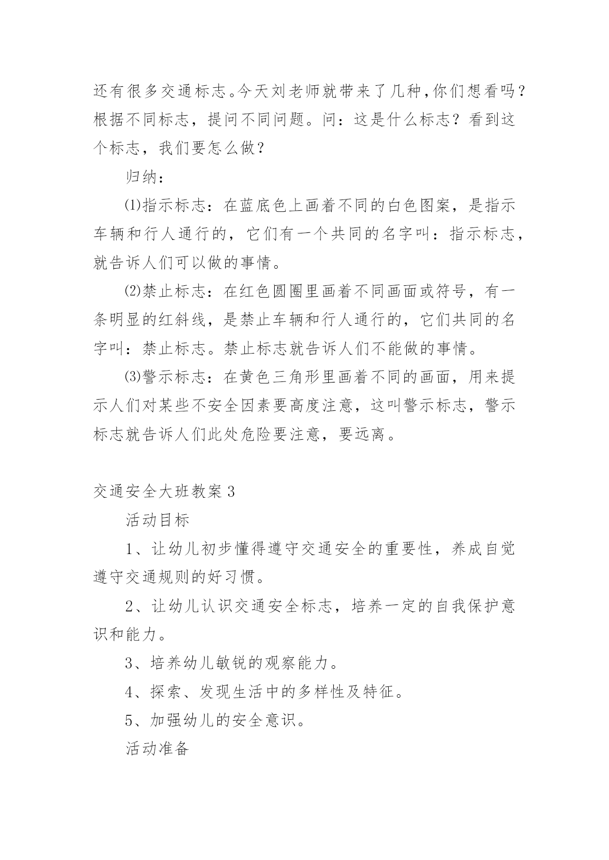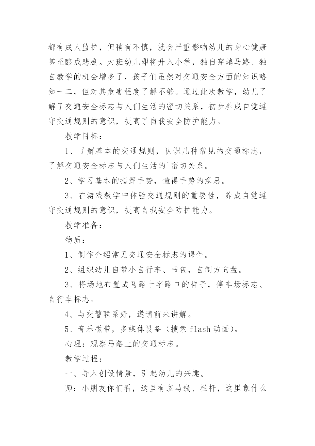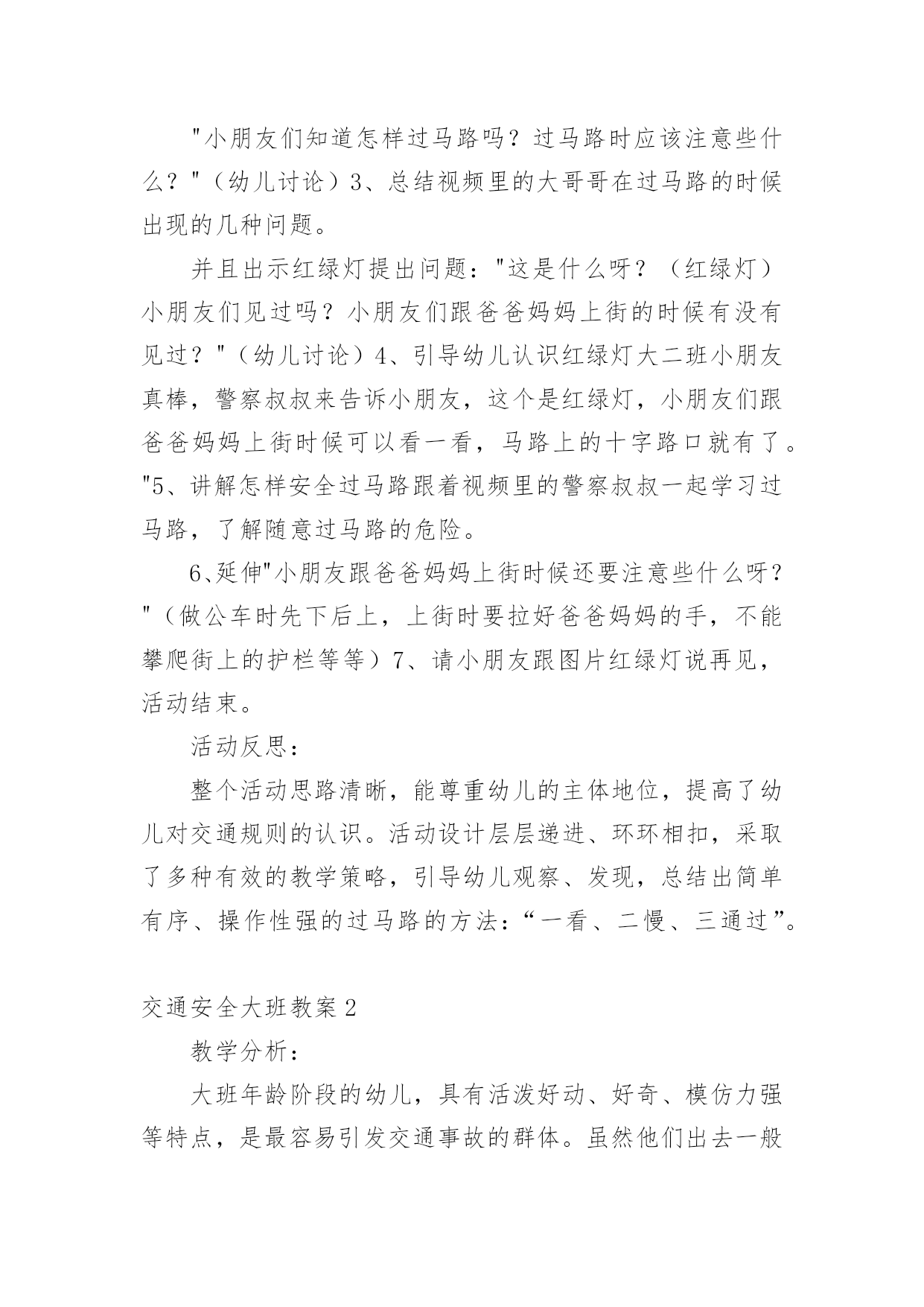 交通安全大班教案[精华]交通安全大班教案作为一位兢兢业业的人民教师,往往需要进行教案编写工作,教案是备课向课堂教学转化的关节点。怎样写教案才更能起到其作用呢?下面是小编整理的交通安全大班教案,欢迎大家分享。交通安全大班教案1活动目标:1、让幼儿了解一些基本的交通安全知识,知道红灯停,绿灯行的道理2、知道过马路时要注意自己的安全,让幼儿知道不走斑马线的危险性。3、让幼儿学会念儿歌,进一步培养幼儿的幼儿的语言表达能力。4、考验小朋友们的反应能力,锻炼他们的个人能力。5、培养幼儿对事物的'判断能力活动准备:1、图片红绿灯、斑马线、视频2、儿歌《交通灯》活动过程:1、观看视频,提出问题,视频里的哥哥发生了什么事?2、谈话,引入主题。"小朋友们知道怎样过马路吗?过马路时应该注意些什么?"(幼儿讨论)3、总结视频里的大哥哥在过马路的时候出现的几种问题。并且出示红绿灯提出问题:"这是什么呀?(红绿灯)小朋友们见过吗?小朋友们跟爸爸妈妈上街的时候有没有见过?"(幼儿讨论)4、引导幼儿认识红绿灯大二班小朋友真棒,警察叔叔来告诉小朋友,这个是红绿灯,小朋友们跟爸爸妈妈上街时候可以看一看,马路上的十字路口就有了。"5、讲解怎样安全过马路跟着视频里的警察叔叔一起学习过马路,了解随意过马路的危险。6、延伸"小朋友跟爸爸妈妈上街时候还要注意些什么呀?"(做公车时先下后上,上街时要拉好爸爸妈妈的手,不能攀爬街上的护栏等等)7、请小朋友跟图片红绿灯说再见,活动结束。活动反思:整个活动思路清晰,能尊重幼儿的主体地位,提高了幼儿对交通规则的认识。活动设计层层递进、环环相扣,采取了多种有效的教学策略,引导幼儿观察、发现,总结出简单有序、操作性强的过马路的方法:“一看、二慢、三通过”。交通安全大班教案2教学分析:大班年龄阶段的幼儿,具有活泼好动、好奇、模仿力强等特点,是最容易引发交通事故的群体。虽然他们出去一般都有成人监护,但稍有不慎,就会严重影响幼儿的身心健康甚至酿成悲剧。大班幼儿即将升入小学,独自穿越马路、独自教学的机会增多了,孩子们虽然对交通安全方面的知识略知一二,但对其危害程度了解不够。通过此次教学,幼儿了解了交通安全标志与人们生活的密切关系,初步养成自觉遵守交通规则的意识,提高了自我安全防护能力。教学目标:1、了解基本的交通规则,认识几种常见的交通标志,了解交通安全标志与人们生活的`密切关系。2、学习基本的指挥手势,懂得手势的意思。3、在游戏教学中体验交通规则的重要性,养成自觉遵守交通规则的意识,提高自我安全防护能力。教学准备:物质:1、制作介绍常见交通安全标志的课件。2、组织幼儿自带小自行车、书包,自制方向盘。3、将场地布置成马路十字路口的样子,停车场标志、自行车标志。4、与交警联系好,邀请前来讲解。5、音乐磁带,多媒体设备(搜索flash动画)。心理:观察马路上的交通标志。教学过程:一、导入创设情景,引起幼儿的兴趣。师:小朋友你们看,这里有斑马线、栏杆,这里象什么地方?(马路)我们就来看马路上发生了什么事情?看谁看得最仔细。二、展开(一)观看情景表演,引起幼儿思考(注意提醒:又发生了一件事情)(表演内容:a、一名汽车司机车速较快,撞伤了横穿马路的小学生;b、一名行人看到交警不在,翻越栏杆横过马路。)问:"刚才你看到了什么?""是什么原因造成了危险事情的发生?""你想对他们说什么?"小结:多么危险可怕的事情,为了我们的生命安全,我们一定要遵守交通规则。(二)认识信号灯标识及几种常见交通标志1、认识信号灯,说说信号灯的作用。师:在生活中,很多马路上都有信号灯,信号灯有几种颜色?它告诉我们什么?(红灯停、绿灯行、黄灯亮了等一等)2、模拟游戏,体验信号灯在交通中的作用。师:我们来个做游戏,《遵守规则的小司机》。男孩扮演小司机,女孩扮演小学生,看信号过马路。交换角色再次游戏。小结:小司机们真遵守交通规则,相信平安一定会伴随你们。3、播放课件,认识几种常见的交通标志,了解交通标志与人们生活的关系。师:在车辆穿梭的马路上,除了信号灯这个交通标志外,还有很多交通标志。今天刘老师就带来了几种,你们想看吗?根据不同标志,提问不同问题。问:这是什么标志?看到这个标志,我们要怎么做?归纳:⑴指示标志:在蓝底色上画着不同的白色图案,是指示车辆和行人通行的,它们有一个共同的名字叫:指示标志,就告诉人们可以做的事情。⑵禁止标志:在红色圆圈里画着不同画面或符号,有一条明显的红斜线,是禁止车辆和行人通行的,它们共同的名字叫:禁止标志。禁止标志就告诉人们不能做的事情。⑶警示标志:在黄色三角形里画着不同的画面,用来提示人们对某些不安全因素要高度注意,这叫警示标志,警示标志就告诉人们此处危险要注意,要远离。交通安全大班教案3活动目标1、让幼儿初步懂得遵守交通安全的重要性,养成自觉遵守交通