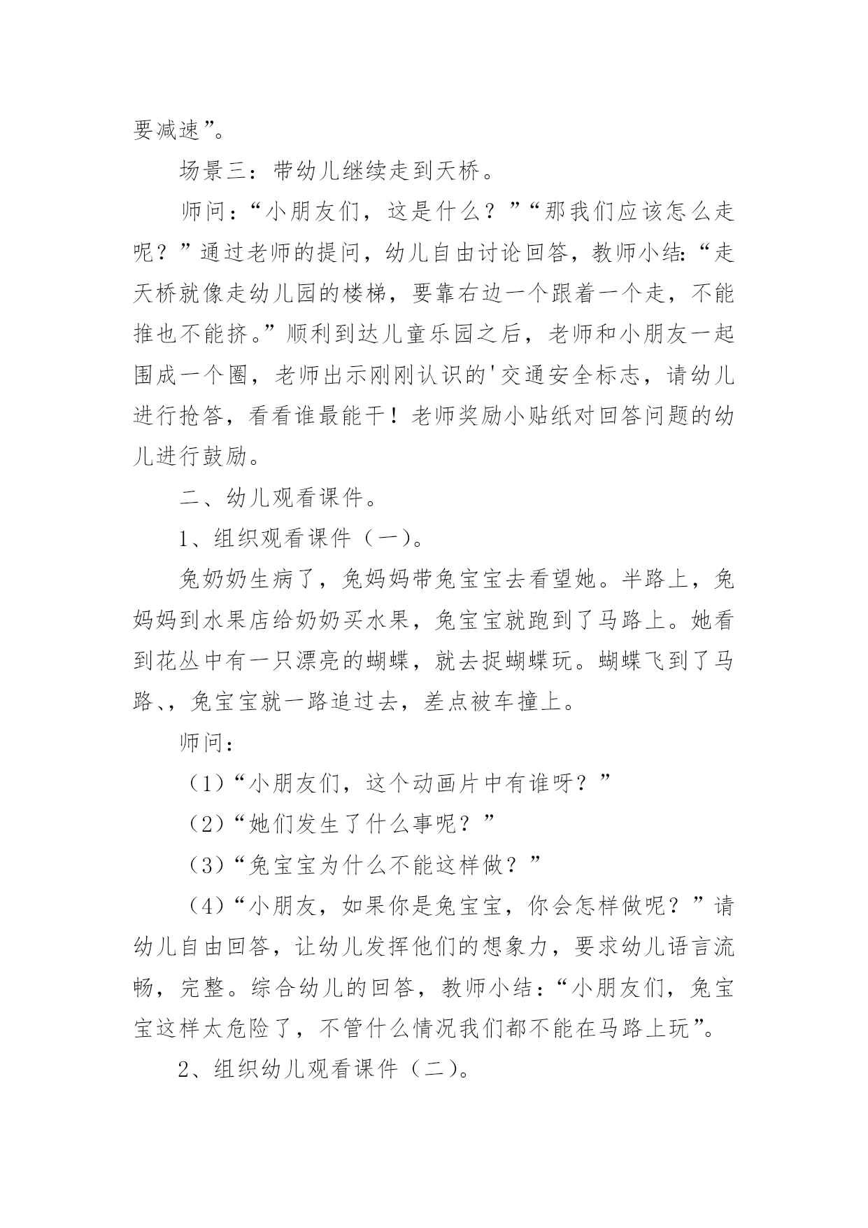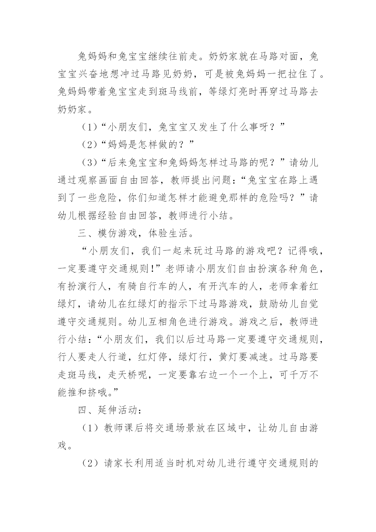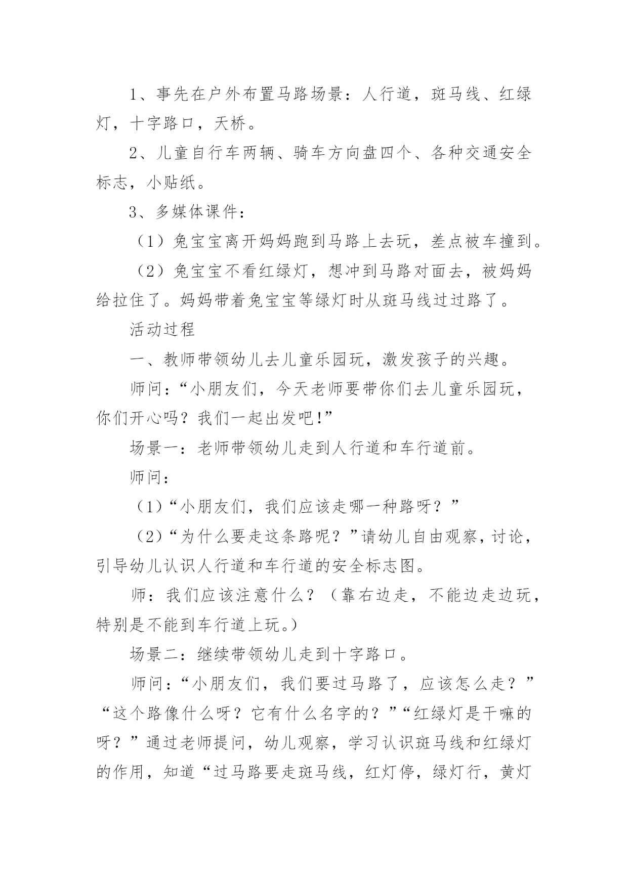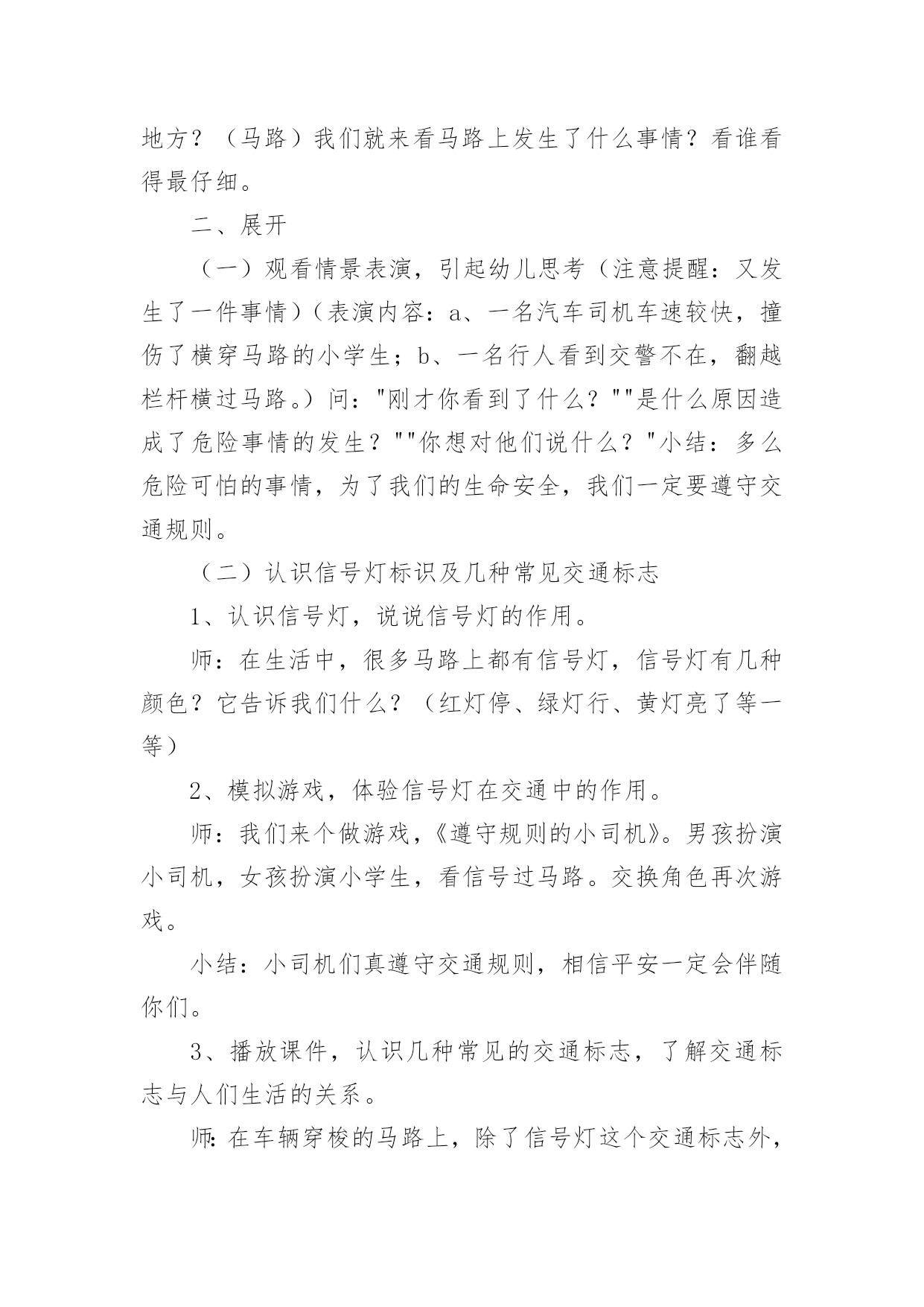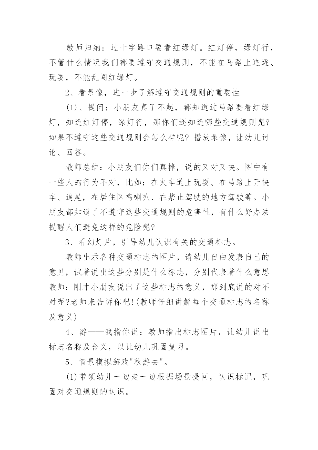 交通安全大班教案[精华]交通安全大班教案作为一位兢兢业业的人民教师,往往需要进行教案编写工作,教案是备课向课堂教学转化的关节点。怎样写教案才更能起到其作用呢?下面是小编整理的交通安全大班教案,欢迎大家分享。交通安全大班教案1活动目标:1、让幼儿了解一些基本的交通安全知识,知道红灯停,绿灯行的道理2、知道过马路时要注意自己的安全,让幼儿知道不走斑马线的危险性。3、让幼儿学会念儿歌,进一步培养幼儿的幼儿的语言表达能力。4、考验小朋友们的反应能力,锻炼他们的个人能力。5、培养幼儿对事物的'判断能力活动准备:1、图片红绿灯、斑马线、视频2、儿歌《交通灯》活动过程:1、观看视频,提出问题,视频里的哥哥发生了什么事?2、谈话,引入主题。"小朋友们知道怎样过马路吗?过马路时应该注意些什么?"(幼儿讨论)3、总结视频里的大哥哥在过马路的时候出现的几种问题。并且出示红绿灯提出问题:"这是什么呀?(红绿灯)小朋友们见过吗?小朋友们跟爸爸妈妈上街的时候有没有见过?"(幼儿讨论)4、引导幼儿认识红绿灯大二班小朋友真棒,警察叔叔来告诉小朋友,这个是红绿灯,小朋友们跟爸爸妈妈上街时候可以看一看,马路上的十字路口就有了。"5、讲解怎样安全过马路跟着视频里的警察叔叔一起学习过马路,了解随意过马路的危险。6、延伸"小朋友跟爸爸妈妈上街时候还要注意些什么呀?"(做公车时先下后上,上街时要拉好爸爸妈妈的手,不能攀爬街上的护栏等等)7、请小朋友跟图片红绿灯说再见,活动结束。活动反思:整个活动思路清晰,能尊重幼儿的主体地位,提高了幼儿对交通规则的认识。活动设计层层递进、环环相扣,采取了多种有效的教学策略,引导幼儿观察、发现,总结出简单有序、操作性强的过马路的方法:“一看、二慢、三通过”。交通安全大班教案2教学分析:大班年龄阶段的幼儿,具有活泼好动、好奇、模仿力强等特点,是最容易引发交通事故的群体。虽然他们出去一般都有成人监护,但稍有不慎,就会严重影响幼儿的身心健康甚至酿成悲剧。大班幼儿即将升入小学,独自穿越马路、独自教学的机会增多了,孩子们虽然对交通安全方面的知识略知一二,但对其危害程度了解不够。通过此次教学,幼儿了解了交通安全标志与人们生活的密切关系,初步养成自觉遵守交通规则的意识,提高了自我安全防护能力。教学目标:1、了解基本的交通规则,认识几种常见的交通标志,了解交通安全标志与人们生活的`密切关系。2、学习基本的指挥手势,懂得手势的意思。3、在游戏教学中体验交通规则的重要性,养成自觉遵守交通规则的意识,提高自我安全防护能力。教学准备:物质:1、制作介绍常见交通安全标志的课件。2、组织幼儿自带小自行车、书包,自制方向盘。3、将场地布置成马路十字路口的样子,停车场标志、自行车标志。4、与交警联系好,邀请前来讲解。5、音乐磁带,多媒体设备(搜索flash动画)。心理:观察马路上的交通标志。教学过程:一、导入创设情景,引起幼儿的兴趣。师:小朋友你们看,这里有斑马线、栏杆,这里象什么地方?(马路)我们就来看马路上发生了什么事情?看谁看得最仔细。二、展开(一)观看情景表演,引起幼儿思考(注意提醒:又发生了一件事情)(表演内容:a、一名汽车司机车速较快,撞伤了横穿马路的小学生;b、一名行人看到交警不在,翻越栏杆横过马路。)问:"刚才你看到了什么?""是什么原因造成了危险事情的发生?""你想对他们说什么?"小结:多么危险可怕的事情,为了我们的生命安全,我们一定要遵守交通规则。(二)认识信号灯标识及几种常见交通标志1、认识信号灯,说说信号灯的作用。师:在生活中,很多马路上都有信号灯,信号灯有几种颜色?它告诉我们什么?(红灯停、绿灯行、黄灯亮了等一等)2、模拟游戏,体验信号灯在交通中的作用。师:我们来个做游戏,《遵守规则的小司机》。男孩扮演小司机,女孩扮演小学生,看信号过马路。交换角色再次游戏。小结:小司机们真遵守交通规则,相信平安一定会伴随你们。3、播放课件,认识几种常见的交通标志,了解交通标志与人们生活的关系。师:在车辆穿梭的马路上,除了信号灯这个交通标志外,还有很多交通标志。今天刘老师就带来了几种,你们想看吗?根据不同标志,提问不同问题。问:这是什么标志?看到这个标志,我们要怎么做?归纳:⑴指示标志:在蓝底色上画着不同的白色图案,是指示车辆和行人通行的,它们有一个共同的名字叫:指示标志,就告诉人们可以做的事情。⑵禁止标志:在红色圆圈里画着不同画面或符号,有一条明显的红斜线,是禁止车辆和行人通行的,它们共同的名字叫:禁止标志。禁止标志就告诉人们不能做的事情。⑶警示标志:在黄色三角形里画着不同的画面,用来提示人们对某些不安全因素要高度注意,这叫警示标志,警示标志就告诉人们此处危险要注意,要远离。交通安全大班教案3活动目标1、让幼儿初步懂得遵守交通安全的重要性,养成自觉遵守交通