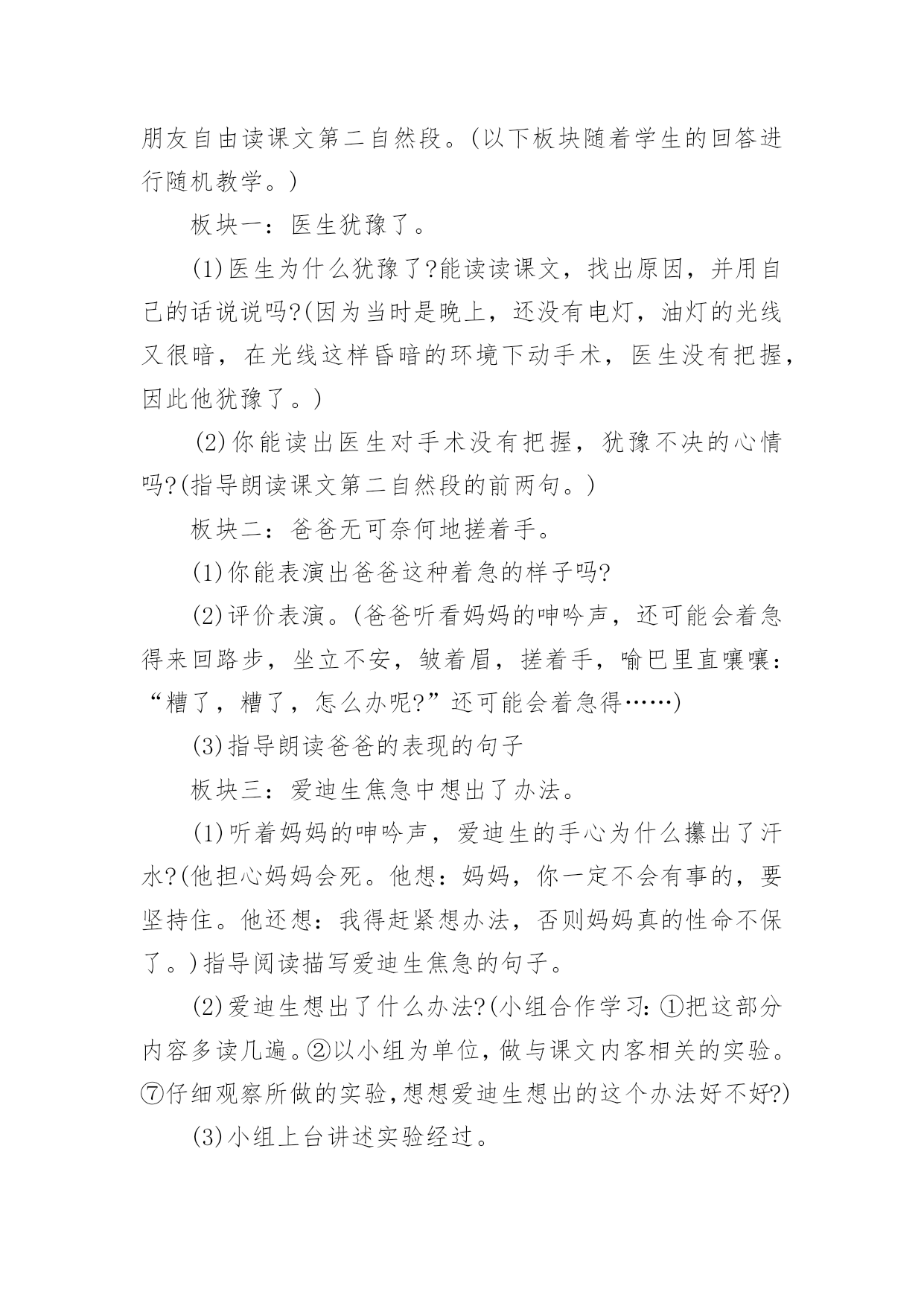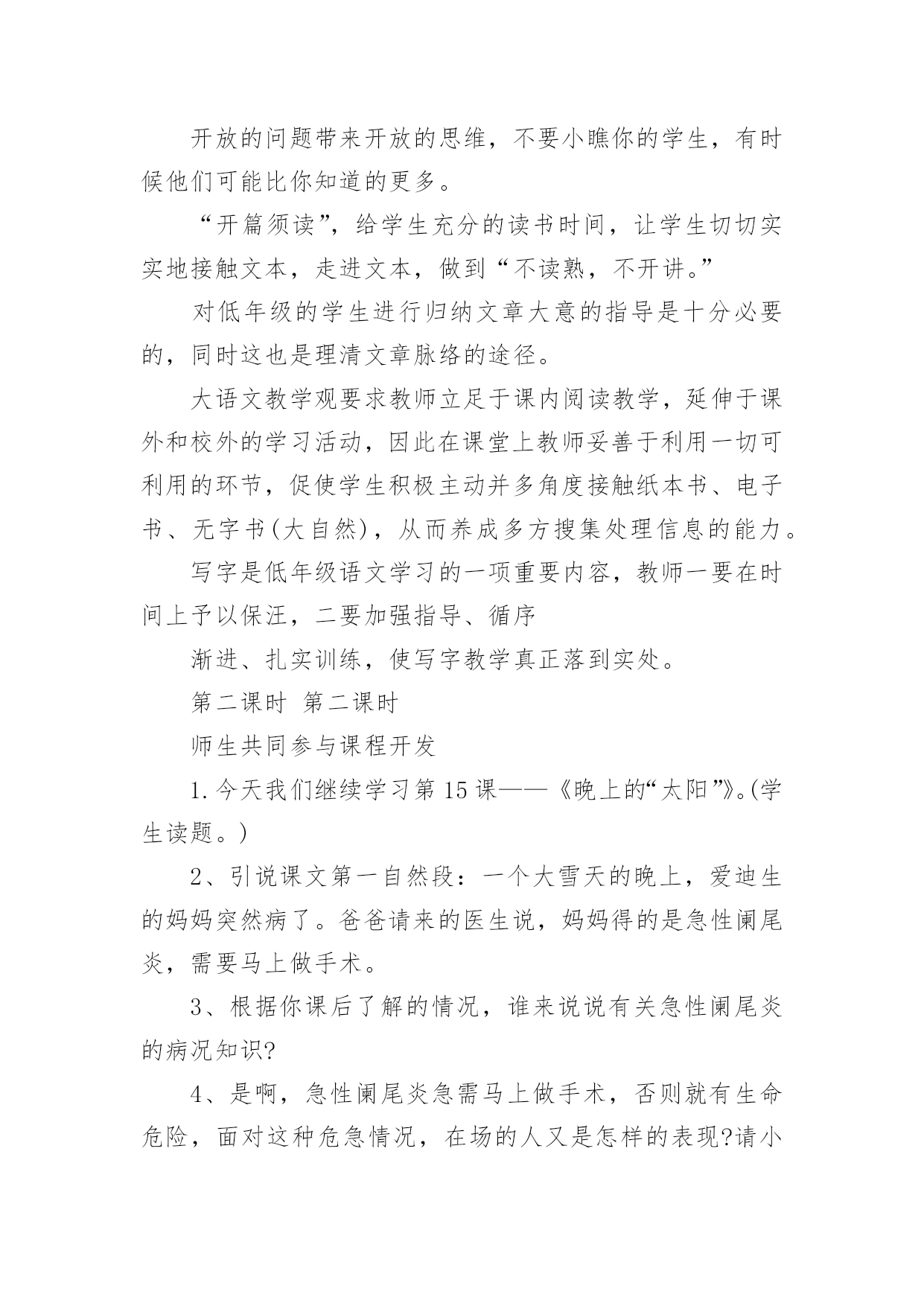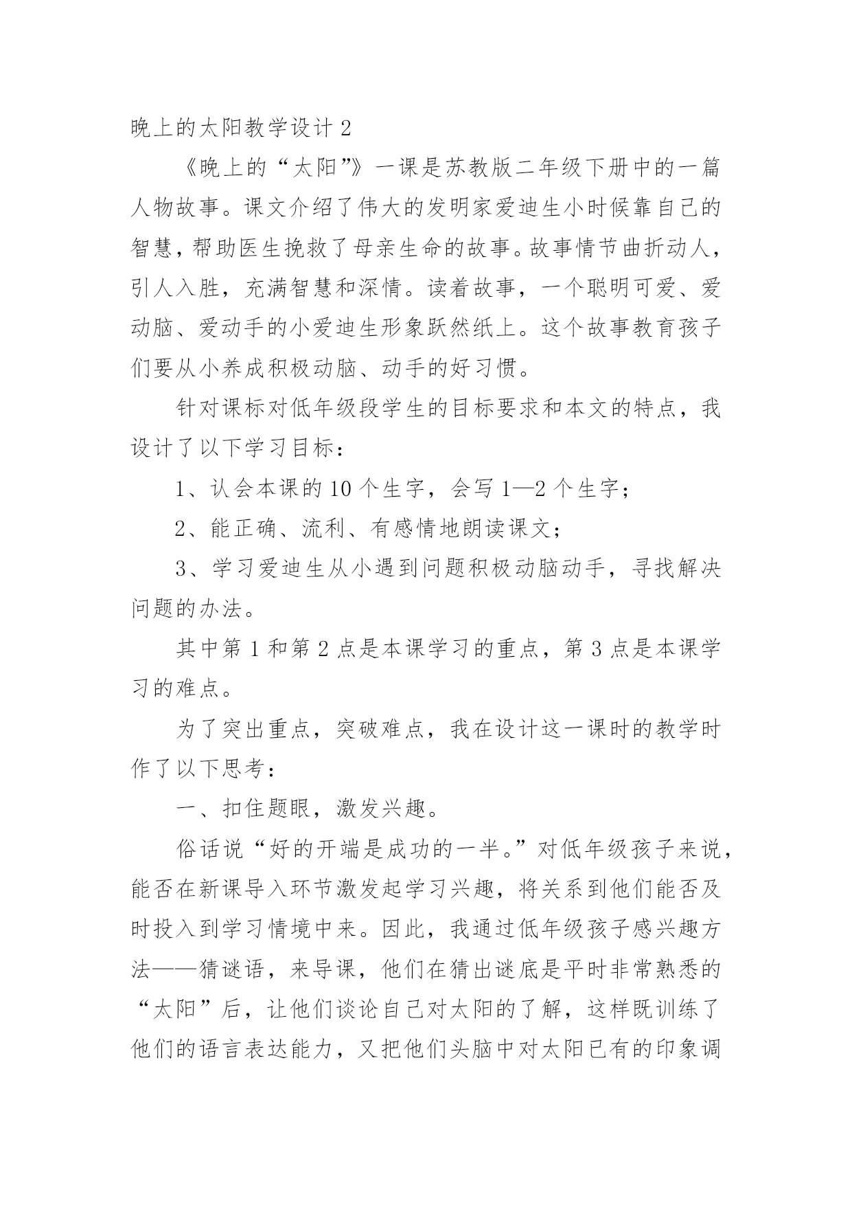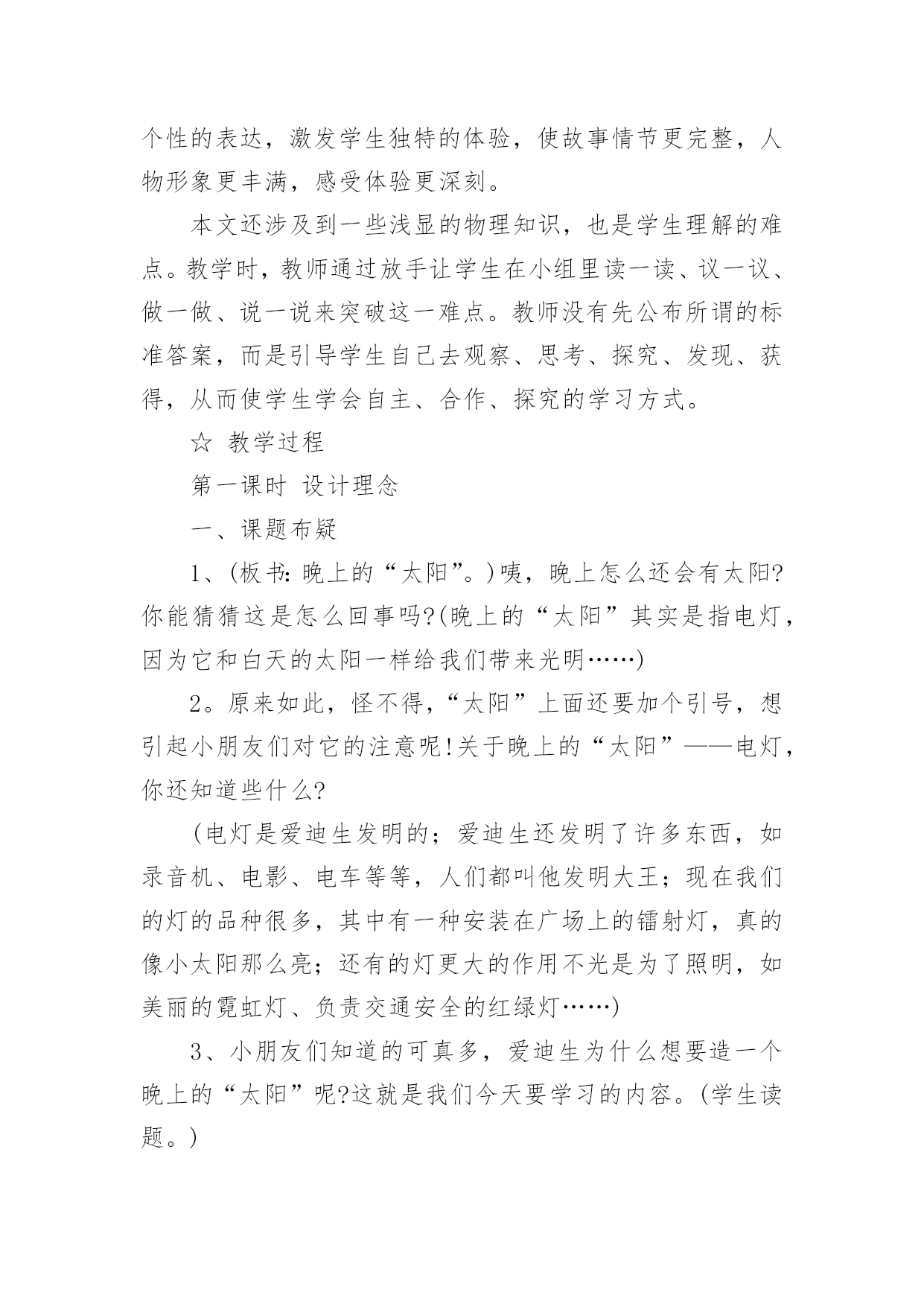 晚上的太阳教学设计晚上的太阳教学设计7篇在教学工作者实际的教学活动中,通常需要用到教学设计来辅助教学,教学设计是把教学原理转化为教学材料和教学活动的计划。教学设计应该怎么写才好呢?以下是小编收集整理的晚上的太阳教学设计,希望对大家有所帮助。晚上的太阳教学设计1教学目标1、学习默读课文,并能复述这个故事。2、学会本课的10个生字,理解由生字组成的词语。3、学习爱迪生遇到问题积极动脑动手,寻找解决问题的方法的好习惯。教学重难点课文第二自然段是教学的重点,其中理解爱迪生用镜面反射油灯灯光的用意是教学的难点。教学准备发动学生搜集发明大王爱迪生的故事。设计思路《晚上的“太阳”》一文所展示的情境与学生的现实生活有较大距离,但通过教师抓住文中的多处留白,或想象或表演或补白,使学生联系生活的已知,进行充分的想象和个性的表达,激发学生独特的体验,使故事情节更完整,人物形象更丰满,感受体验更深刻。本文还涉及到一些浅显的物理知识,也是学生理解的难点。教学时,教师通过放手让学生在小组里读一读、议一议、做一做、说一说来突破这一难点。教师没有先公布所谓的标准答案,而是引导学生自己去观察、思考、探究、发现、获得,从而使学生学会自主、合作、探究的学习方式。☆教学过程第一课时设计理念一、课题布疑1、(板书:晚上的“太阳”。)咦,晚上怎么还会有太阳?你能猜猜这是怎么回事吗?(晚上的“太阳”其实是指电灯,因为它和白天的太阳一样给我们带来光明……)2。原来如此,怪不得,“太阳”上面还要加个引号,想引起小朋友们对它的注意呢!关于晚上的“太阳”——电灯,你还知道些什么?(电灯是爱迪生发明的;爱迪生还发明了许多东西,如录音机、电影、电车等等,人们都叫他发明大王;现在我们的灯的品种很多,其中有一种安装在广场上的镭射灯,真的像小太阳那么亮;还有的灯更大的作用不光是为了照明,如美丽的霓虹灯、负责交通安全的红绿灯……)3、小朋友们知道的可真多,爱迪生为什么想要造一个晚上的“太阳”呢?这就是我们今天要学习的内容。(学生读题。)4、让我们把书打开,一起来读读这个故事!二、初读课文1、初读课文,自学生字词。(1)借助拼音,读通课文,想一想课文讲了一件什么事?(2)画出词语,圈出生字。读准字音,想象词义,还可以查字典。2、检查自读情况。(1)指读字词正音。(2)指名逐段试读课文。师生共同纠正读错的地方。3、老师提问:课文写了一件什么事?(引导学生先看懂每个自然段的意思,再示范归纳:爱迪生的妈妈突发急性阑尾灸急需动手术,爱迪生用自己的智慧创造了光明,让医生顺利地做完手术,挽救了妈妈。)4、你了解急性阑尾炎吗?课后请你搜集一下相关知识。三、学习生字1、出示本课生字,指名认读。2、交流:你用什么办法记住这些生字?3、按正确的笔顺在书上描红。4、学生汇报写字秘诀,相机指导:(1)医,最后一笔是竖折,而不是点。(2)炎,上面的“火”应写得小一些,捺改为点。(3)请、性、何、秒、挡,这五个字都是左右结构的字,都应写得左窄右宽。5、教师巡视,展示优秀作业。开放的问题带来开放的思维,不要小瞧你的学生,有时候他们可能比你知道的更多。“开篇须读”,给学生充分的读书时间,让学生切切实实地接触文本,走进文本,做到“不读熟,不开讲。”对低年级的学生进行归纳文章大意的指导是十分必要的,同时这也是理清文章脉络的途径。大语文教学观要求教师立足于课内阅读教学,延伸于课外和校外的学习活动,因此在课堂上教师妥善于利用一切可利用的环节,促使学生积极主动并多角度接触纸本书、电子书、无字书(大自然),从而养成多方搜集处理信息的能力。写字是低年级语文学习的一项重要内容,教师一要在时间上予以保汪,二要加强指导、循序渐进、扎实训练,使写字教学真正落到实处。第二课时第二课时师生共同参与课程开发1.今天我们继续学习第15课——《晚上的“太阳”》。(学生读题。)2、引说课文第一自然段:一个大雪天的晚上,爱迪生的妈妈突然病了。爸爸请来的医生说,妈妈得的是急性阑尾炎,需要马上做手术。3、根据你课后了解的情况,谁来说说有关急性阑尾炎的病况知识?4、是啊,急性阑尾炎急需马上做手术,否则就有生命危险,面对这种危急情况,在场的人又是怎样的表现?请小朋友自由读课文第二自然段。(以下板块随着学生的回答进行随机教学。)板块一:医生犹豫了。(1)医生为什么犹豫了?能读读课文,找出原因,并用自己的话说说吗?(因为当时是晚上,还没有电灯,油灯的光线又很暗,在光线这样昏暗的环境下动手术,医生没有把握,因此他犹豫了。)(2)你能读出医生对手术没有把握,犹豫不决的心情吗?(指导朗读课文第二自然段的前两句。)板块二:爸爸无可奈何地搓着手。(1)你能表演出爸爸这种着急的样子吗?(2)评价表演。(爸爸听看妈妈的呻吟声,还可能会着急得来回路步,坐立不安,皱着眉,搓着手,喻巴里