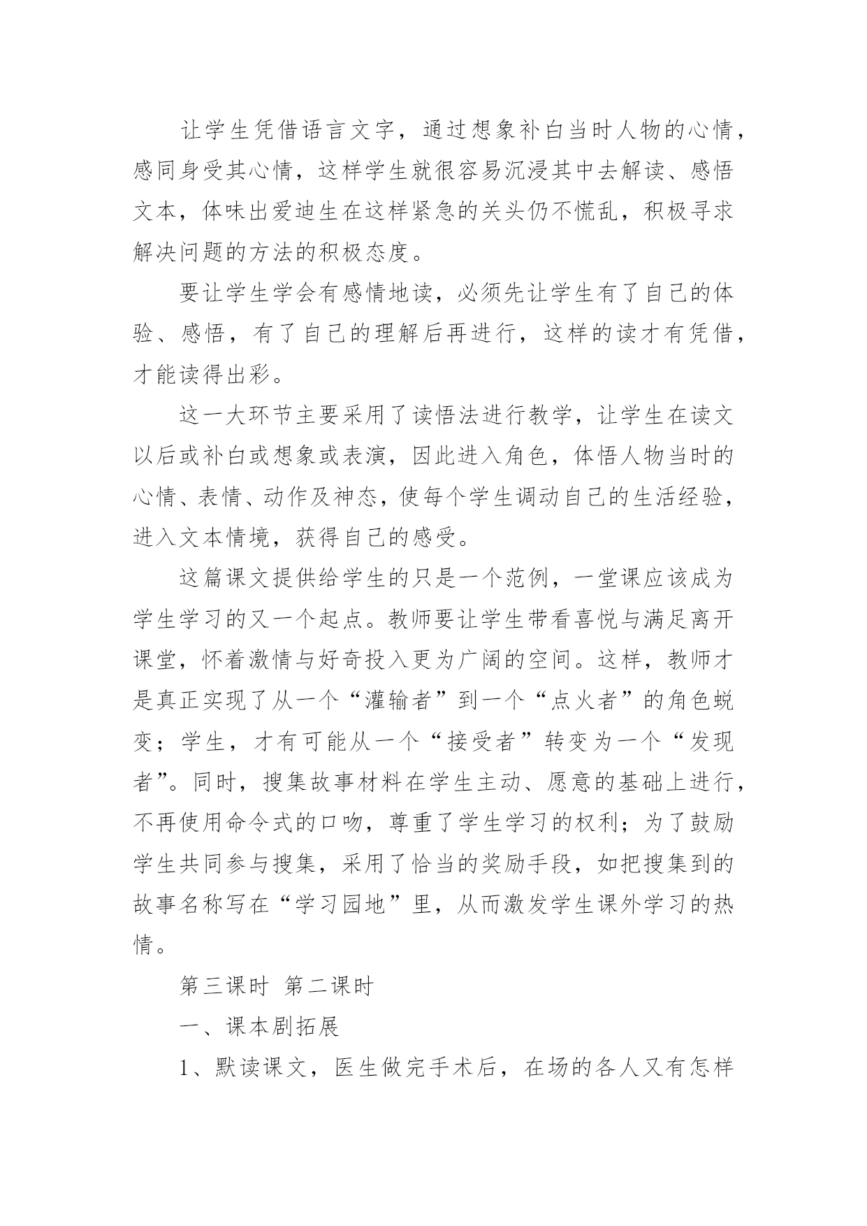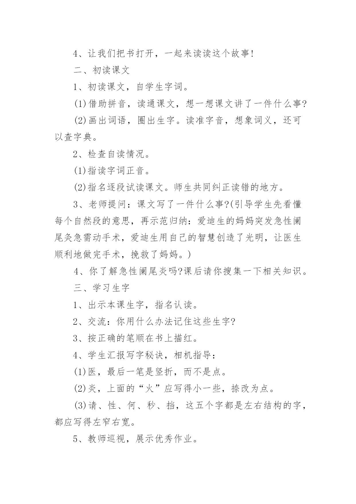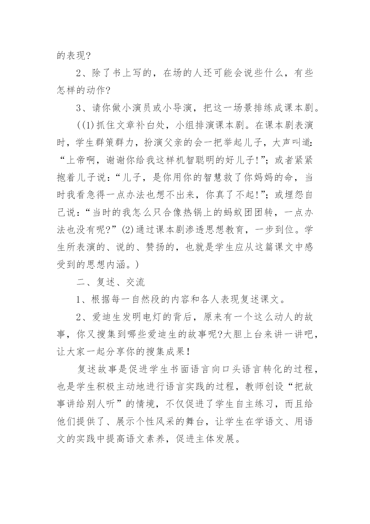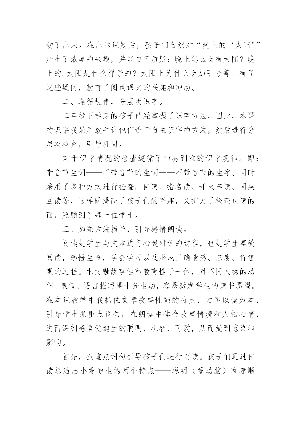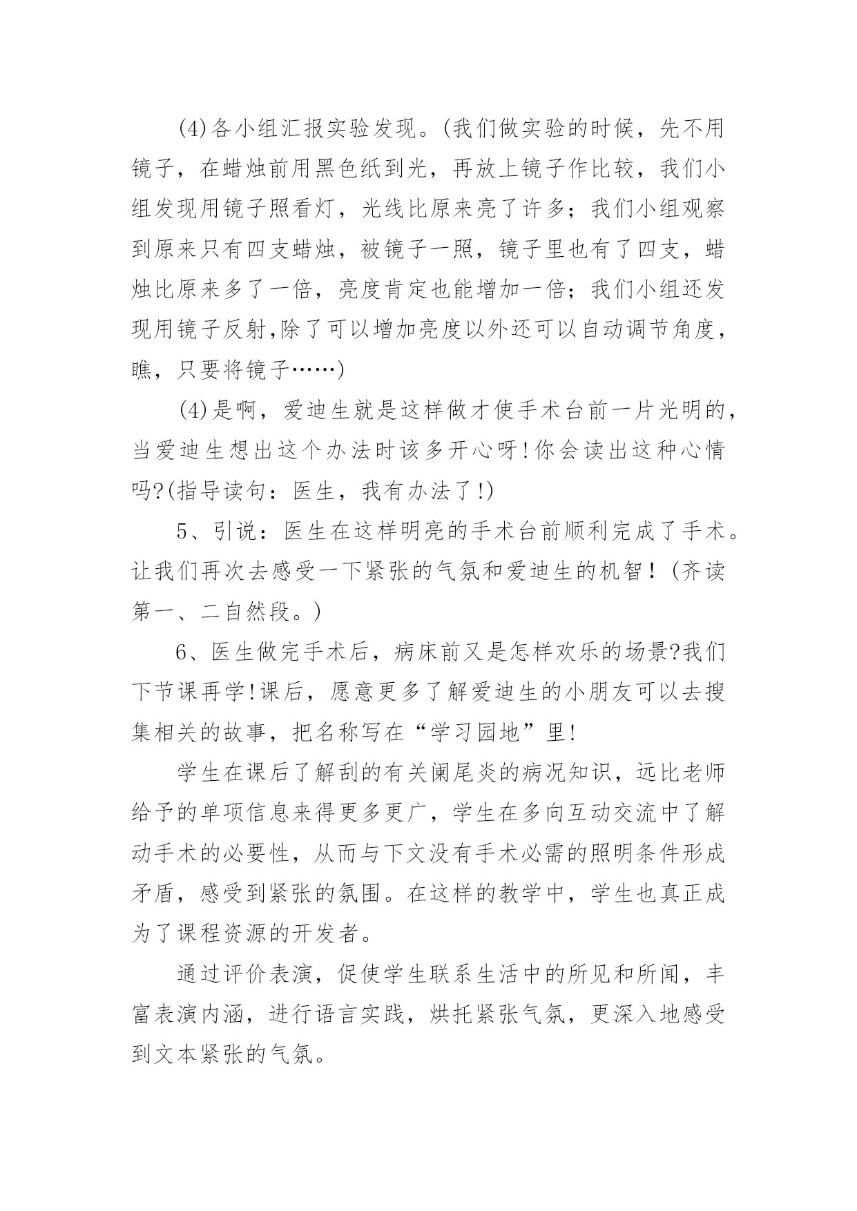 晚上的太阳教学设计晚上的太阳教学设计7篇在教学工作者实际的教学活动中,通常需要用到教学设计来辅助教学,教学设计是把教学原理转化为教学材料和教学活动的计划。教学设计应该怎么写才好呢?以下是小编收集整理的晚上的太阳教学设计,希望对大家有所帮助。晚上的太阳教学设计1教学目标1、学习默读课文,并能复述这个故事。2、学会本课的10个生字,理解由生字组成的词语。3、学习爱迪生遇到问题积极动脑动手,寻找解决问题的方法的好习惯。教学重难点课文第二自然段是教学的重点,其中理解爱迪生用镜面反射油灯灯光的用意是教学的难点。教学准备发动学生搜集发明大王爱迪生的故事。设计思路《晚上的“太阳”》一文所展示的情境与学生的现实生活有较大距离,但通过教师抓住文中的多处留白,或想象或表演或补白,使学生联系生活的已知,进行充分的想象和个性的表达,激发学生独特的体验,使故事情节更完整,人物形象更丰满,感受体验更深刻。本文还涉及到一些浅显的物理知识,也是学生理解的难点。教学时,教师通过放手让学生在小组里读一读、议一议、做一做、说一说来突破这一难点。教师没有先公布所谓的标准答案,而是引导学生自己去观察、思考、探究、发现、获得,从而使学生学会自主、合作、探究的学习方式。☆教学过程第一课时设计理念一、课题布疑1、(板书:晚上的“太阳”。)咦,晚上怎么还会有太阳?你能猜猜这是怎么回事吗?(晚上的“太阳”其实是指电灯,因为它和白天的太阳一样给我们带来光明……)2。原来如此,怪不得,“太阳”上面还要加个引号,想引起小朋友们对它的注意呢!关于晚上的“太阳”——电灯,你还知道些什么?(电灯是爱迪生发明的;爱迪生还发明了许多东西,如录音机、电影、电车等等,人们都叫他发明大王;现在我们的灯的品种很多,其中有一种安装在广场上的镭射灯,真的像小太阳那么亮;还有的灯更大的作用不光是为了照明,如美丽的霓虹灯、负责交通安全的红绿灯……)3、小朋友们知道的可真多,爱迪生为什么想要造一个晚上的“太阳”呢?这就是我们今天要学习的内容。(学生读题。)4、让我们把书打开,一起来读读这个故事!二、初读课文1、初读课文,自学生字词。(1)借助拼音,读通课文,想一想课文讲了一件什么事?(2)画出词语,圈出生字。读准字音,想象词义,还可以查字典。2、检查自读情况。(1)指读字词正音。(2)指名逐段试读课文。师生共同纠正读错的地方。3、老师提问:课文写了一件什么事?(引导学生先看懂每个自然段的意思,再示范归纳:爱迪生的妈妈突发急性阑尾灸急需动手术,爱迪生用自己的智慧创造了光明,让医生顺利地做完手术,挽救了妈妈。)4、你了解急性阑尾炎吗?课后请你搜集一下相关知识。三、学习生字1、出示本课生字,指名认读。2、交流:你用什么办法记住这些生字?3、按正确的笔顺在书上描红。4、学生汇报写字秘诀,相机指导:(1)医,最后一笔是竖折,而不是点。(2)炎,上面的“火”应写得小一些,捺改为点。(3)请、性、何、秒、挡,这五个字都是左右结构的字,都应写得左窄右宽。5、教师巡视,展示优秀作业。开放的问题带来开放的思维,不要小瞧你的学生,有时候他们可能比你知道的更多。“开篇须读”,给学生充分的读书时间,让学生切切实实地接触文本,走进文本,做到“不读熟,不开讲。”对低年级的学生进行归纳文章大意的指导是十分必要的,同时这也是理清文章脉络的途径。大语文教学观要求教师立足于课内阅读教学,延伸于课外和校外的学习活动,因此在课堂上教师妥善于利用一切可利用的环节,促使学生积极主动并多角度接触纸本书、电子书、无字书(大自然),从而养成多方搜集处理信息的能力。写字是低年级语文学习的一项重要内容,教师一要在时间上予以保汪,二要加强指导、循序渐进、扎实训练,使写字教学真正落到实处。第二课时第二课时师生共同参与课程开发1.今天我们继续学习第15课——《晚上的“太阳”》。(学生读题。)2、引说课文第一自然段:一个大雪天的晚上,爱迪生的妈妈突然病了。爸爸请来的医生说,妈妈得的是急性阑尾炎,需要马上做手术。3、根据你课后了解的情况,谁来说说有关急性阑尾炎的病况知识?4、是啊,急性阑尾炎急需马上做手术,否则就有生命危险,面对这种危急情况,在场的人又是怎样的表现?请小朋友自由读课文第二自然段。(以下板块随着学生的回答进行随机教学。)板块一:医生犹豫了。(1)医生为什么犹豫了?能读读课文,找出原因,并用自己的话说说吗?(因为当时是晚上,还没有电灯,油灯的光线又很暗,在光线这样昏暗的环境下动手术,医生没有把握,因此他犹豫了。)(2)你能读出医生对手术没有把握,犹豫不决的心情吗?(指导朗读课文第二自然段的前两句。)板块二:爸爸无可奈何地搓着手。(1)你能表演出爸爸这种着急的样子吗?(2)评价表演。(爸爸听看妈妈的呻吟声,还可能会着急得来回路步,坐立不安,皱着眉,搓着手,喻巴里