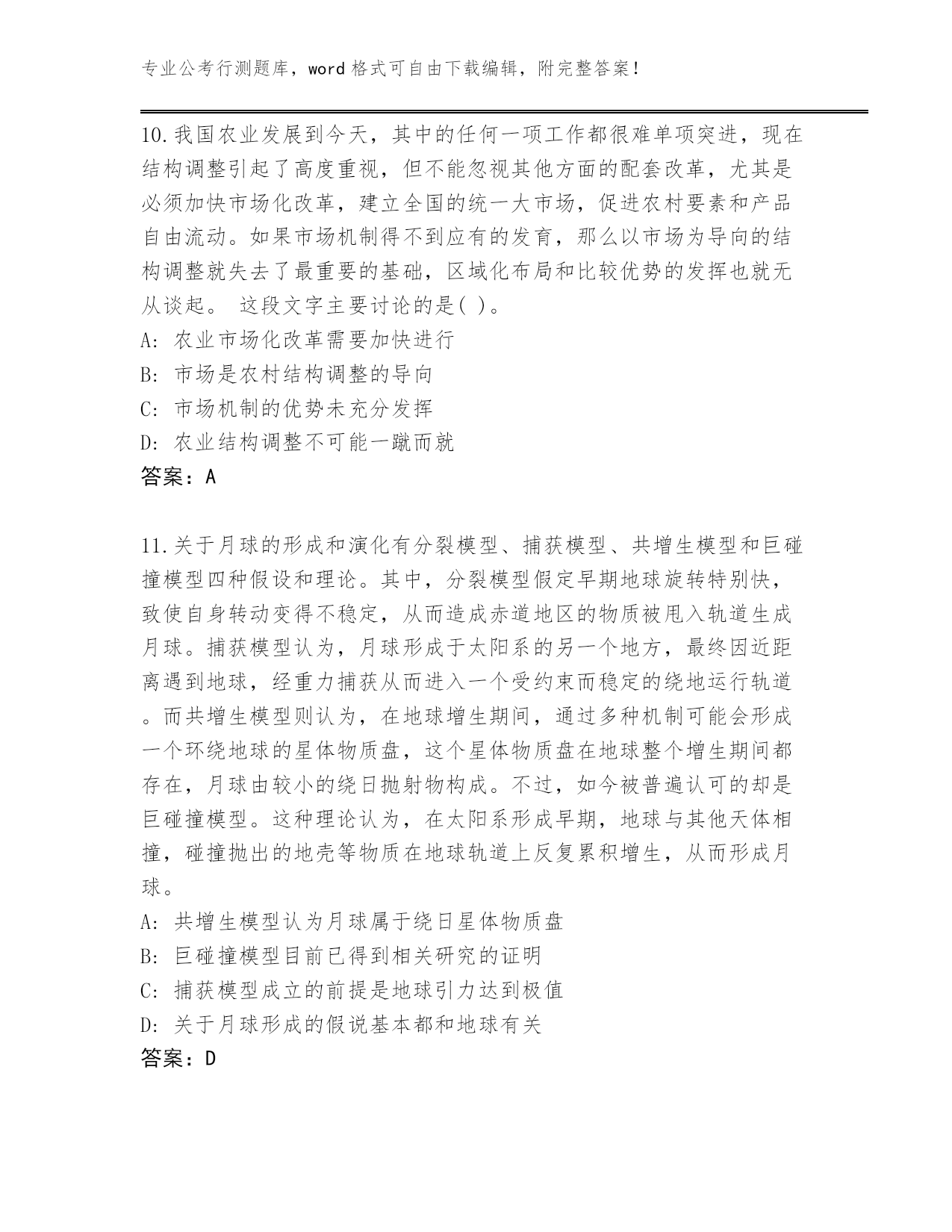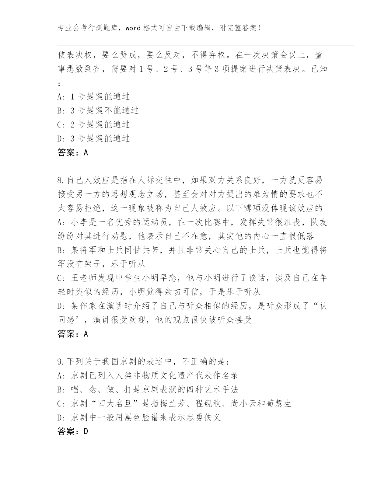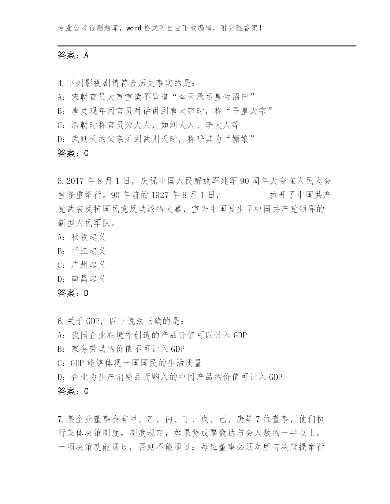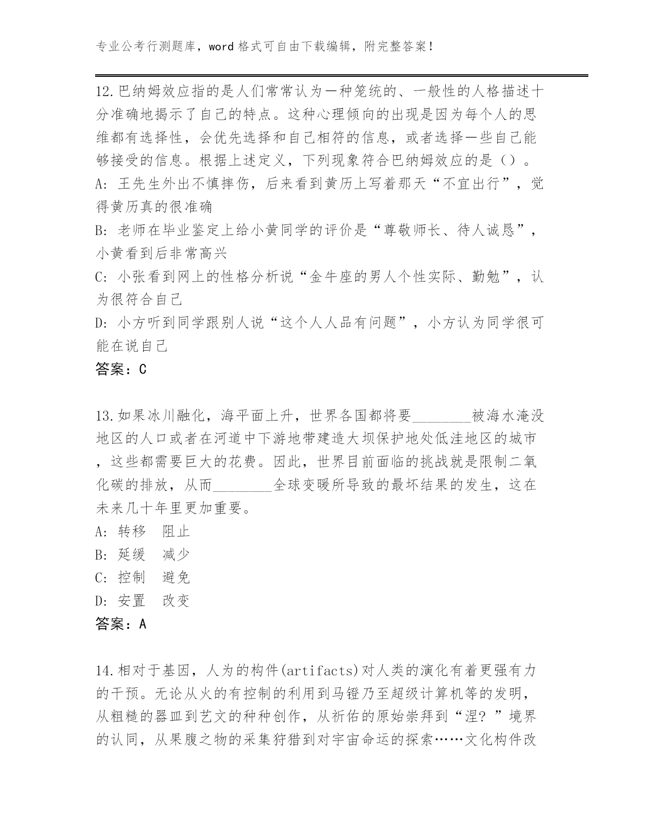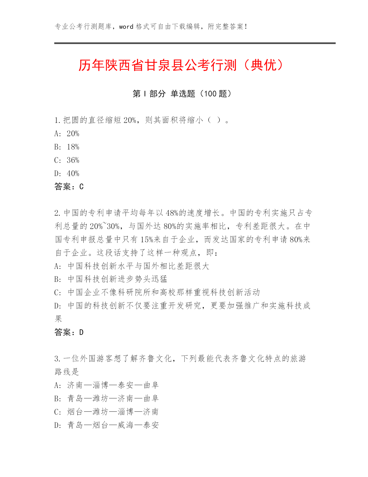 专业公考行测题库,word格式可自由下载编辑,附完整答案!历年陕西省甘泉县公考行测(典优)第I部分单选题(100题)1.把圆的直径缩短20%,则其面积将缩小()。A:20%B:18%C:36%D:40%答案:C2.中国的专利申请平均每年以48%的速度增长。中国的专利实施只占专利总量的20%~30%,与国外达80%的实施率相比,专利差距很大。在中国专利申报总量中只有15%来自于企业,而发达国家的专利申请80%来自于企业。这段话支持了这样一种观点,即:A:中国科技创新水平与国外相比差距很大B:中国科技创新进步势头迅猛C:中国企业不像科研院所和高校那样重视科技创新活动D:中国的科技创新不仅要注重开发研究,更要加强推广和实施科技成果答案:D3.一位外国游客想了解齐鲁文化,下列最能代表齐鲁文化特点的旅游路线是A:济南—淄博—泰安—曲阜B:青岛—潍坊—济南—曲阜C:烟台—潍坊—淄博—济南D:青岛—烟台—威海—泰安答案:A4.下列影视剧情符合历史事实的是:A:宋朝官员大声宣读圣旨道“奉天承运皇帝诏曰”B:唐贞观年间官员对话讲到唐太宗时,称“吾皇太宗”C:清朝时称官员为大人,如刘大人、李大人等D:武则天的父亲见到武则天时,称呼其为“媚娘”答案:C5.2017年8月1日,庆祝中国人民解放军建军90周年大会在人民大会堂隆重举行。90年前的1927年8月1日,__________拉开了中国共产党武装反抗国民党反动派的大幕,宣告中国诞生了中国共产党领导的新型人民军队。A:秋收起义B:平江起义C:广州起义D:南昌起义答案:D6.关于GDP,以下说法正确的是:A:我国企业在境外创造的产品价值可以计入GDPB:家务劳动的价值不可计入GDPC:GDP能够体现一国国民的生活质量D:企业为生产消费品而购入的中间产品的价值可计入GDP答案:C7.某企业董事会有甲、乙、丙、丁、戊、己、庚等7位董事,他们执行集体决策制度。制度规定,如果赞成票数达与会人数的一半以上,一项决策就能通过,否则不能通过;每位董事必须对所有决策提案行使表决权,要么赞成,要么反对,不得弃权。在一次决策会议上,董事悉数到齐,需要对1号、2号、3号等3项提案进行决策表决。已知:A:1号提案能通过B:3号提案不能通过C:2号提案能通过D:3号提案能通过答案:A8.自己人效应是指在人际交往中,如果双方关系良好,一方就更容易接受另一方的思想观念立场,甚至会对对方提出的难为情的要求也不太容易拒绝,这一现象被称为自己人效应。以下哪项没体现该效应的A:小李是一名优秀的运动员,在一次比赛中,发挥失常很沮丧,队友纷纷对其进行劝慰,他表示自己不在意,其实他的内心一直很低落B:某将军和士兵同甘共苦,并且非常关心自己的士兵,士兵也觉得将军没有架子,乐于听从C:王老师发现中学生小明早恋,他与小明进行了谈话,谈及自己在年轻时类似的经历,小明觉得亲切可信,于是乐于听从D:某作家在演讲时介绍了自己与听众相似的经历,是听众形成了“认同感’,演讲很受欢迎,他的观点很快被听众接受答案:A9.下列关于我国京剧的表述中,不正确的是:A:京剧已列入人类非物质文化遗产代表作名录B:唱、念、做、打是京剧表演的四种艺术手法C:京剧“四大名旦”是指梅兰芳、程砚秋、尚小云和荀慧生D:京剧中一般用黑色脸谱来表示忠勇侠义答案:D10.我国农业发展到今天,其中的任何一项工作都很难单项突进,现在结构调整引起了高度重视,但不能忽视其他方面的配套改革,尤其是必须加快市场化改革,建立全国的统一大市场,促进农村要素和产品自由流动。如果市场机制得不到应有的发育,那么以市场为导向的结构调整就失去了最重要的基础,区域化布局和比较优势的发挥也就无从谈起。这段文字主要讨论的是()。A:农业市场化改革需要加快进行B:市场是农村结构调整的导向C:市场机制的优势未充分发挥D:农业结构调整不可能一蹴而就答案:A11.关于月球的形成和演化有分裂模型、捕获模型、共增生模型和巨碰撞模型四种假设和理论。其中,分裂模型假定早期地球旋转特别快,致使自身转动变得不稳定,从而造成赤道地区的物质被甩入轨道生成月球。捕获模型认为,月球形成于太阳系的另一个地方,最终因近距离遇到地球,经重力捕获从而进入一个受约束而稳定的绕地运行轨道。而共增生模型则认为,在地球增生期间,通过多种机制可能会形成一个环绕地球的星体物质盘,这个星体物质盘在地球整个增生期间都存在,月球由较小的绕日抛射物构成。不过,如今被普遍认可的却是巨碰撞模型。这种理论认为,在太阳系形成早期,地球与其他天体相撞,碰撞抛出的地壳等物质在地球轨道上反复累积增生,从而形成月球。A:共增生模型认为月
