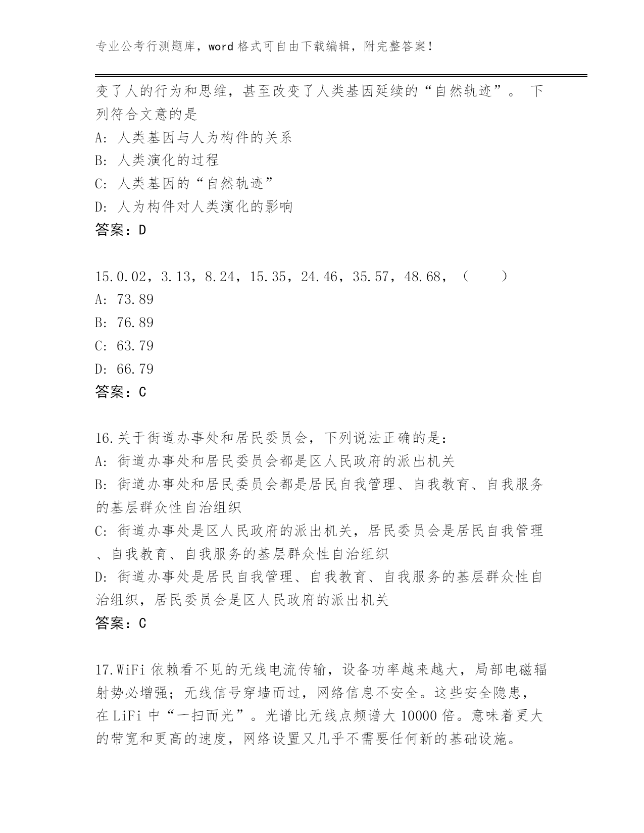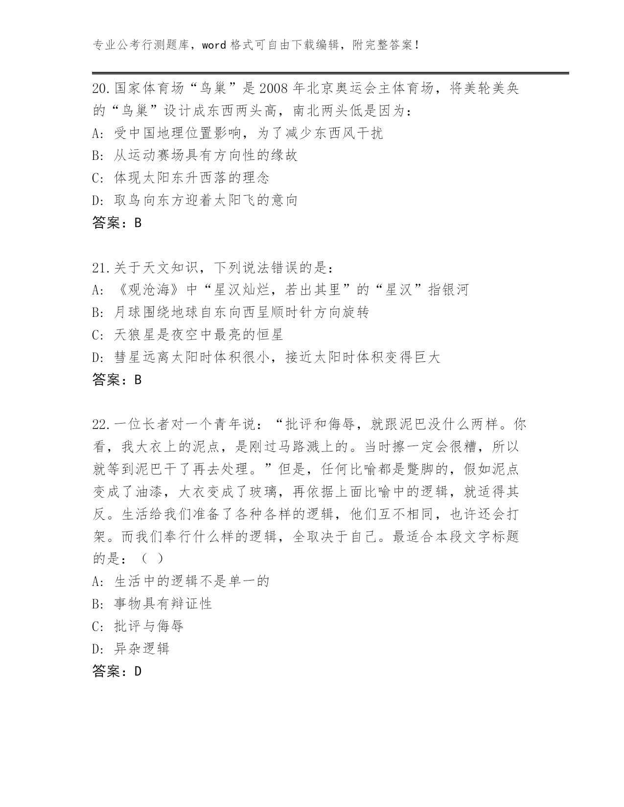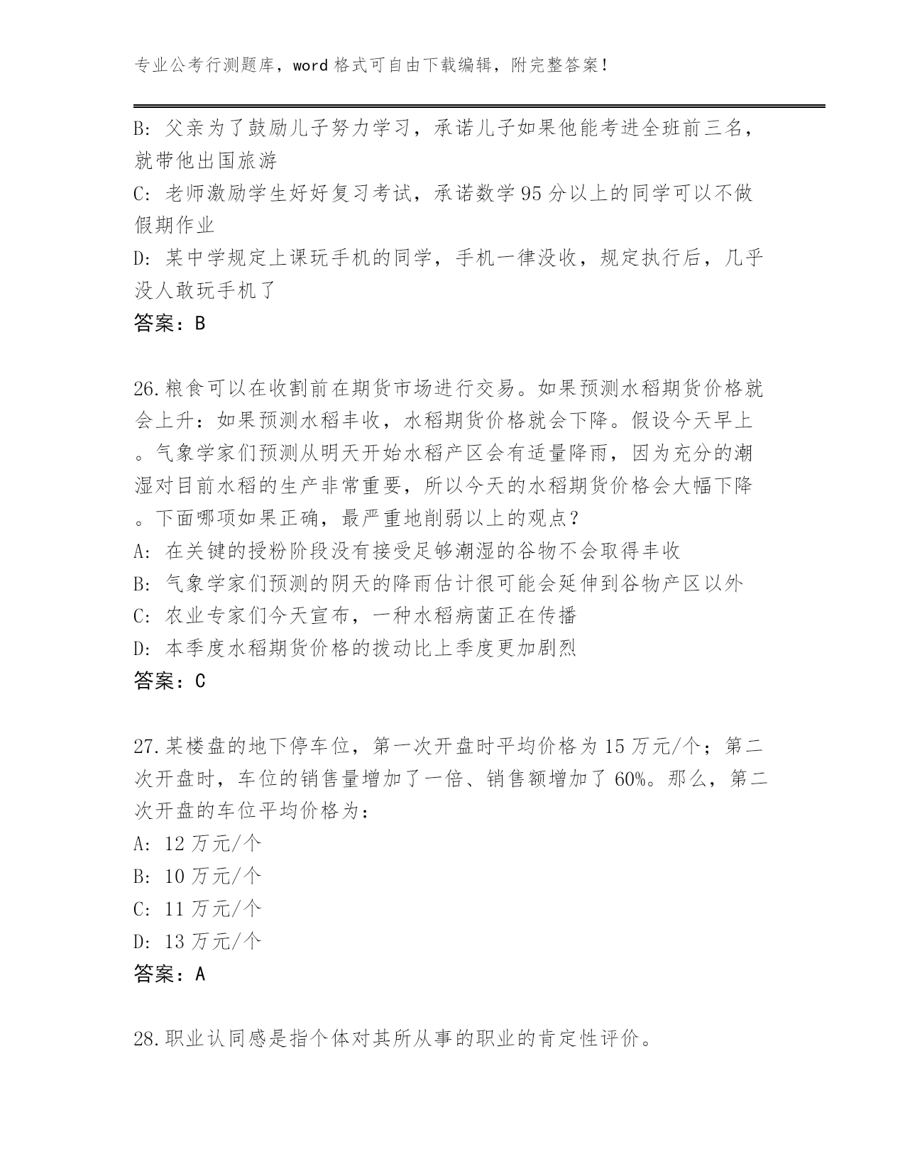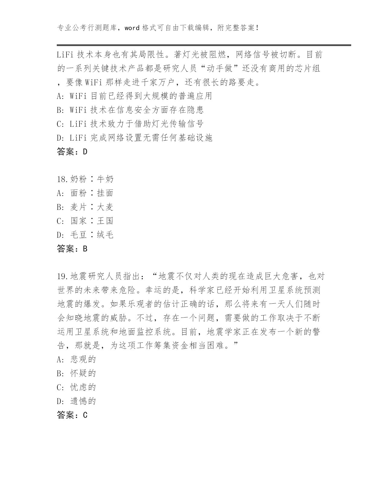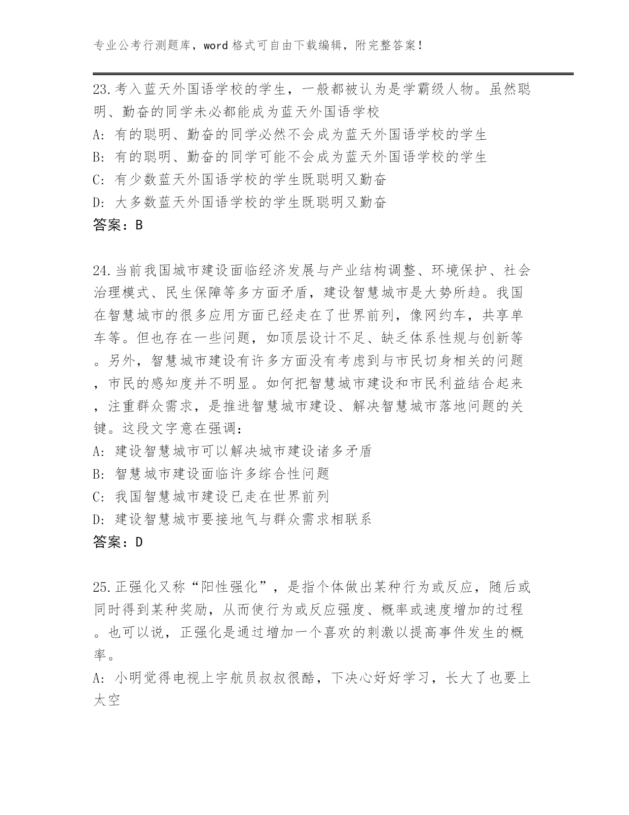 专业公考行测题库,word格式可自由下载编辑,附完整答案!历年陕西省甘泉县公考行测(典优)第I部分单选题(100题)1.把圆的直径缩短20%,则其面积将缩小()。A:20%B:18%C:36%D:40%答案:C2.中国的专利申请平均每年以48%的速度增长。中国的专利实施只占专利总量的20%~30%,与国外达80%的实施率相比,专利差距很大。在中国专利申报总量中只有15%来自于企业,而发达国家的专利申请80%来自于企业。这段话支持了这样一种观点,即:A:中国科技创新水平与国外相比差距很大B:中国科技创新进步势头迅猛C:中国企业不像科研院所和高校那样重视科技创新活动D:中国的科技创新不仅要注重开发研究,更要加强推广和实施科技成果答案:D3.一位外国游客想了解齐鲁文化,下列最能代表齐鲁文化特点的旅游路线是A:济南—淄博—泰安—曲阜B:青岛—潍坊—济南—曲阜C:烟台—潍坊—淄博—济南D:青岛—烟台—威海—泰安答案:A4.下列影视剧情符合历史事实的是:A:宋朝官员大声宣读圣旨道“奉天承运皇帝诏曰”B:唐贞观年间官员对话讲到唐太宗时,称“吾皇太宗”C:清朝时称官员为大人,如刘大人、李大人等D:武则天的父亲见到武则天时,称呼其为“媚娘”答案:C5.2017年8月1日,庆祝中国人民解放军建军90周年大会在人民大会堂隆重举行。90年前的1927年8月1日,__________拉开了中国共产党武装反抗国民党反动派的大幕,宣告中国诞生了中国共产党领导的新型人民军队。A:秋收起义B:平江起义C:广州起义D:南昌起义答案:D6.关于GDP,以下说法正确的是:A:我国企业在境外创造的产品价值可以计入GDPB:家务劳动的价值不可计入GDPC:GDP能够体现一国国民的生活质量D:企业为生产消费品而购入的中间产品的价值可计入GDP答案:C7.某企业董事会有甲、乙、丙、丁、戊、己、庚等7位董事,他们执行集体决策制度。制度规定,如果赞成票数达与会人数的一半以上,一项决策就能通过,否则不能通过;每位董事必须对所有决策提案行使表决权,要么赞成,要么反对,不得弃权。在一次决策会议上,董事悉数到齐,需要对1号、2号、3号等3项提案进行决策表决。已知:A:1号提案能通过B:3号提案不能通过C:2号提案能通过D:3号提案能通过答案:A8.自己人效应是指在人际交往中,如果双方关系良好,一方就更容易接受另一方的思想观念立场,甚至会对对方提出的难为情的要求也不太容易拒绝,这一现象被称为自己人效应。以下哪项没体现该效应的A:小李是一名优秀的运动员,在一次比赛中,发挥失常很沮丧,队友纷纷对其进行劝慰,他表示自己不在意,其实他的内心一直很低落B:某将军和士兵同甘共苦,并且非常关心自己的士兵,士兵也觉得将军没有架子,乐于听从C:王老师发现中学生小明早恋,他与小明进行了谈话,谈及自己在年轻时类似的经历,小明觉得亲切可信,于是乐于听从D:某作家在演讲时介绍了自己与听众相似的经历,是听众形成了“认同感’,演讲很受欢迎,他的观点很快被听众接受答案:A9.下列关于我国京剧的表述中,不正确的是:A:京剧已列入人类非物质文化遗产代表作名录B:唱、念、做、打是京剧表演的四种艺术手法C:京剧“四大名旦”是指梅兰芳、程砚秋、尚小云和荀慧生D:京剧中一般用黑色脸谱来表示忠勇侠义答案:D10.我国农业发展到今天,其中的任何一项工作都很难单项突进,现在结构调整引起了高度重视,但不能忽视其他方面的配套改革,尤其是必须加快市场化改革,建立全国的统一大市场,促进农村要素和产品自由流动。如果市场机制得不到应有的发育,那么以市场为导向的结构调整就失去了最重要的基础,区域化布局和比较优势的发挥也就无从谈起。这段文字主要讨论的是()。A:农业市场化改革需要加快进行B:市场是农村结构调整的导向C:市场机制的优势未充分发挥D:农业结构调整不可能一蹴而就答案:A11.关于月球的形成和演化有分裂模型、捕获模型、共增生模型和巨碰撞模型四种假设和理论。其中,分裂模型假定早期地球旋转特别快,致使自身转动变得不稳定,从而造成赤道地区的物质被甩入轨道生成月球。捕获模型认为,月球形成于太阳系的另一个地方,最终因近距离遇到地球,经重力捕获从而进入一个受约束而稳定的绕地运行轨道。而共增生模型则认为,在地球增生期间,通过多种机制可能会形成一个环绕地球的星体物质盘,这个星体物质盘在地球整个增生期间都存在,月球由较小的绕日抛射物构成。不过,如今被普遍认可的却是巨碰撞模型。这种理论认为,在太阳系形成早期,地球与其他天体相撞,碰撞抛出的地壳等物质在地球轨道上反复累积增生,从而形成月球。A:共增生模型认为月