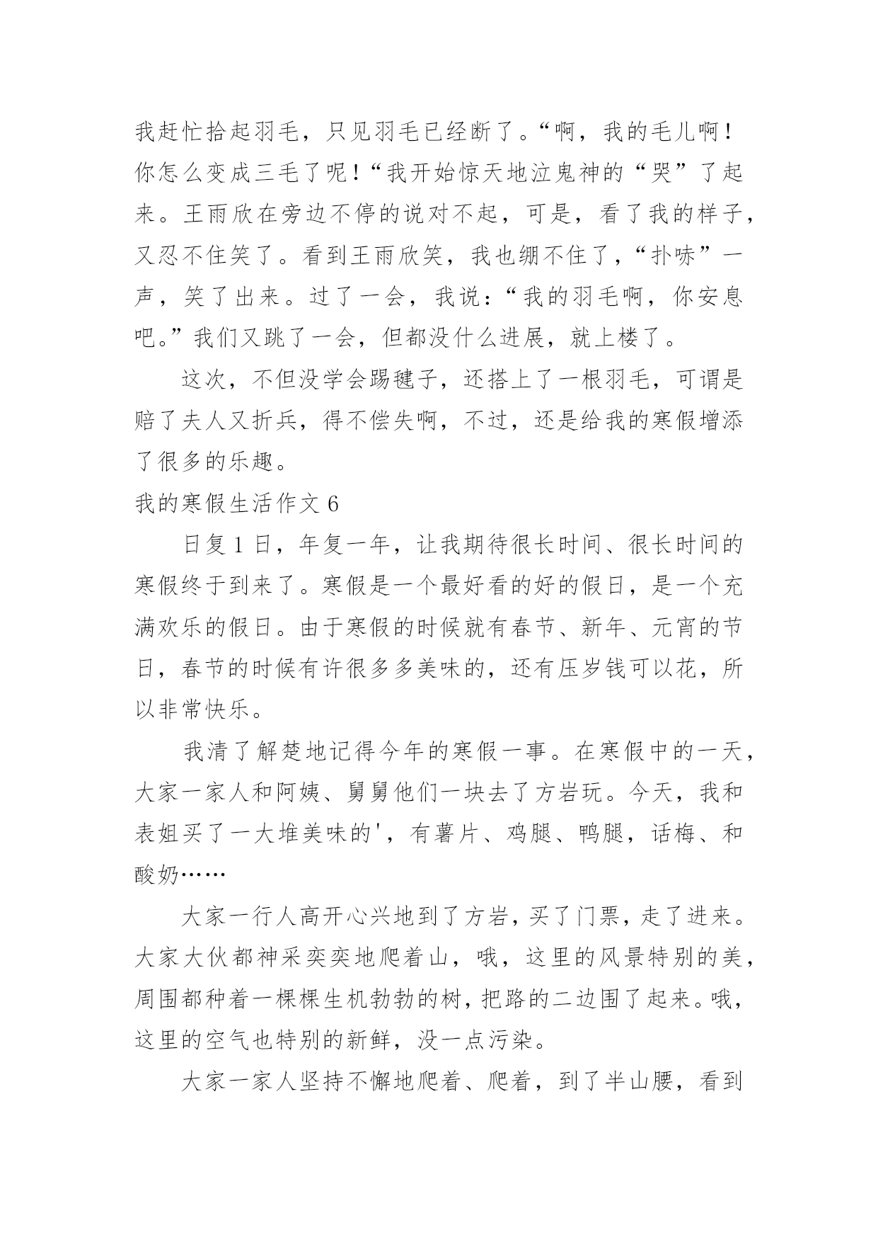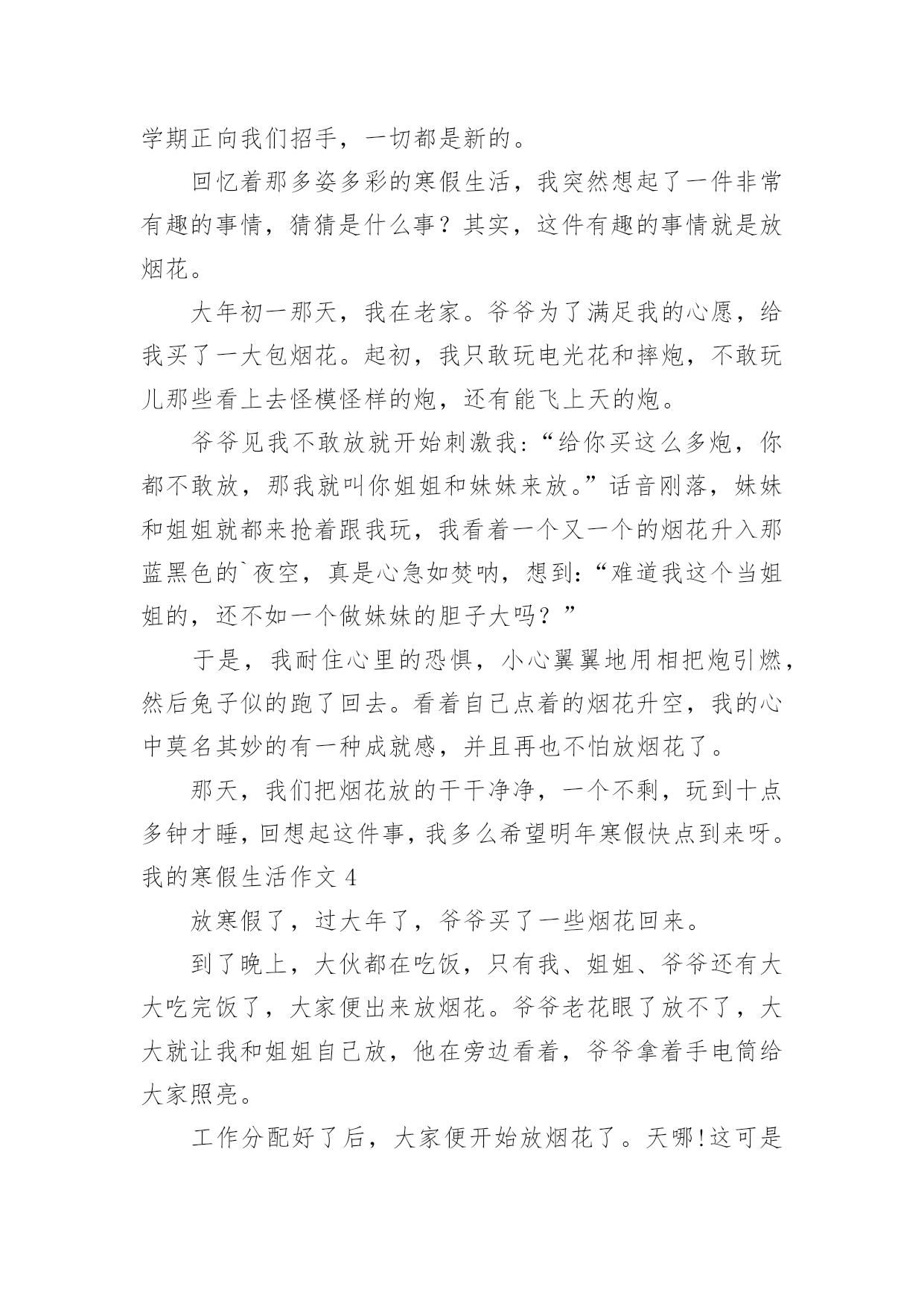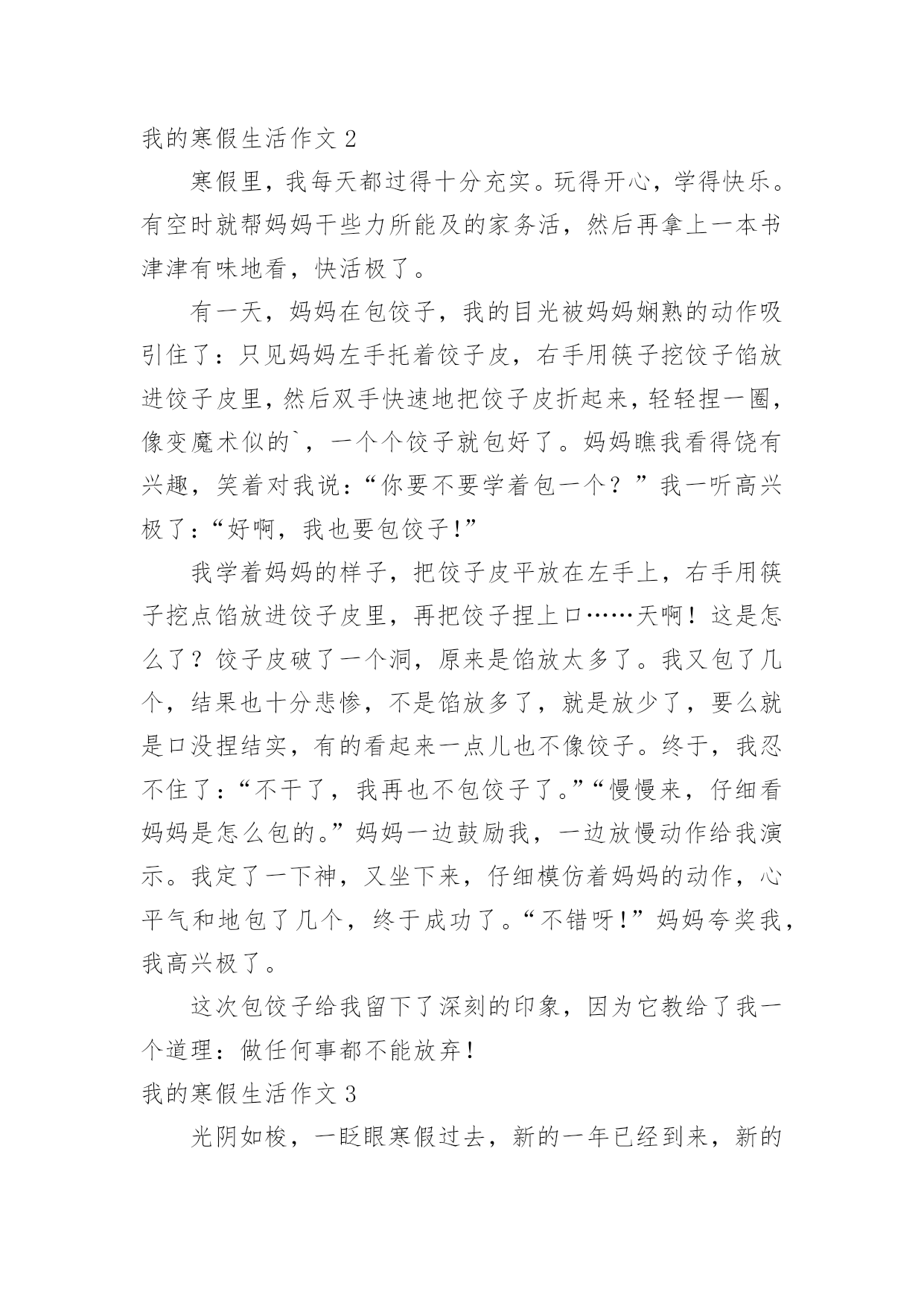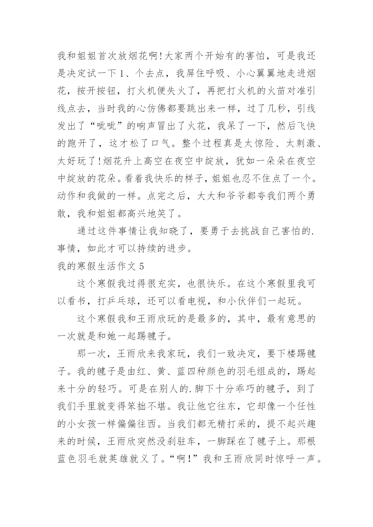我的寒假生活作文我的寒假生活作文【精品】在日常生活或是工作学习中,大家都接触过作文吧,作文是由文字组成,经过人的思想考虑,通过语言组织来表达一个主题意义的文体。那么,怎么去写作文呢?以下是小编为大家收集的我的寒假生活作文,希望能够帮助到大家。我的寒假生活作文1没有放寒假的时候我对寒假生活充满了向往,真正放寒假的时候,却是在写作业中度过的`,还好我的无聊作业生活中还有"抓娃娃"这样快乐的事情陪着我!因为成绩考的不理想,姐姐带我去了世纪城的智适应辅导班去写寒假作业,姐姐让我上午写语文下午写数学,但是如果我写的快了,姐姐就会让我休息一下,她给我买了一些游戏币,一天只让我玩几个,每次作业完成的好姐姐都会给我几个游戏币我就去娃娃机那里去抓娃娃,可是我每次去都没有抓到,浪费了好多游戏币,让我很生气,我去找姐姐,姐姐说她要帮我去抓,可是姐姐也抓了好多次没有抓到,辅导班里有一个大哥哥,姐姐说他抓娃娃很厉害,本来姐姐说让大哥哥带我去抓的,我听了很开心,可是大哥哥该上课了,只好先去上课,然后就忘记这件事了,到最后我们也没有抓到娃娃。可是我却很开心!娃娃,下回我一定抓到你!我的寒假生活作文2寒假里,我每天都过得十分充实。玩得开心,学得快乐。有空时就帮妈妈干些力所能及的家务活,然后再拿上一本书津津有味地看,快活极了。有一天,妈妈在包饺子,我的目光被妈妈娴熟的动作吸引住了:只见妈妈左手托着饺子皮,右手用筷子挖饺子馅放进饺子皮里,然后双手快速地把饺子皮折起来,轻轻捏一圈,像变魔术似的`,一个个饺子就包好了。妈妈瞧我看得饶有兴趣,笑着对我说:“你要不要学着包一个?”我一听高兴极了:“好啊,我也要包饺子!”我学着妈妈的样子,把饺子皮平放在左手上,右手用筷子挖点馅放进饺子皮里,再把饺子捏上口……天啊!这是怎么了?饺子皮破了一个洞,原来是馅放太多了。我又包了几个,结果也十分悲惨,不是馅放多了,就是放少了,要么就是口没捏结实,有的看起来一点儿也不像饺子。终于,我忍不住了:“不干了,我再也不包饺子了。”“慢慢来,仔细看妈妈是怎么包的。”妈妈一边鼓励我,一边放慢动作给我演示。我定了一下神,又坐下来,仔细模仿着妈妈的动作,心平气和地包了几个,终于成功了。“不错呀!”妈妈夸奖我,我高兴极了。这次包饺子给我留下了深刻的印象,因为它教给了我一个道理:做任何事都不能放弃!我的寒假生活作文3光阴如梭,一眨眼寒假过去,新的一年已经到来,新的学期正向我们招手,一切都是新的。回忆着那多姿多彩的寒假生活,我突然想起了一件非常有趣的事情,猜猜是什么事?其实,这件有趣的事情就是放烟花。大年初一那天,我在老家。爷爷为了满足我的心愿,给我买了一大包烟花。起初,我只敢玩电光花和摔炮,不敢玩儿那些看上去怪模怪样的炮,还有能飞上天的炮。爷爷见我不敢放就开始刺激我:“给你买这么多炮,你都不敢放,那我就叫你姐姐和妹妹来放。”话音刚落,妹妹和姐姐就都来抢着跟我玩,我看着一个又一个的烟花升入那蓝黑色的`夜空,真是心急如焚呐,想到:“难道我这个当姐姐的,还不如一个做妹妹的胆子大吗?”于是,我耐住心里的恐惧,小心翼翼地用相把炮引燃,然后兔子似的跑了回去。看着自己点着的烟花升空,我的心中莫名其妙的有一种成就感,并且再也不怕放烟花了。那天,我们把烟花放的干干净净,一个不剩,玩到十点多钟才睡,回想起这件事,我多么希望明年寒假快点到来呀。我的寒假生活作文4放寒假了,过大年了,爷爷买了一些烟花回来。到了晚上,大伙都在吃饭,只有我、姐姐、爷爷还有大大吃完饭了,大家便出来放烟花。爷爷老花眼了放不了,大大就让我和姐姐自己放,他在旁边看着,爷爷拿着手电筒给大家照亮。工作分配好了后,大家便开始放烟花了。天哪!这可是我和姐姐首次放烟花啊!大家两个开始有的害怕,可是我还是决定试一下1、个去点,我屏住呼吸、小心翼翼地走进烟花,按开按钮,打火机便失火了,再把打火机的火苗对准引线点去,当时我的心仿佛都要跳出来一样,过了几秒,引线发出了“呲呲”的响声冒出了火花,我呆了一下,然后飞快的跑开了,这才松了口气。整个过程真是太惊险、太刺激、太好玩了!烟花升上高空在夜空中绽放,犹如一朵朵在夜空中绽放的花朵。看着我快乐的样子,姐姐也忍不住点了一个。动作和我做的一样。点完之后,大大和爷爷都夸我们两个勇敢,我和姐姐都高兴地笑了。通过这件事情让我知晓了,要勇于去挑战自己害怕的.事情,如此才可以持续的进步。我的寒假生活作文5这个寒假我过得很充实,也很快乐。在这个寒假里我可以看书,打乒乓球,还可以看电视,和小伙伴们一起玩。这个寒假我和王雨欣玩的是最多的,其中,最有意思的一次就是和她一起踢毽子。那一次,王雨欣来我家玩,我们一致决定,要下楼踢毽子。我的毽子是由红、黄、蓝四种颜色的羽毛组成的,踢起来十分的轻巧。可是在别人的.脚下十分乖巧的毽子,到了我们手里就变得笨拙不
