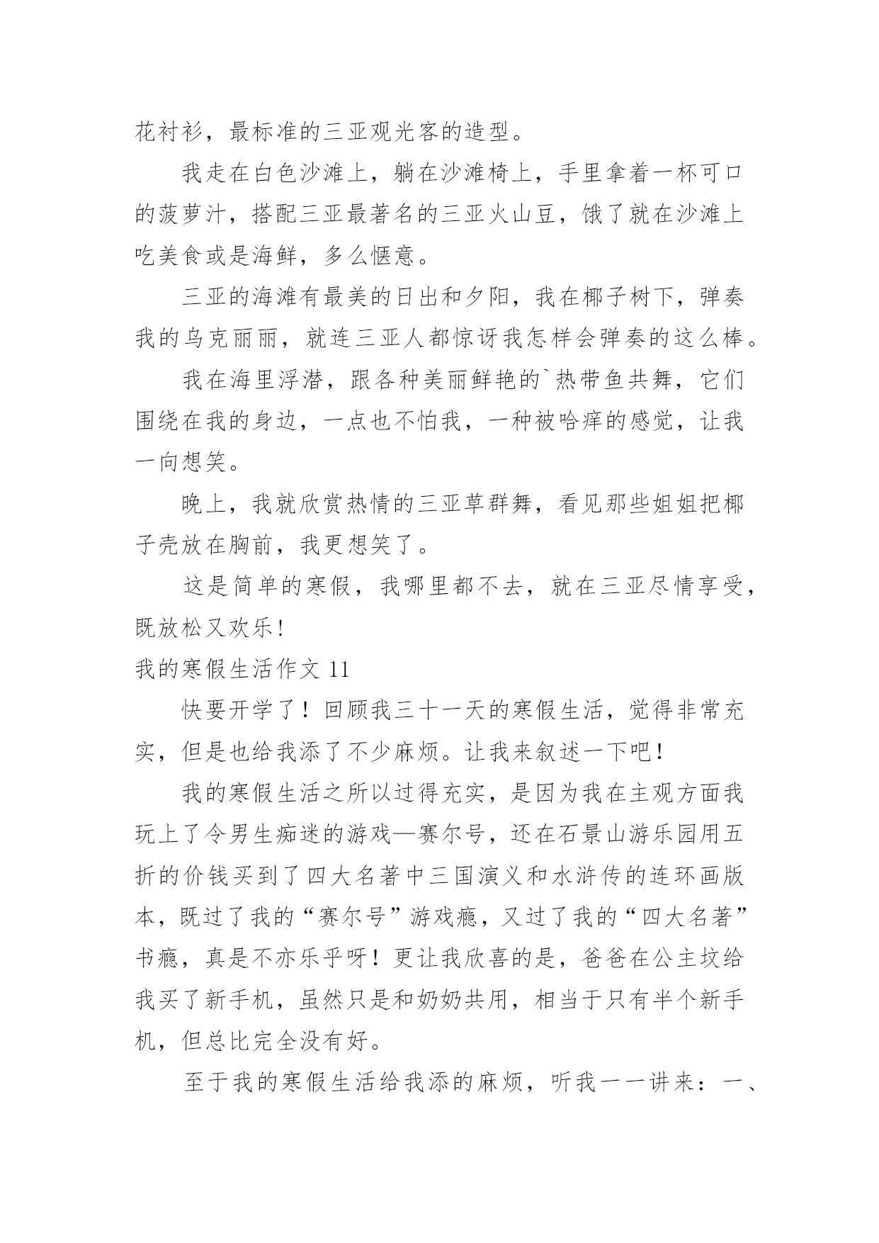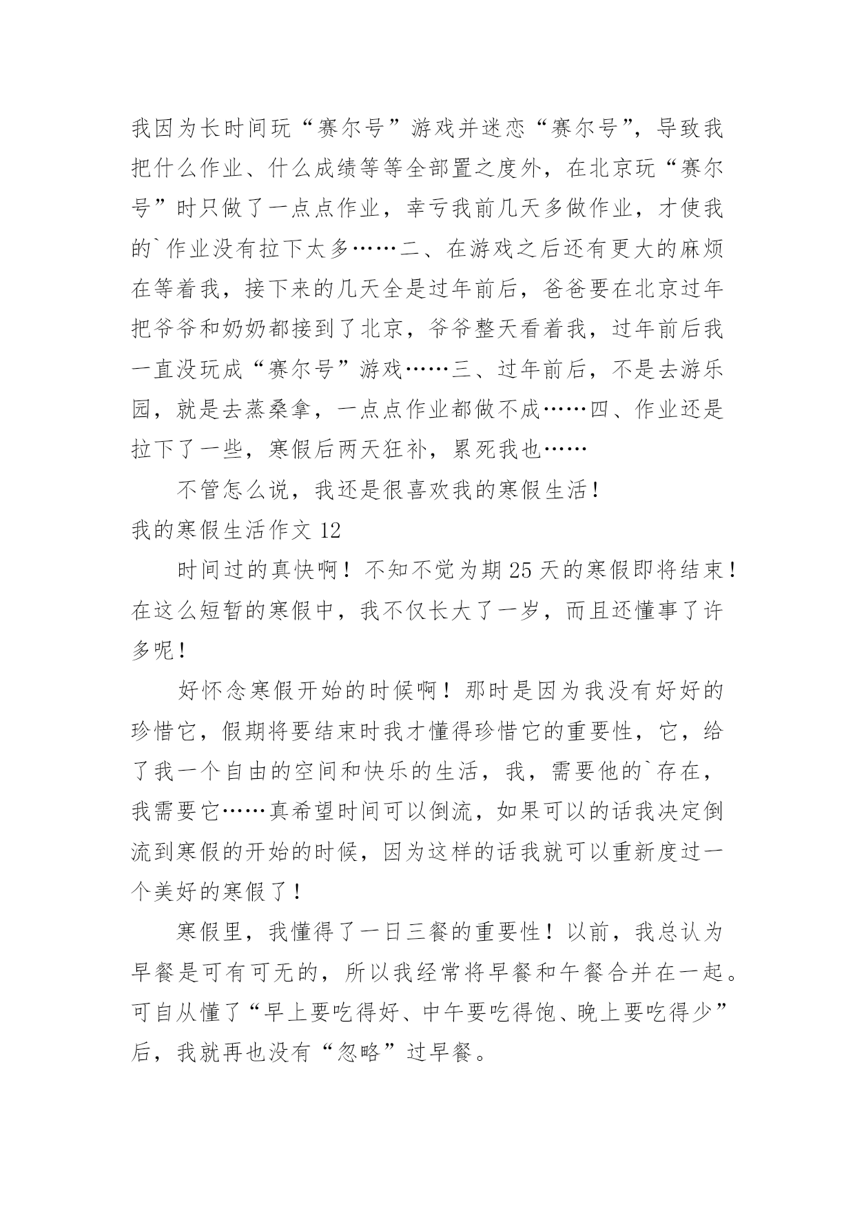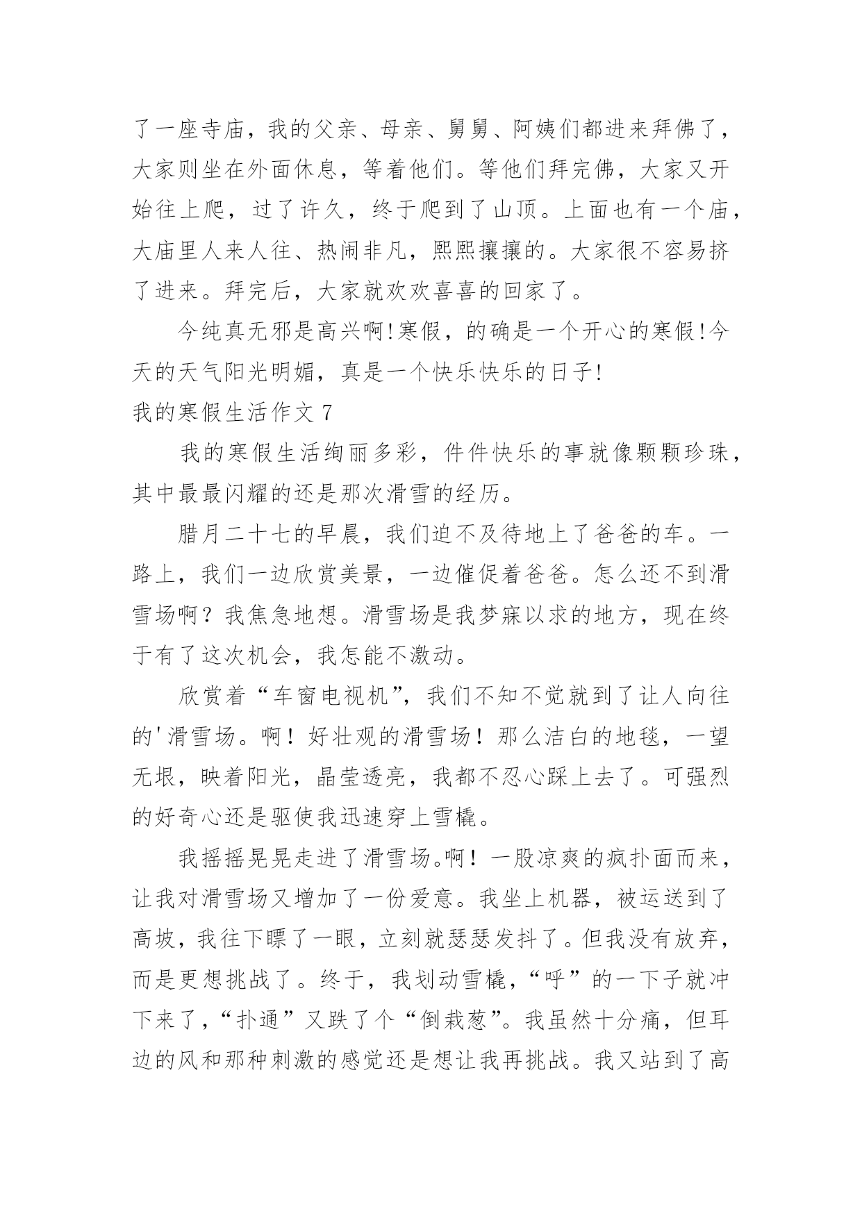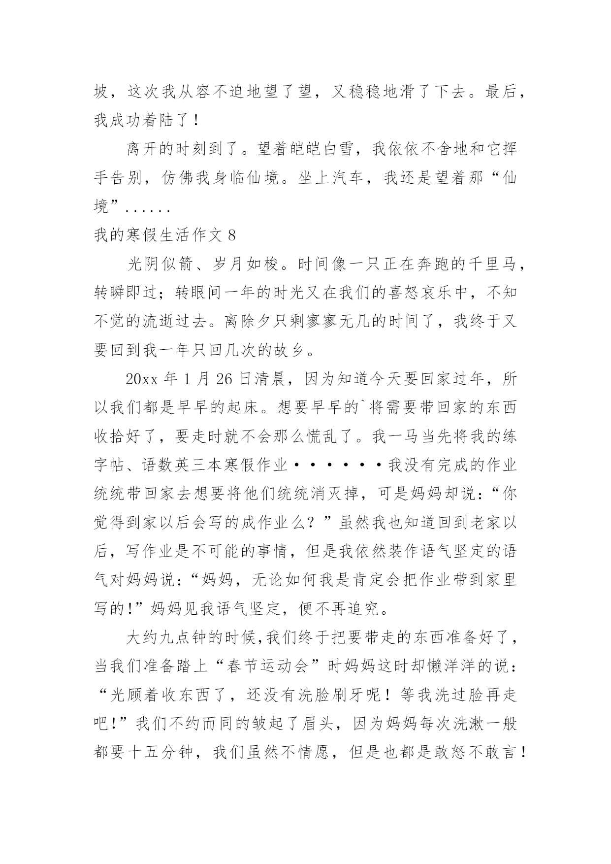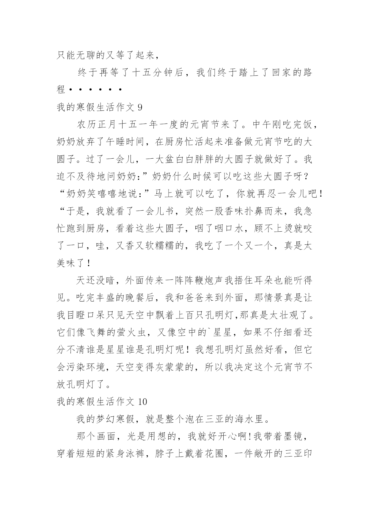 我的寒假生活作文我的寒假生活作文【精品】在日常生活或是工作学习中,大家都接触过作文吧,作文是由文字组成,经过人的思想考虑,通过语言组织来表达一个主题意义的文体。那么,怎么去写作文呢?以下是小编为大家收集的我的寒假生活作文,希望能够帮助到大家。我的寒假生活作文1没有放寒假的时候我对寒假生活充满了向往,真正放寒假的时候,却是在写作业中度过的`,还好我的无聊作业生活中还有"抓娃娃"这样快乐的事情陪着我!因为成绩考的不理想,姐姐带我去了世纪城的智适应辅导班去写寒假作业,姐姐让我上午写语文下午写数学,但是如果我写的快了,姐姐就会让我休息一下,她给我买了一些游戏币,一天只让我玩几个,每次作业完成的好姐姐都会给我几个游戏币我就去娃娃机那里去抓娃娃,可是我每次去都没有抓到,浪费了好多游戏币,让我很生气,我去找姐姐,姐姐说她要帮我去抓,可是姐姐也抓了好多次没有抓到,辅导班里有一个大哥哥,姐姐说他抓娃娃很厉害,本来姐姐说让大哥哥带我去抓的,我听了很开心,可是大哥哥该上课了,只好先去上课,然后就忘记这件事了,到最后我们也没有抓到娃娃。可是我却很开心!娃娃,下回我一定抓到你!我的寒假生活作文2寒假里,我每天都过得十分充实。玩得开心,学得快乐。有空时就帮妈妈干些力所能及的家务活,然后再拿上一本书津津有味地看,快活极了。有一天,妈妈在包饺子,我的目光被妈妈娴熟的动作吸引住了:只见妈妈左手托着饺子皮,右手用筷子挖饺子馅放进饺子皮里,然后双手快速地把饺子皮折起来,轻轻捏一圈,像变魔术似的`,一个个饺子就包好了。妈妈瞧我看得饶有兴趣,笑着对我说:“你要不要学着包一个?”我一听高兴极了:“好啊,我也要包饺子!”我学着妈妈的样子,把饺子皮平放在左手上,右手用筷子挖点馅放进饺子皮里,再把饺子捏上口……天啊!这是怎么了?饺子皮破了一个洞,原来是馅放太多了。我又包了几个,结果也十分悲惨,不是馅放多了,就是放少了,要么就是口没捏结实,有的看起来一点儿也不像饺子。终于,我忍不住了:“不干了,我再也不包饺子了。”“慢慢来,仔细看妈妈是怎么包的。”妈妈一边鼓励我,一边放慢动作给我演示。我定了一下神,又坐下来,仔细模仿着妈妈的动作,心平气和地包了几个,终于成功了。“不错呀!”妈妈夸奖我,我高兴极了。这次包饺子给我留下了深刻的印象,因为它教给了我一个道理:做任何事都不能放弃!我的寒假生活作文3光阴如梭,一眨眼寒假过去,新的一年已经到来,新的学期正向我们招手,一切都是新的。回忆着那多姿多彩的寒假生活,我突然想起了一件非常有趣的事情,猜猜是什么事?其实,这件有趣的事情就是放烟花。大年初一那天,我在老家。爷爷为了满足我的心愿,给我买了一大包烟花。起初,我只敢玩电光花和摔炮,不敢玩儿那些看上去怪模怪样的炮,还有能飞上天的炮。爷爷见我不敢放就开始刺激我:“给你买这么多炮,你都不敢放,那我就叫你姐姐和妹妹来放。”话音刚落,妹妹和姐姐就都来抢着跟我玩,我看着一个又一个的烟花升入那蓝黑色的`夜空,真是心急如焚呐,想到:“难道我这个当姐姐的,还不如一个做妹妹的胆子大吗?”于是,我耐住心里的恐惧,小心翼翼地用相把炮引燃,然后兔子似的跑了回去。看着自己点着的烟花升空,我的心中莫名其妙的有一种成就感,并且再也不怕放烟花了。那天,我们把烟花放的干干净净,一个不剩,玩到十点多钟才睡,回想起这件事,我多么希望明年寒假快点到来呀。我的寒假生活作文4放寒假了,过大年了,爷爷买了一些烟花回来。到了晚上,大伙都在吃饭,只有我、姐姐、爷爷还有大大吃完饭了,大家便出来放烟花。爷爷老花眼了放不了,大大就让我和姐姐自己放,他在旁边看着,爷爷拿着手电筒给大家照亮。工作分配好了后,大家便开始放烟花了。天哪!这可是我和姐姐首次放烟花啊!大家两个开始有的害怕,可是我还是决定试一下1、个去点,我屏住呼吸、小心翼翼地走进烟花,按开按钮,打火机便失火了,再把打火机的火苗对准引线点去,当时我的心仿佛都要跳出来一样,过了几秒,引线发出了“呲呲”的响声冒出了火花,我呆了一下,然后飞快的跑开了,这才松了口气。整个过程真是太惊险、太刺激、太好玩了!烟花升上高空在夜空中绽放,犹如一朵朵在夜空中绽放的花朵。看着我快乐的样子,姐姐也忍不住点了一个。动作和我做的一样。点完之后,大大和爷爷都夸我们两个勇敢,我和姐姐都高兴地笑了。通过这件事情让我知晓了,要勇于去挑战自己害怕的.事情,如此才可以持续的进步。我的寒假生活作文5这个寒假我过得很充实,也很快乐。在这个寒假里我可以看书,打乒乓球,还可以看电视,和小伙伴们一起玩。这个寒假我和王雨欣玩的是最多的,其中,最有意思的一次就是和她一起踢毽子。那一次,王雨欣来我家玩,我们一致决定,要下楼踢毽子。我的毽子是由红、黄、蓝四种颜色的羽毛组成的,踢起来十分的轻巧。可是在别人的.脚下十分乖巧的毽子,到了我们手里就变得笨拙不