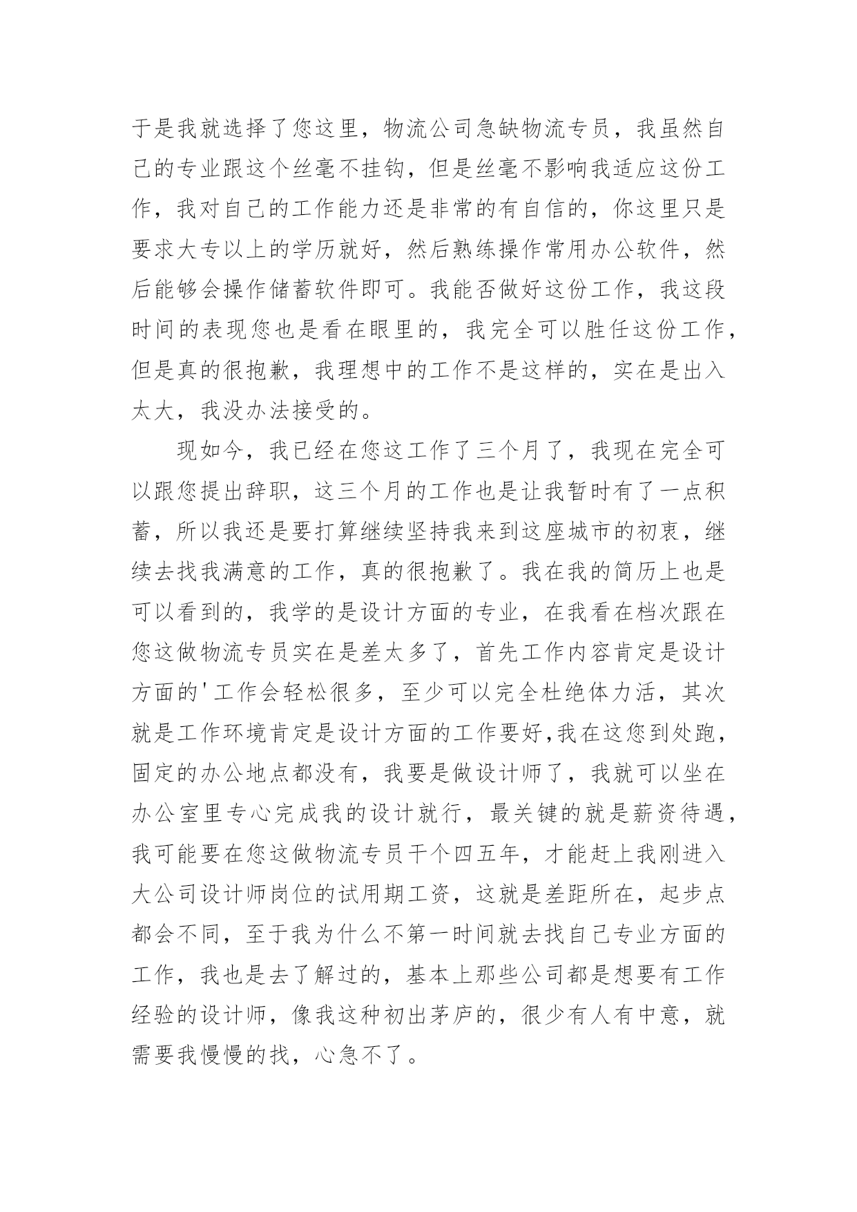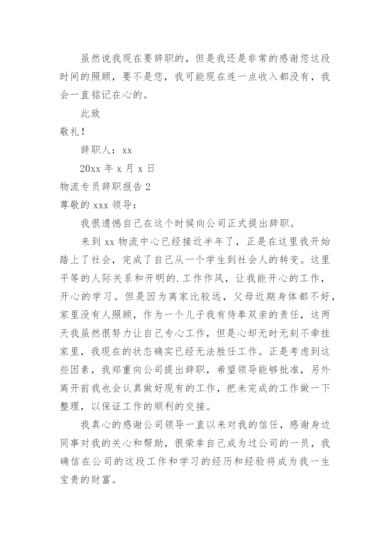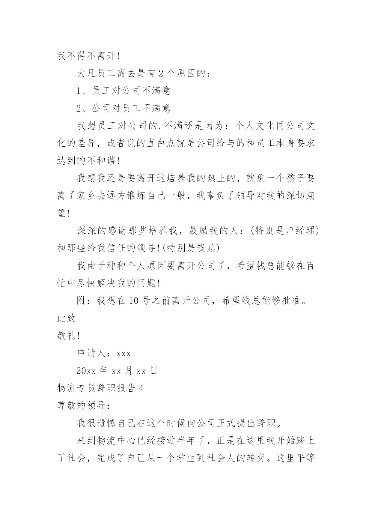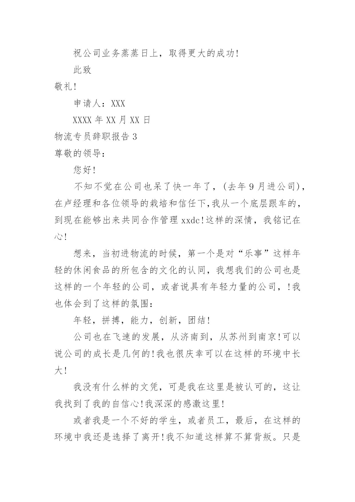 物流专员辞职报告物流专员辞职报告我们眼下的社会,报告的用途越来越大,报告中提到的所有信息应该是准确无误的。在写之前,可以先参考范文,下面是小编帮大家整理的物流专员辞职报告,仅供参考,大家一起来看看吧。物流专员辞职报告1尊敬的领导:您好!这份工作我不再需要了,我将干完这个月就走人,时间已经所剩无几了,不过我会在这最后的这段时间里,继续努力的工作,丝毫不会怠慢。物流专员的这个职位本来就是我临时的工作,我根本没想过要在您这一直干下去,所以对于我的辞职报告,您也不用感到意外,我就算在您这干的再好,我也不会有丝毫留下去的想法。请原谅我眼界比较高吧,我觉得物流专员这份工作是不适合我的,我之所以会带来我们这里工作,完全就是出于无奈,我初到这座城市,身无分文,我当时迫切的想拥有一份工作,但是我没有时间没有那个条件能让我慢慢的去找,我只能找一份自己完全符合要求的工作,并且成功率高的工作,于是我就选择了您这里,物流公司急缺物流专员,我虽然自己的专业跟这个丝毫不挂钩,但是丝毫不影响我适应这份工作,我对自己的工作能力还是非常的有自信的,你这里只是要求大专以上的学历就好,然后熟练操作常用办公软件,然后能够会操作储蓄软件即可。我能否做好这份工作,我这段时间的表现您也是看在眼里的,我完全可以胜任这份工作,但是真的很抱歉,我理想中的工作不是这样的,实在是出入太大,我没办法接受的。现如今,我已经在您这工作了三个月了,我现在完全可以跟您提出辞职,这三个月的工作也是让我暂时有了一点积蓄,所以我还是要打算继续坚持我来到这座城市的初衷,继续去找我满意的工作,真的很抱歉了。我在我的简历上也是可以看到的,我学的是设计方面的专业,在我看在档次跟在您这做物流专员实在是差太多了,首先工作内容肯定是设计方面的'工作会轻松很多,至少可以完全杜绝体力活,其次就是工作环境肯定是设计方面的工作要好,我在这您到处跑,固定的办公地点都没有,我要是做设计师了,我就可以坐在办公室里专心完成我的设计就行,最关键的就是薪资待遇,我可能要在您这做物流专员干个四五年,才能赶上我刚进入大公司设计师岗位的试用期工资,这就是差距所在,起步点都会不同,至于我为什么不第一时间就去找自己专业方面的工作,我也是去了解过的,基本上那些公司都是想要有工作经验的设计师,像我这种初出茅庐的,很少有人有中意,就需要我慢慢的找,心急不了。虽然说我现在要辞职的,但是我还是非常的感谢您这段时间的照顾,要不是您,我可能现在连一点收入都没有,我会一直铭记在心的。此致敬礼!辞职人:xx20xx年x月x日物流专员辞职报告2尊敬的xxx领导:我很遗憾自己在这个时候向公司正式提出辞职。来到xx物流中心已经接近半年了,正是在这里我开始踏上了社会,完成了自己从一个学生到社会人的转变。这里平等的人际关系和开明的.工作作风,让我能开心的工作,开心的学习。但是因为离家比较远,父母近期身体都不好,家里没有人照顾,作为一个儿子我有侍奉双亲的责任,这两天我虽然很努力让自己专心工作,但是心却无时无刻不牵挂家里,我现在的状态确实已经无法胜任工作。正是考虑到这些因素,我郑重向公司提出辞职,希望领导能够批准,另外离开前我也会认真做好现有的工作,把未完成的工作做一下整理,以保证工作的顺利的交接。我真心的感谢公司领导一直以来对我的信任,感谢身边同事对我的关心和帮助,很荣幸自己成为过公司的一员,我确信在公司的这段工作和学习的经历和经验将成为我一生宝贵的财富。祝公司业务蒸蒸日上,取得更大的成功!此致敬礼!申请人:XXXXXXX年XX月XX日物流专员辞职报告3尊敬的领导:您好!不知不觉在公司也呆了快一年了,(去年9月进公司),在卢经理和各位领导的栽培和信任下,我从一个底层跟车的,到现在能够出来共同合作管理xxdc!这样的深情,我铭记在心!想来,当初进物流的时候,第一个是对“乐事”这样年轻的休闲食品的所包含的文化的认同,我想我们的公司也是这样的一个年轻的公司,或者说具有年轻力量的公司,!我也体会到了这样的氛围:年轻,拼搏,能力,创新,团结!公司也在飞速的发展,从济南到,从苏州到南京!可以说公司的成长是几何的!我也很庆幸可以在这样的环境中长大!我没有什么样的文凭,可是我在这里是被认可的,这让我找到了我的自信心!我深深的感激这里!或者我是一个不好的学生,或者员工,最后,在这样的环境中我还是选择了离开!我不知道这样算不算背叛。只是我不得不离开!大凡员工离去是有2个原因的:1、员工对公司不满意2、公司对员工不满意我想员工对公司的.不满还是因为:个人文化同公司文化的差异,或者说的直白点就是公司给与的和员工本身要求达到的不和谐!我想我还是要离开这培养我的热土的,就象一个孩子要离了家乡去远方锻炼自己一般,我辜负了领导对我的深切期望!深深的感谢那些培养我,鼓励我的人:(特别是卢经理)和那些给