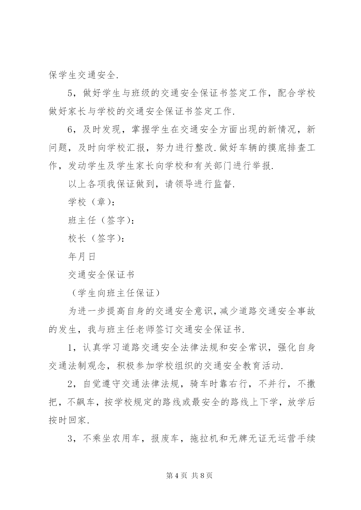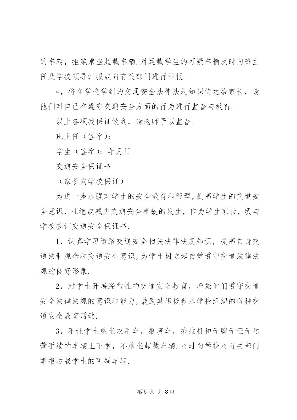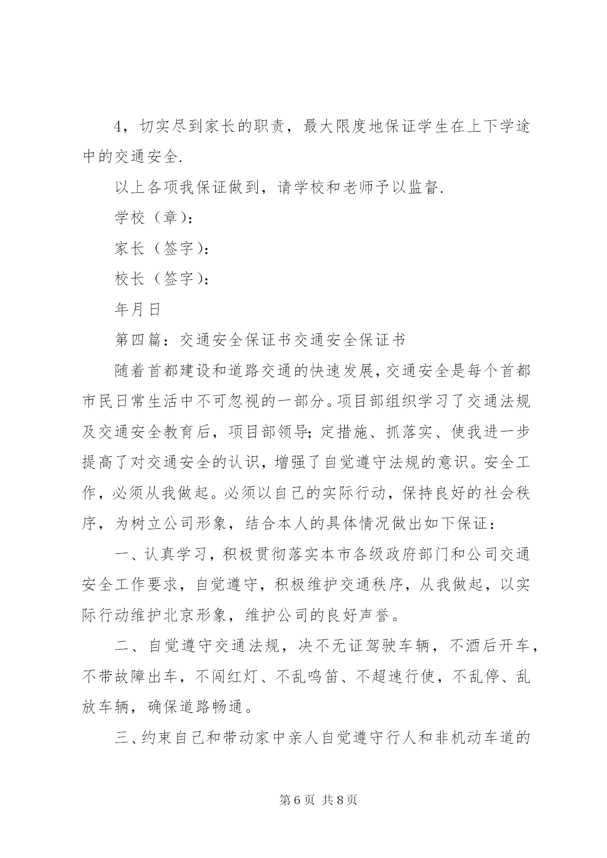 第PAGE\*Arabic\*MERGEFORMAT8页共NUMPAGES\*MERGEFORMAT8页交通安全保证书一、严格遵守本单位公务车辆管理制度,严格落实交通安全防范责任,严格车辆使用、派遣制度,认真做好车辆安全检查和维修工作,保证车况良好,行驶安全。二、节前与所属单位(或部门)逐级签订交通安全保证书,积极响应市政府号召,落实交通文明行动方案,营造文明出行、安全畅通的交通环境。三、认真学习贯彻《交通安全法》,“国庆节”期间严格遵守交通管理措施,保证杜绝发生酒后驾车、闯红灯、交通肇事逃逸、无证驾驶、涉牌、超速超载、违法停车、违法占用应急车道和公交车道、机动车不按规定检验违法上路、黑车违法上路载客等严重交通违法行为。保证人:xx年月日第二篇:交通安全保证书交通安全保证书上帝是公平的也是吝啬的,他只赐予每个人一次生命,所以我们必须珍惜。生活中交通安全与我们的关系是非常密切的,它就像我们的朋友。日日夜夜都守在我们的身边,教育我们,劝戒我们。生命是宝贵的,人的一生就只有一次生命,我们应该爱惜生命。注意交通安全也是爱惜生命的一部分。现在因为交通事故而死于非命的人太多了,难道他们不是死的太冤枉了吗。现在城市交通繁忙了,像这种悲惨的交通事故在国内多如繁星因为我国交通事故死伤率居世界第一。所以,无论交警在不在场,我们都要自觉的遵守交通法规。例如:过马路要看清信号灯,红灯停、绿灯行,要走人行横道,不得翻越交通护栏;未满12岁的儿童不得在马路上骑自行车;不能在马路上三五成群地玩耍和嬉戏……我们小学生不仅自己要遵守交通法规,而且发现有人违反了,应及时地批评、劝阻。让我们把“交通安全”这四个字在心里永远扎下根,让全世界人民都自觉遵守交通规则,让交通事故永远在我们生活中消失,让我们的明天充满鲜花,充满阳光。那么,交通安全便是你最好最好的朋友,它将永远保护着你,带给你幸福。让我们争做文明守法的好少年吧。我们是社会未来的接班人,我们能否健康成长,关系到民族的兴衰和社会的进步。为了我们的明天,为了国家的明天,我与班主任老师签订交通安全保证书:1、认真学习道路交通安全法律法规和安全常识,强化自身交通法制观念,积极参加学校组织的交通安全教育活动。2、自觉遵守交通法律法规,骑车时靠右行,不并行,不撒把,不飙车,按学校规定的路线或最安全的路线上下学,放学后按时回家。3、不乘坐农用车、报废车、拖拉机和无牌无证无运营手续的车辆,拒绝乘坐超载车辆。对运载学生的可疑车辆及时向班主任及学校领导汇报或向有关部门进行举报。4、将在学校学到的交通安全法律法规知识传达给家长,请他们对自己在遵守交通安全方面的行为进行监督与教育。以上各项我保证做到,请老师予以监督。第三篇:交通安全保证书为进一步加强对学生的安全教育和管理,提高学生的交通安全意识,杜绝或减少交通安全事故的发生,我与学校签订交通安全保证书.1,认真学习道路交通安全相关的法律法规知识,提高自身交通法制观念和交通安全意识,为学生树立起自觉遵守交通法律法规的良好形象.2,对学生开展经常性的交通安全教育,每周利用晨夕会,班会等时间,进行1-2次交通安全方面专项教育或专项检查总结,并要采用教学挂图,黑板报,宣传栏等形式坚持经常地对学生进行交通安全法规和交通安全常识教育,教育学生文明行路,主动防范交通安全事故,自觉拒绝乘坐农用车,报废车,拖拉机及无牌无证无运营手续和超载车辆.3,利用家长会等有利时机,搞好对学生家长的交通安全宣传教育,同时请家长配合做好学生的交通安全教育.4,严格执行路队值班制度,在学生上学和放学时坚持值勤,疏导交通,监督引导学生按交通规则行走,并做好值班记录,确保学生交通安全.5,做好学生与班级的交通安全保证书签定工作,配合学校做好家长与学校的交通安全保证书签定工作.6,及时发现,掌握学生在交通安全方面出现的新情况,新问题,及时向学校汇报,努力进行整改.做好车辆的摸底排查工作,发动学生及学生家长向学校和有关部门进行举报.以上各项我保证做到,请领导进行监督.学校(章):班主任(签字):校长(签字):年月日交通安全保证书(学生向班主任保证)为进一步提高自身的交通安全意识,减少道路交通安全事故的发生,我与班主任老师签订交通安全保证书.1,认真学习道路交通安全法律法规和安全常识,强化自身交通法制观念,积极参加学校组织的交通安全教育活动.2,自觉遵守交通法律法规,骑车时靠右行,不并行,不撒把,不飙车,按学校规定的路线或最安全的路线上下学,放学后按时回家.3,不乘坐农用车,报废车,拖拉机和无牌无证无运营手续的车辆,拒绝乘坐超载车辆.对运载学生的可疑车辆及时向班主任及学校领导汇报或向有关部门进行举报.4,将在学校学到的交通安全法律法规知识传达给家长,请他们对自己在遵守交通安全方面的行为进行监督与教育.