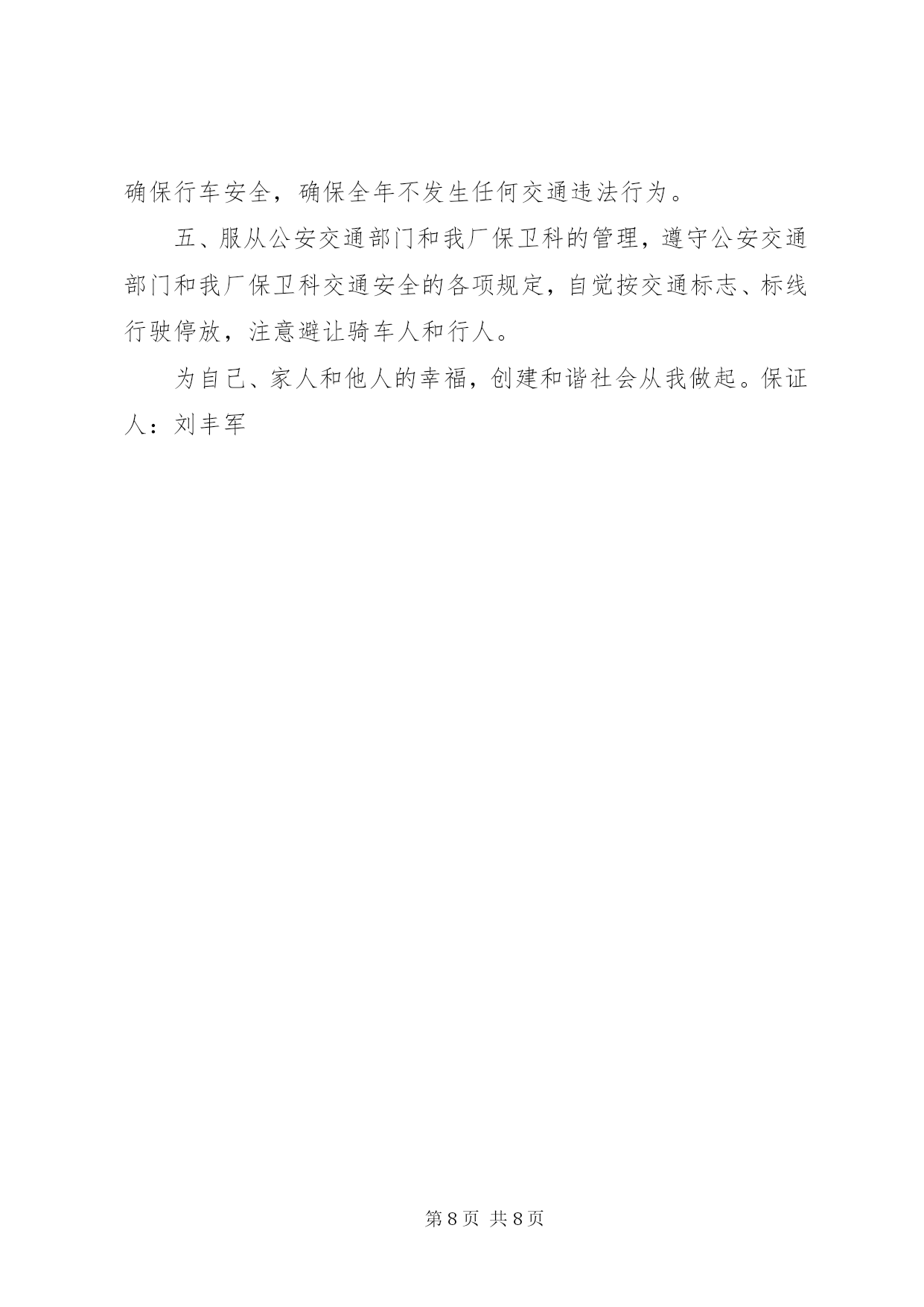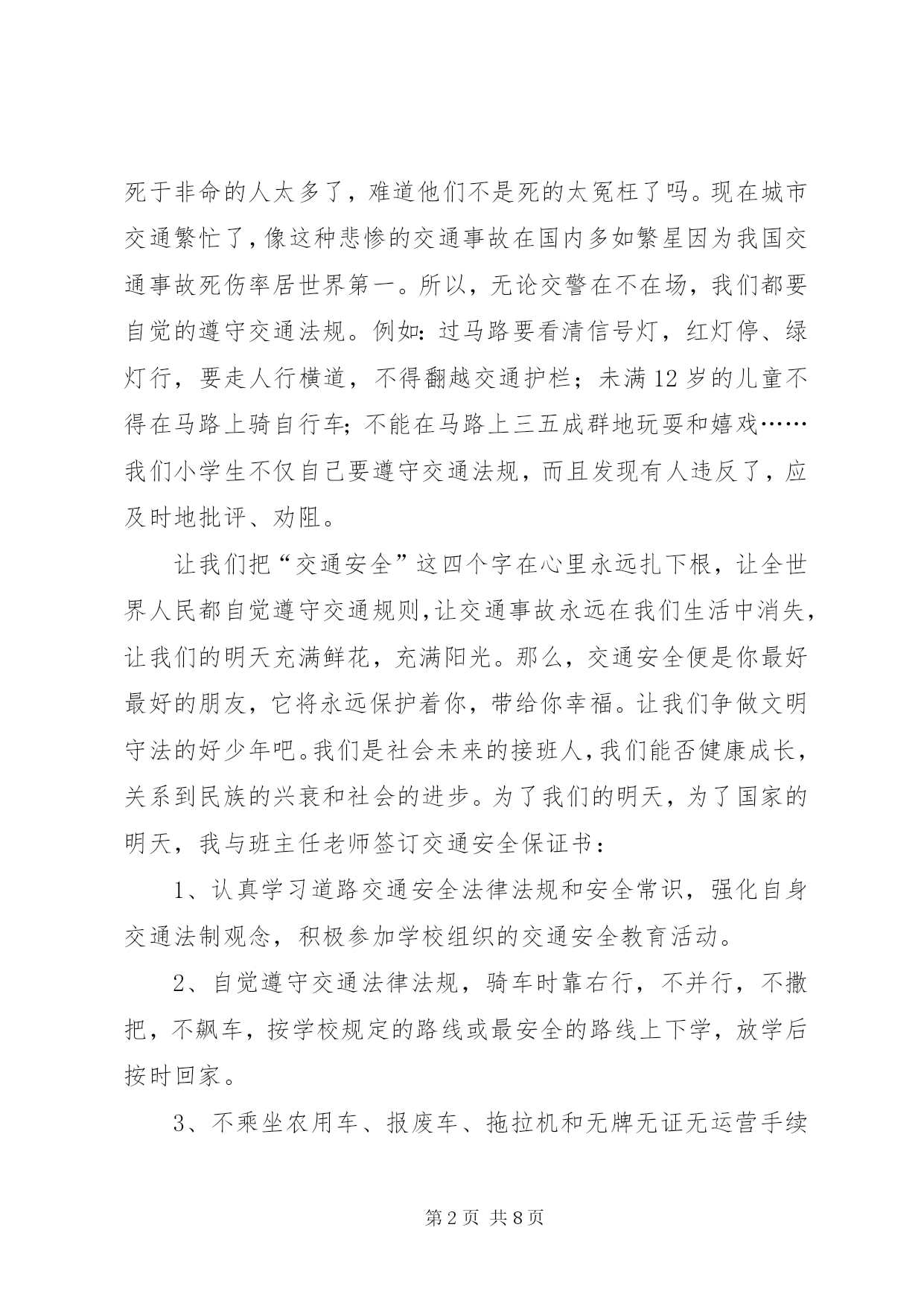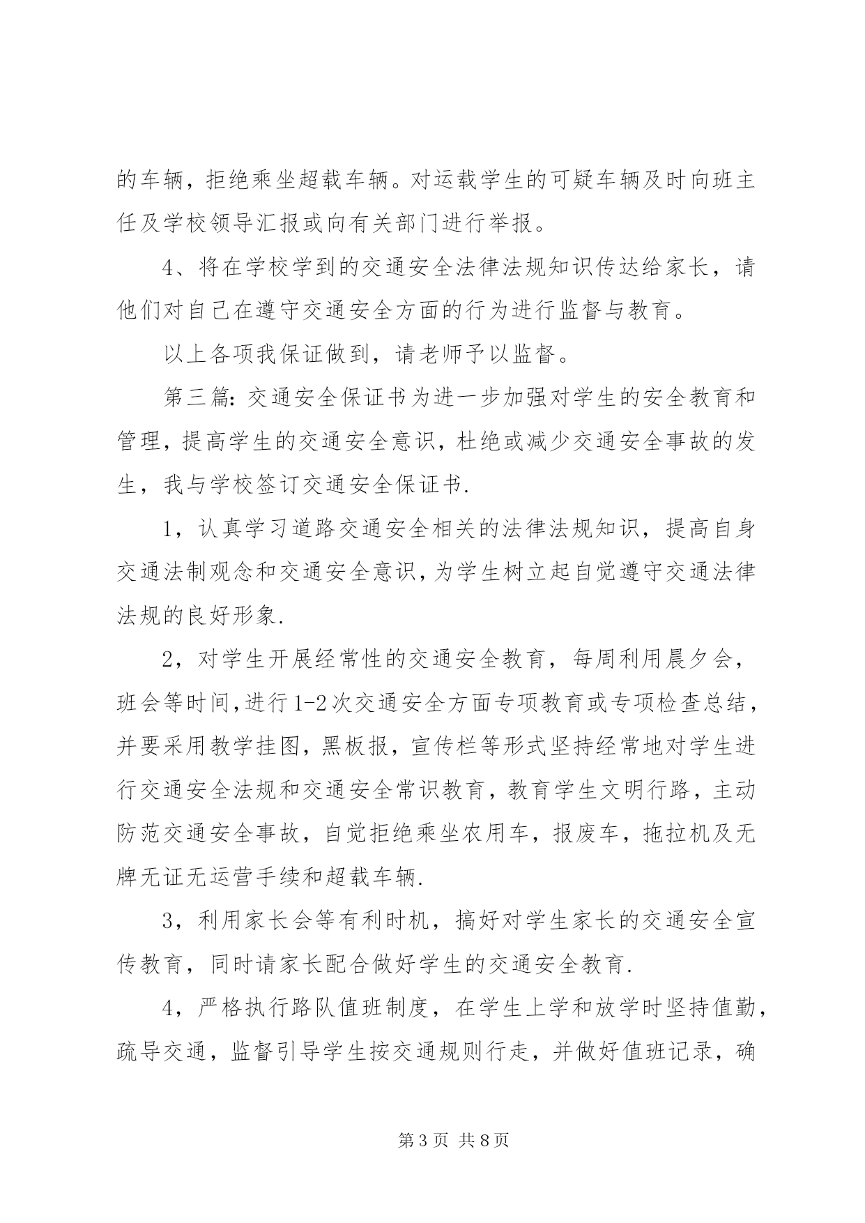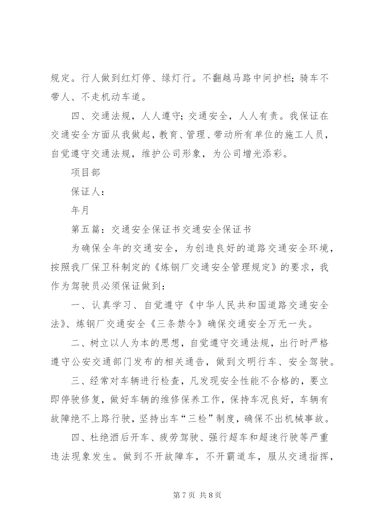 第PAGE\*Arabic\*MERGEFORMAT8页共NUMPAGES\*MERGEFORMAT8页交通安全保证书一、严格遵守本单位公务车辆管理制度,严格落实交通安全防范责任,严格车辆使用、派遣制度,认真做好车辆安全检查和维修工作,保证车况良好,行驶安全。二、节前与所属单位(或部门)逐级签订交通安全保证书,积极响应市政府号召,落实交通文明行动方案,营造文明出行、安全畅通的交通环境。三、认真学习贯彻《交通安全法》,“国庆节”期间严格遵守交通管理措施,保证杜绝发生酒后驾车、闯红灯、交通肇事逃逸、无证驾驶、涉牌、超速超载、违法停车、违法占用应急车道和公交车道、机动车不按规定检验违法上路、黑车违法上路载客等严重交通违法行为。保证人:xx年月日第二篇:交通安全保证书交通安全保证书上帝是公平的也是吝啬的,他只赐予每个人一次生命,所以我们必须珍惜。生活中交通安全与我们的关系是非常密切的,它就像我们的朋友。日日夜夜都守在我们的身边,教育我们,劝戒我们。生命是宝贵的,人的一生就只有一次生命,我们应该爱惜生命。注意交通安全也是爱惜生命的一部分。现在因为交通事故而死于非命的人太多了,难道他们不是死的太冤枉了吗。现在城市交通繁忙了,像这种悲惨的交通事故在国内多如繁星因为我国交通事故死伤率居世界第一。所以,无论交警在不在场,我们都要自觉的遵守交通法规。例如:过马路要看清信号灯,红灯停、绿灯行,要走人行横道,不得翻越交通护栏;未满12岁的儿童不得在马路上骑自行车;不能在马路上三五成群地玩耍和嬉戏……我们小学生不仅自己要遵守交通法规,而且发现有人违反了,应及时地批评、劝阻。让我们把“交通安全”这四个字在心里永远扎下根,让全世界人民都自觉遵守交通规则,让交通事故永远在我们生活中消失,让我们的明天充满鲜花,充满阳光。那么,交通安全便是你最好最好的朋友,它将永远保护着你,带给你幸福。让我们争做文明守法的好少年吧。我们是社会未来的接班人,我们能否健康成长,关系到民族的兴衰和社会的进步。为了我们的明天,为了国家的明天,我与班主任老师签订交通安全保证书:1、认真学习道路交通安全法律法规和安全常识,强化自身交通法制观念,积极参加学校组织的交通安全教育活动。2、自觉遵守交通法律法规,骑车时靠右行,不并行,不撒把,不飙车,按学校规定的路线或最安全的路线上下学,放学后按时回家。3、不乘坐农用车、报废车、拖拉机和无牌无证无运营手续的车辆,拒绝乘坐超载车辆。对运载学生的可疑车辆及时向班主任及学校领导汇报或向有关部门进行举报。4、将在学校学到的交通安全法律法规知识传达给家长,请他们对自己在遵守交通安全方面的行为进行监督与教育。以上各项我保证做到,请老师予以监督。第三篇:交通安全保证书为进一步加强对学生的安全教育和管理,提高学生的交通安全意识,杜绝或减少交通安全事故的发生,我与学校签订交通安全保证书.1,认真学习道路交通安全相关的法律法规知识,提高自身交通法制观念和交通安全意识,为学生树立起自觉遵守交通法律法规的良好形象.2,对学生开展经常性的交通安全教育,每周利用晨夕会,班会等时间,进行1-2次交通安全方面专项教育或专项检查总结,并要采用教学挂图,黑板报,宣传栏等形式坚持经常地对学生进行交通安全法规和交通安全常识教育,教育学生文明行路,主动防范交通安全事故,自觉拒绝乘坐农用车,报废车,拖拉机及无牌无证无运营手续和超载车辆.3,利用家长会等有利时机,搞好对学生家长的交通安全宣传教育,同时请家长配合做好学生的交通安全教育.4,严格执行路队值班制度,在学生上学和放学时坚持值勤,疏导交通,监督引导学生按交通规则行走,并做好值班记录,确保学生交通安全.5,做好学生与班级的交通安全保证书签定工作,配合学校做好家长与学校的交通安全保证书签定工作.6,及时发现,掌握学生在交通安全方面出现的新情况,新问题,及时向学校汇报,努力进行整改.做好车辆的摸底排查工作,发动学生及学生家长向学校和有关部门进行举报.以上各项我保证做到,请领导进行监督.学校(章):班主任(签字):校长(签字):年月日交通安全保证书(学生向班主任保证)为进一步提高自身的交通安全意识,减少道路交通安全事故的发生,我与班主任老师签订交通安全保证书.1,认真学习道路交通安全法律法规和安全常识,强化自身交通法制观念,积极参加学校组织的交通安全教育活动.2,自觉遵守交通法律法规,骑车时靠右行,不并行,不撒把,不飙车,按学校规定的路线或最安全的路线上下学,放学后按时回家.3,不乘坐农用车,报废车,拖拉机和无牌无证无运营手续的车辆,拒绝乘坐超载车辆.对运载学生的可疑车辆及时向班主任及学校领导汇报或向有关部门进行举报.4,将在学校学到的交通安全法律法规知识传达给家长,请他们对自己在遵守交通安全方面的行为进行监督与教育.