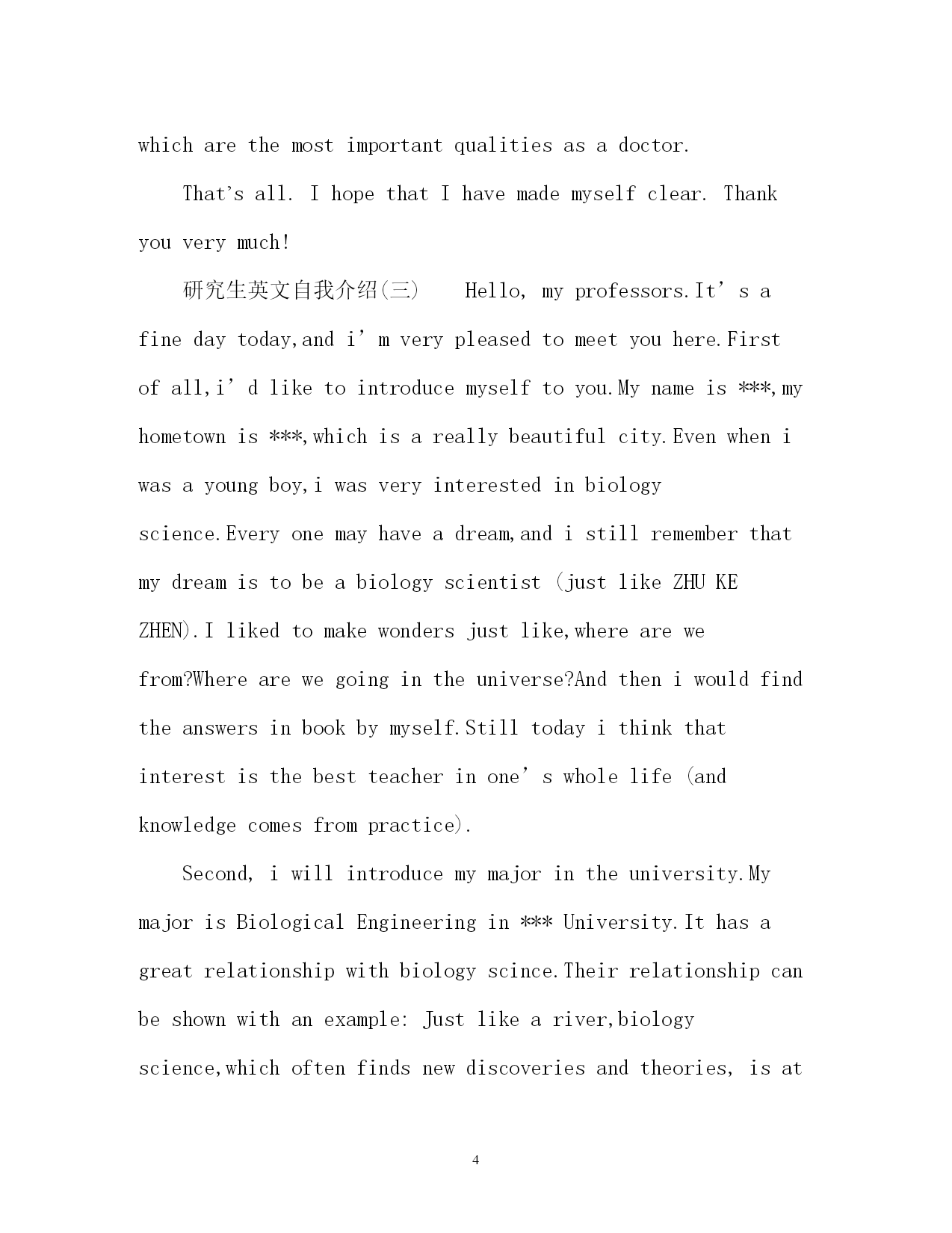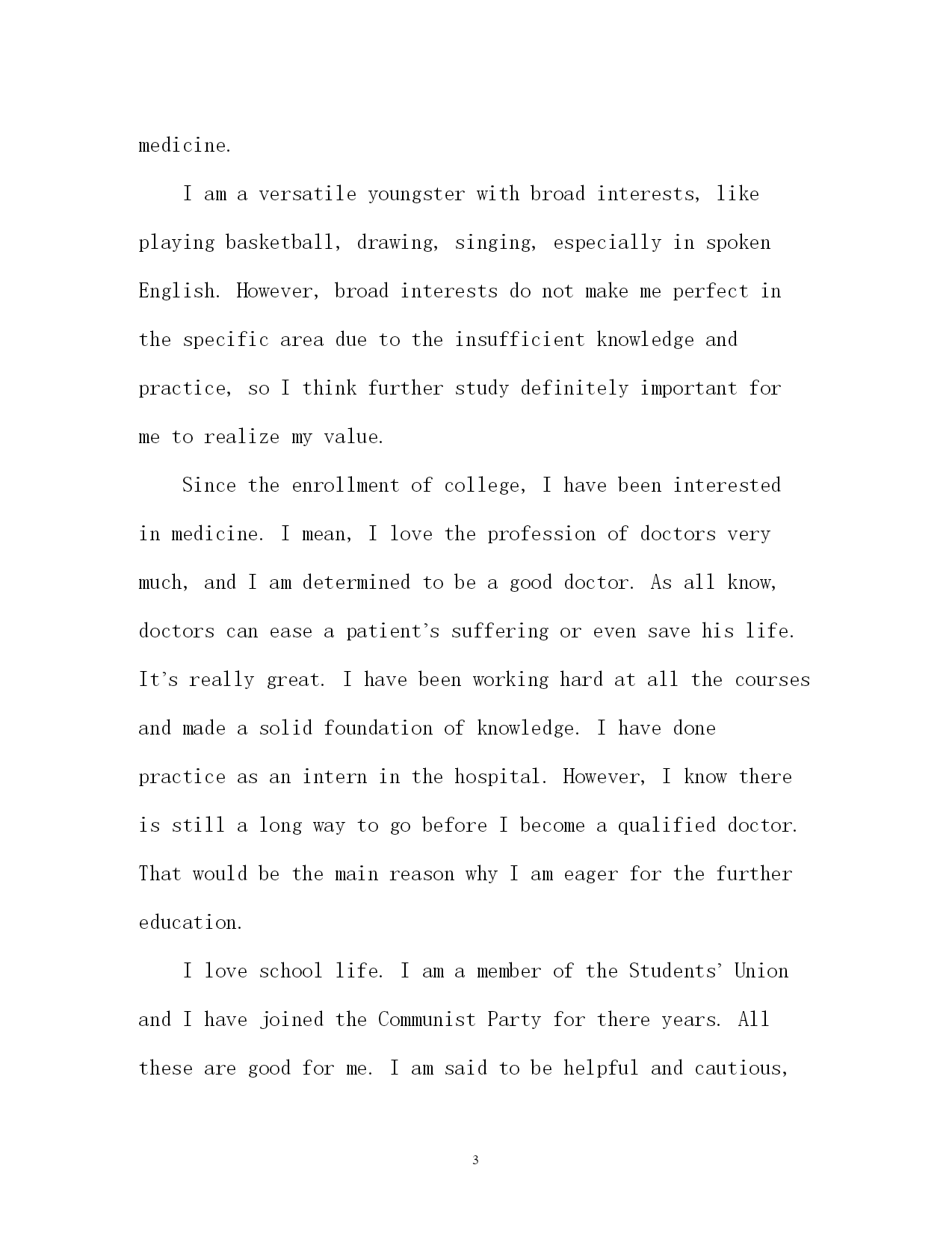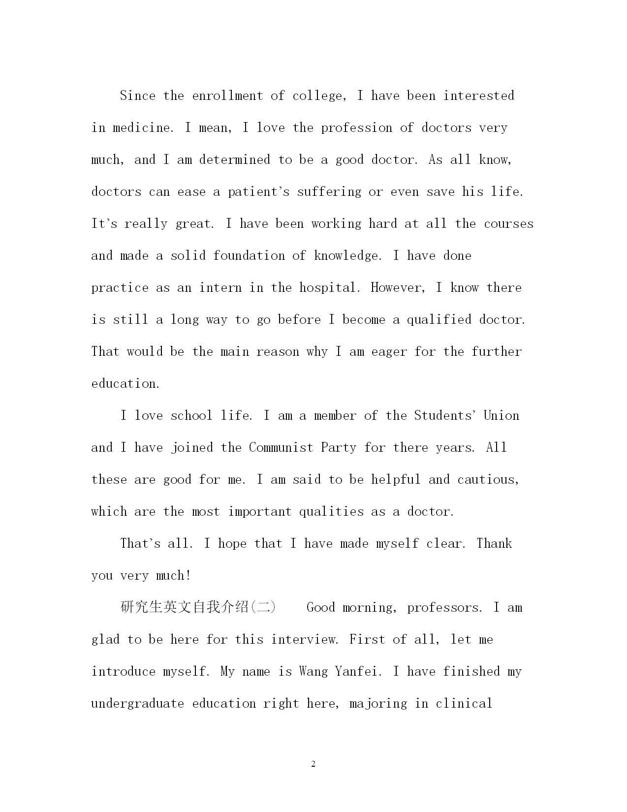 此资料由网络收集而来,如有侵权请告知上传者立即删除。资料共分享,我们负责传递知识。PAGEPAGE6研究生英文自我介绍研究生英文自我介绍模板研究生的英文自我介绍怎么写?下面小编为大家收集了几篇范文,希望对大家有帮助!研究生英文自我介绍(一)Goodmorning,professors.Iamgladtobehereforthisinterview.Firstofall,letmeintroducemyself.MynameisWangYanfei.Ihavefinishedmyundergraduateeducationrighthere,majoringinclinicalmedicine.Iamaversatileyoungsterwithbroadinterests,likeplayingbasketball,drawing,singing,especiallyinspokenEnglish.However,broadinterestsdonotmakemeperfectinthespecificareaduetotheinsufficientknowledgeandpractice,soIthinkfurtherstudydefinitelyimportantformetorealizemyvalue.Sincetheenrollmentofcollege,Ihavebeeninterestedinmedicine.Imean,Ilovetheprofessionofdoctorsverymuch,andIamdeterminedtobeagooddoctor.Asallknow,doctorscaneaseapatient’ssufferingorevensavehislife.It’sreallygreat.Ihavebeenworkinghardatallthecoursesandmadeasolidfoundationofknowledge.Ihavedonepracticeasaninterninthehospital.However,IknowthereisstillalongwaytogobeforeIbecomeaqualifieddoctor.ThatwouldbethemainreasonwhyIameagerforthefurthereducation.Iloveschoollife.IamamemberoftheStudents’UnionandIhavejoinedtheCommunistPartyforthereyears.Allthesearegoodforme.Iamsaidtobehelpfulandcautious,whicharethemostimportantqualitiesasadoctor.That’sall.IhopethatIhavemademyselfclear.Thankyouverymuch!研究生英文自我介绍(二)Goodmorning,professors.Iamgladtobehereforthisinterview.Firstofall,letmeintroducemyself.MynameisWangYanfei.Ihavefinishedmyundergraduateeducationrighthere,majoringinclinicalmedicine.Iamaversatileyoungsterwithbroadinterests,likeplayingbasketball,drawing,singing,especiallyinspokenEnglish.However,broadinterestsdonotmakemeperfectinthespecificareaduetotheinsufficientknowledgeandpractice,soIthinkfurtherstudydefinitelyimportantformetorealizemyvalue.Sincetheenrollmentofcollege,Ihavebeeninterestedinmedicine.Imean,Ilovetheprofessionofdoctorsverymuch,andIamdeterminedtobeagooddoctor.Asallknow,doctorscaneaseapatient’ssufferingorevensavehislife.It’sreallygreat.Ihavebeenworkinghardatallthecoursesandmadeasolidfoundationofk