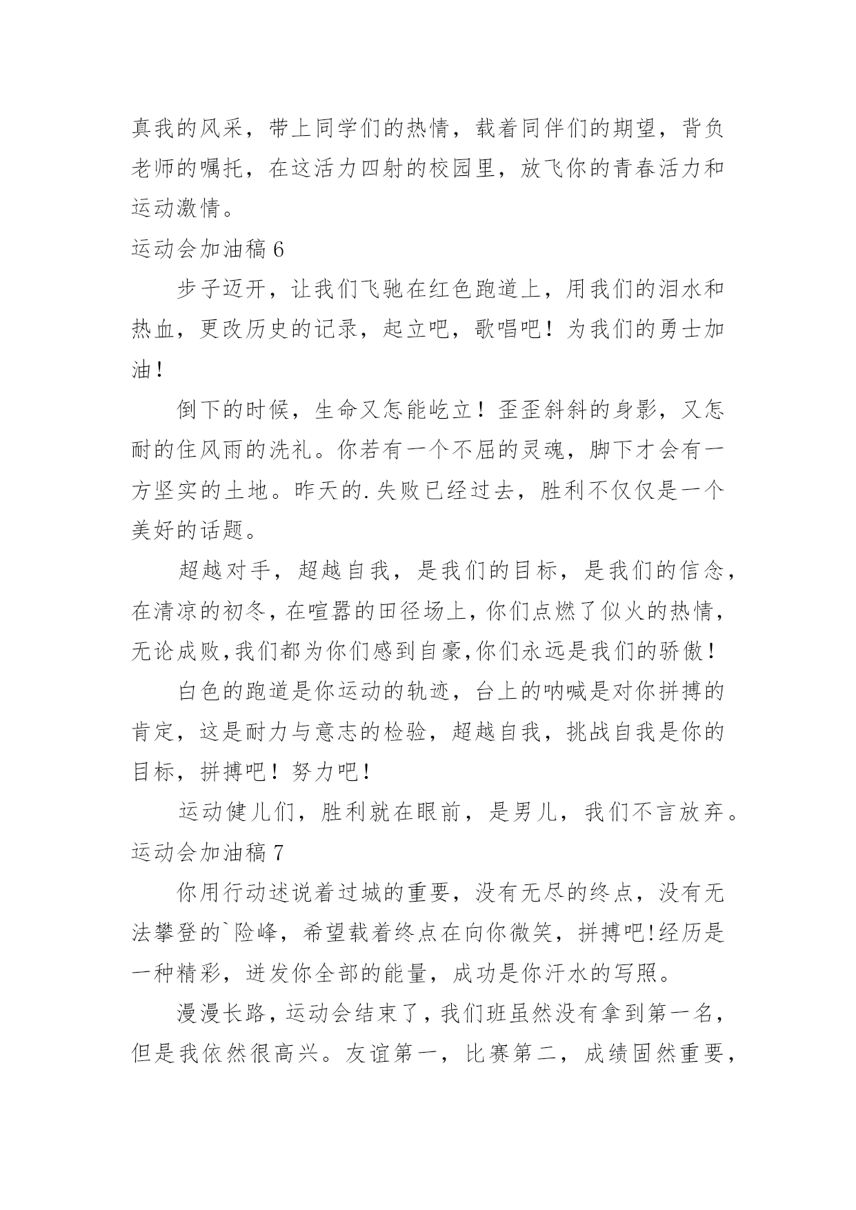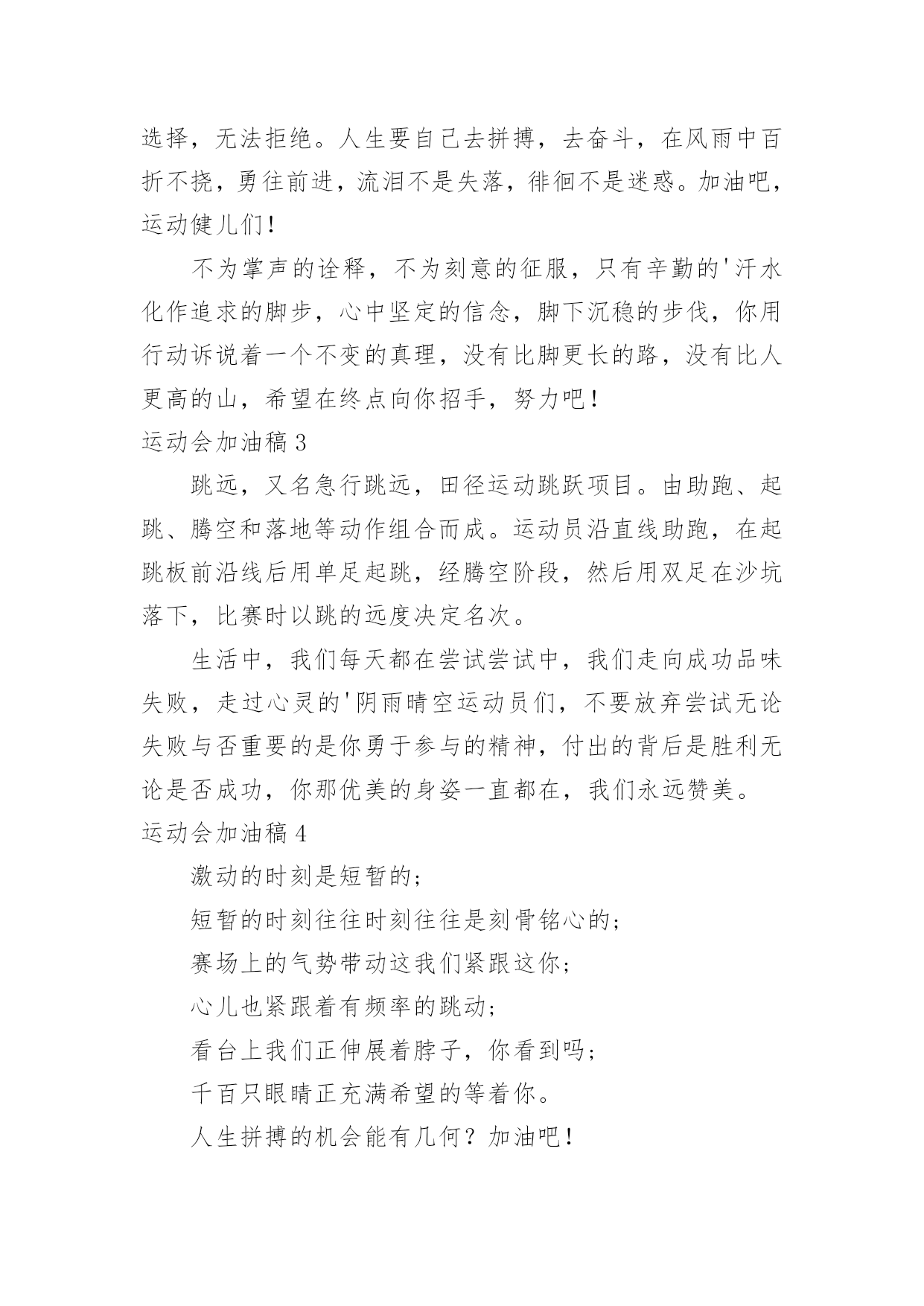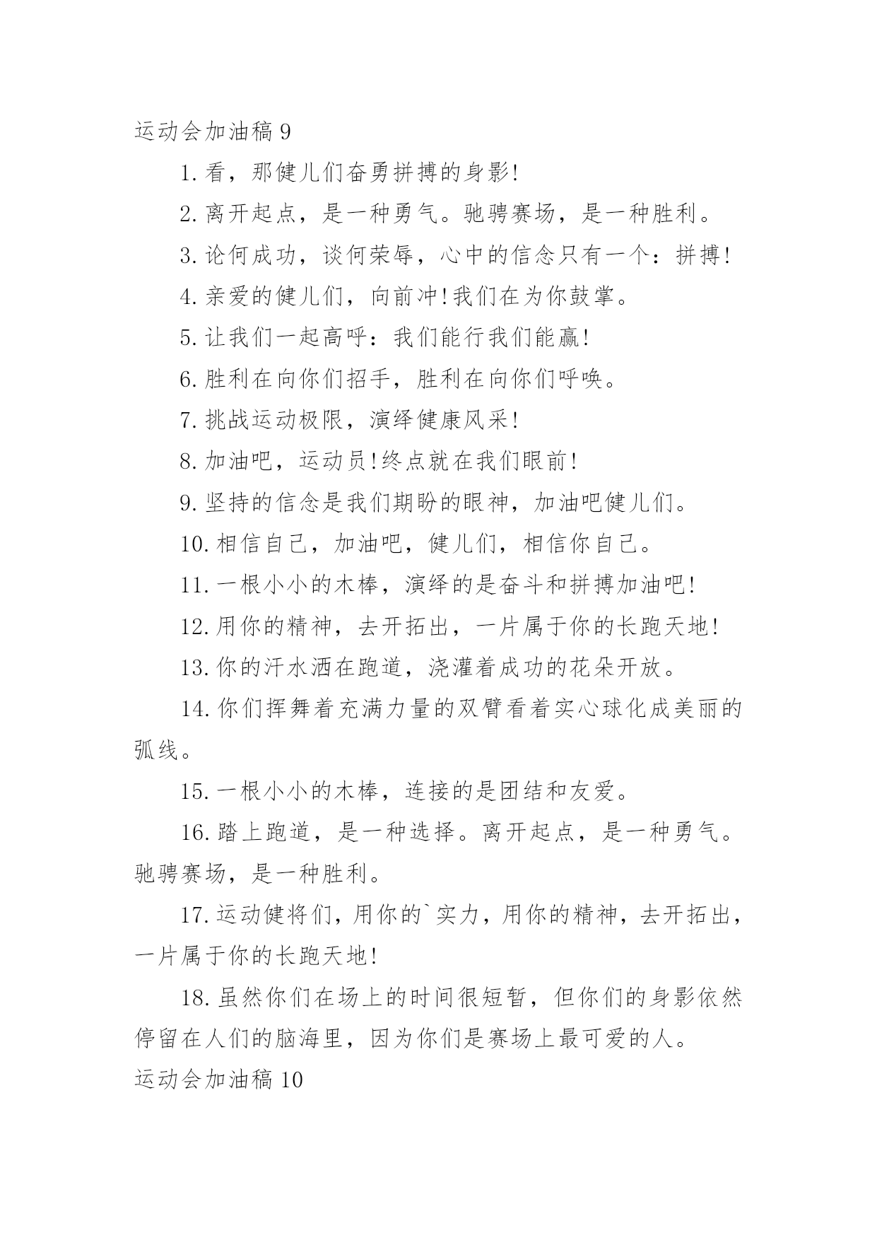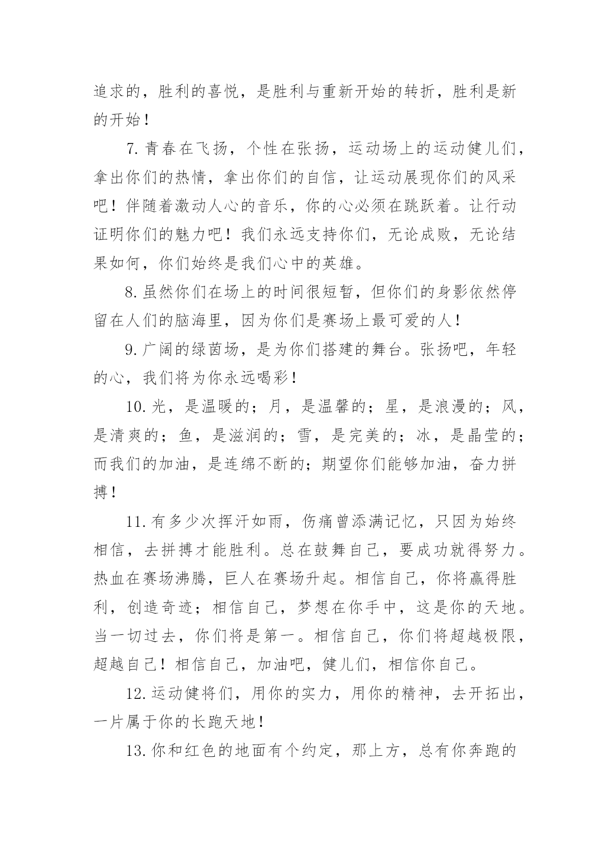 运动会加油稿运动会加油稿范例【15篇】在不断进步的时代,我们都不可避免地要接触到加油稿,加油稿可以给予对方克服困难的勇气和信心。相信写加油稿是一个让许多人都头痛的问题,以下是小编为大家整理的运动会加油稿,希望能够帮助到大家。运动会加油稿1给予的越多,收获的越多,奋斗的越多,收获的越多。坚定的信念,收获闪光的金牌。成功属于谁,人生的路,有坦途,也有坎坷。走过的岁月,有欢笑,也有苦涩,泪水告诉我一个跌倒的.故事,汗水使我多了一分沉重,几多成熟。理想毕竟不同于现实,失败是生活的一部分,谁也无法选择,无法拒绝。人生要自己去拼搏,去奋斗,在风雨中百折不挠,勇往直前,在每个驿站上都留下一段不悔的回忆。流泪不是失落,徘徊不是迷惑,成功属于那些战胜失败,坚持不懈、勇于追求梦想的人。运动会加油稿2理想毕竟不同于现实,失败是生活的一部分,谁也无法选择,无法拒绝。人生要自己去拼搏,去奋斗,在风雨中百折不挠,勇往前进,流泪不是失落,徘徊不是迷惑。加油吧,运动健儿们!不为掌声的诠释,不为刻意的征服,只有辛勤的'汗水化作追求的脚步,心中坚定的信念,脚下沉稳的步伐,你用行动诉说着一个不变的真理,没有比脚更长的路,没有比人更高的山,希望在终点向你招手,努力吧!运动会加油稿3跳远,又名急行跳远,田径运动跳跃项目。由助跑、起跳、腾空和落地等动作组合而成。运动员沿直线助跑,在起跳板前沿线后用单足起跳,经腾空阶段,然后用双足在沙坑落下,比赛时以跳的远度决定名次。生活中,我们每天都在尝试尝试中,我们走向成功品味失败,走过心灵的'阴雨晴空运动员们,不要放弃尝试无论失败与否重要的是你勇于参与的精神,付出的背后是胜利无论是否成功,你那优美的身姿一直都在,我们永远赞美。运动会加油稿4激动的时刻是短暂的;短暂的时刻往往时刻往往是刻骨铭心的;赛场上的气势带动这我们紧跟这你;心儿也紧跟着有频率的跳动;看台上我们正伸展着脖子,你看到吗;千百只眼睛正充满希望的等着你。人生拼搏的机会能有几何?加油吧!失意的你没有信心;彷徨的`你没有目标;你好担心;我们好心疼;但踏上运动场的那一刻,你变了;你找到了自己的使命与重任;你拥有了自信和自强;你说:既然来了,就努力奋斗,载誉而归,我有实力;好样的,你是对的;我们永远支持你,心儿为你跳动;青春为你骄傲。十米的助跑,踏板,起跳,凌空而起,在空中画出一道优美的弧线,着地。一整套的动作一气呵成,没有半点的拖泥带水,实在是标致极了,刹是好看。观众的欢呼声响起来了,鼓掌声响起来了,汇成一片,响彻云霄。然而,为了这成功的凌空一跃,参赛选手不知付出了心血,不知付出了多少汗水,甚至是眼泪。阳光总在风雨后,擦干了汗水和泪水,就是灿烂如花的笑脸。他们的辛勤训练终于在赛场上成为了凌空一跃,淋漓尽致地演绎了他们的风采。是的,“天道酬勤”,自古以来就是这样:没有付出就没有回报,一分耕耘,一分收获。奋力一抛的瞬间,一道闪亮的弧线划破美丽的长空,将力与美演绎的淋漓尽致,宛如希腊神话中的天神。精彩的男子甲组铁饼决赛吸引了众多同学的观看。阳光下他们自信的脸庞,让人们相信青春永不言败!手持铁饼,你已做好准备,举手投足间,都是自信;挥一挥手,你已蓄势待发,力量集中,毋庸置疑;奋力一掷,你已演绎完毕,弧线优美,落地稳当。我已经预见你的沉着与冷静,你的坦然与阔达,你的矫健与实力虽有几分沉重,几分辛苦正现人之本色,豪情万丈一声嚎去,只见铁饼已飞出呀,太棒了,我为你欢呼!我为你骄傲!运动会加油稿5努力、努力、再努力!加油、加油、再加油!你一定可以像苍龙一样,光耀九州,也可以像孤鹰一样翱翔世界,相信自己。超越自我,胜利永远属于努力的拼搏的你!他们朝气蓬勃,勇往直前;他们同甘共苦,团结一心,不一样的脚步,同一样的声音,是他们团结的心声在召唤。我们的运动健儿,摩拳擦掌,跃跃欲试,要在运动场上一显身手,互论短长。运动场上,显露竞争精神,展现我辈英雄本色;运动场下,友谊第一,比赛第二;增进感情,健身才可以健康。运动健儿最漂亮!青春是不老的誓言,飞扬是年轻的'梦想,金色的十月,让我们在这长长的跑道上青春飞扬,现出飒爽的风姿,亮出真我的风采,带上同学们的热情,载着同伴们的期望,背负老师的嘱托,在这活力四射的校园里,放飞你的青春活力和运动激情。运动会加油稿6步子迈开,让我们飞驰在红色跑道上,用我们的泪水和热血,更改历史的记录,起立吧,歌唱吧!为我们的勇士加油!倒下的时候,生命又怎能屹立!歪歪斜斜的身影,又怎耐的住风雨的洗礼。你若有一个不屈的灵魂,脚下才会有一方坚实的土地。昨天的.失败已经过去,胜利不仅仅是一个美好的话题。超越对手,超越自我,是我们的目标,是我们的信念,在清凉的初冬,在喧嚣的田径场上,你们点燃了似火的热情,无论成败,我们都为你们感到自豪,你们永远是我们的骄傲!白色的跑道是你运动的轨迹,台上的