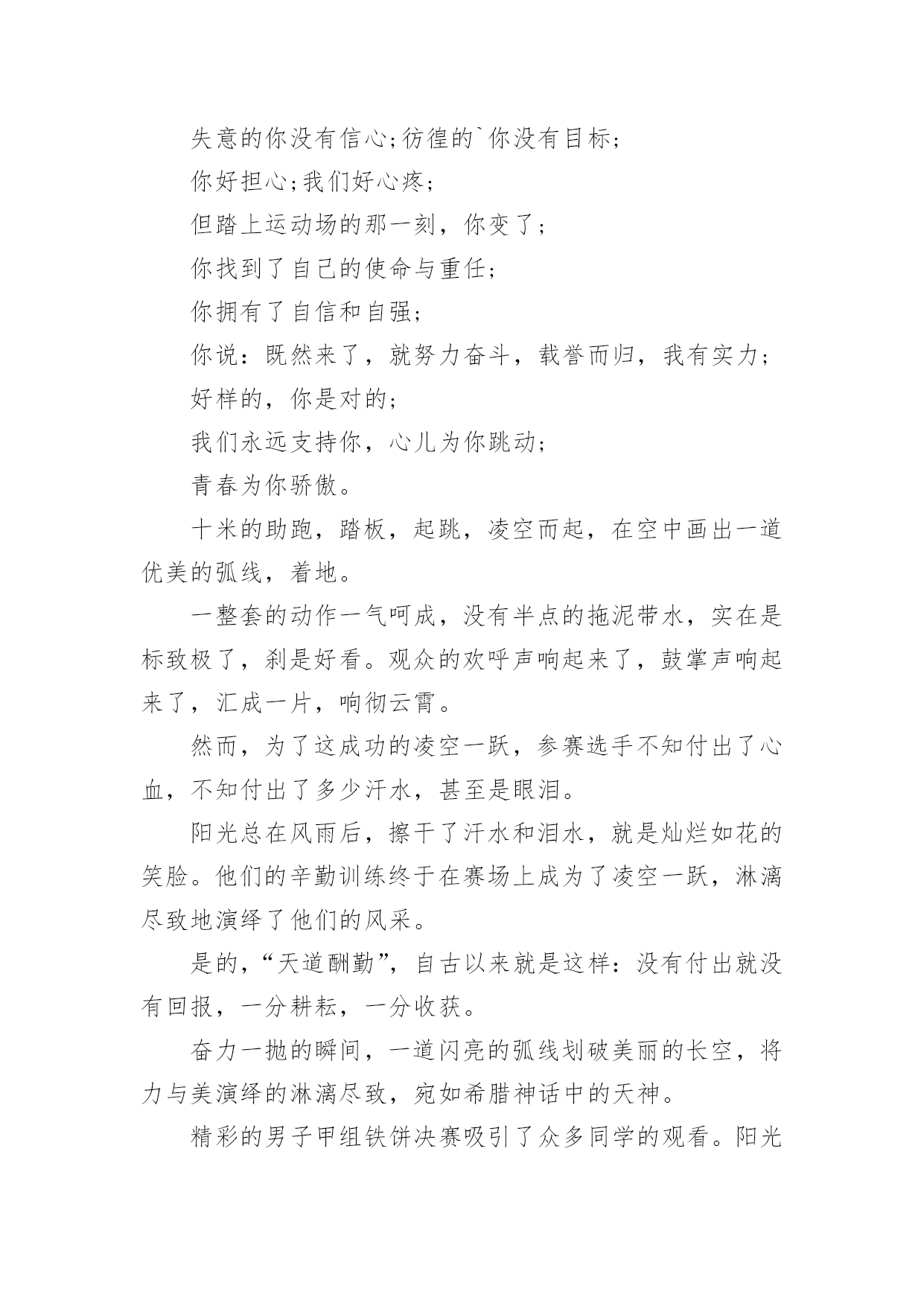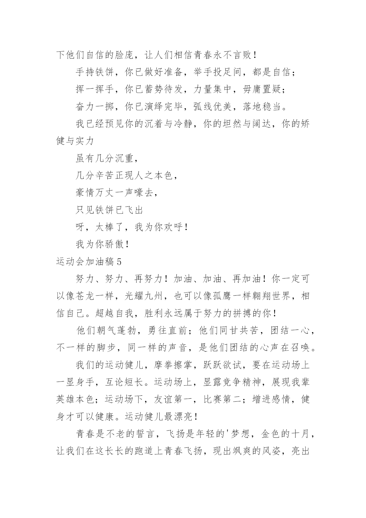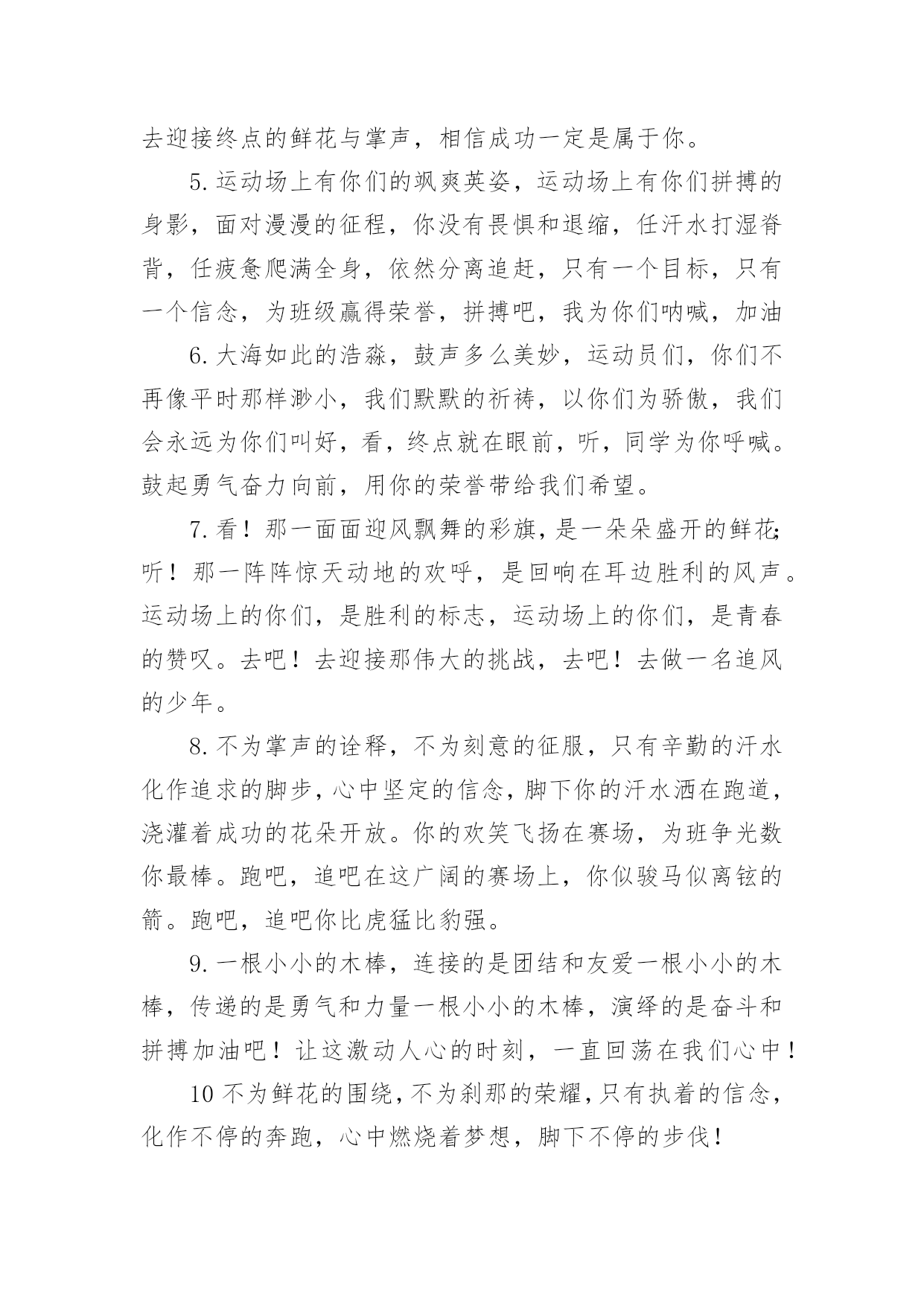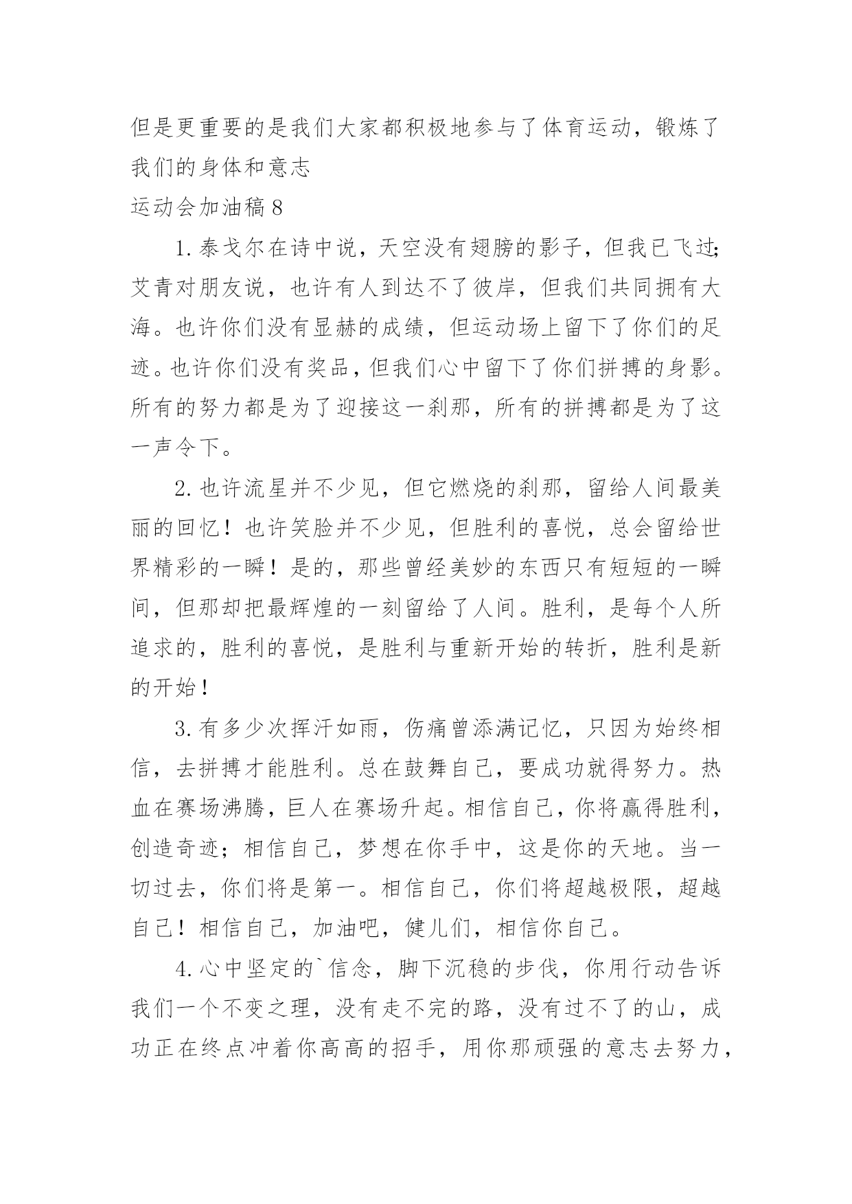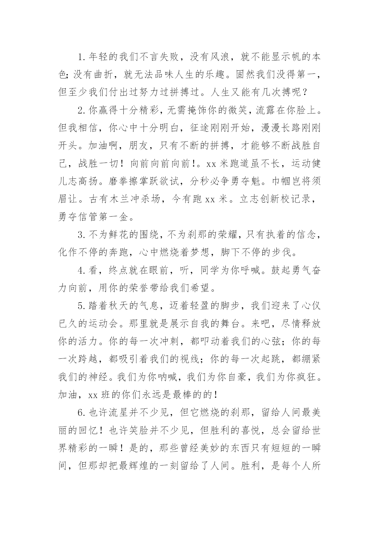 运动会加油稿运动会加油稿范例【15篇】在不断进步的时代,我们都不可避免地要接触到加油稿,加油稿可以给予对方克服困难的勇气和信心。相信写加油稿是一个让许多人都头痛的问题,以下是小编为大家整理的运动会加油稿,希望能够帮助到大家。运动会加油稿1给予的越多,收获的越多,奋斗的越多,收获的越多。坚定的信念,收获闪光的金牌。成功属于谁,人生的路,有坦途,也有坎坷。走过的岁月,有欢笑,也有苦涩,泪水告诉我一个跌倒的.故事,汗水使我多了一分沉重,几多成熟。理想毕竟不同于现实,失败是生活的一部分,谁也无法选择,无法拒绝。人生要自己去拼搏,去奋斗,在风雨中百折不挠,勇往直前,在每个驿站上都留下一段不悔的回忆。流泪不是失落,徘徊不是迷惑,成功属于那些战胜失败,坚持不懈、勇于追求梦想的人。运动会加油稿2理想毕竟不同于现实,失败是生活的一部分,谁也无法选择,无法拒绝。人生要自己去拼搏,去奋斗,在风雨中百折不挠,勇往前进,流泪不是失落,徘徊不是迷惑。加油吧,运动健儿们!不为掌声的诠释,不为刻意的征服,只有辛勤的'汗水化作追求的脚步,心中坚定的信念,脚下沉稳的步伐,你用行动诉说着一个不变的真理,没有比脚更长的路,没有比人更高的山,希望在终点向你招手,努力吧!运动会加油稿3跳远,又名急行跳远,田径运动跳跃项目。由助跑、起跳、腾空和落地等动作组合而成。运动员沿直线助跑,在起跳板前沿线后用单足起跳,经腾空阶段,然后用双足在沙坑落下,比赛时以跳的远度决定名次。生活中,我们每天都在尝试尝试中,我们走向成功品味失败,走过心灵的'阴雨晴空运动员们,不要放弃尝试无论失败与否重要的是你勇于参与的精神,付出的背后是胜利无论是否成功,你那优美的身姿一直都在,我们永远赞美。运动会加油稿4激动的时刻是短暂的;短暂的时刻往往时刻往往是刻骨铭心的;赛场上的气势带动这我们紧跟这你;心儿也紧跟着有频率的跳动;看台上我们正伸展着脖子,你看到吗;千百只眼睛正充满希望的等着你。人生拼搏的机会能有几何?加油吧!失意的你没有信心;彷徨的`你没有目标;你好担心;我们好心疼;但踏上运动场的那一刻,你变了;你找到了自己的使命与重任;你拥有了自信和自强;你说:既然来了,就努力奋斗,载誉而归,我有实力;好样的,你是对的;我们永远支持你,心儿为你跳动;青春为你骄傲。十米的助跑,踏板,起跳,凌空而起,在空中画出一道优美的弧线,着地。一整套的动作一气呵成,没有半点的拖泥带水,实在是标致极了,刹是好看。观众的欢呼声响起来了,鼓掌声响起来了,汇成一片,响彻云霄。然而,为了这成功的凌空一跃,参赛选手不知付出了心血,不知付出了多少汗水,甚至是眼泪。阳光总在风雨后,擦干了汗水和泪水,就是灿烂如花的笑脸。他们的辛勤训练终于在赛场上成为了凌空一跃,淋漓尽致地演绎了他们的风采。是的,“天道酬勤”,自古以来就是这样:没有付出就没有回报,一分耕耘,一分收获。奋力一抛的瞬间,一道闪亮的弧线划破美丽的长空,将力与美演绎的淋漓尽致,宛如希腊神话中的天神。精彩的男子甲组铁饼决赛吸引了众多同学的观看。阳光下他们自信的脸庞,让人们相信青春永不言败!手持铁饼,你已做好准备,举手投足间,都是自信;挥一挥手,你已蓄势待发,力量集中,毋庸置疑;奋力一掷,你已演绎完毕,弧线优美,落地稳当。我已经预见你的沉着与冷静,你的坦然与阔达,你的矫健与实力虽有几分沉重,几分辛苦正现人之本色,豪情万丈一声嚎去,只见铁饼已飞出呀,太棒了,我为你欢呼!我为你骄傲!运动会加油稿5努力、努力、再努力!加油、加油、再加油!你一定可以像苍龙一样,光耀九州,也可以像孤鹰一样翱翔世界,相信自己。超越自我,胜利永远属于努力的拼搏的你!他们朝气蓬勃,勇往直前;他们同甘共苦,团结一心,不一样的脚步,同一样的声音,是他们团结的心声在召唤。我们的运动健儿,摩拳擦掌,跃跃欲试,要在运动场上一显身手,互论短长。运动场上,显露竞争精神,展现我辈英雄本色;运动场下,友谊第一,比赛第二;增进感情,健身才可以健康。运动健儿最漂亮!青春是不老的誓言,飞扬是年轻的'梦想,金色的十月,让我们在这长长的跑道上青春飞扬,现出飒爽的风姿,亮出真我的风采,带上同学们的热情,载着同伴们的期望,背负老师的嘱托,在这活力四射的校园里,放飞你的青春活力和运动激情。运动会加油稿6步子迈开,让我们飞驰在红色跑道上,用我们的泪水和热血,更改历史的记录,起立吧,歌唱吧!为我们的勇士加油!倒下的时候,生命又怎能屹立!歪歪斜斜的身影,又怎耐的住风雨的洗礼。你若有一个不屈的灵魂,脚下才会有一方坚实的土地。昨天的.失败已经过去,胜利不仅仅是一个美好的话题。超越对手,超越自我,是我们的目标,是我们的信念,在清凉的初冬,在喧嚣的田径场上,你们点燃了似火的热情,无论成败,我们都为你们感到自豪,你们永远是我们的骄傲!白色的跑道是你运动的轨迹,台上的