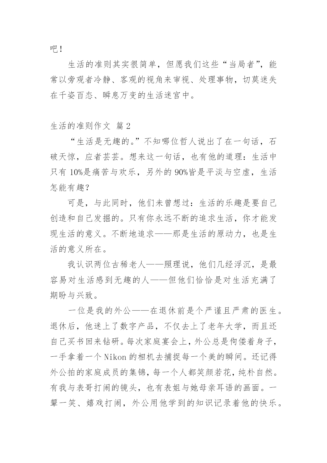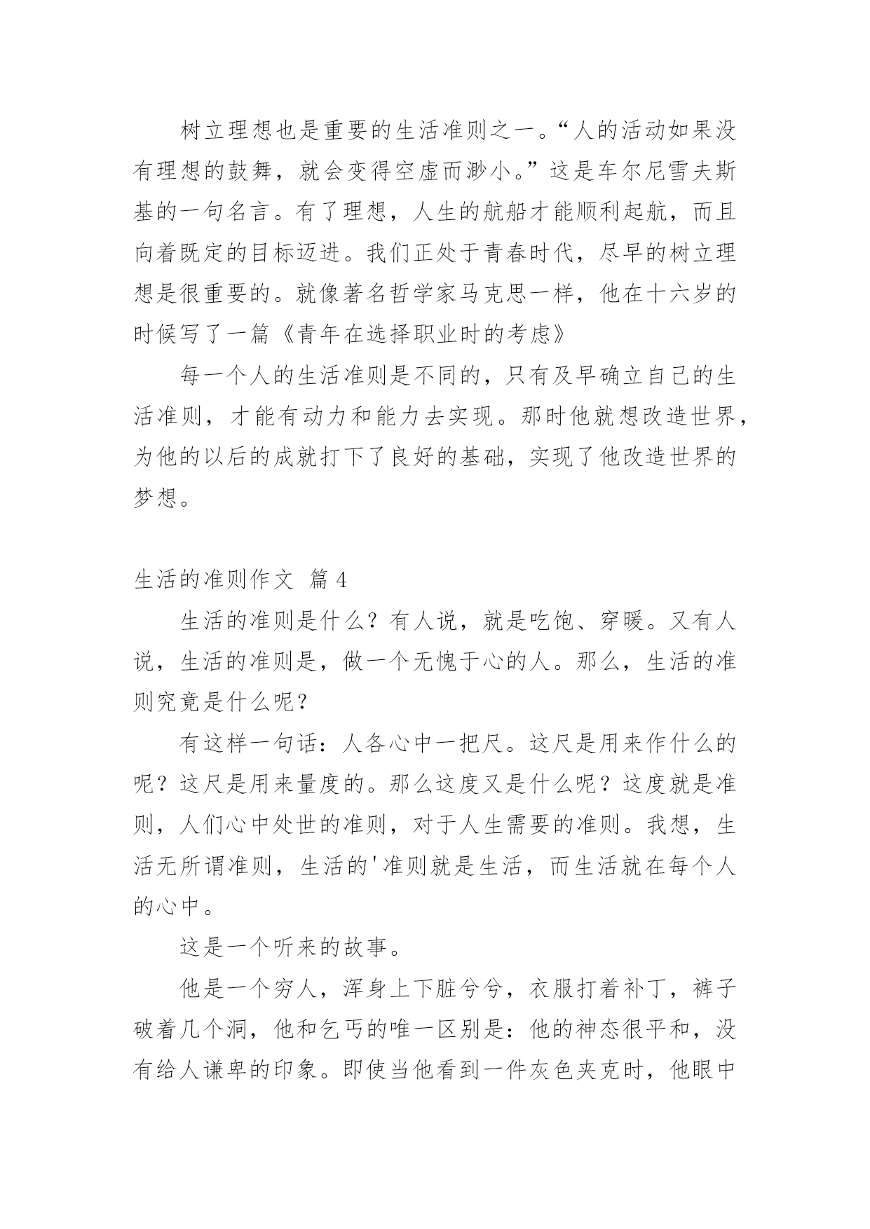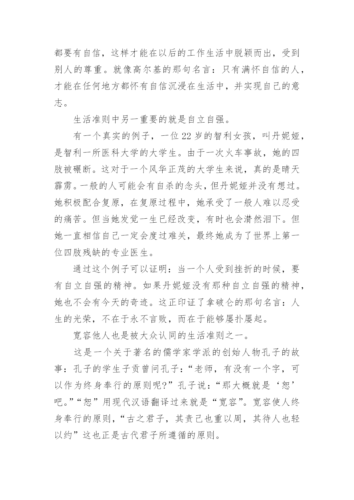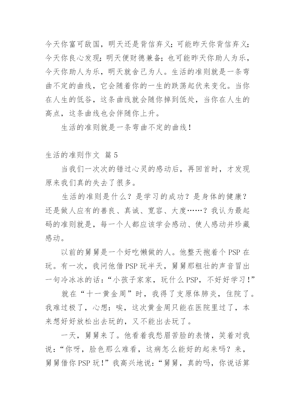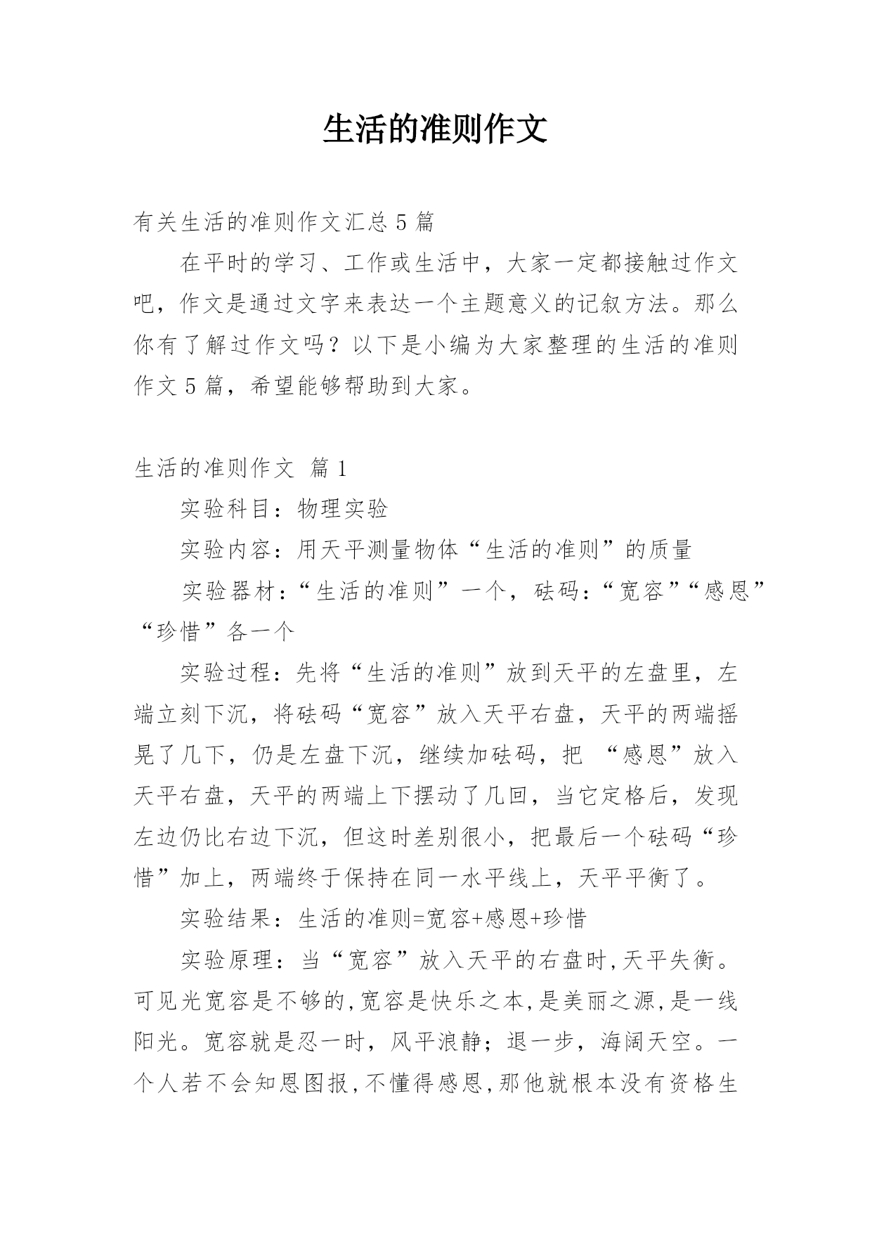 生活的准则作文有关生活的准则作文汇总5篇在平时的学习、工作或生活中,大家一定都接触过作文吧,作文是通过文字来表达一个主题意义的记叙方法。那么你有了解过作文吗?以下是小编为大家整理的生活的准则作文5篇,希望能够帮助到大家。生活的准则作文篇1实验科目:物理实验实验内容:用天平测量物体“生活的准则”的质量实验器材:“生活的准则”一个,砝码:“宽容”“感恩”“珍惜”各一个实验过程:先将“生活的准则”放到天平的左盘里,左端立刻下沉,将砝码“宽容”放入天平右盘,天平的两端摇晃了几下,仍是左盘下沉,继续加砝码,把“感恩”放入天平右盘,天平的两端上下摆动了几回,当它定格后,发现左边仍比右边下沉,但这时差别很小,把最后一个砝码“珍惜”加上,两端终于保持在同一水平线上,天平平衡了。实验结果:生活的准则=宽容+感恩+珍惜实验原理:当“宽容”放入天平的右盘时,天平失衡。可见光宽容是不够的,宽容是快乐之本,是美丽之源,是一线阳光。宽容就是忍一时,风平浪静;退一步,海阔天空。一个人若不会知恩图报,不懂得感恩,那他就根本没有资格生活、生存。感恩是对曾经伸出援手者的回馈,源于对生活的爱与希望。而“珍惜”就是一股东风,凭借着这股东风,才使你完美的人生扬帆远航。这三样缺一不可,否则,天平就会失衡。启示:在物理学中,这是一个简单不过的实验,只要清楚实验步骤,人人都会操作。而在实际生活中,我们却往往会迷茫。我们常常会因鸡毛蒜皮的小事而争得面红耳赤;常会因一句玩笑话而大伤和气,反目为仇,甚至大打出手,此时我们忘记了宽容。天空是宽容的,她容忍了雷电风暴一时的肆虐,才有了她的深邃之美;大海是宽容的,她容忍了惊涛骇浪一时的猖獗,才有了她的辽阔之美;宇宙是宽容的,她容忍了星座裂变一时的更替,才有了她的神秘之美;时间是宽容的,她容忍了各色人等一时的虚掷,才有了她的延续之美……我们会把父母无微不至的呵护当成天经地义的事;我们会把教师孜孜不倦的教诲当做“耳边风”,那是因为我们忘记了感恩。其实,感恩不需要惊天动地轰轰烈烈的举动,不需要感人肺腑的言论,一个拥抱,一个眼神都可以触动你心灵最柔软的部分,都能在你心里激起层层感恩的涟漪。我们往往在拥有的时候不懂得珍惜,直到失去后才追悔莫及。似乎人的感情总是慢半拍,初中的时候怀念小学里的纯真,高中的时候感叹初中里的快乐。放假的时候想开学,开学的时候想放假,似乎人的感情总是矛盾的,总之,珍惜现在就是珍惜幸福,珍惜你身边的那些人,那些事,那些物吧!生活的准则其实很简单,但愿我们这些“当局者”,能常以旁观者冷静、客观的视角来审视、处理事物,切莫迷失在千姿百态、瞬息万变的生活迷宫中。生活的准则作文篇2“生活是无趣的。”不知哪位哲人说出了在一句话,石破天惊,应者芸芸。想来这一句话,也有他的道理:生活中只有10%是痛苦与欢乐,另外的90%皆是平淡与空虚,生活怎能有趣?可是,与此同时,他们未曾想过:生活的乐趣是要自己创造和自己发掘的。只有你永远不断的追求生活,你才能发现生活的意义。不断地追求——那是生活的原动力,也是生活的意义所在。我认识两位古稀老人——照理说,他们几经浮沉,是最容易对生活感到无趣的人——但他们恰恰是对生活充满了期盼与兴致。一位是我的外公——在退休前是个严谨且严肃的医生。退休后,他迷上了数字产品,不仅去上了老年大学,而且还自己买书回来钻研。每次家庭宴会上,外公总是佝偻着身子,一手拿着一个Nikon的相机去捕捉每一个美的瞬间。还记得外公拍的家庭成员的集锦,每一个人都笑颜若花,纯朴自然。有我与表哥打闹的镜头,也有表姐与她母亲耳语的画面。一颦一笑、嬉戏打闹,外公用他学到的知识记录着他的快乐。几年下来,他对相机已经了如指掌。他甚至已经可以教我什么是光度差、角度差、四组三片。对于外公,不断学习、不断提高他的追求,在这个追求的过程中,他得到了提高,创造了生活中的乐趣。另一位是我的外婆,她追求的是“淡泊的心境”。她学书法也有几个年头了。在用脚踏缝纫机改造的书案上,砚台、宣纸、镇石、笔架整齐地搁置在桌上。笔转锋落,墨勾轻挑,不张扬、不露芒,韵意深长,耐人寻味。外婆每天就在午后静谧的阳光下练上一会儿字,神态宁静而又慈祥。在这样浅浅的一笔一画中,外婆领悟到了“宁静致远”的意味。她从生活中读出了一份别样的乐趣。看着老人们如此充实而有意义的生活,忽然想到与他们几乎差了三代的我们。高呼“生活是无趣的”更多的是我们。没日没夜的频繁考试,每晚的伏案夜读,从没有想过到哪里去的学子们,在迷茫的彷徨中,失去了耐心,于是,无聊铺天盖地地席卷了生活。少时光阴,有多少是这样悄无声息地从指间流过。其实,只要我们为生活找一个追求——回忆一下你小时后的梦想,是想成为作家还是想成为数学家?也许现实无奈地击碎了你以前的梦想,但是你可以寻找下一个,比如说努力让自己所付出的艰辛有意义,比如说每