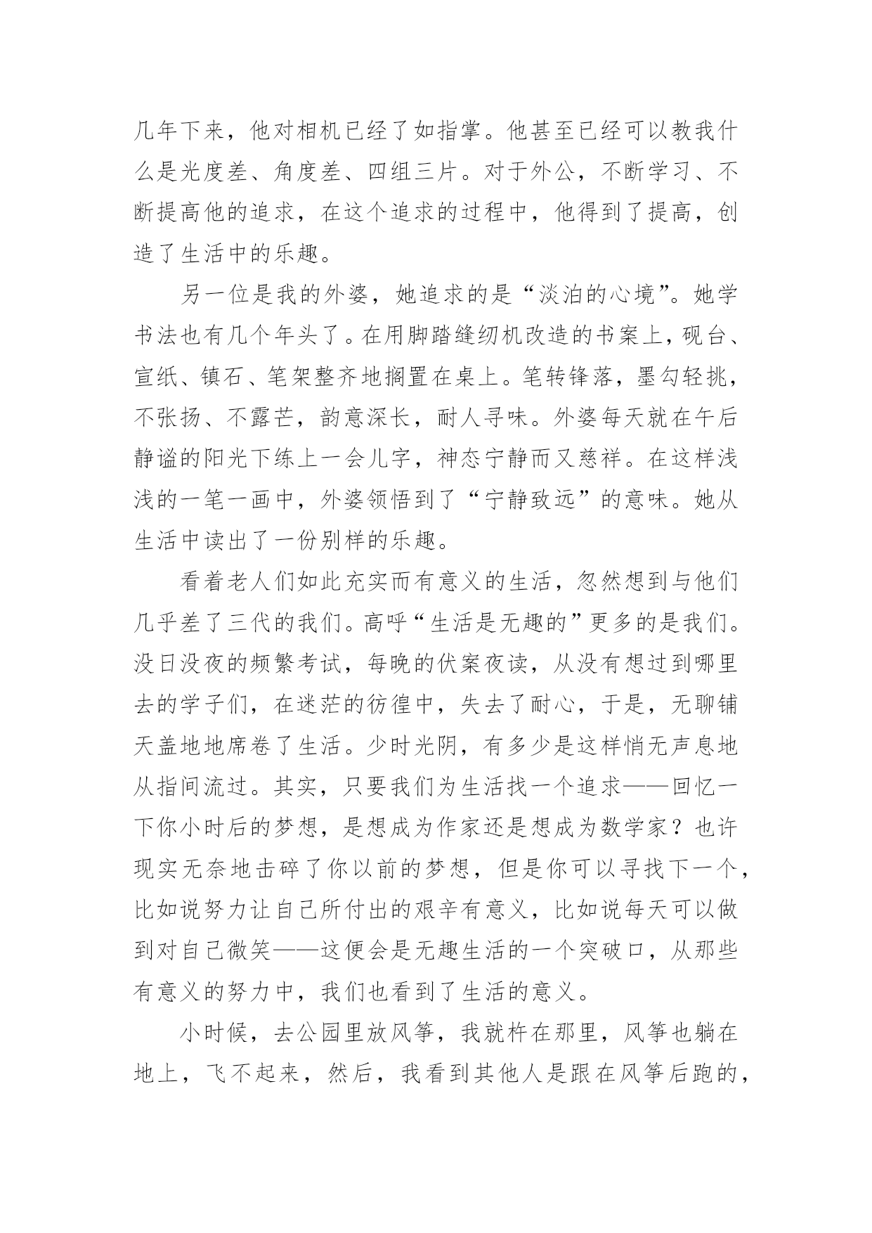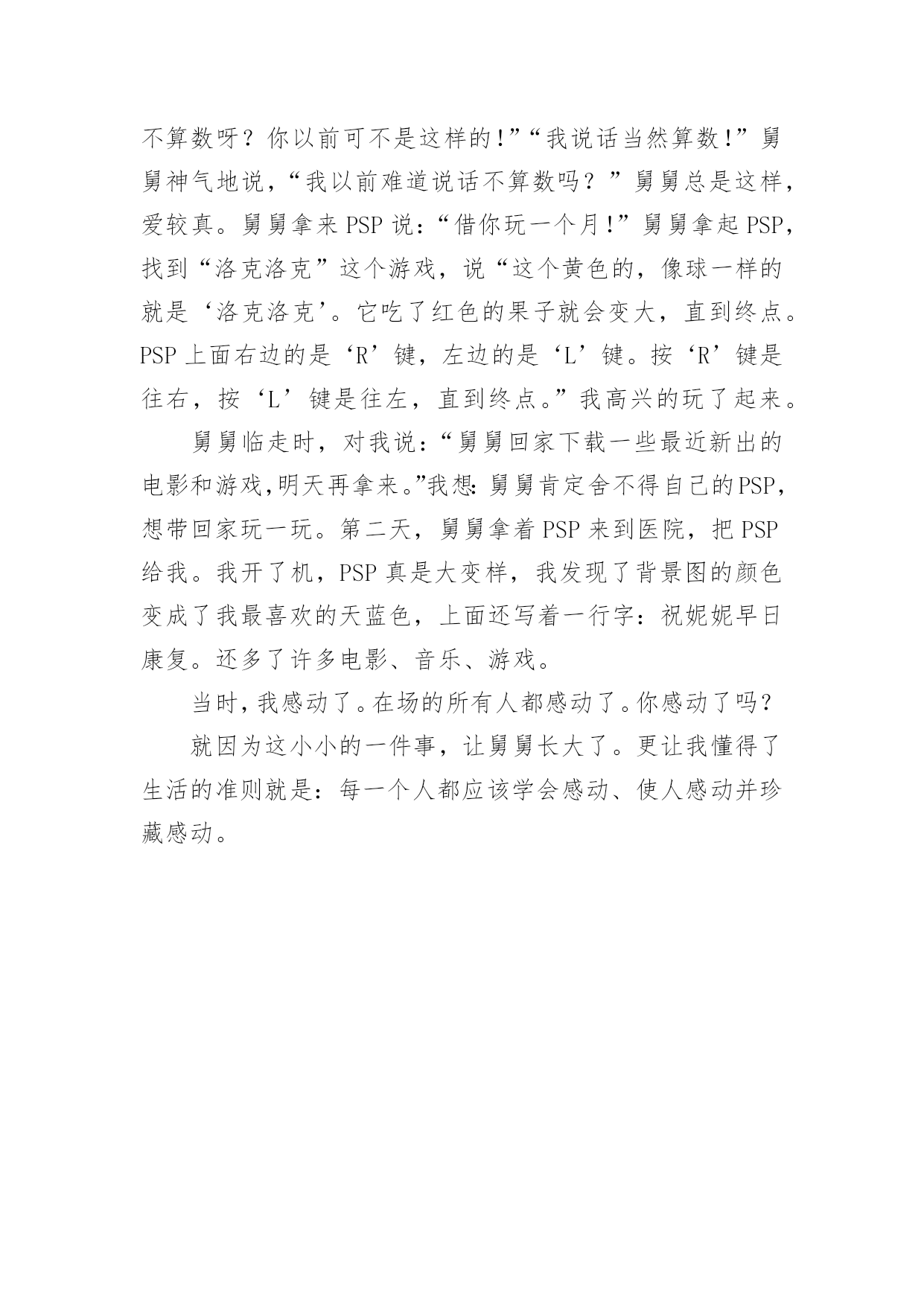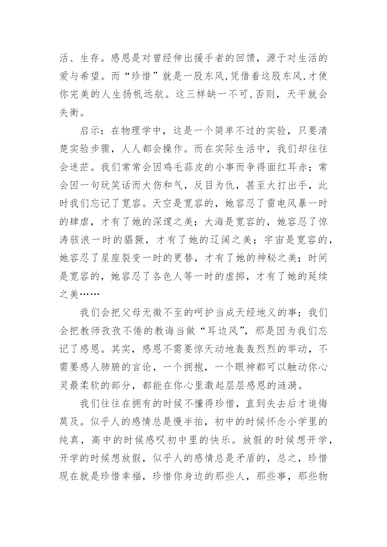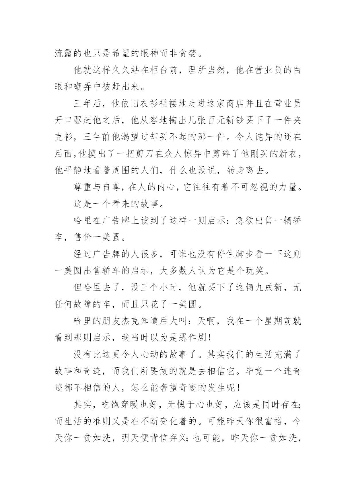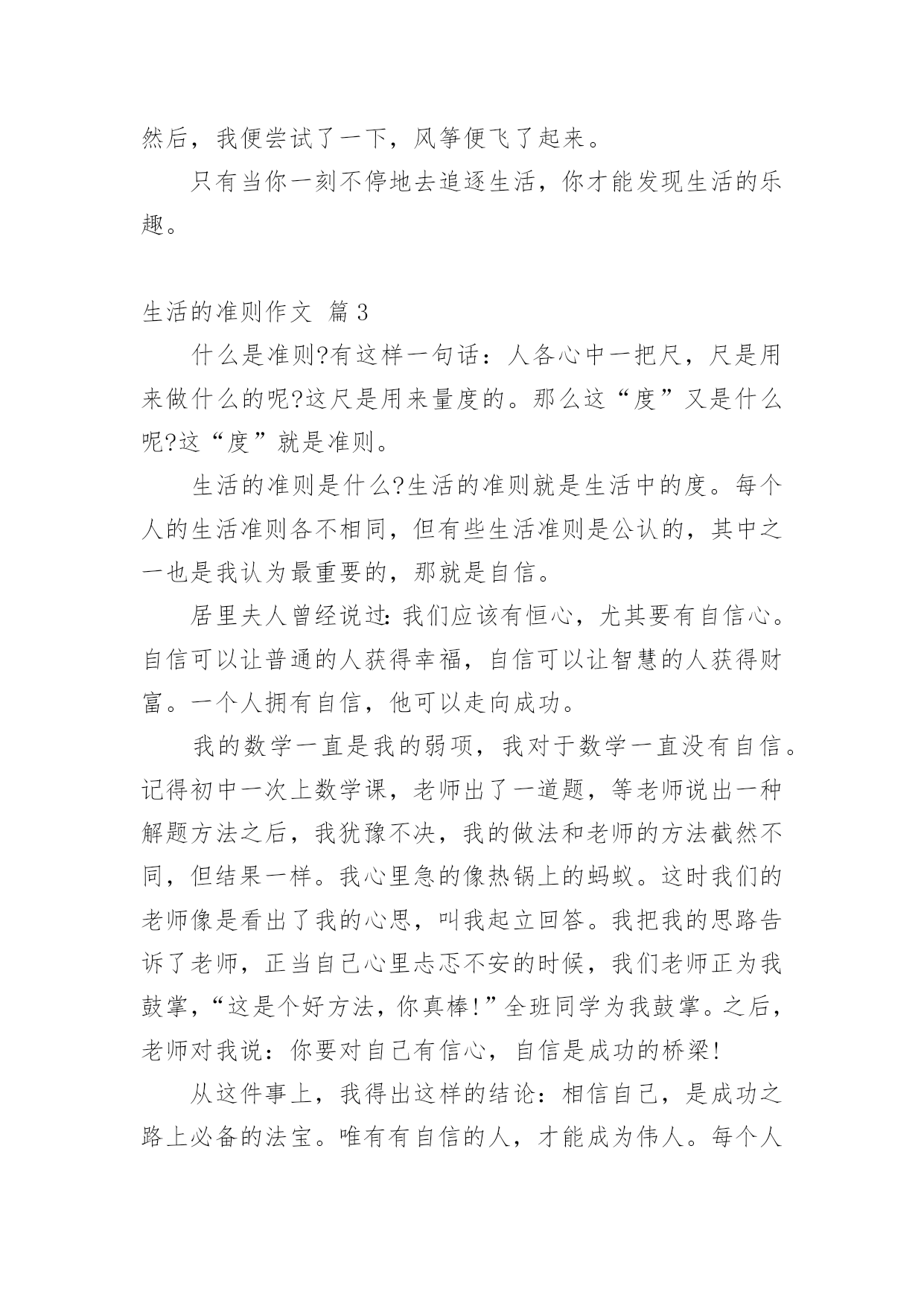 生活的准则作文有关生活的准则作文汇总5篇在平时的学习、工作或生活中,大家一定都接触过作文吧,作文是通过文字来表达一个主题意义的记叙方法。那么你有了解过作文吗?以下是小编为大家整理的生活的准则作文5篇,希望能够帮助到大家。生活的准则作文篇1实验科目:物理实验实验内容:用天平测量物体“生活的准则”的质量实验器材:“生活的准则”一个,砝码:“宽容”“感恩”“珍惜”各一个实验过程:先将“生活的准则”放到天平的左盘里,左端立刻下沉,将砝码“宽容”放入天平右盘,天平的两端摇晃了几下,仍是左盘下沉,继续加砝码,把“感恩”放入天平右盘,天平的两端上下摆动了几回,当它定格后,发现左边仍比右边下沉,但这时差别很小,把最后一个砝码“珍惜”加上,两端终于保持在同一水平线上,天平平衡了。实验结果:生活的准则=宽容+感恩+珍惜实验原理:当“宽容”放入天平的右盘时,天平失衡。可见光宽容是不够的,宽容是快乐之本,是美丽之源,是一线阳光。宽容就是忍一时,风平浪静;退一步,海阔天空。一个人若不会知恩图报,不懂得感恩,那他就根本没有资格生活、生存。感恩是对曾经伸出援手者的回馈,源于对生活的爱与希望。而“珍惜”就是一股东风,凭借着这股东风,才使你完美的人生扬帆远航。这三样缺一不可,否则,天平就会失衡。启示:在物理学中,这是一个简单不过的实验,只要清楚实验步骤,人人都会操作。而在实际生活中,我们却往往会迷茫。我们常常会因鸡毛蒜皮的小事而争得面红耳赤;常会因一句玩笑话而大伤和气,反目为仇,甚至大打出手,此时我们忘记了宽容。天空是宽容的,她容忍了雷电风暴一时的肆虐,才有了她的深邃之美;大海是宽容的,她容忍了惊涛骇浪一时的猖獗,才有了她的辽阔之美;宇宙是宽容的,她容忍了星座裂变一时的更替,才有了她的神秘之美;时间是宽容的,她容忍了各色人等一时的虚掷,才有了她的延续之美……我们会把父母无微不至的呵护当成天经地义的事;我们会把教师孜孜不倦的教诲当做“耳边风”,那是因为我们忘记了感恩。其实,感恩不需要惊天动地轰轰烈烈的举动,不需要感人肺腑的言论,一个拥抱,一个眼神都可以触动你心灵最柔软的部分,都能在你心里激起层层感恩的涟漪。我们往往在拥有的时候不懂得珍惜,直到失去后才追悔莫及。似乎人的感情总是慢半拍,初中的时候怀念小学里的纯真,高中的时候感叹初中里的快乐。放假的时候想开学,开学的时候想放假,似乎人的感情总是矛盾的,总之,珍惜现在就是珍惜幸福,珍惜你身边的那些人,那些事,那些物吧!生活的准则其实很简单,但愿我们这些“当局者”,能常以旁观者冷静、客观的视角来审视、处理事物,切莫迷失在千姿百态、瞬息万变的生活迷宫中。生活的准则作文篇2“生活是无趣的。”不知哪位哲人说出了在一句话,石破天惊,应者芸芸。想来这一句话,也有他的道理:生活中只有10%是痛苦与欢乐,另外的90%皆是平淡与空虚,生活怎能有趣?可是,与此同时,他们未曾想过:生活的乐趣是要自己创造和自己发掘的。只有你永远不断的追求生活,你才能发现生活的意义。不断地追求——那是生活的原动力,也是生活的意义所在。我认识两位古稀老人——照理说,他们几经浮沉,是最容易对生活感到无趣的人——但他们恰恰是对生活充满了期盼与兴致。一位是我的外公——在退休前是个严谨且严肃的医生。退休后,他迷上了数字产品,不仅去上了老年大学,而且还自己买书回来钻研。每次家庭宴会上,外公总是佝偻着身子,一手拿着一个Nikon的相机去捕捉每一个美的瞬间。还记得外公拍的家庭成员的集锦,每一个人都笑颜若花,纯朴自然。有我与表哥打闹的镜头,也有表姐与她母亲耳语的画面。一颦一笑、嬉戏打闹,外公用他学到的知识记录着他的快乐。几年下来,他对相机已经了如指掌。他甚至已经可以教我什么是光度差、角度差、四组三片。对于外公,不断学习、不断提高他的追求,在这个追求的过程中,他得到了提高,创造了生活中的乐趣。另一位是我的外婆,她追求的是“淡泊的心境”。她学书法也有几个年头了。在用脚踏缝纫机改造的书案上,砚台、宣纸、镇石、笔架整齐地搁置在桌上。笔转锋落,墨勾轻挑,不张扬、不露芒,韵意深长,耐人寻味。外婆每天就在午后静谧的阳光下练上一会儿字,神态宁静而又慈祥。在这样浅浅的一笔一画中,外婆领悟到了“宁静致远”的意味。她从生活中读出了一份别样的乐趣。看着老人们如此充实而有意义的生活,忽然想到与他们几乎差了三代的我们。高呼“生活是无趣的”更多的是我们。没日没夜的频繁考试,每晚的伏案夜读,从没有想过到哪里去的学子们,在迷茫的彷徨中,失去了耐心,于是,无聊铺天盖地地席卷了生活。少时光阴,有多少是这样悄无声息地从指间流过。其实,只要我们为生活找一个追求——回忆一下你小时后的梦想,是想成为作家还是想成为数学家?也许现实无奈地击碎了你以前的梦想,但是你可以寻找下一个,比如说努力让自己所付出的艰辛有意义,比如说每