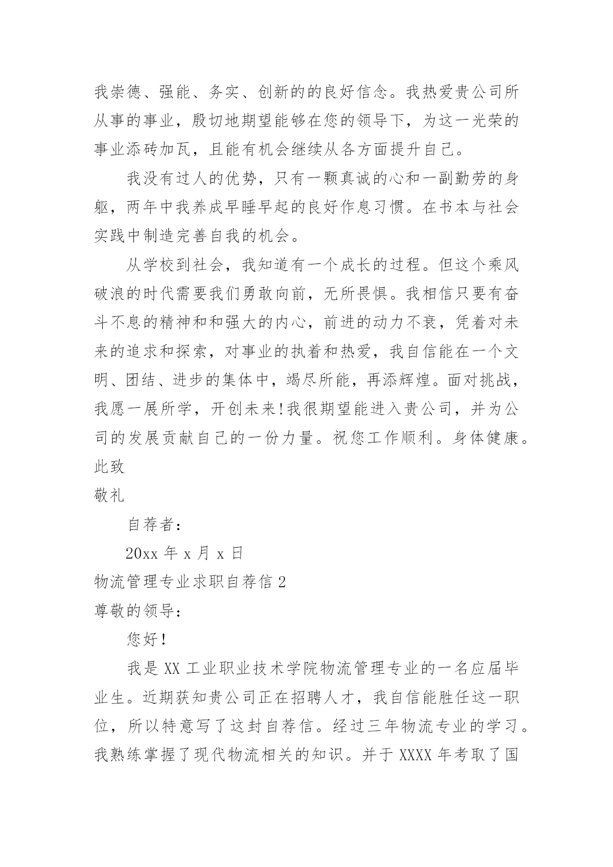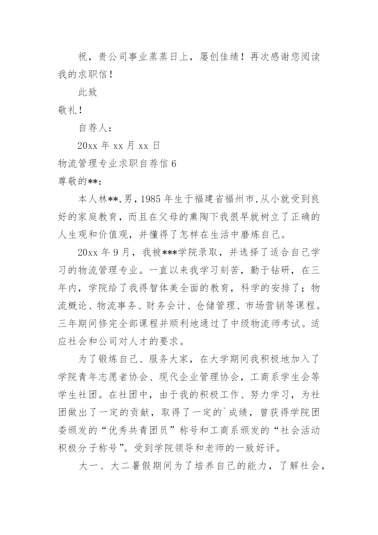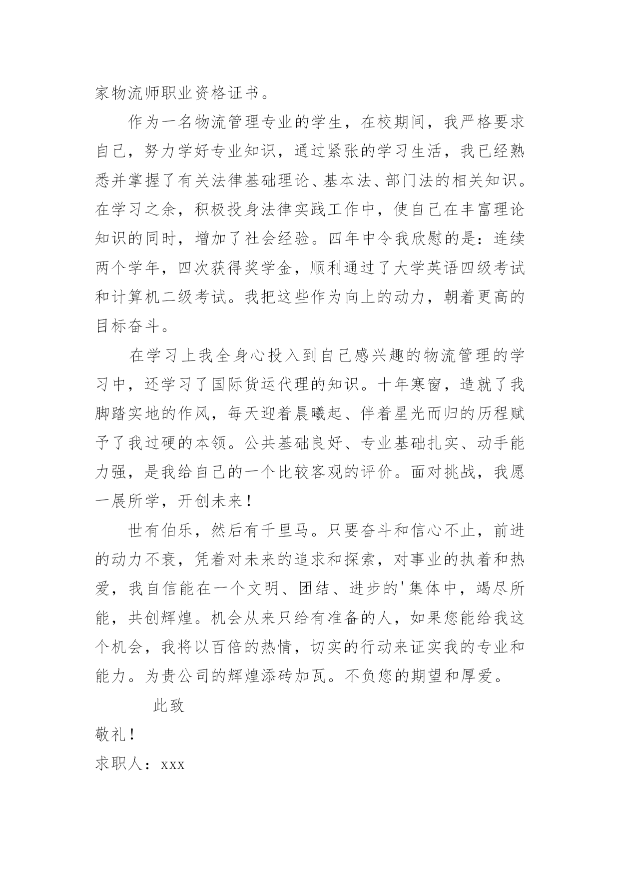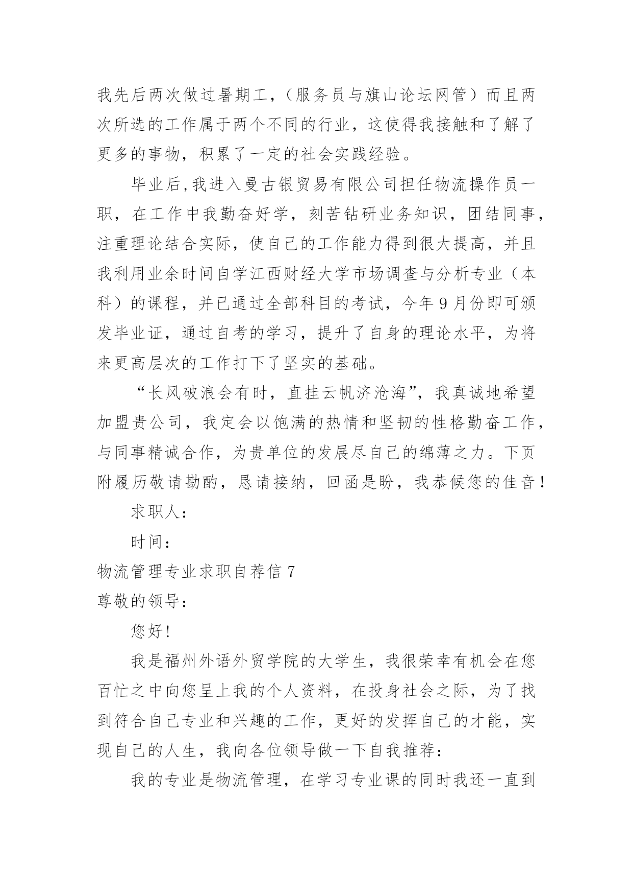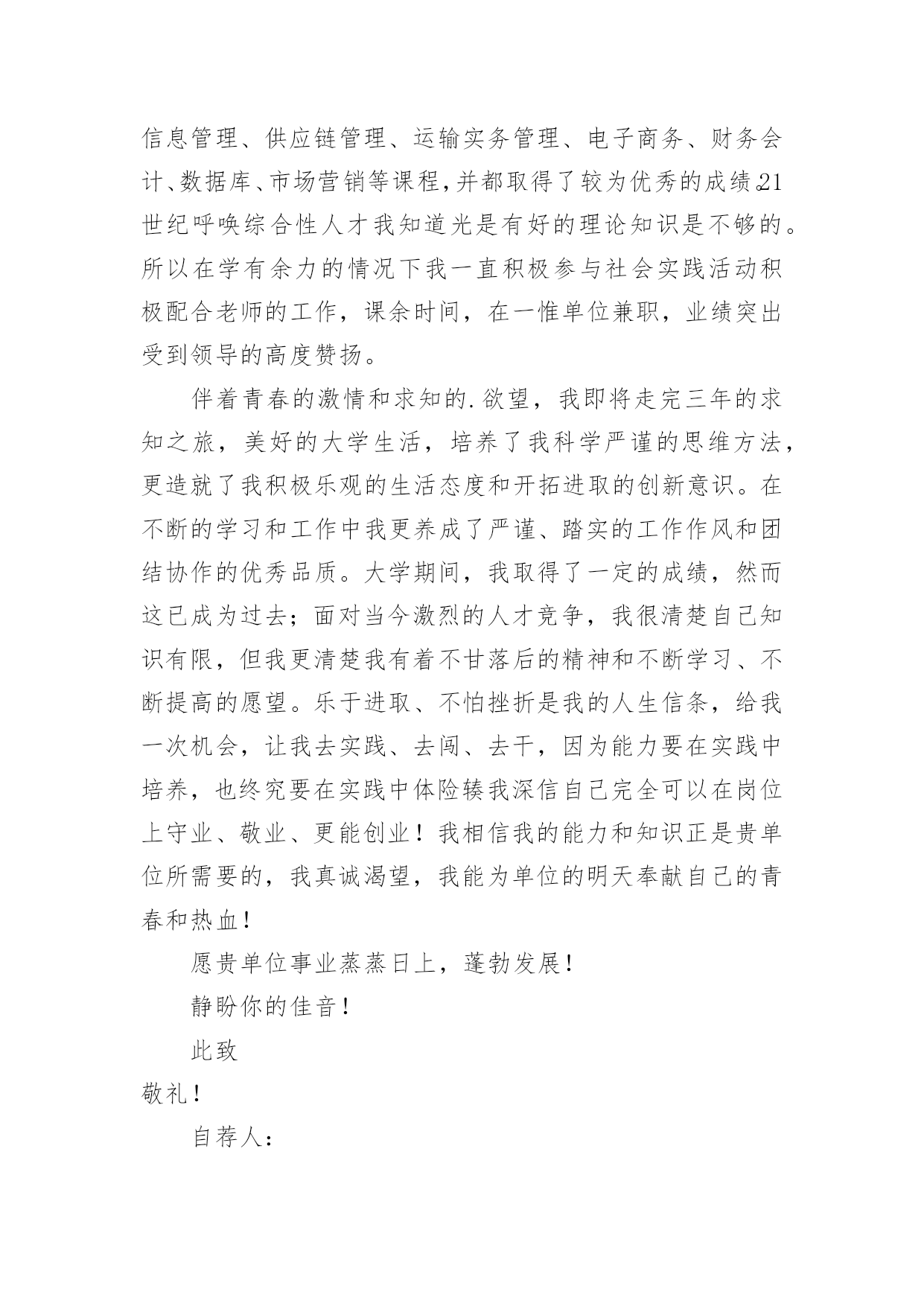 物流管理专业求职自荐信物流管理专业求职自荐信(9篇)在当今不断发展的世界,我很多时候都不得不用到自荐信,自荐信能突出个人的特征,让他人看到自己的优势。写起自荐信来就毫无头绪?以下是小编精心整理的物流管理专业求职自荐信,希望能够帮助到大家。物流管理专业求职自荐信1尊敬的领导:您好!首先感谢您在百忙之中抽出时间来阅读我的自荐材料。新世纪,风云际会,机会与挑战,两相并存。我是一名即将毕业的大二学生,现需要一份工作来完善我的大学生涯。大学两年,在学习上我全身心投入到本专业物流管理的学习中外,还学习了感兴趣的心理知识,课余时间基本都在图书馆阅读喜欢的书籍,从中找寻读书的'乐趣。此外,我还积极地参加各种社会活动,加入院学生会学习部、校文学社、校英文广播电台等社团,结交了许多值得相互学习的同学,赢得了人生又一笔宝贵的财富。此外,在服务他人的同时积极培养了自己的社交能力,抓住每一个机会,锻炼自己。大学两年,我深深地感受到,与优秀学生共事,能使我在竞争中获益;向实际困难挑战,让我在挫折中成长。祖辈们教我勤奋、尽责、善良、正直;黄冈职业技术学院培养了我崇德、强能、务实、创新的的良好信念。我热爱贵公司所从事的事业,殷切地期望能够在您的领导下,为这一光荣的事业添砖加瓦,且能有机会继续从各方面提升自己。我没有过人的优势,只有一颗真诚的心和一副勤劳的身躯,两年中我养成早睡早起的良好作息习惯。在书本与社会实践中制造完善自我的机会。从学校到社会,我知道有一个成长的过程。但这个乘风破浪的时代需要我们勇敢向前,无所畏惧。我相信只要有奋斗不息的精神和和强大的内心,前进的动力不衰,凭着对未来的追求和探索,对事业的执着和热爱,我自信能在一个文明、团结、进步的集体中,竭尽所能,再添辉煌。面对挑战,我愿一展所学,开创未来!我很期望能进入贵公司,并为公司的发展贡献自己的一份力量。祝您工作顺利。身体健康。此致敬礼自荐者:20xx年x月x日物流管理专业求职自荐信2尊敬的领导:您好!我是XX工业职业技术学院物流管理专业的一名应届毕业生。近期获知贵公司正在招聘人才,我自信能胜任这一职位,所以特意写了这封自荐信。经过三年物流专业的学习。我熟练掌握了现代物流相关的知识。并于XXXX年考取了国家物流师职业资格证书。作为一名物流管理专业的学生,在校期间,我严格要求自己,努力学好专业知识,通过紧张的学习生活,我已经熟悉并掌握了有关法律基础理论、基本法、部门法的相关知识。在学习之余,积极投身法律实践工作中,使自己在丰富理论知识的同时,增加了社会经验。四年中令我欣慰的是:连续两个学年,四次获得奖学金,顺利通过了大学英语四级考试和计算机二级考试。我把这些作为向上的动力,朝着更高的目标奋斗。在学习上我全身心投入到自己感兴趣的物流管理的学习中,还学习了国际货运代理的知识。十年寒窗,造就了我脚踏实地的作风,每天迎着晨曦起、伴着星光而归的历程赋予了我过硬的本领。公共基础良好、专业基础扎实、动手能力强,是我给自己的一个比较客观的评价。面对挑战,我愿一展所学,开创未来!世有伯乐,然后有千里马。只要奋斗和信心不止,前进的动力不衰,凭着对未来的追求和探索,对事业的执着和热爱,我自信能在一个文明、团结、进步的'集体中,竭尽所能,共创辉煌。机会从来只给有准备的人,如果您能给我这个机会,我将以百倍的热情,切实的行动来证实我的专业和能力。为贵公司的辉煌添砖加瓦。不负您的期望和厚爱。此致敬礼!求职人:xxxxxx年xx月xx日物流管理专业求职自荐信3尊敬的领导:首先感谢您在百忙中浏览这份自荐信。我是南京农业大学工业工程专业的一名学生,主修物流工程和管理,希望可以在贵公司谋得实习机会(可不要工资,只希望能有一个机会),特致自荐信。我叫xxx,很喜欢自己的专业,投入了大量的精力,并打算把物流作为自己的职业发展方向,我对物流这个职业的发展前景很有信心。在校期间,我系统的学习了物流的相关知识,专业成绩优秀,为进一步掌握物流知识和技能,我参加了全国物流师培训,更深入具体的学习了物流知识,并在课余期间阅读大量物流书籍,通过杂志、网络了解物流发展动态,对物流兴趣更浓厚,并有信心在物流方面作出成绩来。对于专业的热爱,我很注重专业知识的应用,在生活中培养工业工程意识,并在老师的.引导推荐下自学相关专业技术,如系统论,数据挖掘技术等。我性格外向,喜欢思考,洞察力较强,不怕吃苦。由于专业需要,我有团队做项目的经验,喜欢团队作业,课余曾担任院英语协会,和会员一起克服困难把协会做成一个优秀的协会,并主编创办院首期英语杂志,获得老师同学好评。我在不断完善自己理论知识的同时,迫切希望有时见得机会,使所学有所用,我希望贵公司能向我们这些渴望施展才华的新人提供一个机会,我也衷心的希望能为贵公司效力。我相信秉承着对物流这个职业的热爱和对公司对自己负责的态