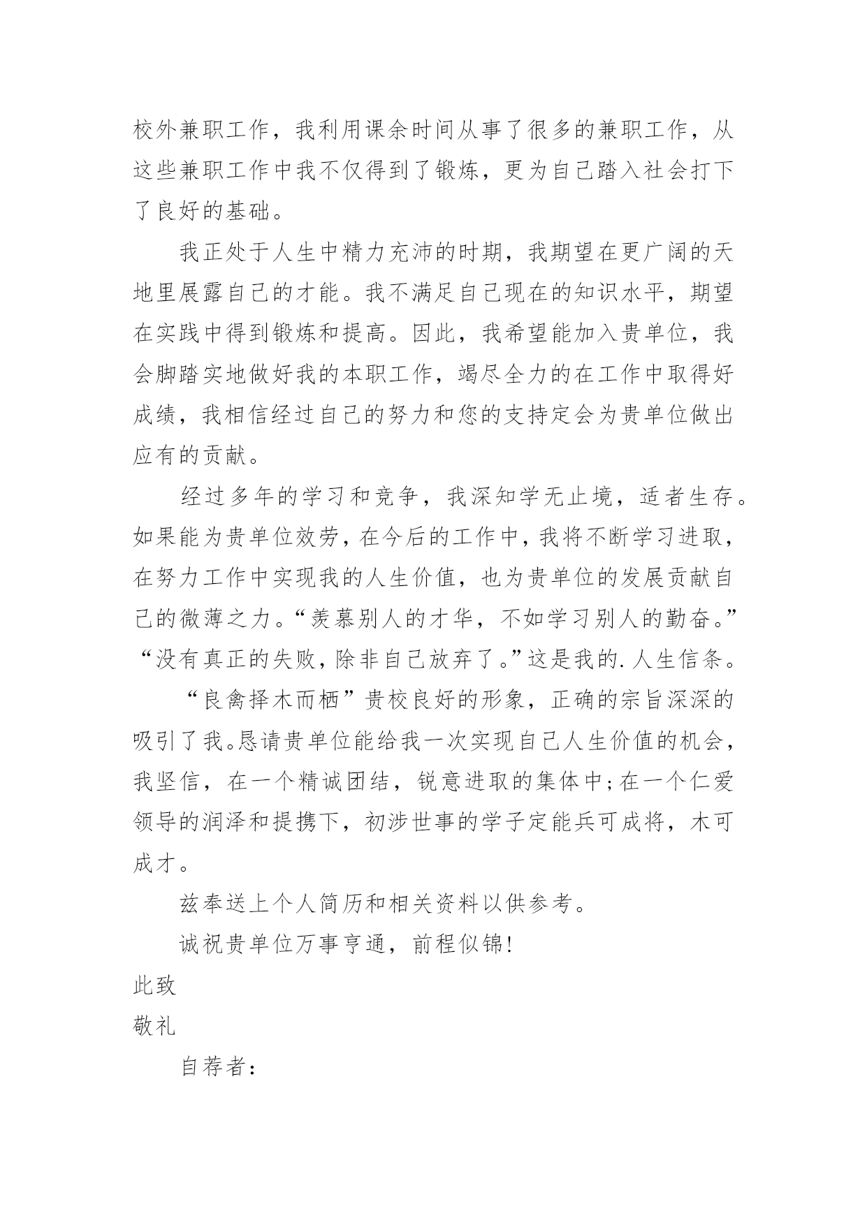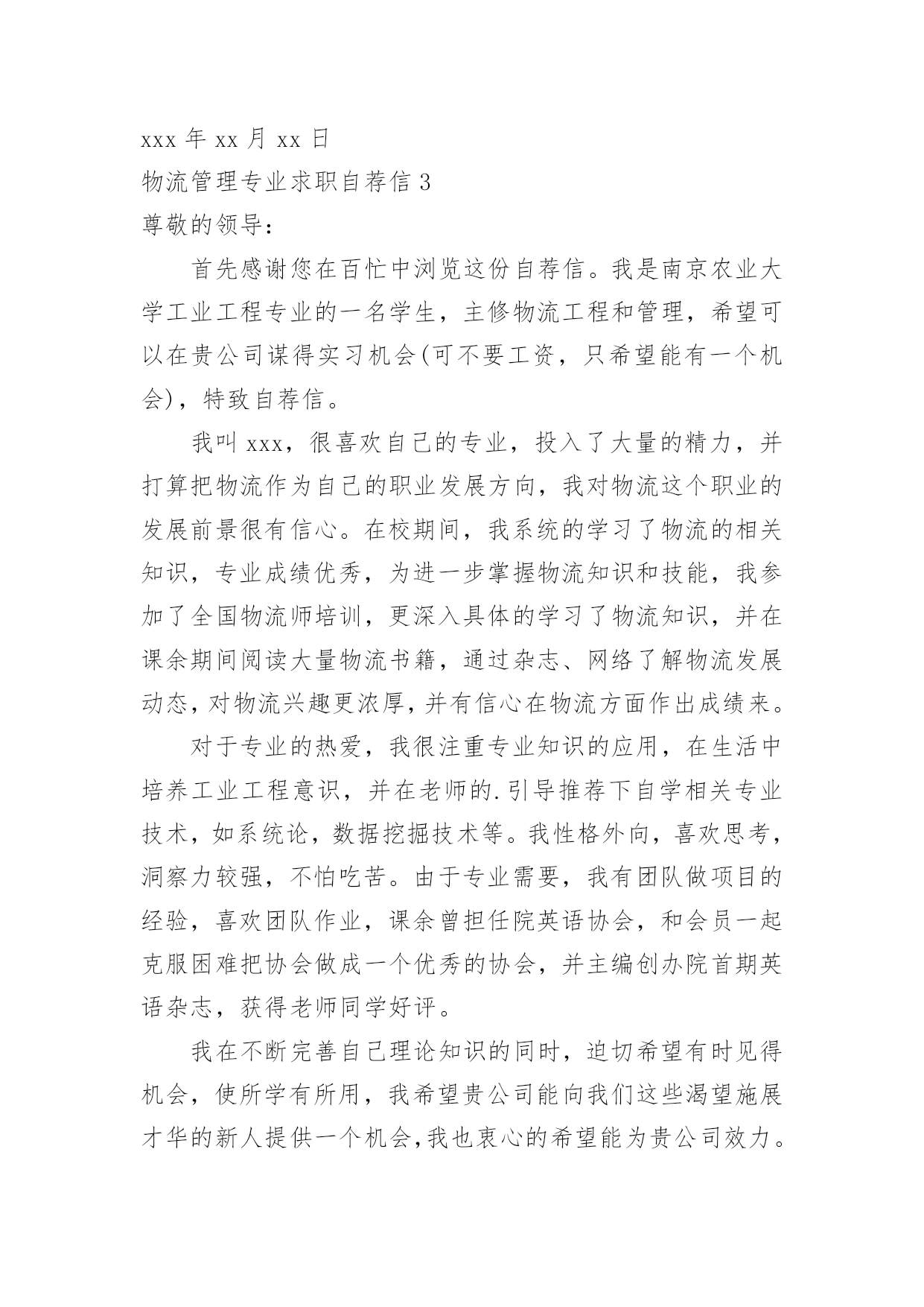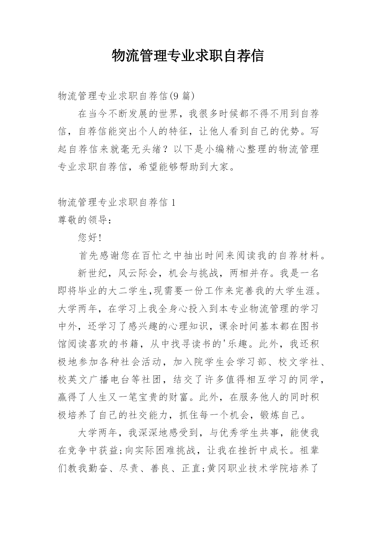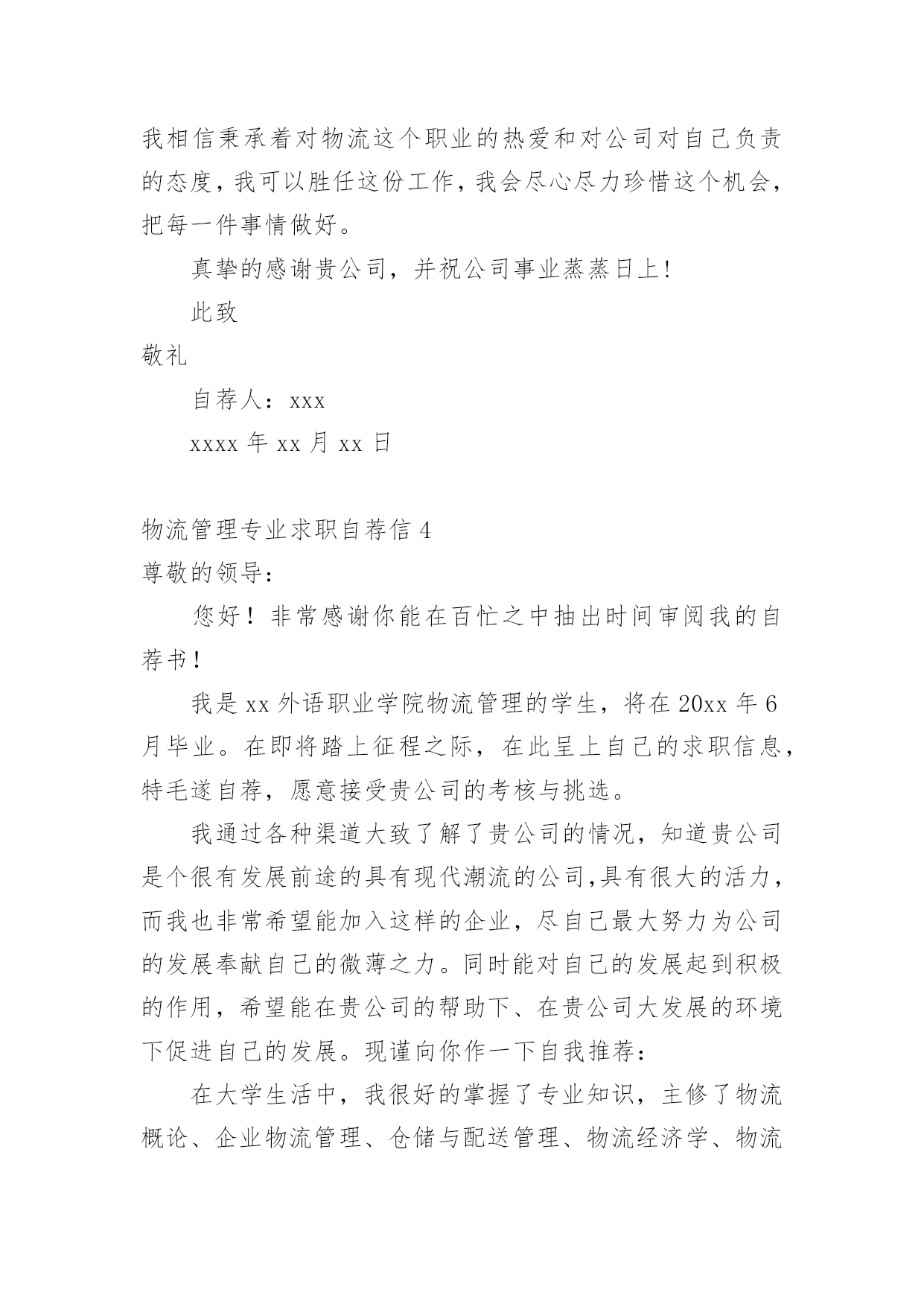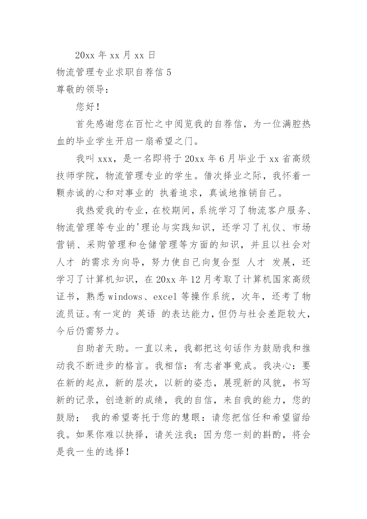 物流管理专业求职自荐信物流管理专业求职自荐信(9篇)在当今不断发展的世界,我很多时候都不得不用到自荐信,自荐信能突出个人的特征,让他人看到自己的优势。写起自荐信来就毫无头绪?以下是小编精心整理的物流管理专业求职自荐信,希望能够帮助到大家。物流管理专业求职自荐信1尊敬的领导:您好!首先感谢您在百忙之中抽出时间来阅读我的自荐材料。新世纪,风云际会,机会与挑战,两相并存。我是一名即将毕业的大二学生,现需要一份工作来完善我的大学生涯。大学两年,在学习上我全身心投入到本专业物流管理的学习中外,还学习了感兴趣的心理知识,课余时间基本都在图书馆阅读喜欢的书籍,从中找寻读书的'乐趣。此外,我还积极地参加各种社会活动,加入院学生会学习部、校文学社、校英文广播电台等社团,结交了许多值得相互学习的同学,赢得了人生又一笔宝贵的财富。此外,在服务他人的同时积极培养了自己的社交能力,抓住每一个机会,锻炼自己。大学两年,我深深地感受到,与优秀学生共事,能使我在竞争中获益;向实际困难挑战,让我在挫折中成长。祖辈们教我勤奋、尽责、善良、正直;黄冈职业技术学院培养了我崇德、强能、务实、创新的的良好信念。我热爱贵公司所从事的事业,殷切地期望能够在您的领导下,为这一光荣的事业添砖加瓦,且能有机会继续从各方面提升自己。我没有过人的优势,只有一颗真诚的心和一副勤劳的身躯,两年中我养成早睡早起的良好作息习惯。在书本与社会实践中制造完善自我的机会。从学校到社会,我知道有一个成长的过程。但这个乘风破浪的时代需要我们勇敢向前,无所畏惧。我相信只要有奋斗不息的精神和和强大的内心,前进的动力不衰,凭着对未来的追求和探索,对事业的执着和热爱,我自信能在一个文明、团结、进步的集体中,竭尽所能,再添辉煌。面对挑战,我愿一展所学,开创未来!我很期望能进入贵公司,并为公司的发展贡献自己的一份力量。祝您工作顺利。身体健康。此致敬礼自荐者:20xx年x月x日物流管理专业求职自荐信2尊敬的领导:您好!我是XX工业职业技术学院物流管理专业的一名应届毕业生。近期获知贵公司正在招聘人才,我自信能胜任这一职位,所以特意写了这封自荐信。经过三年物流专业的学习。我熟练掌握了现代物流相关的知识。并于XXXX年考取了国家物流师职业资格证书。作为一名物流管理专业的学生,在校期间,我严格要求自己,努力学好专业知识,通过紧张的学习生活,我已经熟悉并掌握了有关法律基础理论、基本法、部门法的相关知识。在学习之余,积极投身法律实践工作中,使自己在丰富理论知识的同时,增加了社会经验。四年中令我欣慰的是:连续两个学年,四次获得奖学金,顺利通过了大学英语四级考试和计算机二级考试。我把这些作为向上的动力,朝着更高的目标奋斗。在学习上我全身心投入到自己感兴趣的物流管理的学习中,还学习了国际货运代理的知识。十年寒窗,造就了我脚踏实地的作风,每天迎着晨曦起、伴着星光而归的历程赋予了我过硬的本领。公共基础良好、专业基础扎实、动手能力强,是我给自己的一个比较客观的评价。面对挑战,我愿一展所学,开创未来!世有伯乐,然后有千里马。只要奋斗和信心不止,前进的动力不衰,凭着对未来的追求和探索,对事业的执着和热爱,我自信能在一个文明、团结、进步的'集体中,竭尽所能,共创辉煌。机会从来只给有准备的人,如果您能给我这个机会,我将以百倍的热情,切实的行动来证实我的专业和能力。为贵公司的辉煌添砖加瓦。不负您的期望和厚爱。此致敬礼!求职人:xxxxxx年xx月xx日物流管理专业求职自荐信3尊敬的领导:首先感谢您在百忙中浏览这份自荐信。我是南京农业大学工业工程专业的一名学生,主修物流工程和管理,希望可以在贵公司谋得实习机会(可不要工资,只希望能有一个机会),特致自荐信。我叫xxx,很喜欢自己的专业,投入了大量的精力,并打算把物流作为自己的职业发展方向,我对物流这个职业的发展前景很有信心。在校期间,我系统的学习了物流的相关知识,专业成绩优秀,为进一步掌握物流知识和技能,我参加了全国物流师培训,更深入具体的学习了物流知识,并在课余期间阅读大量物流书籍,通过杂志、网络了解物流发展动态,对物流兴趣更浓厚,并有信心在物流方面作出成绩来。对于专业的热爱,我很注重专业知识的应用,在生活中培养工业工程意识,并在老师的.引导推荐下自学相关专业技术,如系统论,数据挖掘技术等。我性格外向,喜欢思考,洞察力较强,不怕吃苦。由于专业需要,我有团队做项目的经验,喜欢团队作业,课余曾担任院英语协会,和会员一起克服困难把协会做成一个优秀的协会,并主编创办院首期英语杂志,获得老师同学好评。我在不断完善自己理论知识的同时,迫切希望有时见得机会,使所学有所用,我希望贵公司能向我们这些渴望施展才华的新人提供一个机会,我也衷心的希望能为贵公司效力。我相信秉承着对物流这个职业的热爱和对公司对自己负责的态