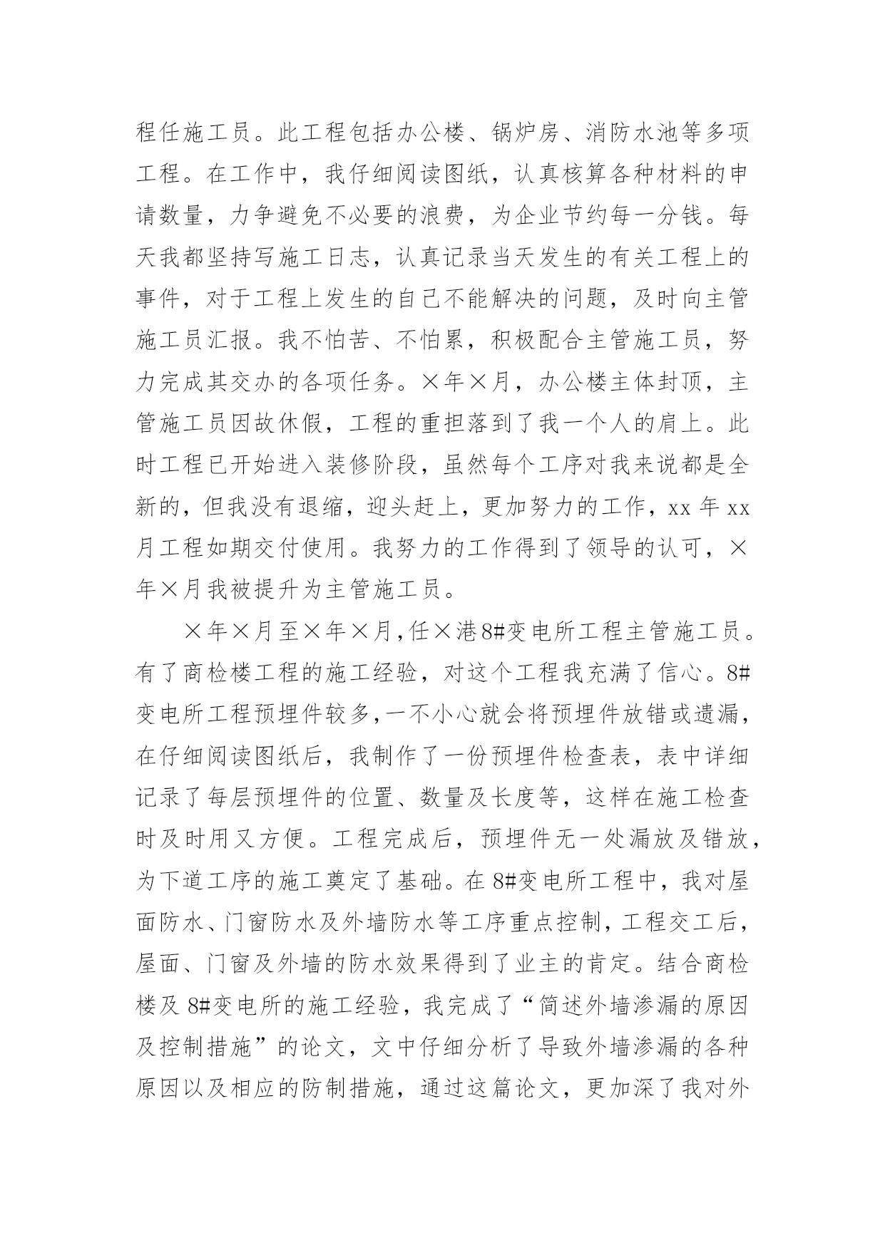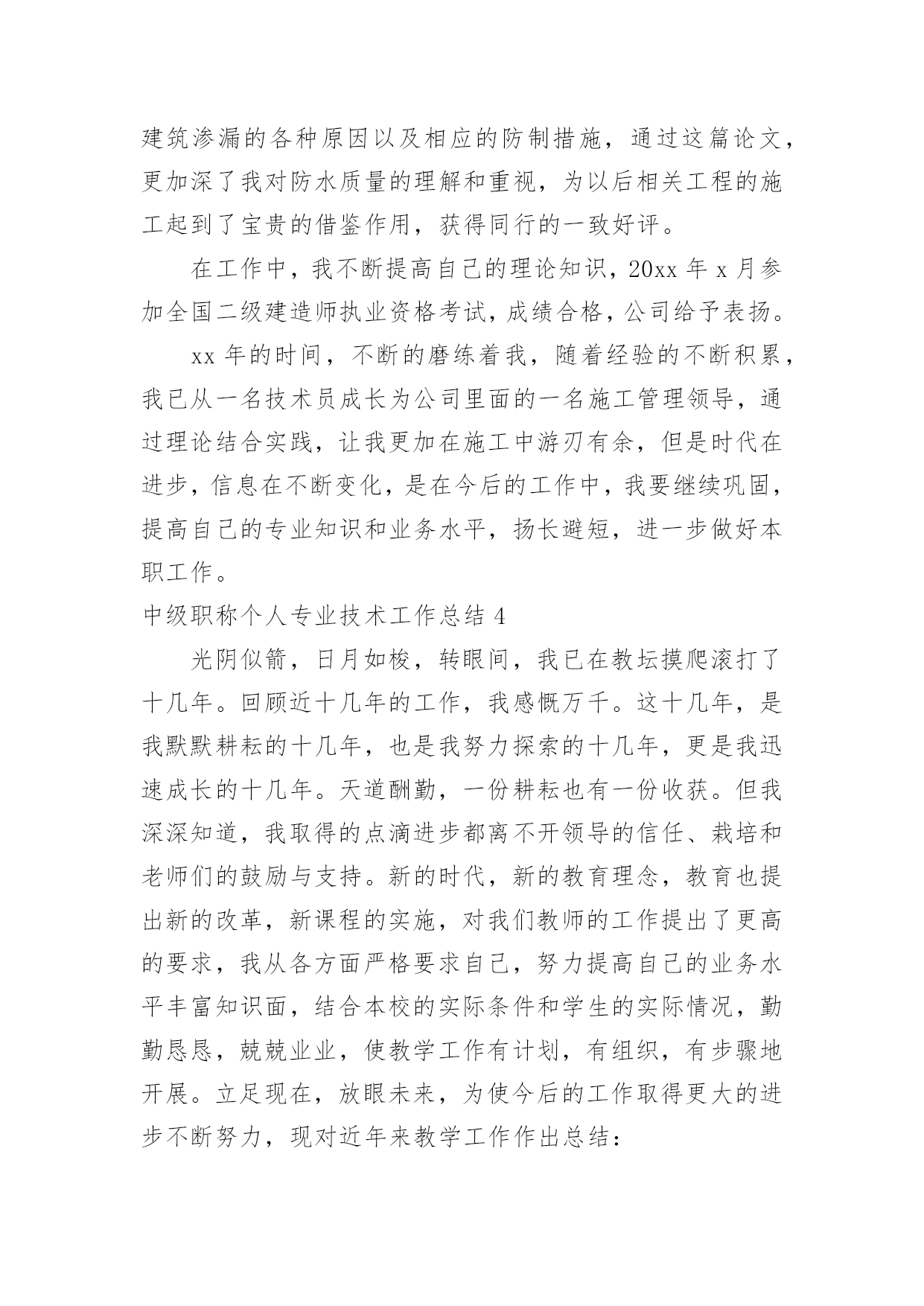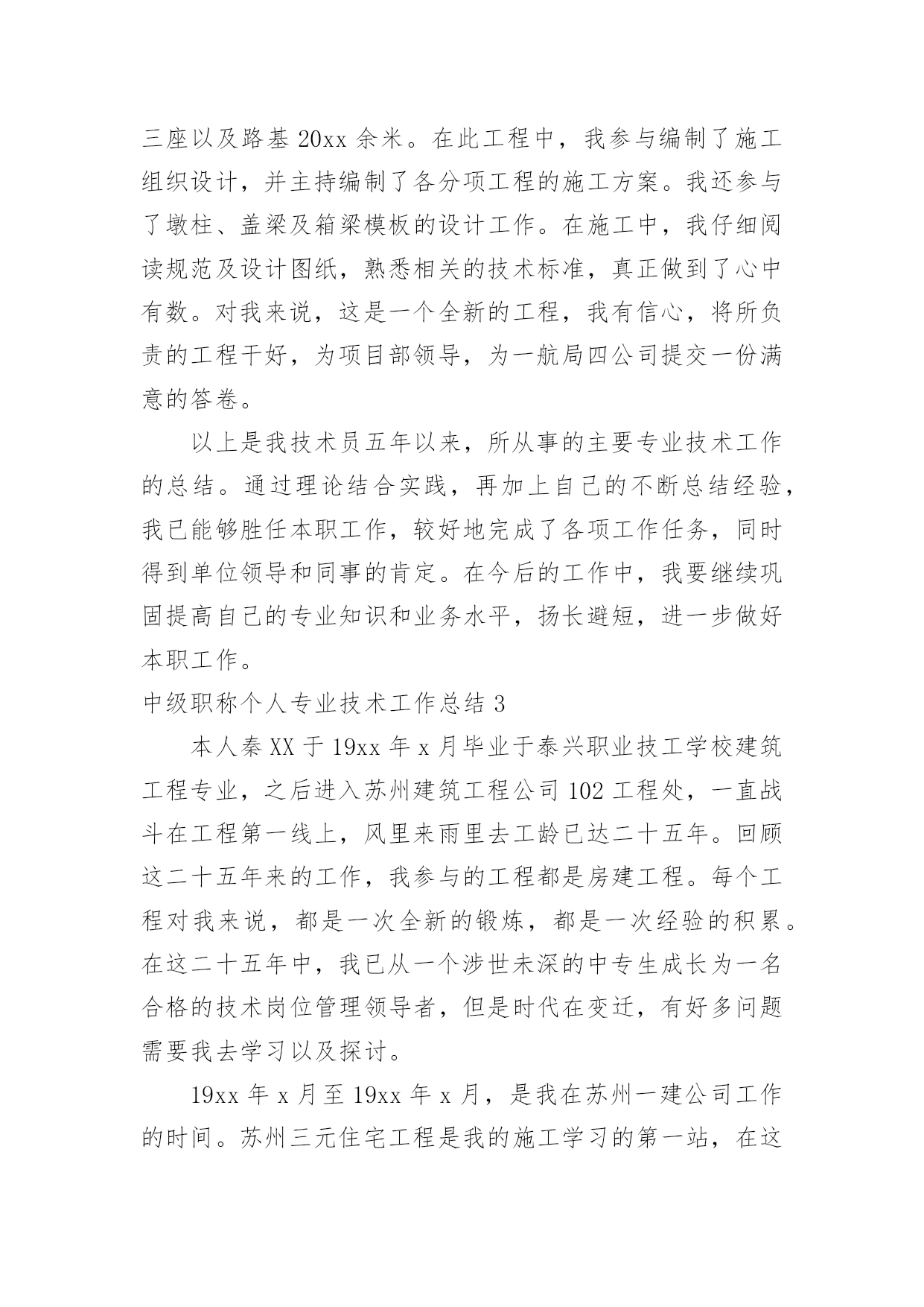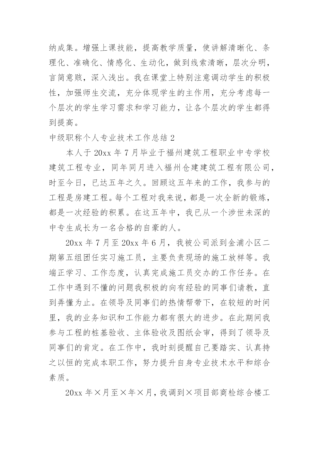 中级职称个人专业技术工作总结中级职称个人专业技术工作总结5篇总结是对取得的成绩、存在的问题及得到的经验和教训等方面情况进行评价与描述的一种书面材料,它是增长才干的一种好办法,让我们好好写一份总结吧。总结怎么写才是正确的呢?下面是小编帮大家整理的中级职称个人专业技术工作总结,仅供参考,欢迎大家阅读。中级职称个人专业技术工作总结1我叫xxx,是中学语文教师。20xx年学校毕业,20xx年调入中学工作至今。工作以来,我努力提高自己的思想政治水平和教学业务能力,从各方面严格要求自己,刻苦学习,努力工作,兢兢业业,在德、能、勤、绩四个方面表现良好,能做到为人师表、教书育人,较好的完成教育教学工作任务,尽到了一个教师应有的职责,受到上级机关、领导、同行和学生的认可和好评。年,我被评为中学一级教师,年来,我尽职尽责,既给年轻老师做榜样,同时又向高级教师学习,教学水平与工作能力有了很大提高,在德能勤绩四方面达到了高级教师的要求标准。现将我的工作表现总结如下:一、爱岗敬业,努力学习,不断提高自己的政治思想素质。为适应新时期教学工作的要求,努力提高自己的思想道德水平;坚持四项基本原则,认真学习党的基本理论和重要著作,不断提高自己,充实自己,虚心接受同志们的批评,注意在实践中改正自己的缺点;认真学习党的路线、方针和政策,热爱党的教育事业,热爱本职工作,加强自我修养。我努力地学习政治理论,积极参加学校组织的一系列活动,将学到的理论知识切实运用到工作实践中。注意主动帮助其他同志干一些力所能及的事,自己也在做的过程中得到锻炼,增长了知识,提高了工作的能力。多年的政治学习和教育教学工作使我越来越认识到作为人民教师,关注国家兴亡,忠诚党的教育事业,教书育人,培养学生,干好本职工作,就是爱国的表现,就是在尽一个公民的职责。二、研究教学规律,探索教育教学新途径,努力做到“学高为师”。我从事教育工作的座右铭是“脚踏实地,积极进取”。在教育理念中,我恪守“学高为师,德高为范”的原则。因此,教学工作中,认真备课、上课,扎扎实实地打好基础,出色地完成“六认真”工作,在教学中我不是照本宣科,而是以各种方式营造轻松、活泼、上进的学习氛围,用学生乐于接受的方法来教学。教学工作中认真备课是第一位的,我不但备学生而且备教材备教法,根据教材内容及学生的实际,设计课的类型,拟定采用的教学方法,并对教学过程的程序及时间安排都作了详细的记录,认真写好教案。每一课都做到出国留学“有备而来”,每堂课都做好充分的准备,课后及时对该课作出总结,写好教学后记,并认真按搜集每课书的知识要点,归纳成集。增强上课技能,提高教学质量,使讲解清晰化、条理化、准确化、情感化、生动化,做到线索清晰,层次分明,言简意赅,深入浅出。我在课堂上特别注意调动学生的积极性,加强师生交流,充分体现学生的主作用,充分考虑每一个层次的学生学习需求和学习能力,让各个层次的学生都得到提高。中级职称个人专业技术工作总结2本人于20xx年7月毕业于福州建筑工程职业中专学校建筑工程专业,同年同月进入福州仓建建筑工程有限公司,时至今日,已达五年之久。回顾这五年来的工作,我参与的工程是房建工程。每个工程对我来说,都是一次全新的锻炼,都是一次经验的积累。在这五年中,我已从一个涉世未深的中专生成长为一名合格的自豪的人。20xx年7月至20xx年6月,我被公司派到金浦小区二期第五组团任实习施工员,主要负责现场的施工放样等。我端正学习、工作态度,认真完成施工员交办的工作任务。在工作中遇到不懂的问题我积极的向有经验的同事们请教,直到弄懂为止。在领导及同事们的热情帮带下,在较短的时间里,我的业务知识和工作能力都有很大的进步。在此期间我参与工程的桩基验收、主体验收及图纸会审,得到了领导及同事们的肯定。在工作中,我时刻提醒自己要踏实、认真持之以恒的完成本职工作,努力提升自身专业技术水平和综合素质。20xx年×月至×年×月,我调到×项目部商检综合楼工程任施工员。此工程包括办公楼、锅炉房、消防水池等多项工程。在工作中,我仔细阅读图纸,认真核算各种材料的申请数量,力争避免不必要的浪费,为企业节约每一分钱。每天我都坚持写施工日志,认真记录当天发生的有关工程上的事件,对于工程上发生的自己不能解决的问题,及时向主管施工员汇报。我不怕苦、不怕累,积极配合主管施工员,努力完成其交办的各项任务。×年×月,办公楼主体封顶,主管施工员因故休假,工程的重担落到了我一个人的肩上。此时工程已开始进入装修阶段,虽然每个工序对我来说都是全新的,但我没有退缩,迎头赶上,更加努力的工作,xx年xx月工程如期交付使用。我努力的工作得到了领导的认可,×年×月我被提升为主管施工员。×年×月至×年×月,任×港8#变电所工程主管施工员。有了商检楼工程的施工经验,对这个工程我充满了信心。8#变电所工