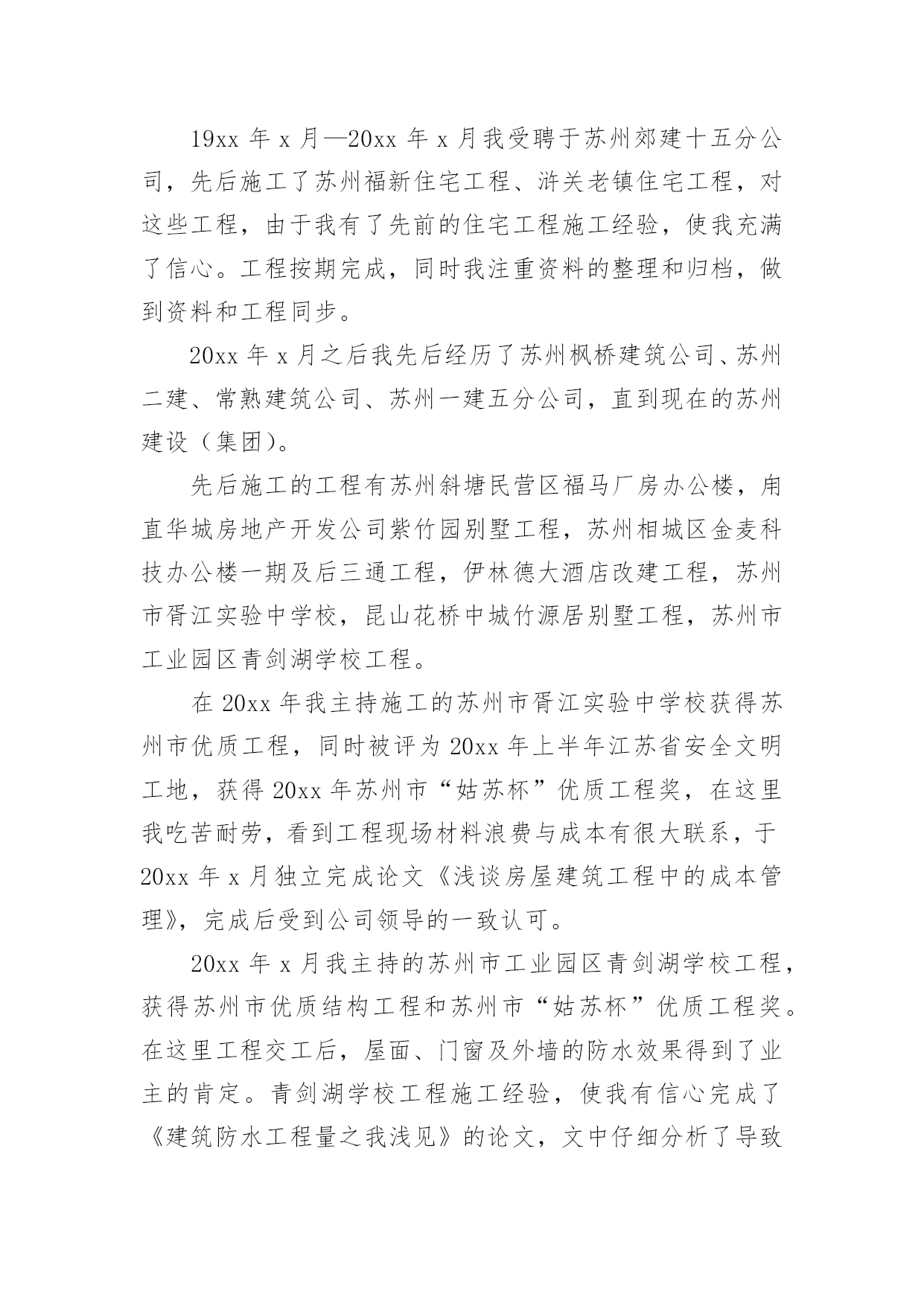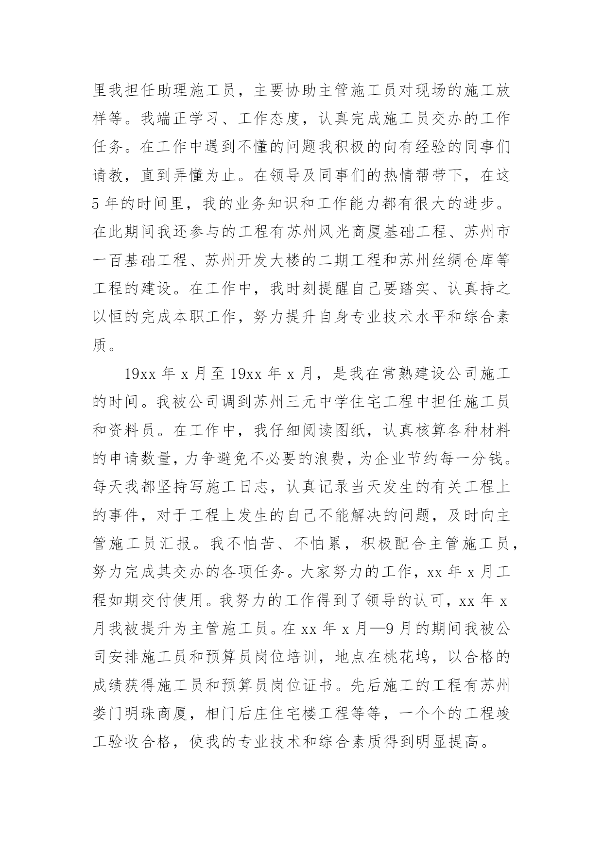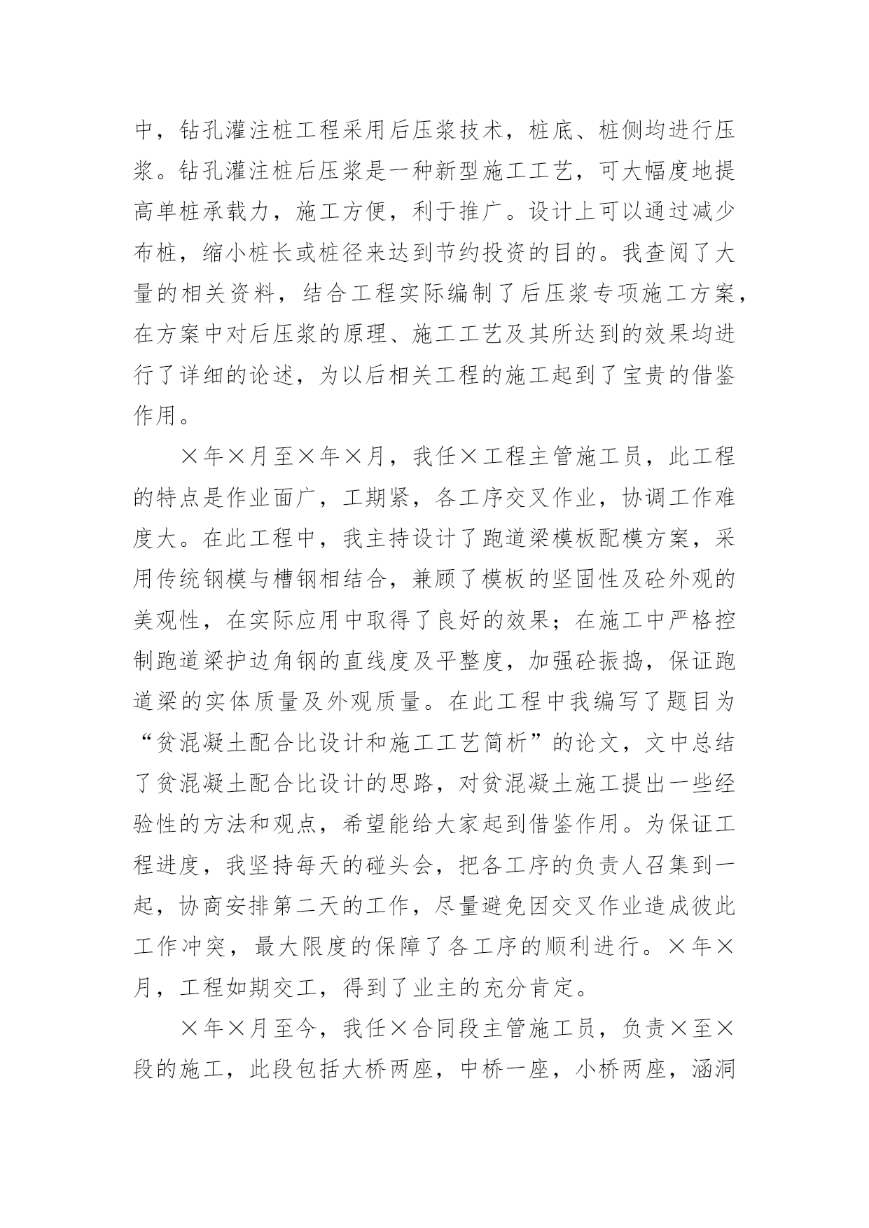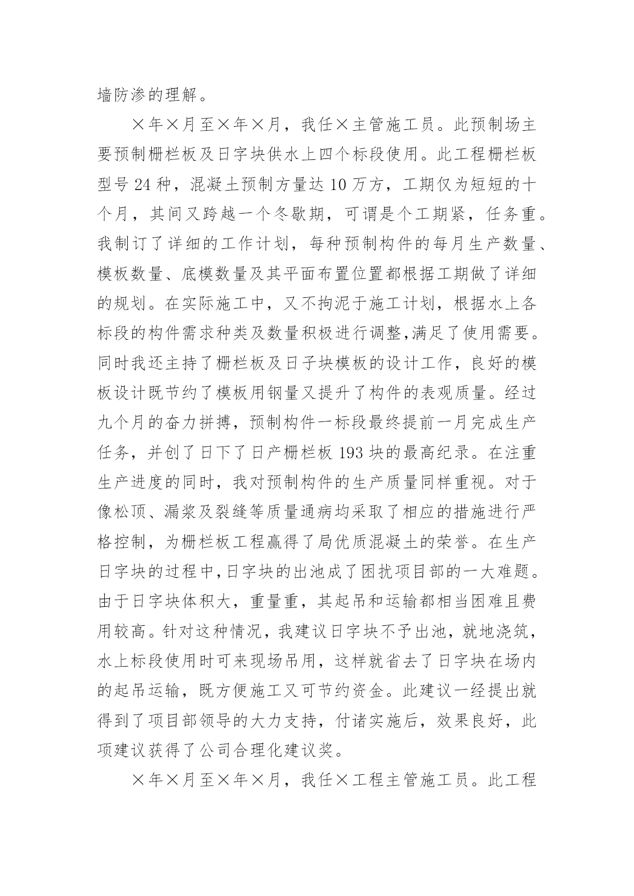 中级职称个人专业技术工作总结中级职称个人专业技术工作总结5篇总结是对取得的成绩、存在的问题及得到的经验和教训等方面情况进行评价与描述的一种书面材料,它是增长才干的一种好办法,让我们好好写一份总结吧。总结怎么写才是正确的呢?下面是小编帮大家整理的中级职称个人专业技术工作总结,仅供参考,欢迎大家阅读。中级职称个人专业技术工作总结1我叫xxx,是中学语文教师。20xx年学校毕业,20xx年调入中学工作至今。工作以来,我努力提高自己的思想政治水平和教学业务能力,从各方面严格要求自己,刻苦学习,努力工作,兢兢业业,在德、能、勤、绩四个方面表现良好,能做到为人师表、教书育人,较好的完成教育教学工作任务,尽到了一个教师应有的职责,受到上级机关、领导、同行和学生的认可和好评。年,我被评为中学一级教师,年来,我尽职尽责,既给年轻老师做榜样,同时又向高级教师学习,教学水平与工作能力有了很大提高,在德能勤绩四方面达到了高级教师的要求标准。现将我的工作表现总结如下:一、爱岗敬业,努力学习,不断提高自己的政治思想素质。为适应新时期教学工作的要求,努力提高自己的思想道德水平;坚持四项基本原则,认真学习党的基本理论和重要著作,不断提高自己,充实自己,虚心接受同志们的批评,注意在实践中改正自己的缺点;认真学习党的路线、方针和政策,热爱党的教育事业,热爱本职工作,加强自我修养。我努力地学习政治理论,积极参加学校组织的一系列活动,将学到的理论知识切实运用到工作实践中。注意主动帮助其他同志干一些力所能及的事,自己也在做的过程中得到锻炼,增长了知识,提高了工作的能力。多年的政治学习和教育教学工作使我越来越认识到作为人民教师,关注国家兴亡,忠诚党的教育事业,教书育人,培养学生,干好本职工作,就是爱国的表现,就是在尽一个公民的职责。二、研究教学规律,探索教育教学新途径,努力做到“学高为师”。我从事教育工作的座右铭是“脚踏实地,积极进取”。在教育理念中,我恪守“学高为师,德高为范”的原则。因此,教学工作中,认真备课、上课,扎扎实实地打好基础,出色地完成“六认真”工作,在教学中我不是照本宣科,而是以各种方式营造轻松、活泼、上进的学习氛围,用学生乐于接受的方法来教学。教学工作中认真备课是第一位的,我不但备学生而且备教材备教法,根据教材内容及学生的实际,设计课的类型,拟定采用的教学方法,并对教学过程的程序及时间安排都作了详细的记录,认真写好教案。每一课都做到出国留学“有备而来”,每堂课都做好充分的准备,课后及时对该课作出总结,写好教学后记,并认真按搜集每课书的知识要点,归纳成集。增强上课技能,提高教学质量,使讲解清晰化、条理化、准确化、情感化、生动化,做到线索清晰,层次分明,言简意赅,深入浅出。我在课堂上特别注意调动学生的积极性,加强师生交流,充分体现学生的主作用,充分考虑每一个层次的学生学习需求和学习能力,让各个层次的学生都得到提高。中级职称个人专业技术工作总结2本人于20xx年7月毕业于福州建筑工程职业中专学校建筑工程专业,同年同月进入福州仓建建筑工程有限公司,时至今日,已达五年之久。回顾这五年来的工作,我参与的工程是房建工程。每个工程对我来说,都是一次全新的锻炼,都是一次经验的积累。在这五年中,我已从一个涉世未深的中专生成长为一名合格的自豪的人。20xx年7月至20xx年6月,我被公司派到金浦小区二期第五组团任实习施工员,主要负责现场的施工放样等。我端正学习、工作态度,认真完成施工员交办的工作任务。在工作中遇到不懂的问题我积极的向有经验的同事们请教,直到弄懂为止。在领导及同事们的热情帮带下,在较短的时间里,我的业务知识和工作能力都有很大的进步。在此期间我参与工程的桩基验收、主体验收及图纸会审,得到了领导及同事们的肯定。在工作中,我时刻提醒自己要踏实、认真持之以恒的完成本职工作,努力提升自身专业技术水平和综合素质。20xx年×月至×年×月,我调到×项目部商检综合楼工程任施工员。此工程包括办公楼、锅炉房、消防水池等多项工程。在工作中,我仔细阅读图纸,认真核算各种材料的申请数量,力争避免不必要的浪费,为企业节约每一分钱。每天我都坚持写施工日志,认真记录当天发生的有关工程上的事件,对于工程上发生的自己不能解决的问题,及时向主管施工员汇报。我不怕苦、不怕累,积极配合主管施工员,努力完成其交办的各项任务。×年×月,办公楼主体封顶,主管施工员因故休假,工程的重担落到了我一个人的肩上。此时工程已开始进入装修阶段,虽然每个工序对我来说都是全新的,但我没有退缩,迎头赶上,更加努力的工作,xx年xx月工程如期交付使用。我努力的工作得到了领导的认可,×年×月我被提升为主管施工员。×年×月至×年×月,任×港8#变电所工程主管施工员。有了商检楼工程的施工经验,对这个工程我充满了信心。8#变电所工