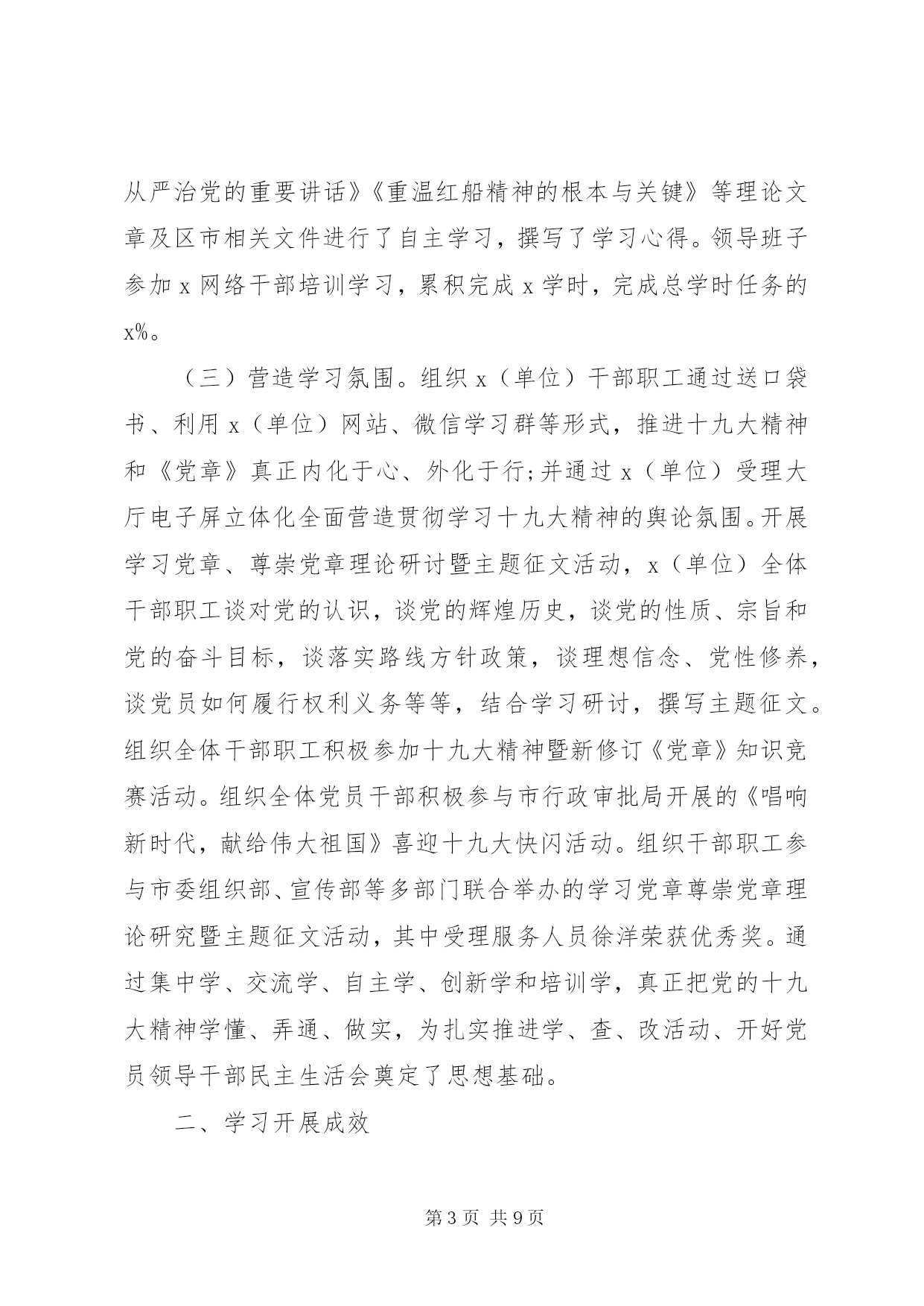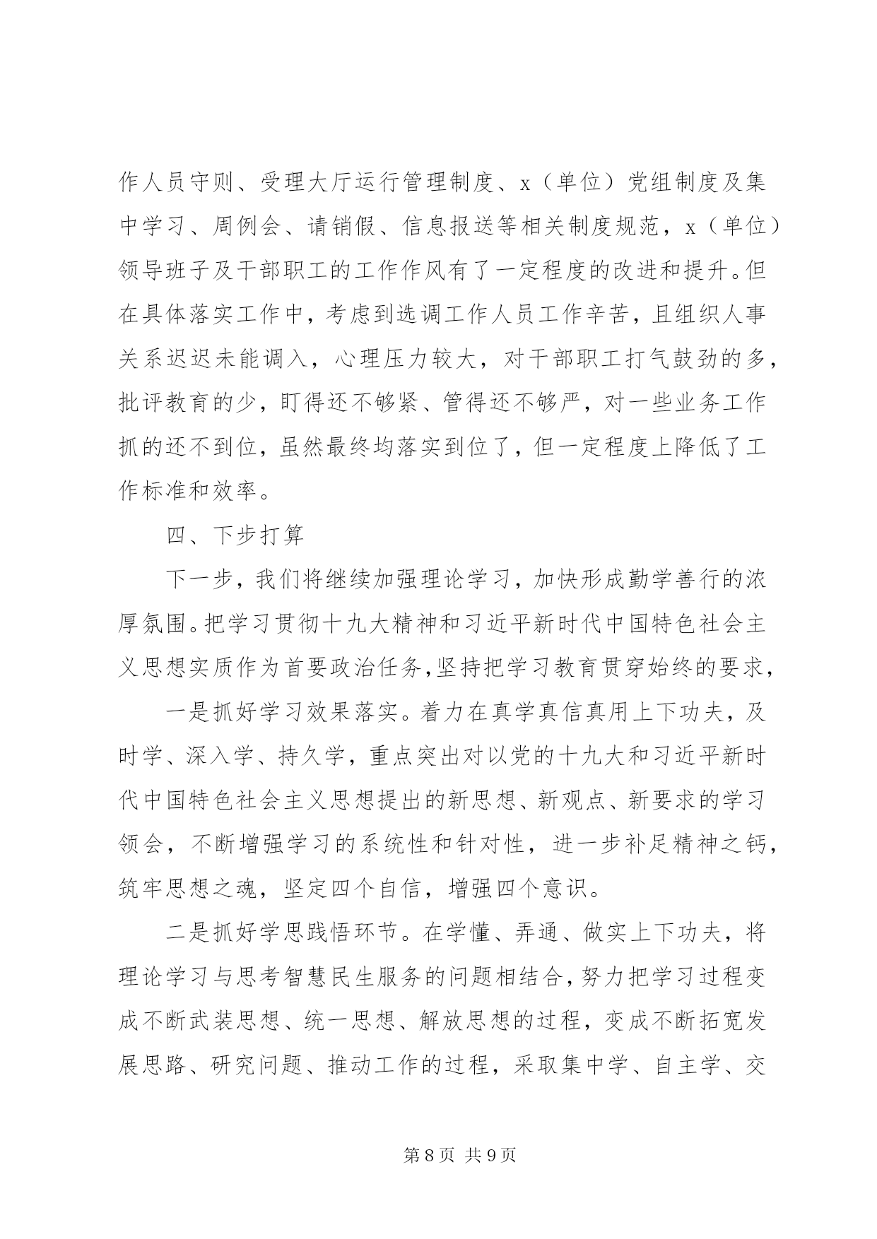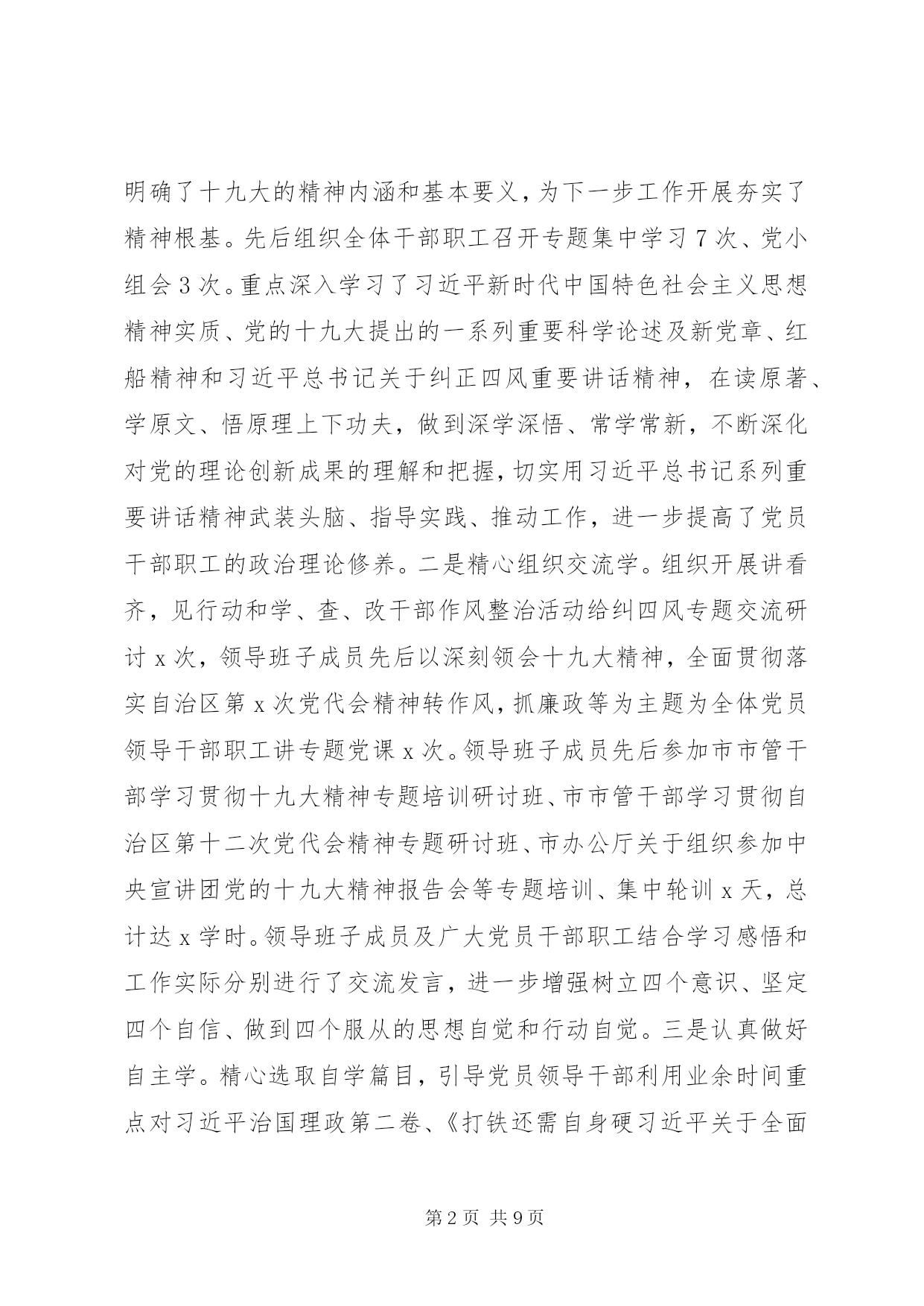 第PAGE\*Arabic\*MERGEFORMAT9页共NUMPAGES\*MERGEFORMAT9页【范文】关于开展理论学习的情况报告关于开展理论学习的情况报告按照市委组织部《关于开展学习贯彻习近平新时代中国特色社会主义思想和党的十九大精神培训工作自查的通知》文件要求,就市xx(单位)学习贯彻习近平新时代中国特色社会主义思想和党的十九大精神培训情况进行了梳理自查,现就学习贯彻相关情况报告如下:一、学习开展情况(一)精心筹划部署。中心党组始终把学习贯彻习近平新时代中国特色社会主义思想和党的十九大精神作为重要政治任务,按照市委的安排部署和市委办公厅《关于学习宣传贯彻党的十九大精神的通知》(x党办[2017]83号)文件精神,结合中心工作实际,制定印发了《xxxx(单位)学习宣传贯彻党的十九大精神计划安排》,中心党组结合学、查、改干部作风整治活动专题研究部署学习推进工作,统筹安排,精心组织,进一步明确任务分工和学习研讨各环节工作。形成了主要领导牵头抓、分管领导重点抓、党务专干具体抓、干部职工认真学的浓厚氛围。(二)深化学习教育。中心党组结合扎实开展学、查、改干部作风整治活动和2017年度领导班子及县处级领导干部民主生活会,全力抓好学习教育。一是扎实开展集中学。组织党员领导干部集中收看了《中国共产党第十九次全国代表大会》开幕式,明确了十九大的精神内涵和基本要义,为下一步工作开展夯实了精神根基。先后组织全体干部职工召开专题集中学习7次、党小组会3次。重点深入学习了习近平新时代中国特色社会主义思想精神实质、党的十九大提出的一系列重要科学论述及新党章、红船精神和习近平总书记关于纠正四风重要讲话精神,在读原著、学原文、悟原理上下功夫,做到深学深悟、常学常新,不断深化对党的理论创新成果的理解和把握,切实用习近平总书记系列重要讲话精神武装头脑、指导实践、推动工作,进一步提高了党员干部职工的政治理论修养。二是精心组织交流学。组织开展讲看齐,见行动和学、查、改干部作风整治活动给纠四风专题交流研讨x次,领导班子成员先后以深刻领会十九大精神,全面贯彻落实自治区第x次党代会精神转作风,抓廉政等为主题为全体党员领导干部职工讲专题党课x次。领导班子成员先后参加市市管干部学习贯彻十九大精神专题培训研讨班、市市管干部学习贯彻自治区第十二次党代会精神专题研讨班、市办公厅关于组织参加中央宣讲团党的十九大精神报告会等专题培训、集中轮训x天,总计达x学时。领导班子成员及广大党员干部职工结合学习感悟和工作实际分别进行了交流发言,进一步增强树立四个意识、坚定四个自信、做到四个服从的思想自觉和行动自觉。三是认真做好自主学。精心选取自学篇目,引导党员领导干部利用业余时间重点对习近平治国理政第二卷、《打铁还需自身硬习近平关于全面从严治党的重要讲话》《重温红船精神的根本与关键》等理论文章及区市相关文件进行了自主学习,撰写了学习心得。领导班子参加x网络干部培训学习,累积完成x学时,完成总学时任务的x%。(三)营造学习氛围。组织x(单位)干部职工通过送口袋书、利用x(单位)网站、微信学习群等形式,推进十九大精神和《党章》真正内化于心、外化于行;并通过x(单位)受理大厅电子屏立体化全面营造贯彻学习十九大精神的舆论氛围。开展学习党章、尊崇党章理论研讨暨主题征文活动,x(单位)全体干部职工谈对党的认识,谈党的辉煌历史,谈党的性质、宗旨和党的奋斗目标,谈落实路线方针政策,谈理想信念、党性修养,谈党员如何履行权利义务等等,结合学习研讨,撰写主题征文。组织全体干部职工积极参加十九大精神暨新修订《党章》知识竞赛活动。组织全体党员干部积极参与市行政审批局开展的《唱响新时代,献给伟大祖国》喜迎十九大快闪活动。组织干部职工参与市委组织部、宣传部等多部门联合举办的学习党章尊崇党章理论研究暨主题征文活动,其中受理服务人员徐洋荣获优秀奖。通过集中学、交流学、自主学、创新学和培训学,真正把党的十九大精神学懂、弄通、做实,为扎实推进学、查、改活动、开好党员领导干部民主生活会奠定了思想基础。二、学习开展成效自学习贯彻习近平新时代中国特色社会主义思想和党的十九大精神培训工作开展以来,x(单位)高度重视,采取有力措施,按照学习计划认真落实各阶段各环节工作,确保学习不流于形式、不走过场,切实提高了党员干部职工的学习积极性,干部队伍整体素质和作风建设取得了良好成效。一是勤思善学氛围逐步形成。依托贯彻学习十九大契机制定完善了党组中心组学习、集中学习、自主学习等学习制度,以中心组理论学习、交流研讨学、个人自学为抓手,真正将学习十九大精神融入即将开展的不忘初心、牢记使命主题教育活动和日常工作生活之中,持续强化理论武装,党员领导干部的党性修养、理论素质、政策水平进一步增强,四个自信、四个意识进一步树立。特