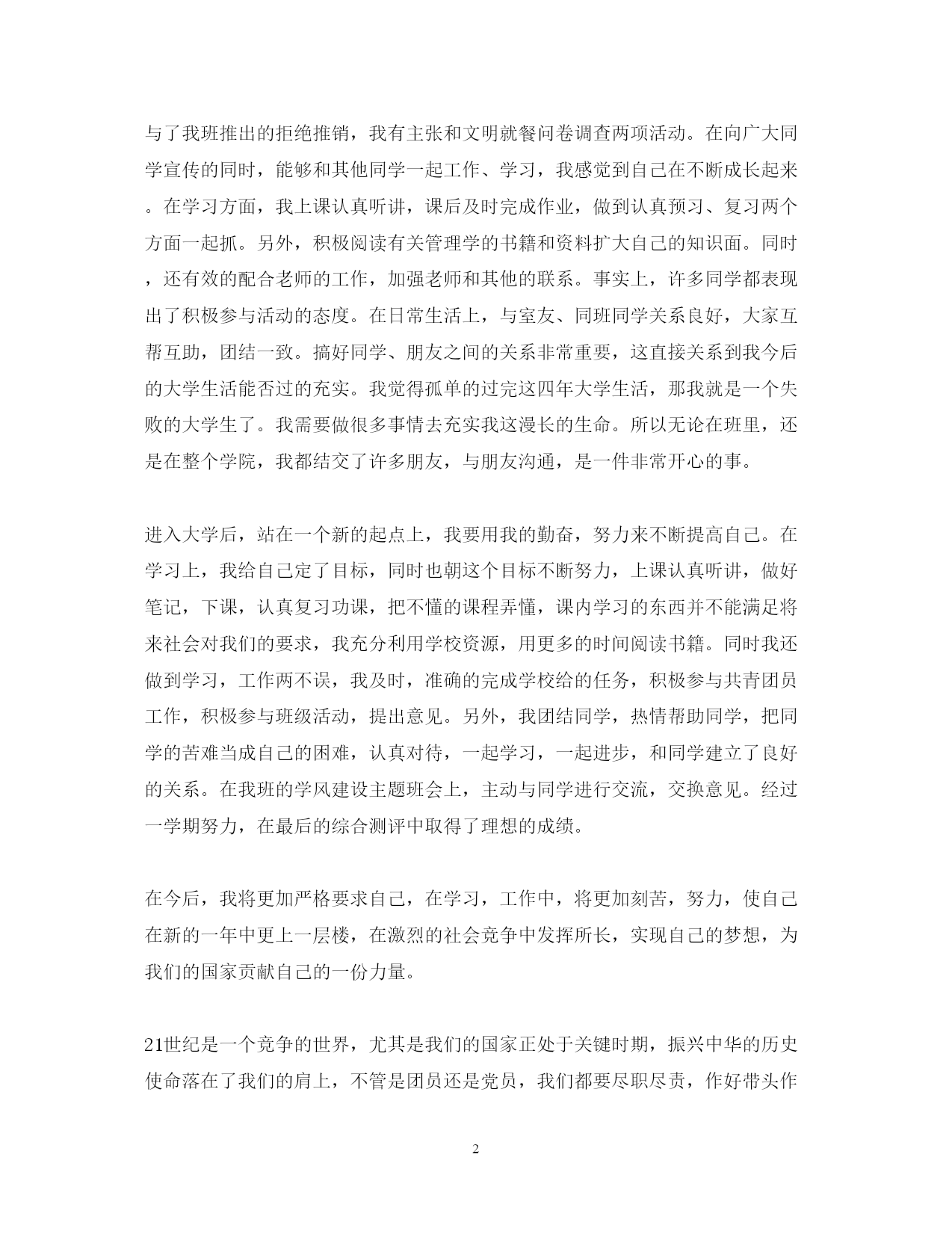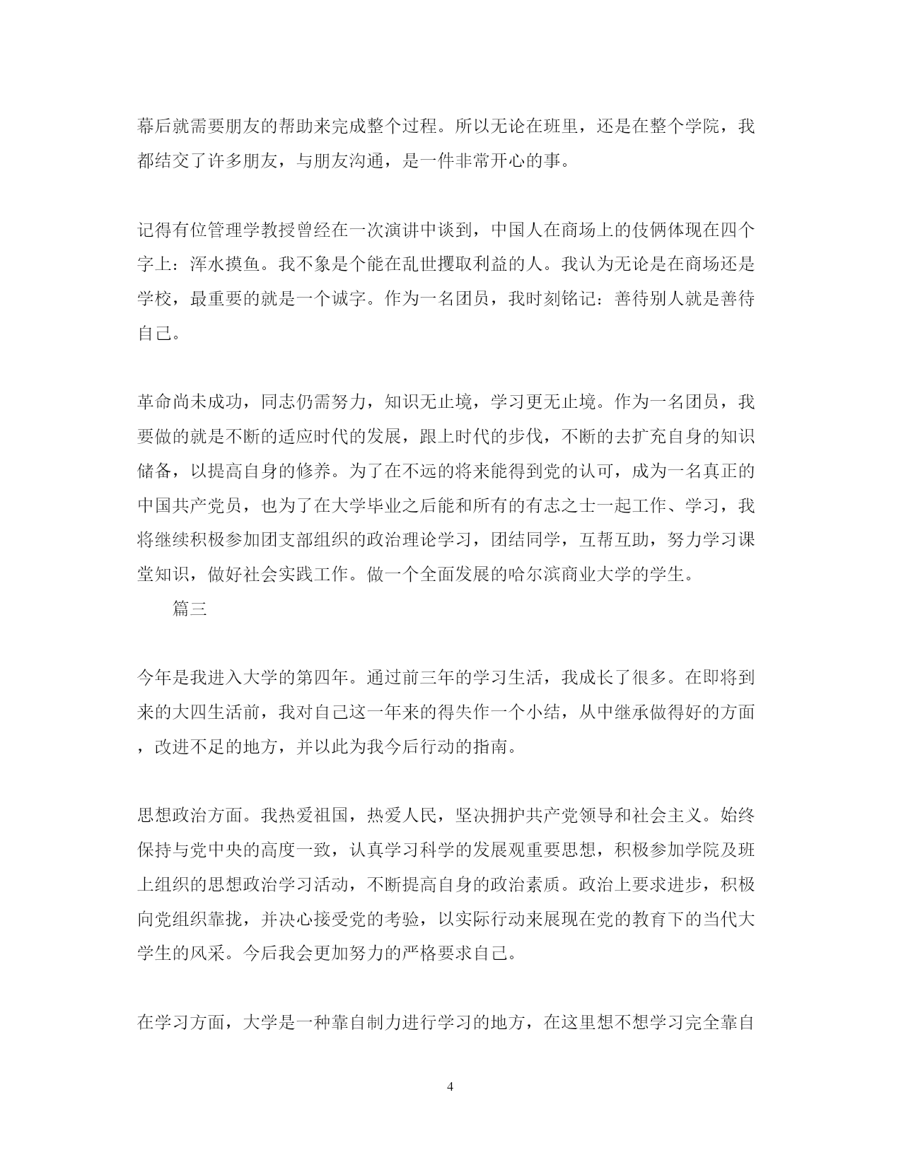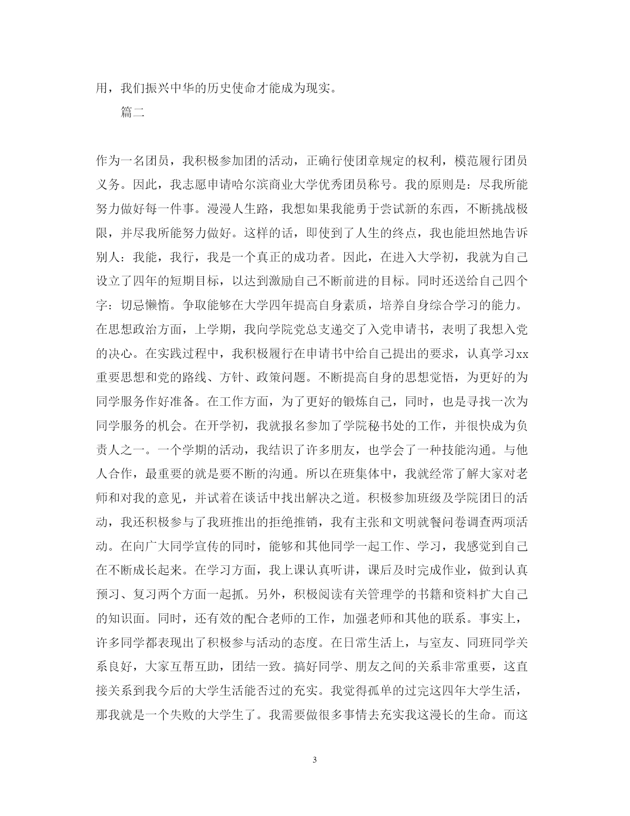 此资料由网络收集而来,如有侵权请告知上传者立即删除。资料共分享,我们负责传递知识。PAGEPAGE6在职团员自我鉴定范文大全篇一我是*级******专业的学生,我叫**,于***年入的团。我深深感受到团组织使我健康成长,使我认识正确的人生观,世界观。共青团作为共产党的后备主力军,有着不可替代的作用,我们作为共青团中的一名感觉无比的自豪,更主要的是我们应严格要求自己,并且学习上争高分,政治上要先进,活动中要积极。进入大学以来,我时刻铭记自己是一个光荣的共青团员,处处严格地要求自己。我积极参加团的活动,正确行使团章规定的权利,模范履行团员义务。因此,我志愿申请****大学优秀团员称号。我的原则是:尽我所能努力做好每一件事。漫漫人生路,我想如果我能勇于尝试新的东西,不断挑战极限,并尽我所能努力做好。这样的话,即使到了人生的终点,我也能坦然地告诉别人:我能,我行,我是一个真正的成功者。因此,在进入大学初,我就为自己设立了四年的短期目标,以达到激励自己不断前进的目标。同时还送给自己四个字:切忌懒惰。争取能够在大学四年提高自身素质,培养自身综合学习的能力。在思想政治方面,上学期,我向学院党总支递交了入党申请书,表明了我想入党的决心。在实践过程中,我积极履行在申请书中给自己提出的要求,认真学习三个代表重要思想和党的路线、方针、政策问题。不断提高自身的思想觉悟,为更好的为同学服务作好准备。在工作方面,为了更好的锻炼自己,同时,也是寻找一次为同学服务的机会。在开学初,我就报名参加了学院秘书处的工作,并很快成为负责人之一。一个学期的活动,我结识了许多朋友,也学会了一种技能沟通。与他人合作,最重要的就是要不断的沟通。所以在班集体中,我就经常了解大家对老师和对我的意见,并试着在谈话中找出解决之道。积极参加班级及学院团日的活动,我还积极参与了我班推出的拒绝推销,我有主张和文明就餐问卷调查两项活动。在向广大同学宣传的同时,能够和其他同学一起工作、学习,我感觉到自己在不断成长起来。在学习方面,我上课认真听讲,课后及时完成作业,做到认真预习、复习两个方面一起抓。另外,积极阅读有关管理学的书籍和资料扩大自己的知识面。同时,还有效的配合老师的工作,加强老师和其他的联系。事实上,许多同学都表现出了积极参与活动的态度。在日常生活上,与室友、同班同学关系良好,大家互帮互助,团结一致。搞好同学、朋友之间的关系非常重要,这直接关系到我今后的大学生活能否过的充实。我觉得孤单的过完这四年大学生活,那我就是一个失败的大学生了。我需要做很多事情去充实我这漫长的生命。所以无论在班里,还是在整个学院,我都结交了许多朋友,与朋友沟通,是一件非常开心的事。进入大学后,站在一个新的起点上,我要用我的勤奋,努力来不断提高自己。在学习上,我给自己定了目标,同时也朝这个目标不断努力,上课认真听讲,做好笔记,下课,认真复习功课,把不懂的课程弄懂,课内学习的东西并不能满足将来社会对我们的要求,我充分利用学校资源,用更多的时间阅读书籍。同时我还做到学习,工作两不误,我及时,准确的完成学校给的任务,积极参与共青团员工作,积极参与班级活动,提出意见。另外,我团结同学,热情帮助同学,把同学的苦难当成自己的困难,认真对待,一起学习,一起进步,和同学建立了良好的关系。在我班的学风建设主题班会上,主动与同学进行交流,交换意见。经过一学期努力,在最后的综合测评中取得了理想的成绩。在今后,我将更加严格要求自己,在学习,工作中,将更加刻苦,努力,使自己在新的一年中更上一层楼,在激烈的社会竞争中发挥所长,实现自己的梦想,为我们的国家贡献自己的一份力量。21世纪是一个竞争的世界,尤其是我们的国家正处于关键时期,振兴中华的历史使命落在了我们的肩上,不管是团员还是党员,我们都要尽职尽责,作好带头作用,我们振兴中华的历史使命才能成为现实。篇二作为一名团员,我积极参加团的活动,正确行使团章规定的权利,模范履行团员义务。因此,我志愿申请哈尔滨商业大学优秀团员称号。我的原则是:尽我所能努力做好每一件事。漫漫人生路,我想如果我能勇于尝试新的东西,不断挑战极限,并尽我所能努力做好。这样的话,即使到了人生的终点,我也能坦然地告诉别人:我能,我行,我是一个真正的成功者。因此,在进入大学初,我就为自己设立了四年的短期目标,以达到激励自己不断前进的目标。同时还送给自己四个字:切忌懒惰。争取能够在大学四年提高自身素质,培养自身综合学习的能力。在思想政治方面,上学期,我向学院党总支递交了入党申请书,表明了我想入党的决心。在实践过程中,我积极履行在申请书中给自己提出的要求,认真学习xx重要思想和党的路线、方针、政策问题。不断提高自身的思想觉悟,为更好的为同学服务作好准备。在工作方面,为了更好的锻炼自己,同时,也是