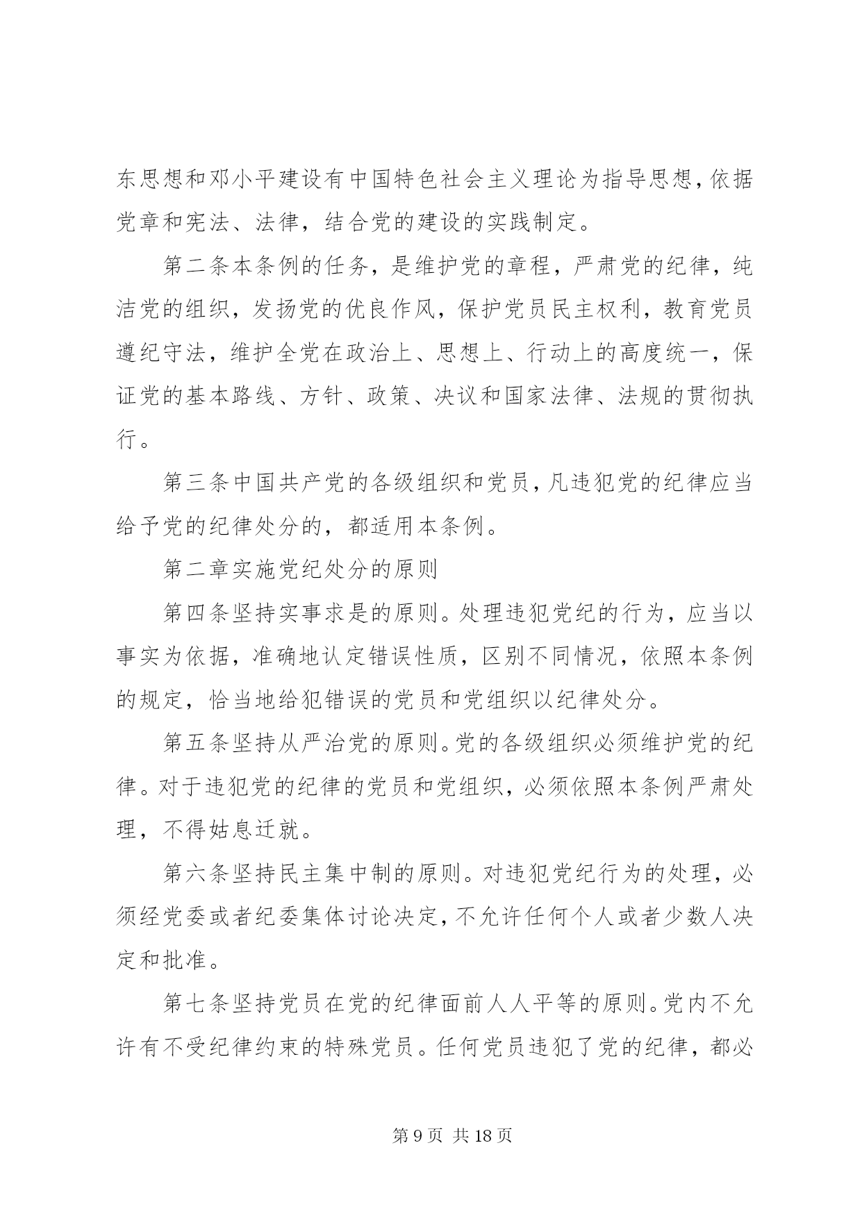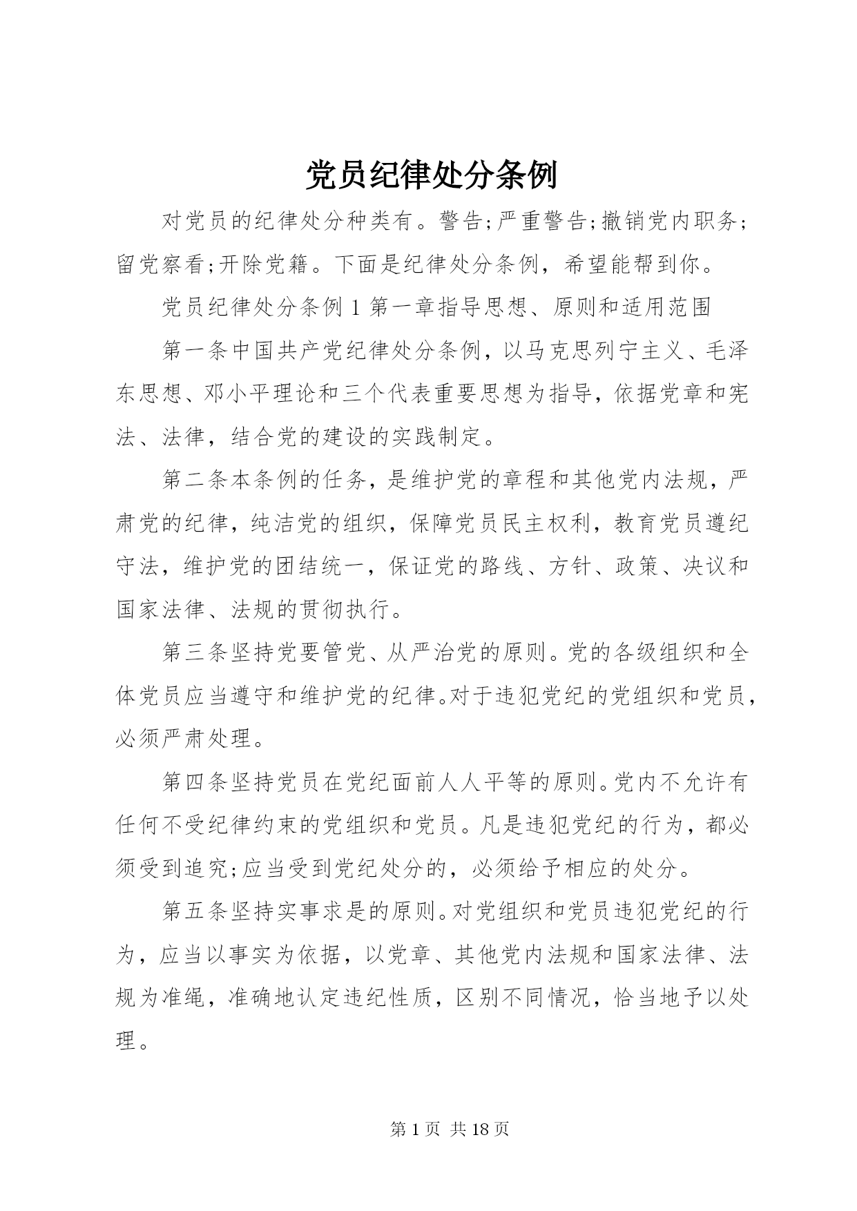 第PAGE\*Arabic\*MERGEFORMAT18页共NUMPAGES\*MERGEFORMAT18页党员纪律处分条例对党员的纪律处分种类有。警告;严重警告;撤销党内职务;留党察看;开除党籍。下面是纪律处分条例,希望能帮到你。党员纪律处分条例1第一章指导思想、原则和适用范围第一条中国共产党纪律处分条例,以马克思列宁主义、毛泽东思想、邓小平理论和三个代表重要思想为指导,依据党章和宪法、法律,结合党的建设的实践制定。第二条本条例的任务,是维护党的章程和其他党内法规,严肃党的纪律,纯洁党的组织,保障党员民主权利,教育党员遵纪守法,维护党的团结统一,保证党的路线、方针、政策、决议和国家法律、法规的贯彻执行。第三条坚持党要管党、从严治党的原则。党的各级组织和全体党员应当遵守和维护党的纪律。对于违犯党纪的党组织和党员,必须严肃处理。第四条坚持党员在党纪面前人人平等的原则。党内不允许有任何不受纪律约束的党组织和党员。凡是违犯党纪的行为,都必须受到追究;应当受到党纪处分的,必须给予相应的处分。第五条坚持实事求是的原则。对党组织和党员违犯党纪的行为,应当以事实为依据,以党章、其他党内法规和国家法律、法规为准绳,准确地认定违纪性质,区别不同情况,恰当地予以处理。第六条坚持民主集中制的原则。实施党纪处分,应当按照规定程序经党组织集体讨论决定,不允许任何个人或者少数人决定和批准。上级党组织对违犯党纪的党组织和党员作出的处理决定,下级党组织必须执行。第七条坚持惩前毖后、治病救人的原则。处理违犯党纪的党组织和党员,应当实行惩戒与教育相结合,做到宽严相济。第八条本条例适用于违犯党纪应当受到党纪追究的党组织和党员。第二章违纪与纪律处分第九条党的纪律是党的各级组织和全体党员必须遵守的行为规则。党组织和党员违反党章和其他党内法规,违反国家法律、法规,违反党和国家政策、社会主义道德,危害党、国家和人民利益的行为,依照规定应当给予党纪处分的,都必须受到追究。第十条对党员的纪律处分种类:(一)警告;(二)严重警告;(三)撤销党内职务;(四)留党察看;(五)开除党籍。第十一条对严重违犯党纪的党组织的纪律处理措施:(一)改组;(二)解散。第十二条党员受到警告或者严重警告处分,一年内不得在党内提升职务和向党外组织推荐担任高于其原任职务的党外职务。第十三条撤销党内职务处分,是指撤销受处分党员由党内选举或者组织任命的党内各种职务。对于在党内担任两个以上职务的,党组织在作处分决定时,应当明确是撤销其一切职务还是某个职务。如果决定撤销其某个职务,则必须从其担任的最高职务开始依次撤销。对于在党外组织担任职务的,应当建议党外组织依照规定作相应处理。对于应当受到撤销党内职务处分,但是本人没有担任党内职务的,应当给予其严重警告处分。其中,在党外组织担任职务的,应当建议党外组织撤销其党外职务。党员受到撤销党内职务处分,二年内不得在党内担任和向党外组织推荐担任与其原任职务相当或者高于其原任职务的职务。第十四条留党察看处分,分为留党察看一年、留党察看二年。对于受到留党察看处分一年的党员,期满后仍不符合恢复党员权利条件的,再延长一年留党察看期限。留党察看期限最长不得超过二年。党员受留党察看处分期间,没有表决权、选举权和被选举权。留党察看期间,确有悔改表现的,期满后恢复其党员权利;坚持不改或者又发现其他应受党纪处分的违纪行为的,应当开除党籍。党员受到留党察看处分,其党内职务自然撤销。对于担任党外职务的,应当建议党外组织撤销其党外职务。受到留党察看处分的党员,恢复党员权利后二年内,不得在党内担任和向党外组织推荐担任与其原任职务相当或者高于其原任职务的职务。第十五条党员受到开除党籍处分,五年内不得重新入党。另有规定不准重新入党的,依照规定。第十六条对于严重违犯党纪、本身又不能纠正的党组织领导机构,应当予以改组。受到改组处理的党组织领导机构成员,除应当受到撤销党内职务以上(含撤销党内职务)处分的外,均自然免职。第十七条对于全体或者多数党员严重违犯党纪的党组织,应当予以解散。对于受到解散处理的党组织中的党员,应当逐个审查。其中,符合党员条件的,应当重新登记,并参加新的组织过党的生活;不符合党员条件的,宣布除名;有违纪行为的,依照规定予以追究。第三章纪律处分运用规则第十八条故意违纪受处分后又因故意违纪应当受到党纪处分的,应当从重处分。第十九条从轻、从重处分,是指在本条例分则中规定的违纪行为应当受到的处分幅度以内,给予较轻或者较重的处分。第二十条减轻、加重处分,是指在本条例分则中规定的违纪行为应当受到的处分幅度以外,减轻或者加重一档给予处分。本条例规定的只有开除党籍处分一个档次的违纪行为,不适用前款减轻处分的规则。第二十一条有下列情形之一的,可以依照规定从轻或者减轻处分:(一)主