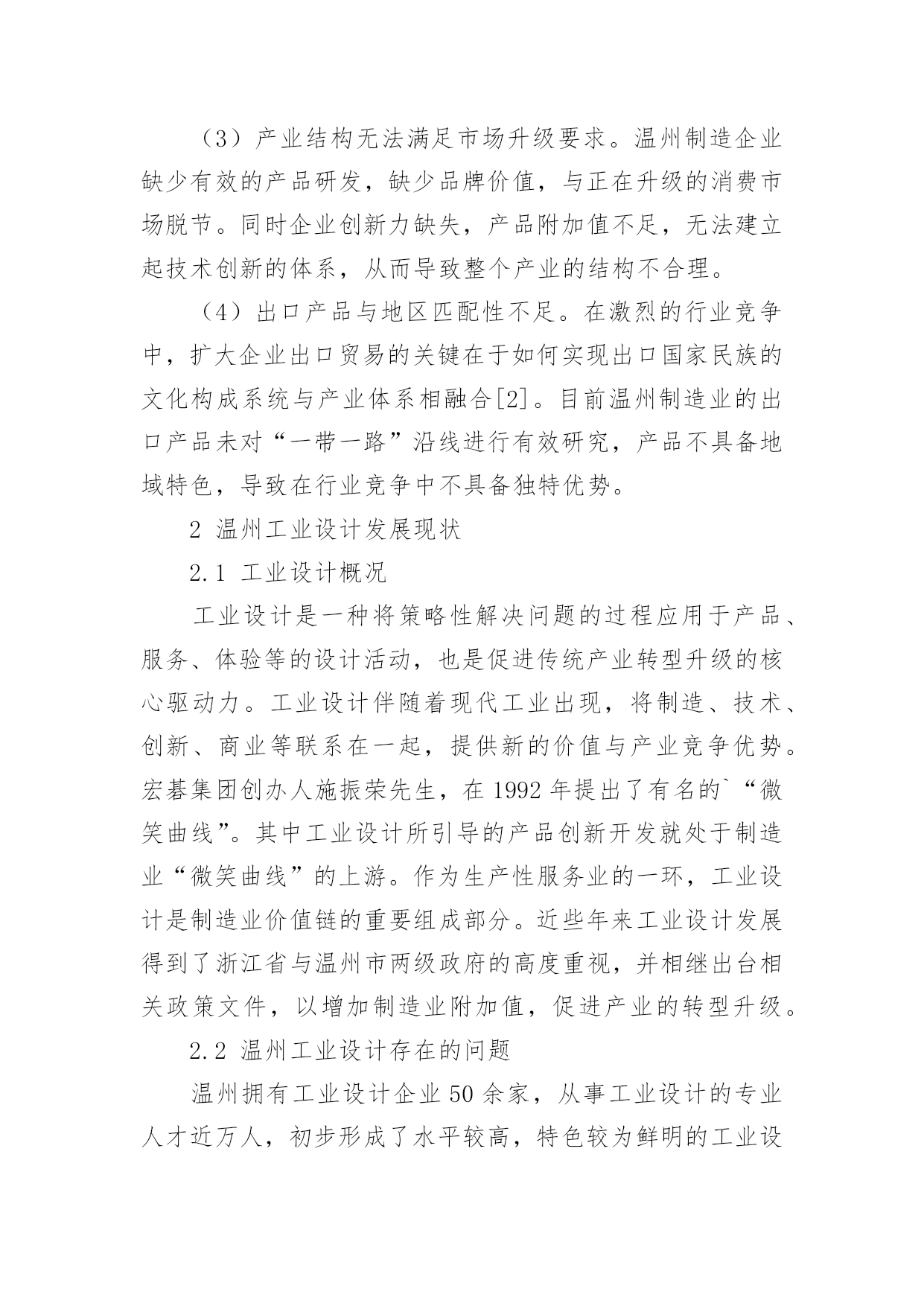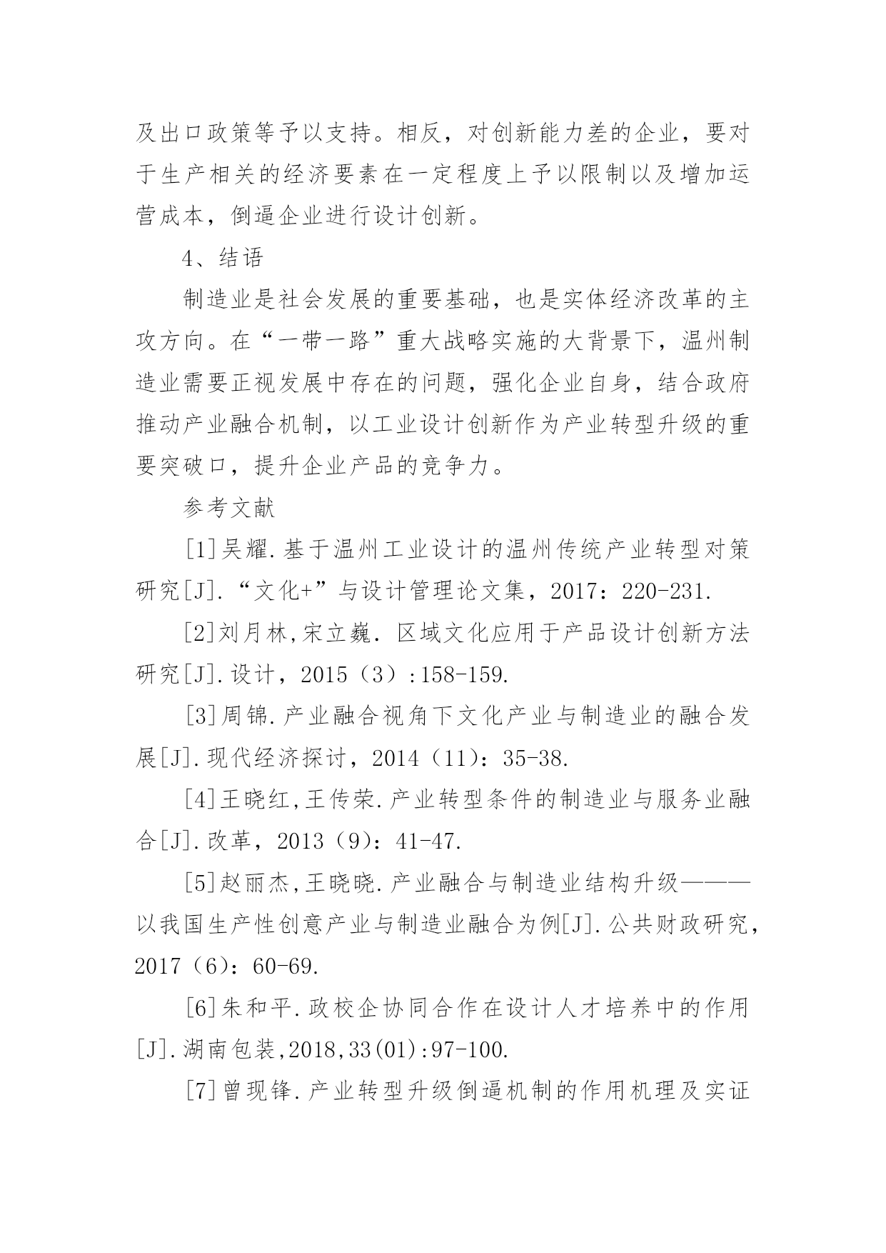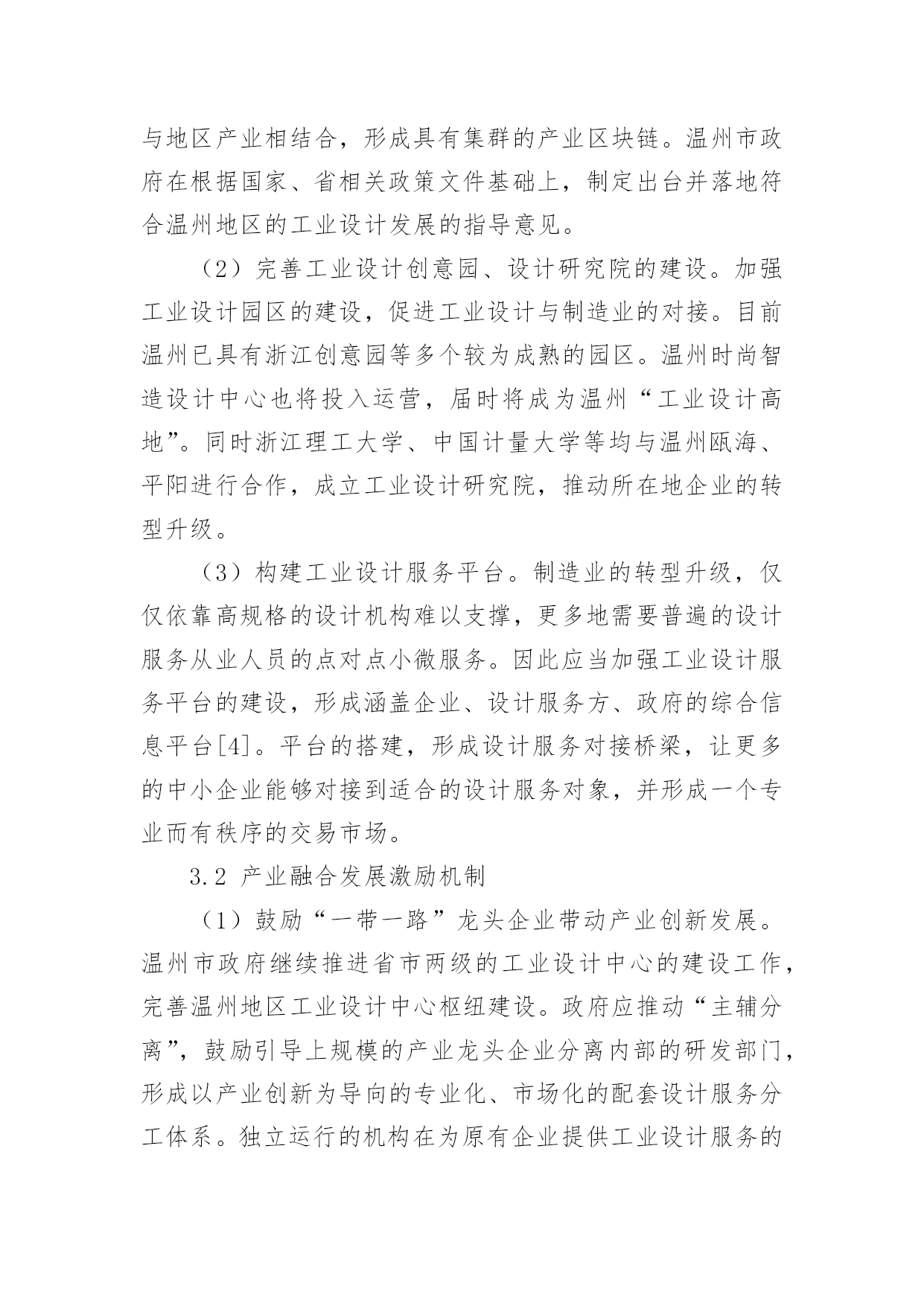 温州制造业转型与工业设计融合发展论文摘要:研究了在我国经济发展重大战略规划"一带一路"背景下,温州制造业与工业设计发展的现状,分析了制造业存在的机遇与面临的问题。以工业设计为产业发展核心,从产业融合角度出发,通过政策机制、激励机制、保障机制、倒逼机制4个方面为温州制造业与工业设计融合发展提出了对策。关键词:一带一路;工业设计;制造业;融合发展“一带一路”是我国经济发展的重要战略,制造业作为我国经济发展的重要部分,是战略实施的重要产业集群。温州作为浙江省铁三角的重要组成部分,以及“一带一路”海上丝绸之路的重要节点城市,应力求在战略实施的大背景下,提升制造业的创新能力,推动产业的转型升级。工业设计作为新型的服务性领域,是优化制造业产业结构、突进企业转型升级的有效手段。温州制造业与工业设计的融合发展,更有利于温州企业在“一带一路”的重大战略下转变发展方式,重振产业发展。1、温州制造业概况1.1“一带一路”战略与制造业随着经济全球化和区域经济一体化进程加快,全球经济、贸易、金融等格局正在发生深刻变革。经过40年的改革开放,中国已经成为世界上最大的制造业国家。在此背景下,中国通过“一带一路”发展战略的实施,有利于沿线国家与地区的经贸合作、地区产业升级与优化,为中国制造业提供了一个全所未有的发展新契机。随着战略的不断深化与推进,包括温州在内的各级政府抓住机遇,将地区产业与“一带一路”战略充分结合,力求推进地区制造业企业产品走出去,突破发展的瓶颈。2017年中国与沿线国家的经贸金额达到7.4亿元,同比增长17.8%,高于全国的对外贸易增速。温州作为“一带一路”的重要节点,2017年进一步扩大与沿线国家与地区的经贸往来,对“一带一路”沿线国家出口420.2亿元,增长13.2%。1.2温州制造业现状与挑战温州经过30多年的发展,形成了服装、鞋革、泵阀、低压电器、眼镜等具有竞争力的轻工业体系,并对应形成了区域经济区块,成为温州制造业重要的产业基础[1]。但过去的10多年,以传统的中小企业为代表的温州制造业没能及时转型,温州制造业存在严峻挑战,主要存在的问题有:(1)多数企业处于产业价值链的低端。温州制造业缺乏有效的核心技术,长期处于产业链低端,低价与代工成为大部分企业的生存之道。温州产业链的不足,导致了整个产业竞争力逐步减弱,更加难以向中高端产业链布局,形成恶性循环。(2)制造业成本上涨,利润降低。随着原材料价格不断上扬,人力劳动成本增加等因素,导致成本不断攀升,温州制造业低价优势也逐步丧失。以低端代加工为主的大多数温州制造企业在激烈的市场竞争中受到了严重冲击。(3)产业结构无法满足市场升级要求。温州制造企业缺少有效的产品研发,缺少品牌价值,与正在升级的消费市场脱节。同时企业创新力缺失,产品附加值不足,无法建立起技术创新的体系,从而导致整个产业的结构不合理。(4)出口产品与地区匹配性不足。在激烈的行业竞争中,扩大企业出口贸易的关键在于如何实现出口国家民族的文化构成系统与产业体系相融合[2]。目前温州制造业的出口产品未对“一带一路”沿线进行有效研究,产品不具备地域特色,导致在行业竞争中不具备独特优势。2温州工业设计发展现状2.1工业设计概况工业设计是一种将策略性解决问题的过程应用于产品、服务、体验等的设计活动,也是促进传统产业转型升级的核心驱动力。工业设计伴随着现代工业出现,将制造、技术、创新、商业等联系在一起,提供新的价值与产业竞争优势。宏碁集团创办人施振荣先生,在1992年提出了有名的`“微笑曲线”。其中工业设计所引导的产品创新开发就处于制造业“微笑曲线”的上游。作为生产性服务业的一环,工业设计是制造业价值链的重要组成部分。近些年来工业设计发展得到了浙江省与温州市两级政府的高度重视,并相继出台相关政策文件,以增加制造业附加值,促进产业的转型升级。2.2温州工业设计存在的问题温州拥有工业设计企业50余家,从事工业设计的专业人才近万人,初步形成了水平较高,特色较为鲜明的工业设计服务产业。然而相比省内杭州、宁波,作为铁三角的温州在工业设计领域与杭甬差距巨大,甚至有被其他地级市超越的可能。温州工业设计存在的问题为:(1)工业设计产业容量不足。温州工业设计虽有了长足的发展,但现有的设计服务容量还不足以满足温州制造业转型的需求。温州虽已建设诸多制造类特色小镇,但在产品研发与创新设计方面还缺口较大,需加快温州工业设计与制造业的有机融合。(2)校企合作不足。温州轻工制造业领域广泛,而目前只有鞋靴等少数产业与在温高校有密切的联系,其他诸如教玩具、汽摩配、宠物用具等制造业均没有形成相关校企联动机制,产业虽有发展,但内在的创新驱动力不足。(3)工业设计渠道不通畅。工业设计园区建设相对滞后,设计服务平台还未搭建,导致设计服务与制造业无法有效对接