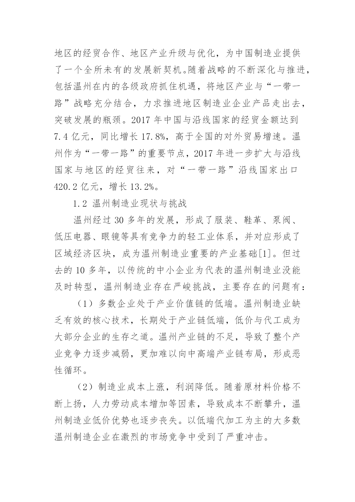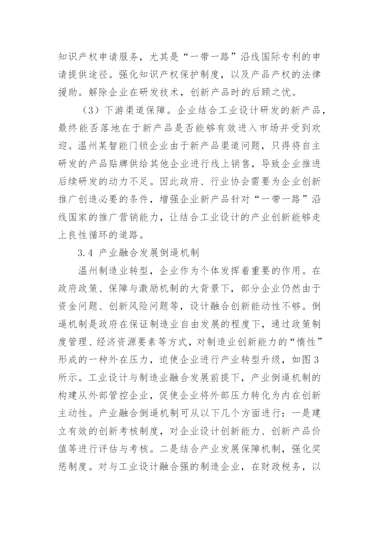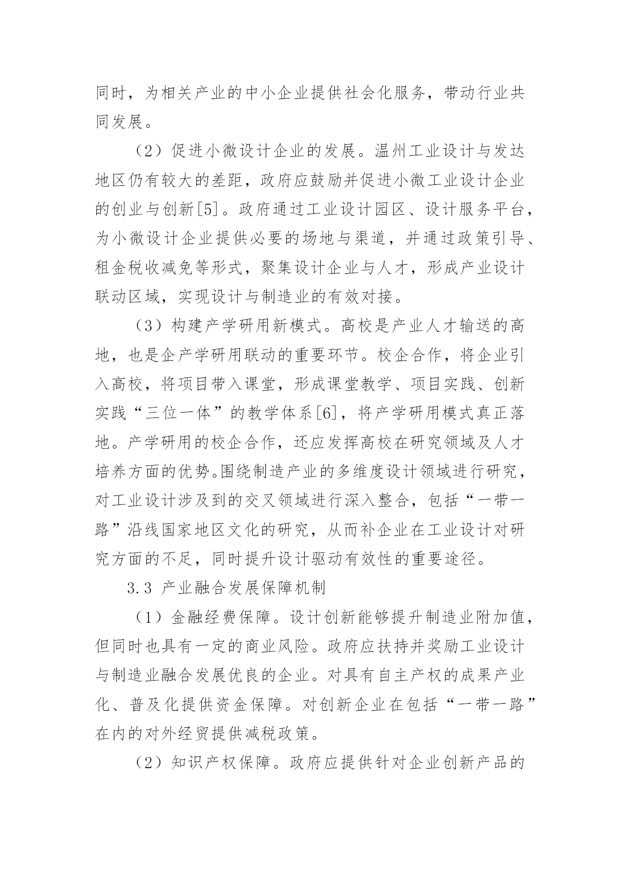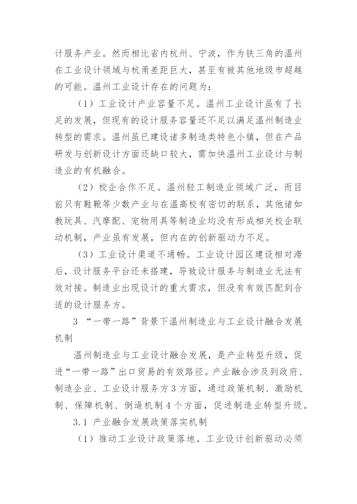 温州制造业转型与工业设计融合发展论文摘要:研究了在我国经济发展重大战略规划"一带一路"背景下,温州制造业与工业设计发展的现状,分析了制造业存在的机遇与面临的问题。以工业设计为产业发展核心,从产业融合角度出发,通过政策机制、激励机制、保障机制、倒逼机制4个方面为温州制造业与工业设计融合发展提出了对策。关键词:一带一路;工业设计;制造业;融合发展“一带一路”是我国经济发展的重要战略,制造业作为我国经济发展的重要部分,是战略实施的重要产业集群。温州作为浙江省铁三角的重要组成部分,以及“一带一路”海上丝绸之路的重要节点城市,应力求在战略实施的大背景下,提升制造业的创新能力,推动产业的转型升级。工业设计作为新型的服务性领域,是优化制造业产业结构、突进企业转型升级的有效手段。温州制造业与工业设计的融合发展,更有利于温州企业在“一带一路”的重大战略下转变发展方式,重振产业发展。1、温州制造业概况1.1“一带一路”战略与制造业随着经济全球化和区域经济一体化进程加快,全球经济、贸易、金融等格局正在发生深刻变革。经过40年的改革开放,中国已经成为世界上最大的制造业国家。在此背景下,中国通过“一带一路”发展战略的实施,有利于沿线国家与地区的经贸合作、地区产业升级与优化,为中国制造业提供了一个全所未有的发展新契机。随着战略的不断深化与推进,包括温州在内的各级政府抓住机遇,将地区产业与“一带一路”战略充分结合,力求推进地区制造业企业产品走出去,突破发展的瓶颈。2017年中国与沿线国家的经贸金额达到7.4亿元,同比增长17.8%,高于全国的对外贸易增速。温州作为“一带一路”的重要节点,2017年进一步扩大与沿线国家与地区的经贸往来,对“一带一路”沿线国家出口420.2亿元,增长13.2%。1.2温州制造业现状与挑战温州经过30多年的发展,形成了服装、鞋革、泵阀、低压电器、眼镜等具有竞争力的轻工业体系,并对应形成了区域经济区块,成为温州制造业重要的产业基础[1]。但过去的10多年,以传统的中小企业为代表的温州制造业没能及时转型,温州制造业存在严峻挑战,主要存在的问题有:(1)多数企业处于产业价值链的低端。温州制造业缺乏有效的核心技术,长期处于产业链低端,低价与代工成为大部分企业的生存之道。温州产业链的不足,导致了整个产业竞争力逐步减弱,更加难以向中高端产业链布局,形成恶性循环。(2)制造业成本上涨,利润降低。随着原材料价格不断上扬,人力劳动成本增加等因素,导致成本不断攀升,温州制造业低价优势也逐步丧失。以低端代加工为主的大多数温州制造企业在激烈的市场竞争中受到了严重冲击。(3)产业结构无法满足市场升级要求。温州制造企业缺少有效的产品研发,缺少品牌价值,与正在升级的消费市场脱节。同时企业创新力缺失,产品附加值不足,无法建立起技术创新的体系,从而导致整个产业的结构不合理。(4)出口产品与地区匹配性不足。在激烈的行业竞争中,扩大企业出口贸易的关键在于如何实现出口国家民族的文化构成系统与产业体系相融合[2]。目前温州制造业的出口产品未对“一带一路”沿线进行有效研究,产品不具备地域特色,导致在行业竞争中不具备独特优势。2温州工业设计发展现状2.1工业设计概况工业设计是一种将策略性解决问题的过程应用于产品、服务、体验等的设计活动,也是促进传统产业转型升级的核心驱动力。工业设计伴随着现代工业出现,将制造、技术、创新、商业等联系在一起,提供新的价值与产业竞争优势。宏碁集团创办人施振荣先生,在1992年提出了有名的`“微笑曲线”。其中工业设计所引导的产品创新开发就处于制造业“微笑曲线”的上游。作为生产性服务业的一环,工业设计是制造业价值链的重要组成部分。近些年来工业设计发展得到了浙江省与温州市两级政府的高度重视,并相继出台相关政策文件,以增加制造业附加值,促进产业的转型升级。2.2温州工业设计存在的问题温州拥有工业设计企业50余家,从事工业设计的专业人才近万人,初步形成了水平较高,特色较为鲜明的工业设计服务产业。然而相比省内杭州、宁波,作为铁三角的温州在工业设计领域与杭甬差距巨大,甚至有被其他地级市超越的可能。温州工业设计存在的问题为:(1)工业设计产业容量不足。温州工业设计虽有了长足的发展,但现有的设计服务容量还不足以满足温州制造业转型的需求。温州虽已建设诸多制造类特色小镇,但在产品研发与创新设计方面还缺口较大,需加快温州工业设计与制造业的有机融合。(2)校企合作不足。温州轻工制造业领域广泛,而目前只有鞋靴等少数产业与在温高校有密切的联系,其他诸如教玩具、汽摩配、宠物用具等制造业均没有形成相关校企联动机制,产业虽有发展,但内在的创新驱动力不足。(3)工业设计渠道不通畅。工业设计园区建设相对滞后,设计服务平台还未搭建,导致设计服务与制造业无法有效对接