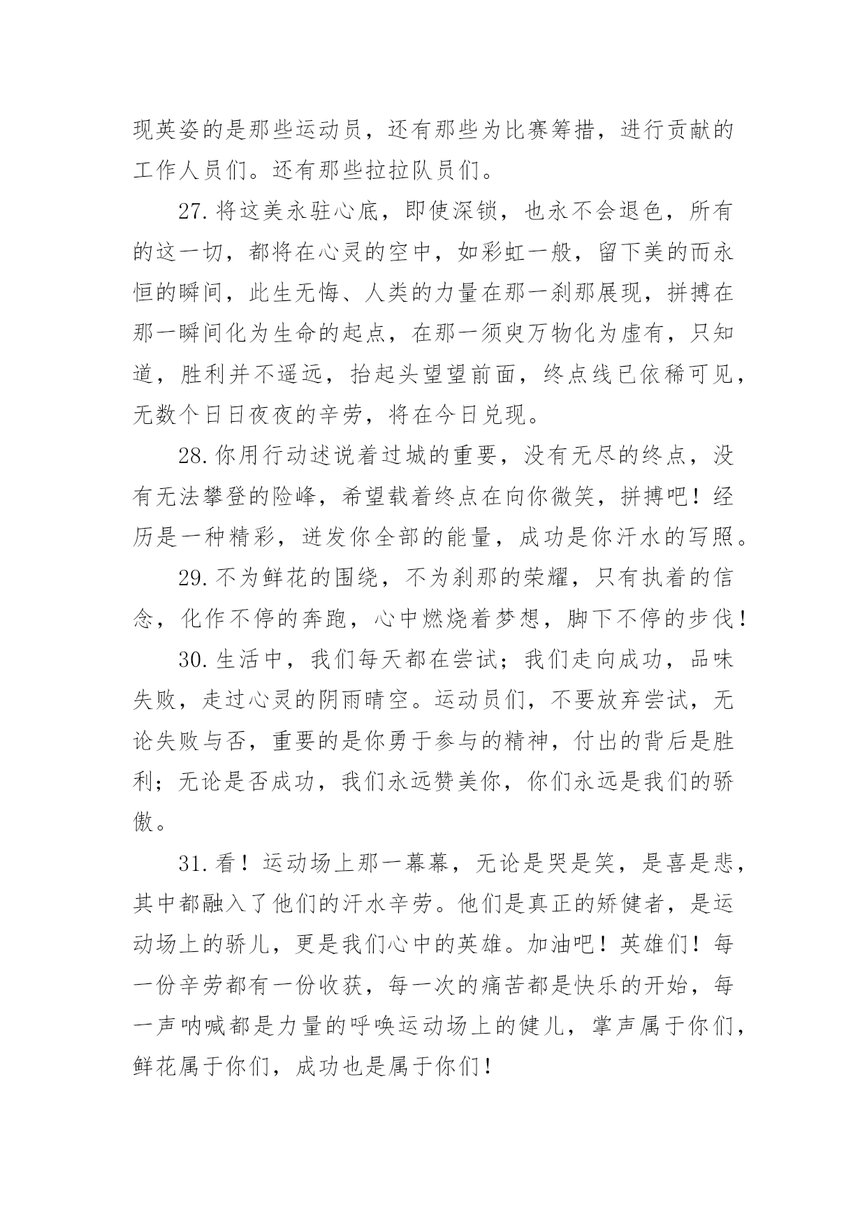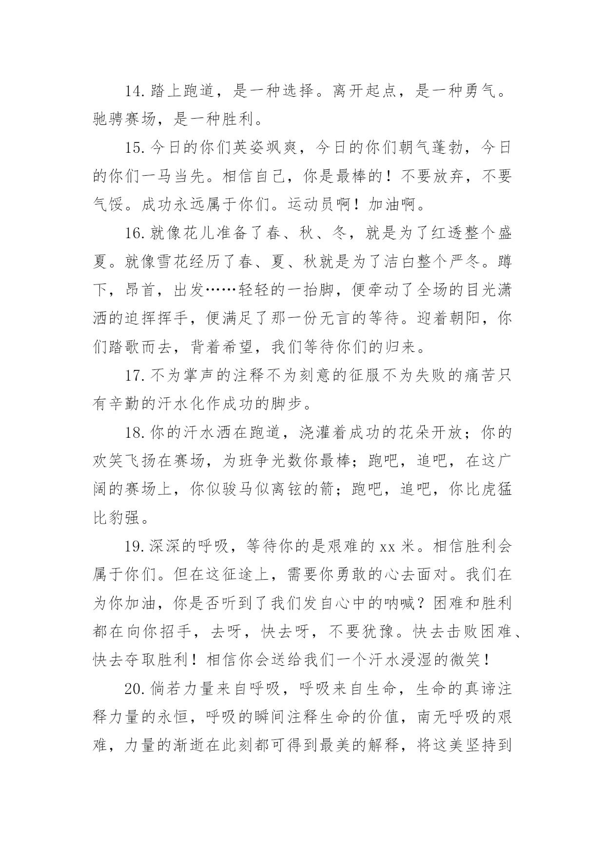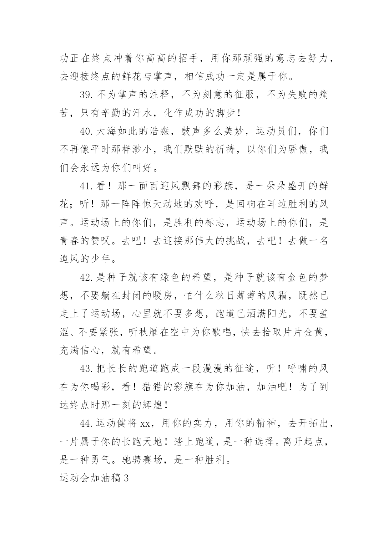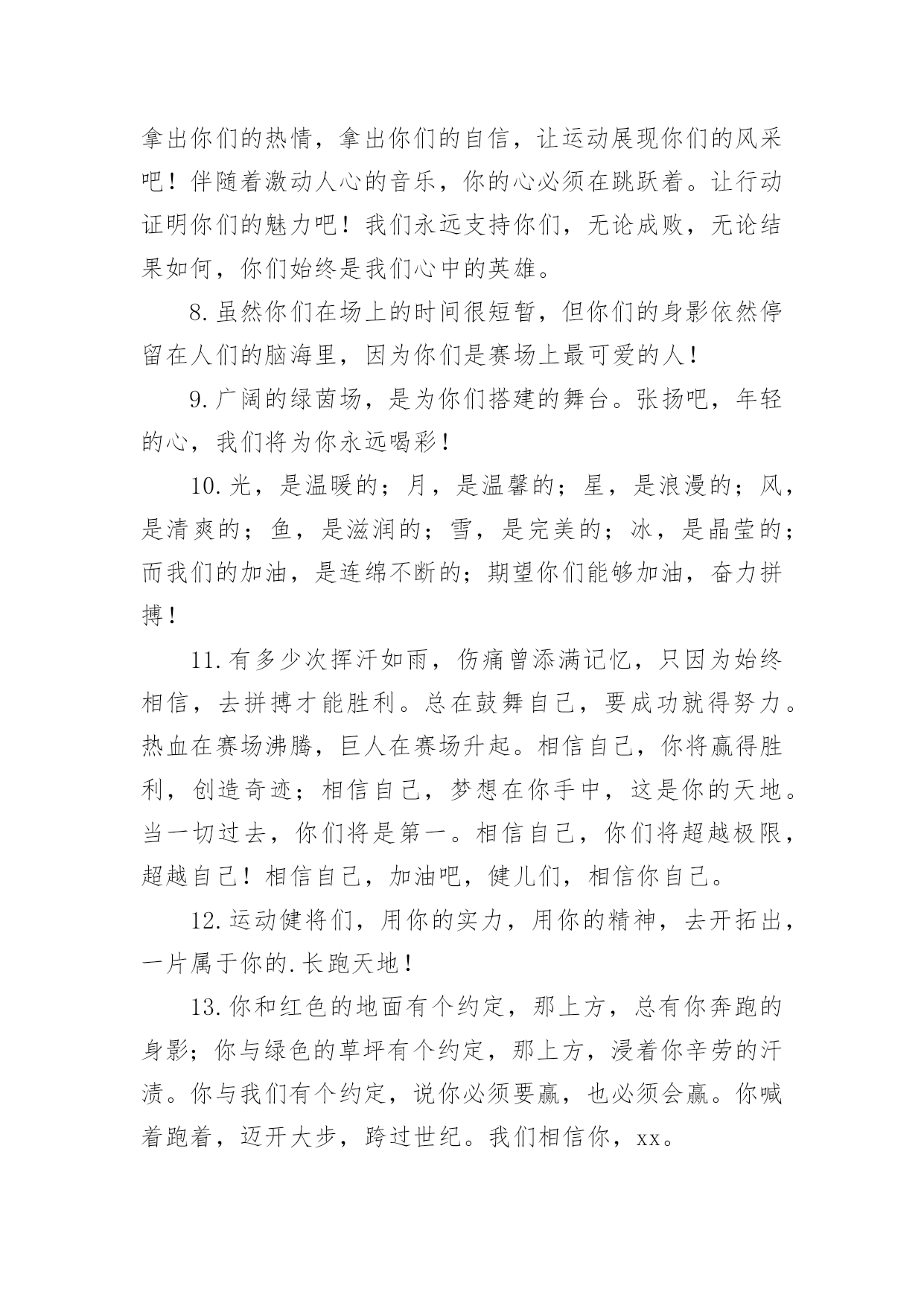 运动会加油稿(必备)运动会加油稿15篇在现在的社会生活中,我们越来越需要加油稿,加油稿是用于给别人加油鼓气,提升别人气势的文稿。怎样写加油稿才能更好地发挥其做用呢?以下是小编精心整理的运动会加油稿,希望能够帮助到大家。运动会加油稿1虽然胳膊酥了,腿也软了,手也绵了,力气没了,但你们仍然握着哑铃似的跳绳在那里一如既往,坚持不懈地跳着,即使落后,也顽强不屈,努力拼搏,永不退缩!加油吧,跳绳运动健儿们,抓住手中的绳子,就是抓住了胜利,握住手中的绳子,就是把握了人生。让这激动人心的时刻,一直回荡在我们心中!跳吧,尽情地跳吧,拼命地跳吧,在这广阔的赛场上,你们似骏马似离弦的.箭,你们比虎猛比豹强,跳出你们的个性,跳出你们的精彩,跳出你们的和谐,跳出属于你们的辉煌人生吧。运动会加油稿21.年轻的我们不言失败,没有风浪,就不能显示帆的本色;没有曲折,就无法品味人生的乐趣。固然我们没得第一,但至少我们付出过努力过拼搏过。人生又能有几次搏呢?2.你赢得十分精彩,无需掩饰你的微笑,流露在你脸上。但我相信,你心中十分明白,征途刚刚开始,漫漫长路刚刚开头。加油啊,朋友,只有不断的拼搏,才能够不断战胜自己,战胜一切!向前向前向前!。xx米跑道虽不长,运动健儿志高扬。磨拳擦掌跃欲试,分秒必争勇夺魁。巾帼岂将须眉让。古有木兰冲杀场,今有跑xx米。立志创新校记录,勇夺信管第一金。3.不为鲜花的围绕,不为刹那的荣耀,只有执着的信念,化作不停的奔跑,心中燃烧着梦想,脚下不停的步伐。4.看,终点就在眼前,听,同学为你呼喊。鼓起勇气奋力向前,用你的荣誉带给我们希望。5.踏着秋天的气息,迈着轻盈的脚步,我们迎来了心仪已久的运动会。那里就是展示自我的舞台。来吧,尽情释放你的活力。你的每一次冲刺,都叩动着我们的心弦;你的每一次跨越,都吸引着我们的视线;你的每一次起跳,都绷紧我们的神经。我们为你呐喊,我们为你自豪,我们为你疯狂。加油,xx班的你们永远是最棒的的!6.也许流星并不少见,但它燃烧的刹那,留给人间最美丽的回忆!也许笑脸并不少见,但胜利的喜悦,总会留给世界精彩的一瞬!是的,那些曾经美妙的东西只有短短的一瞬间,但那却把最辉煌的一刻留给了人间。胜利,是每个人所追求的,胜利的喜悦,是胜利与重新开始的转折,胜利是新的开始!7.青春在飞扬,个性在张扬,运动场上的运动健儿们,拿出你们的热情,拿出你们的自信,让运动展现你们的风采吧!伴随着激动人心的音乐,你的心必须在跳跃着。让行动证明你们的魅力吧!我们永远支持你们,无论成败,无论结果如何,你们始终是我们心中的英雄。8.虽然你们在场上的时间很短暂,但你们的身影依然停留在人们的脑海里,因为你们是赛场上最可爱的人!9.广阔的绿茵场,是为你们搭建的舞台。张扬吧,年轻的心,我们将为你永远喝彩!10.光,是温暖的;月,是温馨的;星,是浪漫的;风,是清爽的;鱼,是滋润的;雪,是完美的;冰,是晶莹的;而我们的加油,是连绵不断的;期望你们能够加油,奋力拼搏!11.有多少次挥汗如雨,伤痛曾添满记忆,只因为始终相信,去拼搏才能胜利。总在鼓舞自己,要成功就得努力。热血在赛场沸腾,巨人在赛场升起。相信自己,你将赢得胜利,创造奇迹;相信自己,梦想在你手中,这是你的天地。当一切过去,你们将是第一。相信自己,你们将超越极限,超越自己!相信自己,加油吧,健儿们,相信你自己。12.运动健将们,用你的实力,用你的精神,去开拓出,一片属于你的.长跑天地!13.你和红色的地面有个约定,那上方,总有你奔跑的身影;你与绿色的草坪有个约定,那上方,浸着你辛劳的汗渍。你与我们有个约定,说你必须要赢,也必须会赢。你喊着跑着,迈开大步,跨过世纪。我们相信你,xx。14.踏上跑道,是一种选择。离开起点,是一种勇气。驰骋赛场,是一种胜利。15.今日的你们英姿飒爽,今日的你们朝气蓬勃,今日的你们一马当先。相信自己,你是最棒的!不要放弃,不要气馁。成功永远属于你们。运动员啊!加油啊。16.就像花儿准备了春、秋、冬,就是为了红透整个盛夏。就像雪花经历了春、夏、秋就是为了洁白整个严冬。蹲下,昂首,出发……轻轻的一抬脚,便牵动了全场的目光潇洒的迫挥挥手,便满足了那一份无言的等待。迎着朝阳,你们踏歌而去,背着希望,我们等待你们的归来。17.不为掌声的注释不为刻意的征服不为失败的痛苦只有辛勤的汗水化作成功的脚步。18.你的汗水洒在跑道,浇灌着成功的花朵开放;你的欢笑飞扬在赛场,为班争光数你最棒;跑吧,追吧,在这广阔的赛场上,你似骏马似离铉的箭;跑吧,追吧,你比虎猛比豹强。19.深深的呼吸,等待你的是艰难的xx米。相信胜利会属于你们。但在这征途上,需要你勇敢的心去面对。我们在为你加油,你是否听到了我们发自心中的呐喊?困难和胜利都在向你招手,去呀,快去呀,不要犹豫。快去击败困难、快去夺取胜利!相信你会