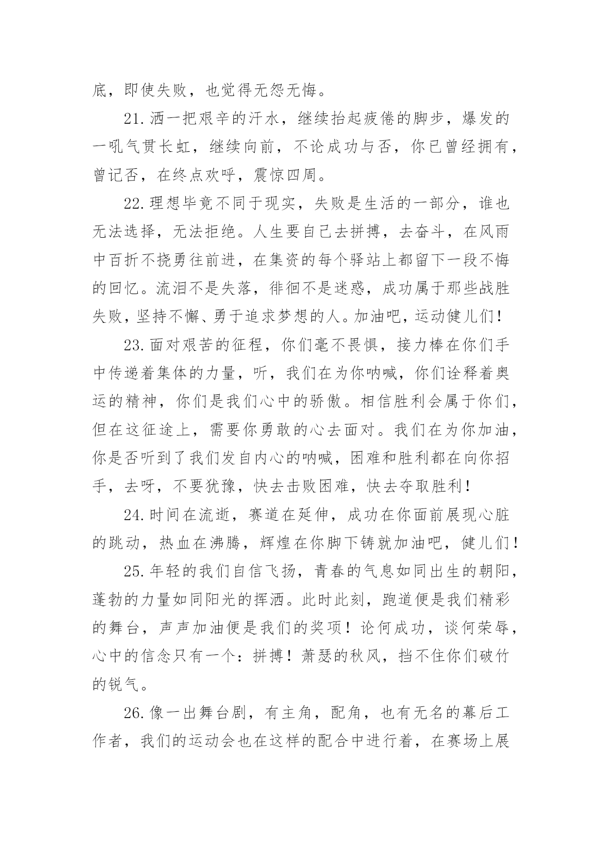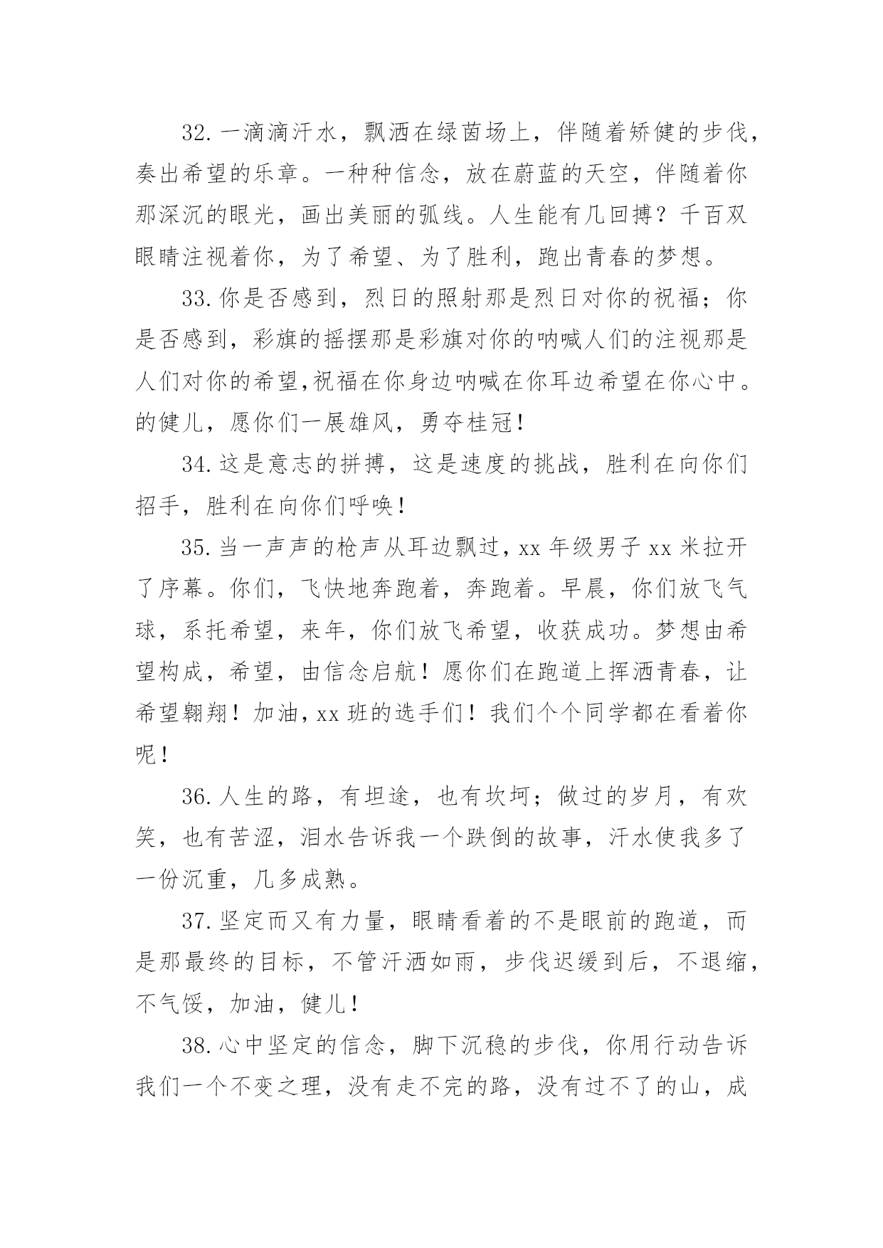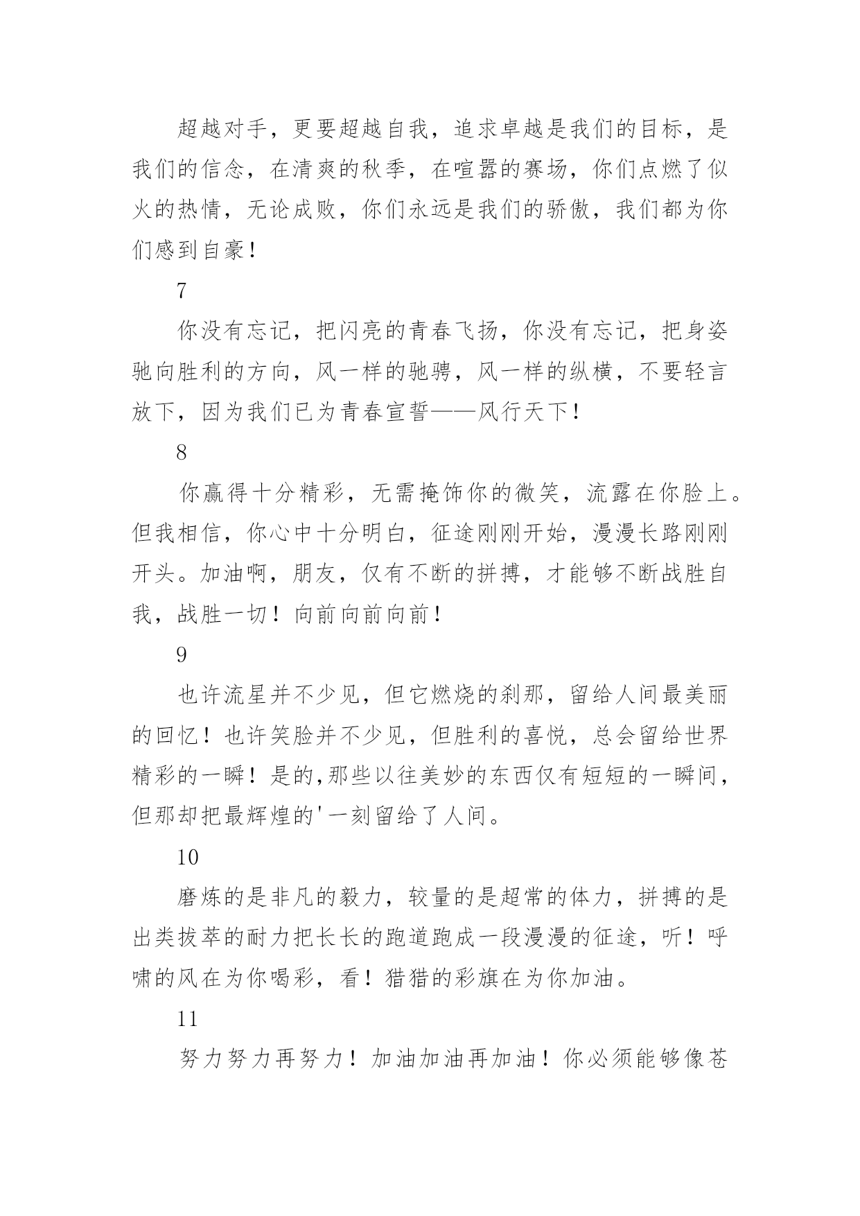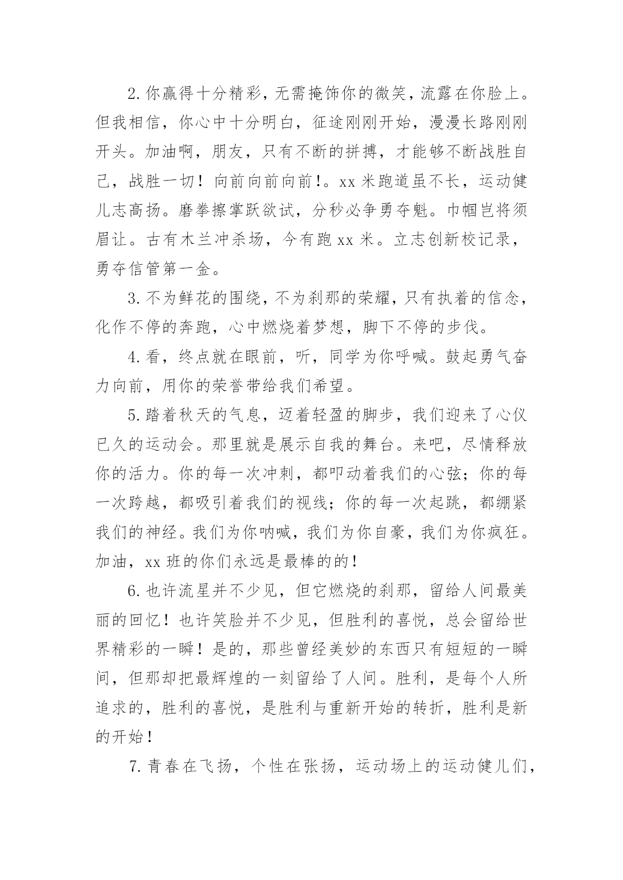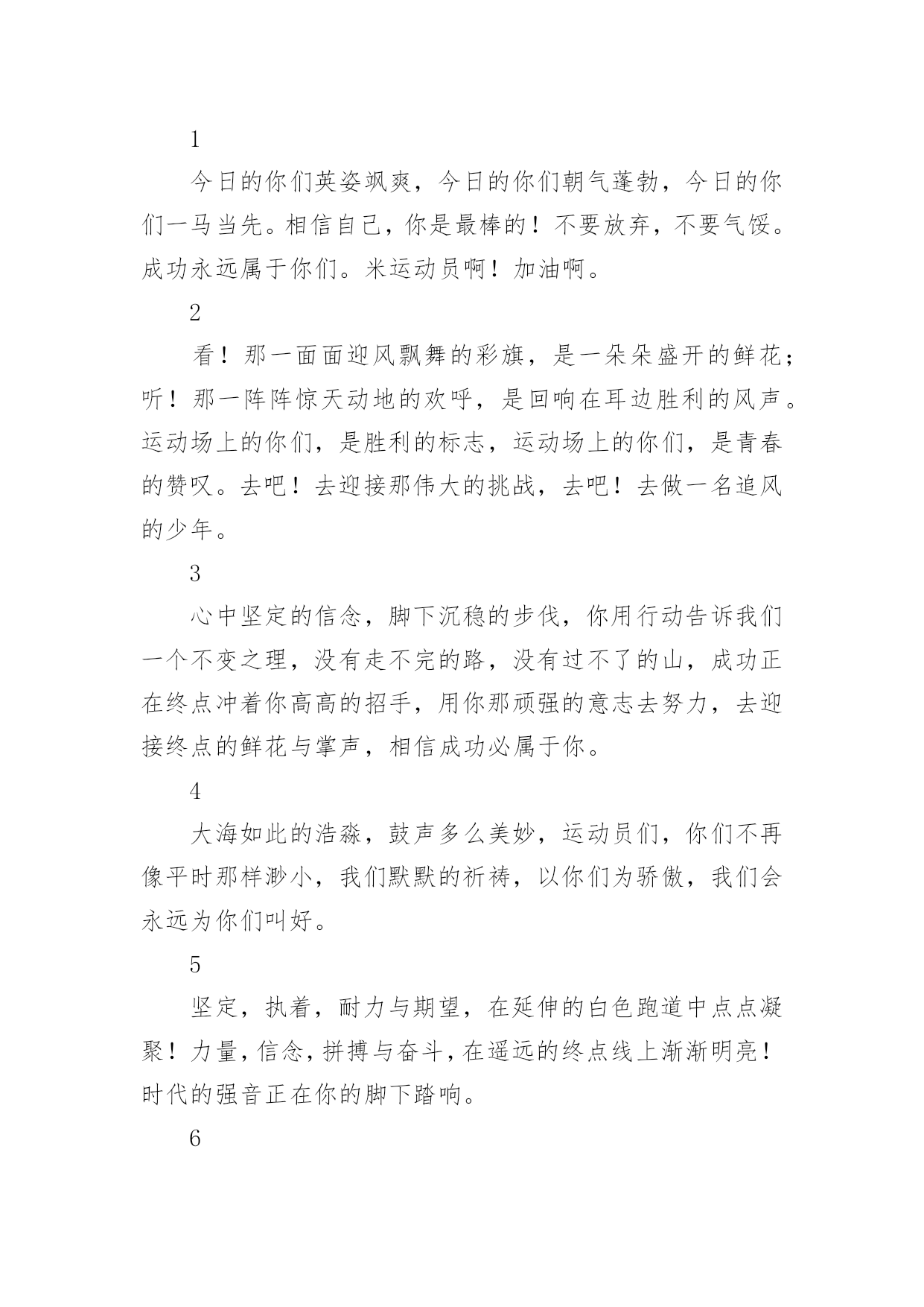 运动会加油稿(必备)运动会加油稿15篇在现在的社会生活中,我们越来越需要加油稿,加油稿是用于给别人加油鼓气,提升别人气势的文稿。怎样写加油稿才能更好地发挥其做用呢?以下是小编精心整理的运动会加油稿,希望能够帮助到大家。运动会加油稿1虽然胳膊酥了,腿也软了,手也绵了,力气没了,但你们仍然握着哑铃似的跳绳在那里一如既往,坚持不懈地跳着,即使落后,也顽强不屈,努力拼搏,永不退缩!加油吧,跳绳运动健儿们,抓住手中的绳子,就是抓住了胜利,握住手中的绳子,就是把握了人生。让这激动人心的时刻,一直回荡在我们心中!跳吧,尽情地跳吧,拼命地跳吧,在这广阔的赛场上,你们似骏马似离弦的.箭,你们比虎猛比豹强,跳出你们的个性,跳出你们的精彩,跳出你们的和谐,跳出属于你们的辉煌人生吧。运动会加油稿21.年轻的我们不言失败,没有风浪,就不能显示帆的本色;没有曲折,就无法品味人生的乐趣。固然我们没得第一,但至少我们付出过努力过拼搏过。人生又能有几次搏呢?2.你赢得十分精彩,无需掩饰你的微笑,流露在你脸上。但我相信,你心中十分明白,征途刚刚开始,漫漫长路刚刚开头。加油啊,朋友,只有不断的拼搏,才能够不断战胜自己,战胜一切!向前向前向前!。xx米跑道虽不长,运动健儿志高扬。磨拳擦掌跃欲试,分秒必争勇夺魁。巾帼岂将须眉让。古有木兰冲杀场,今有跑xx米。立志创新校记录,勇夺信管第一金。3.不为鲜花的围绕,不为刹那的荣耀,只有执着的信念,化作不停的奔跑,心中燃烧着梦想,脚下不停的步伐。4.看,终点就在眼前,听,同学为你呼喊。鼓起勇气奋力向前,用你的荣誉带给我们希望。5.踏着秋天的气息,迈着轻盈的脚步,我们迎来了心仪已久的运动会。那里就是展示自我的舞台。来吧,尽情释放你的活力。你的每一次冲刺,都叩动着我们的心弦;你的每一次跨越,都吸引着我们的视线;你的每一次起跳,都绷紧我们的神经。我们为你呐喊,我们为你自豪,我们为你疯狂。加油,xx班的你们永远是最棒的的!6.也许流星并不少见,但它燃烧的刹那,留给人间最美丽的回忆!也许笑脸并不少见,但胜利的喜悦,总会留给世界精彩的一瞬!是的,那些曾经美妙的东西只有短短的一瞬间,但那却把最辉煌的一刻留给了人间。胜利,是每个人所追求的,胜利的喜悦,是胜利与重新开始的转折,胜利是新的开始!7.青春在飞扬,个性在张扬,运动场上的运动健儿们,拿出你们的热情,拿出你们的自信,让运动展现你们的风采吧!伴随着激动人心的音乐,你的心必须在跳跃着。让行动证明你们的魅力吧!我们永远支持你们,无论成败,无论结果如何,你们始终是我们心中的英雄。8.虽然你们在场上的时间很短暂,但你们的身影依然停留在人们的脑海里,因为你们是赛场上最可爱的人!9.广阔的绿茵场,是为你们搭建的舞台。张扬吧,年轻的心,我们将为你永远喝彩!10.光,是温暖的;月,是温馨的;星,是浪漫的;风,是清爽的;鱼,是滋润的;雪,是完美的;冰,是晶莹的;而我们的加油,是连绵不断的;期望你们能够加油,奋力拼搏!11.有多少次挥汗如雨,伤痛曾添满记忆,只因为始终相信,去拼搏才能胜利。总在鼓舞自己,要成功就得努力。热血在赛场沸腾,巨人在赛场升起。相信自己,你将赢得胜利,创造奇迹;相信自己,梦想在你手中,这是你的天地。当一切过去,你们将是第一。相信自己,你们将超越极限,超越自己!相信自己,加油吧,健儿们,相信你自己。12.运动健将们,用你的实力,用你的精神,去开拓出,一片属于你的.长跑天地!13.你和红色的地面有个约定,那上方,总有你奔跑的身影;你与绿色的草坪有个约定,那上方,浸着你辛劳的汗渍。你与我们有个约定,说你必须要赢,也必须会赢。你喊着跑着,迈开大步,跨过世纪。我们相信你,xx。14.踏上跑道,是一种选择。离开起点,是一种勇气。驰骋赛场,是一种胜利。15.今日的你们英姿飒爽,今日的你们朝气蓬勃,今日的你们一马当先。相信自己,你是最棒的!不要放弃,不要气馁。成功永远属于你们。运动员啊!加油啊。16.就像花儿准备了春、秋、冬,就是为了红透整个盛夏。就像雪花经历了春、夏、秋就是为了洁白整个严冬。蹲下,昂首,出发……轻轻的一抬脚,便牵动了全场的目光潇洒的迫挥挥手,便满足了那一份无言的等待。迎着朝阳,你们踏歌而去,背着希望,我们等待你们的归来。17.不为掌声的注释不为刻意的征服不为失败的痛苦只有辛勤的汗水化作成功的脚步。18.你的汗水洒在跑道,浇灌着成功的花朵开放;你的欢笑飞扬在赛场,为班争光数你最棒;跑吧,追吧,在这广阔的赛场上,你似骏马似离铉的箭;跑吧,追吧,你比虎猛比豹强。19.深深的呼吸,等待你的是艰难的xx米。相信胜利会属于你们。但在这征途上,需要你勇敢的心去面对。我们在为你加油,你是否听到了我们发自心中的呐喊?困难和胜利都在向你招手,去呀,快去呀,不要犹豫。快去击败困难、快去夺取胜利!相信你会