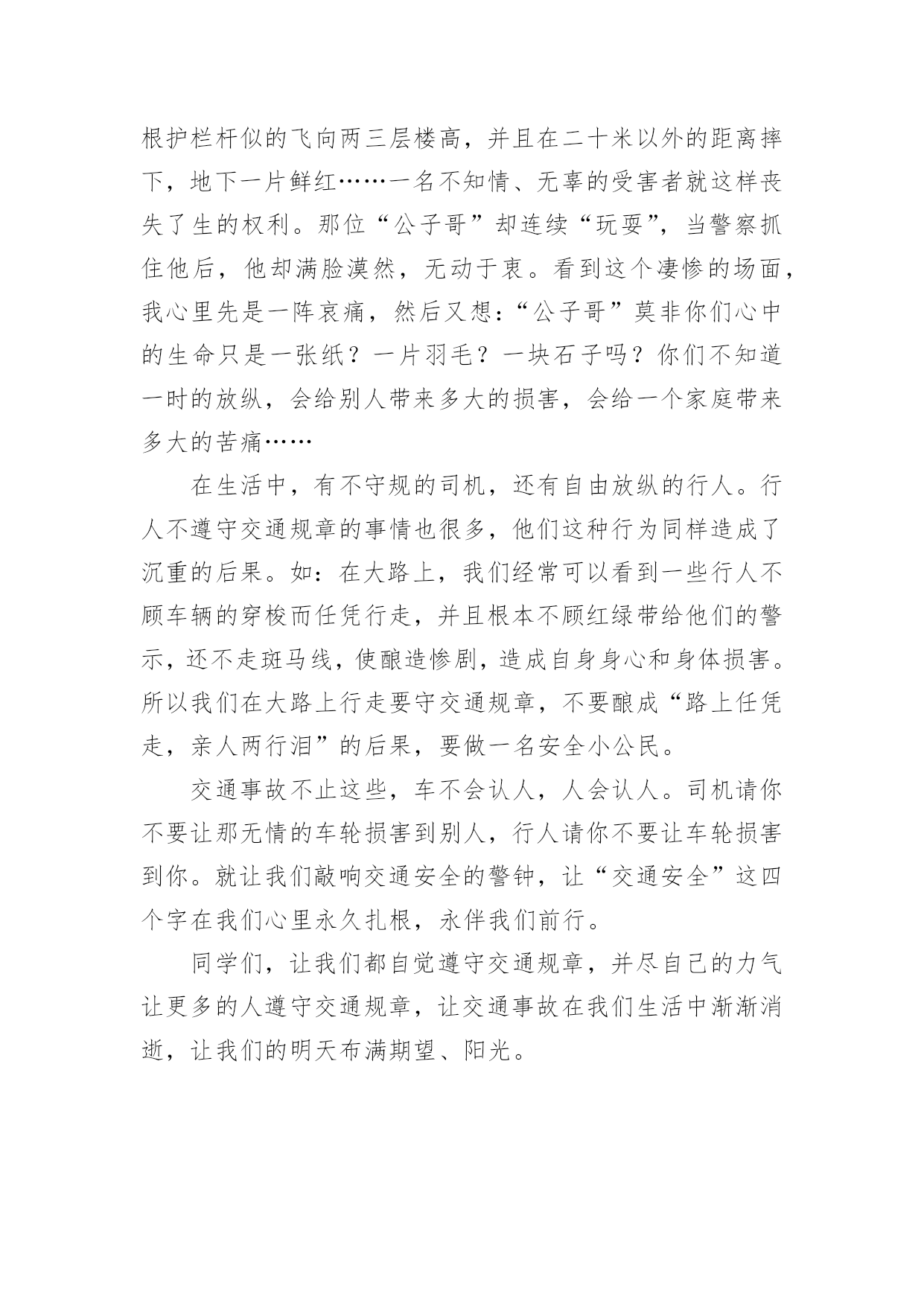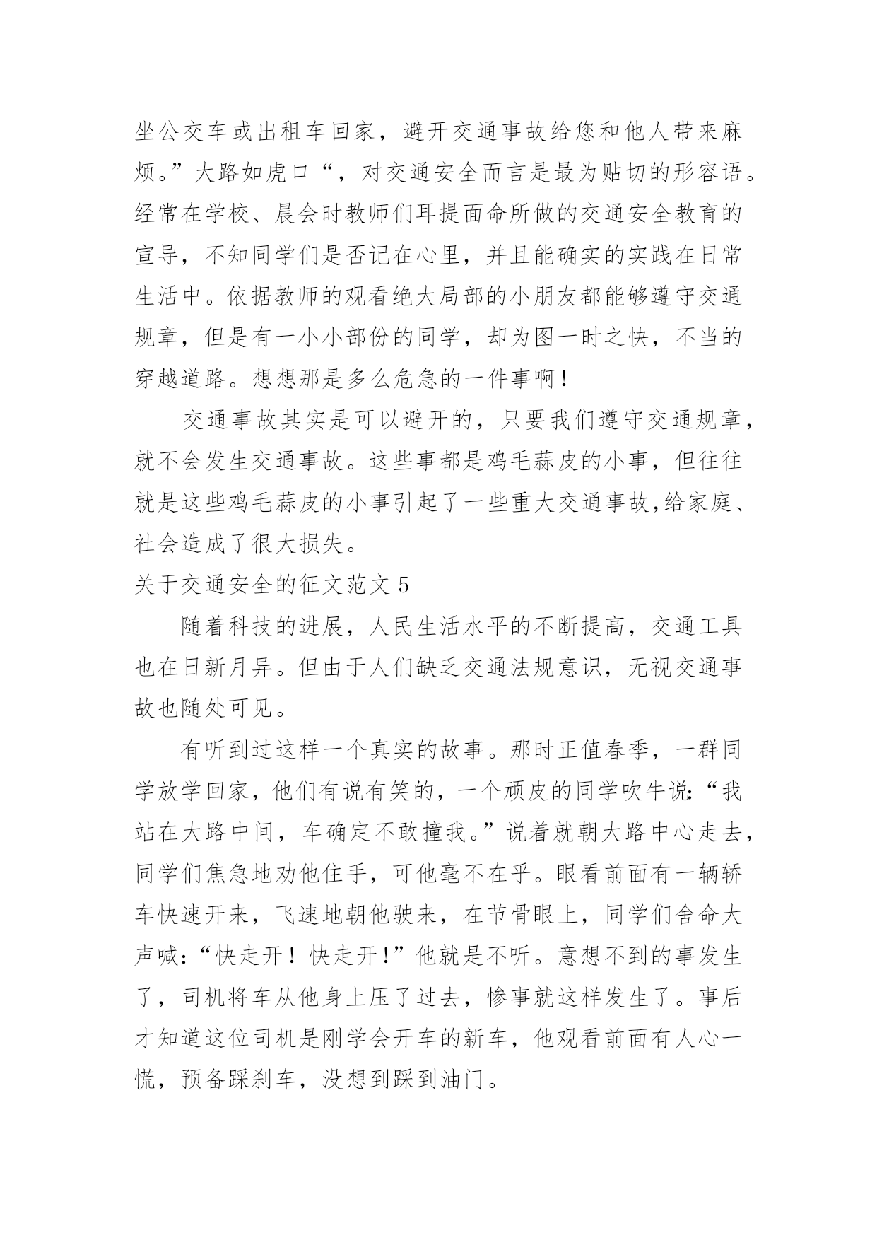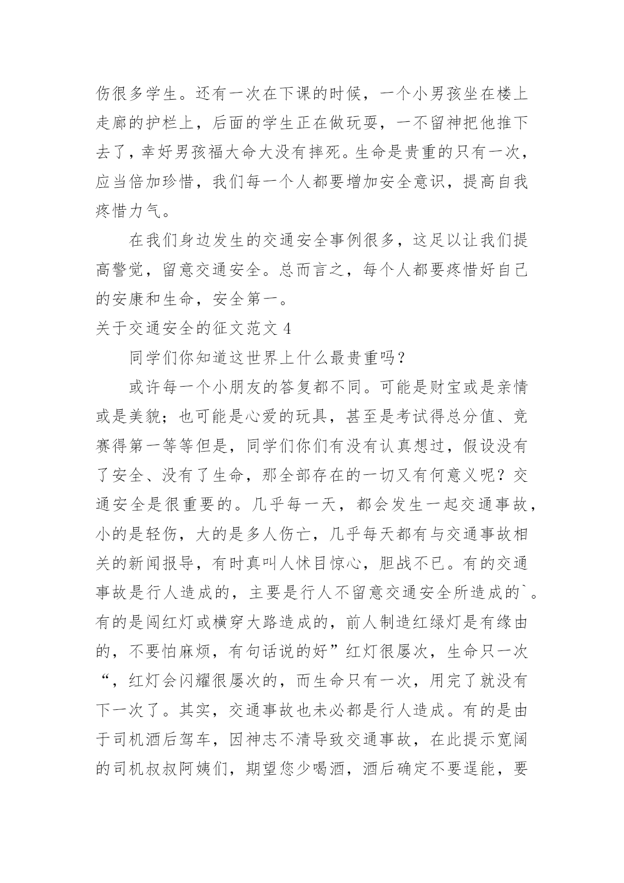交通安全的征文[精]关于交通安全的征文范文6篇在学习、工作乃至生活中,大家一定都接触过征文吧,征文没有题目、题材、格式的限定,与作文大体上一样。你写征文时总是无从下笔?下面是小编整理的关于交通安全的征文范文,供大家参考借鉴,希望可以帮助到有需要的朋友。关于交通安全的征文范文1在离铁路不远的地方。小时候,我常听妈妈说:“千万不行以去铁路上玩。”在潜意识里,我早已生疏了这番话,虽然那时的我并不曾明白其中的道理。随着时间的脚步,我已渐渐长大,渐渐清楚了这句话的含义。与此同时,火车的速度也在连年提高,这句话在今日显得尤为重要。听妈妈说20年前,在我们这里曾发生了一起惨不忍睹的火车事故。当时有两个中学生在铁路上玩,他们坐在铁轨上聊得起劲,火车却在那时开了过来,他们一无所知,他们看到火车时,已经来不及躲避了,只听见一声惨叫,现条活生生的生命就这样消逝了。听了这个事故,我真为他们的离去感到惋惜和伤感。这到底是什么缘由才造成的呢?我们只要静下心来想一想,就会知道,正是由于他们对铁路的安全学问了解不深,缺乏这方面的学习,抱着一种幸运的'心理,不知道火车“来之快,去之也快”,才会发生了这样的悲剧,断送了自己的生命,给亲人们带来了一辈子无法抹去的伤痛,还有可能因此而影响火车的运行安全,危及成百上千的乘客的生命。现在为了铁路沿线人们的安全,已经在铁路旁围上了栏杆,做起了一个个隧道,让人们能够安全的穿越铁路。可是我们应当照旧绷紧安全这根弦,千万不能掉以轻心。维护铁路安全是我们共同的责任,也是一种使命,一种义务。这是一种保持铁路持续稳步进展的使命,一种保证国家和人民生命财产安全的义务。疼惜铁路,让远方的游子平安回家,让每一个孩子重新投向父母的怀抱。让我们共唱“铁路安全”这首歌,用行动唤醒身边的每一个人,让我们一起努力,为国家作奉献,也为自己,为他人的多添一份保障!关于交通安全的征文范文2生命是唯一的,是贵重的,世界由于有了生命而变得精彩。您的生命,您珍惜了吗?要想生命得到保障,请您确定要遵守交通规章。在这经济富强的社会中,街上的车辆渐渐增多,在您面前奔驰而过,或许就在这时,由于您的疏忽或违规,会给交通带来不便。会给你和他的生命带来危急。有一天,我和妈妈在逛街,猛得听见身后一片惊叫,我赶忙向后看去,一辆卡车已经停在一个摔倒在地的小女孩面前。同时,一群人向那边涌去,我和妈妈也挤了过去。观看地上的小女孩脸色苍白,胸脯急促地起伏着,围观的人都很焦急,有几位热心的叔叔阿姨赶忙掏起手机,有打120的,有打110事故处理的。这时,小女孩才“哇”地一声哭了起来。只见司机愣了一会儿,也赶忙掏出手机打120,说明小女孩受伤的状况。在我们等待急救车来的时候,四周的'群众谈论纷纷:“哎,这女孩子,这女孩也真是的,不遵守交通规章,幸亏没有什么大碍。”从这起车祸中,让我感受到了交通规章的重要性。假设真有三长两短,双方都得承受现实的压力。关于交通安全的征文范文3谈到安全我有很多想法。安全是最重要的,教师、父母每天把“安全第一”这几个字挂在嘴边不停的说,小到上、下车,大到过大路,安全是不行无视的,下面我就说说对安全的看法。现在大多数同学都乘坐公交车了,拥挤现象自然也不断发生,给我印象最深的一个案例是:我们十二小一(7)班的一位年仅7岁的小女孩,当公交车驶来,她在追赶公交车的时候,被一个小男孩挤倒在车轮下,当她还没有来得及站起来时,车已经开动了,她被压在了无情的车轮下,后因抢救无效而死亡。知道这件事时我很哀痛,一个才上小学一年级的小女孩,还没来得及学学问就没有了。我们可不要由于想抢一个座位而拥挤上车,发生事故丧失性命。排好队挨个上车,这样多好啊!十二小的活动范围可以说很小,楼道很窄,所以更要留意安全。当集体活动时,楼上的学生要顺着楼梯往下走,假设一个同学倒了,后面的'同学都得跟着倒下去,这样会压伤很多学生。还有一次在下课的时候,一个小男孩坐在楼上走廊的护栏上,后面的学生正在做玩耍,一不留神把他推下去了,幸好男孩福大命大没有摔死。生命是贵重的只有一次,应当倍加珍惜,我们每一个人都要增加安全意识,提高自我疼惜力气。在我们身边发生的交通安全事例很多,这足以让我们提高警觉,留意交通安全。总而言之,每个人都要疼惜好自己的安康和生命,安全第一。关于交通安全的征文范文4同学们你知道这世界上什么最贵重吗?或许每一个小朋友的答复都不同。可能是财宝或是亲情或是美貌;也可能是心爱的玩具,甚至是考试得总分值、竞赛得第一等等但是,同学们你们有没有认真想过,假设没有了安全、没有了生命,那全部存在的一切又有何意义呢?交通安全是很重要的。几乎每一天,都会发生一起交通事故,小的是轻伤,大的是多人伤亡,几乎每天都有与交通事故相关的新闻报导,有时真叫人怵目惊心,胆战不已。有的交通事故是行人造成的,主要是行人不留意交通安全