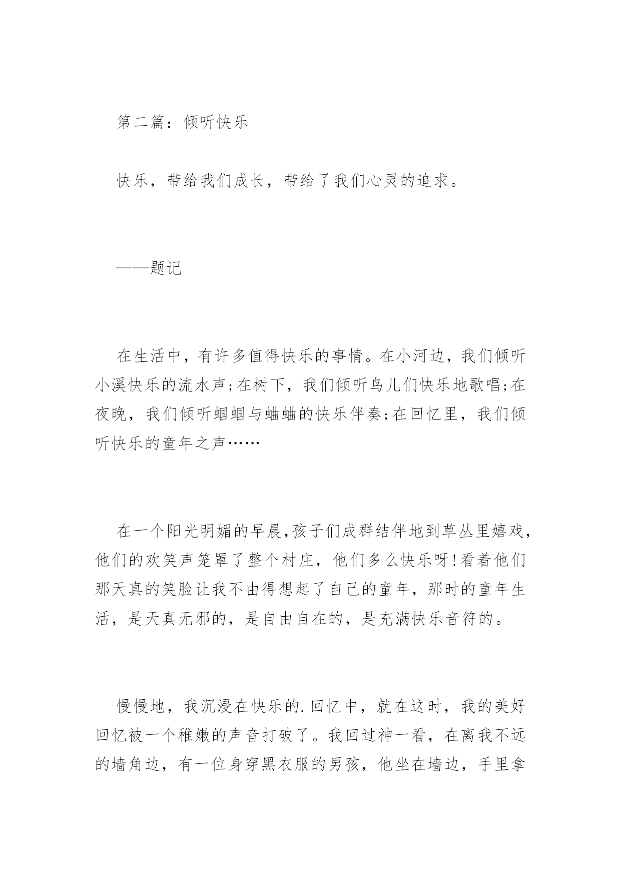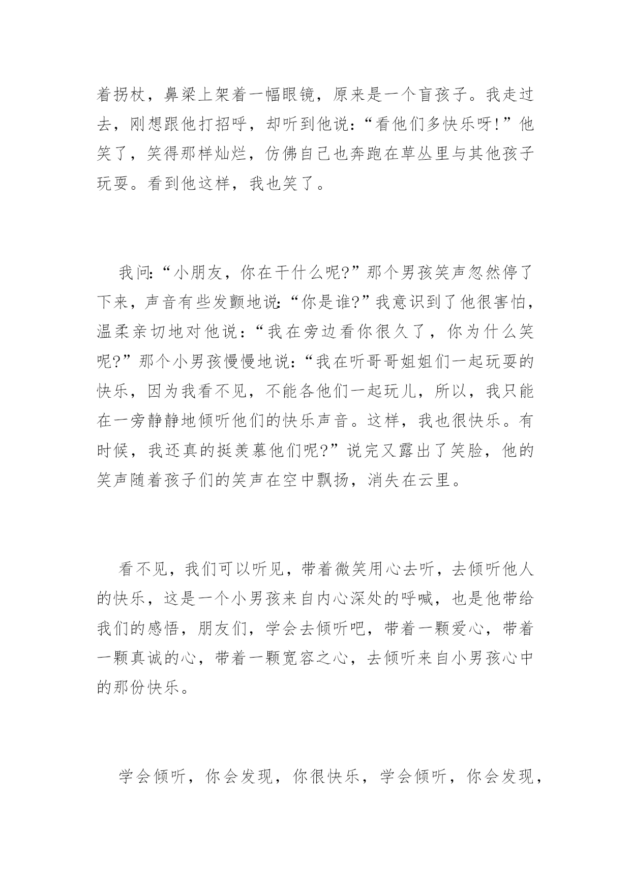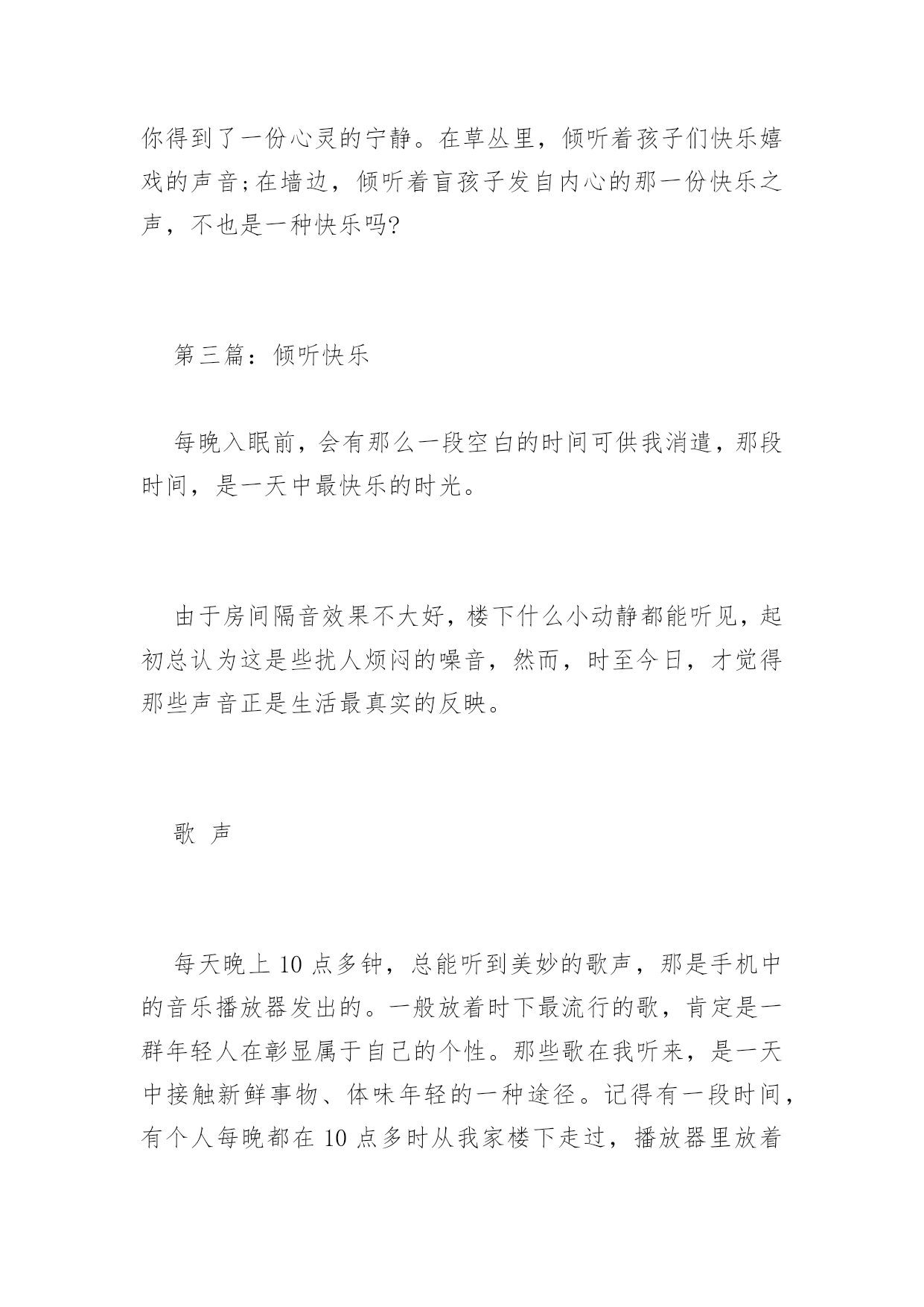 中考满分作文:倾听快乐快乐,带给我们成长,带给了我们心灵的追求。小编收集了倾听快乐的作文,欢迎阅读。第一篇:倾听快乐他,没有色彩却带给世界风光无限。——题记风,呼呼作响,有时却鸦雀无声。我喜欢风,因为他柔、他怒、他静。他有着各种各样千奇百变的姿态,我喜欢他,喜欢他从耳边吹过时的那一抺划痕;喜欢他轻佛着脸的那种凊凉;喜欢他抚摸大地的那股温柔。“昨夜星辰昨夜风,画楼西洋挂堂东。”是你的魅力吧;“珠缨炫转星宿摇,花鬘抖薮龙蛇动,”是你的激情吧;“野火烧不尽,春风吹又生”;是你的伟大吧。“沾衣欲湿杏花雨,吹面不含杨柳风”是你的姿态吧。春季温暖的风,蕴含着万物复苏,大地从冬眠中醒来的温度,小草从泥土中破土而出的声音,淡淡的.充满激情的从耳边跑过,仿佛白驹过隙一般迅速;夏季嬉戏的风,夹杂着空气中的热度,温柔的抚摸着大地母亲,柔柔的从耳边飘过,听到的仿佛是大海的声音;秋季丰收的风,充满着果实的香味,静静的乘载着丰收的声音,还可以听见农民们笑的声音;冬季发怒的风,夹杂着冰天雪地的寒冷,不禁让人打个寒颤,起了一身的鸡皮疙瘩,冬风从脸上无情的划过,留下的是一道道冰冷的刀痕,凉进了心里。看吧,多彩的风,你要用心去感受。感受声音,感受温度,感受气息。风,他不像花朵一样鲜艳美丽,也不像音乐一样的声音,他却是大自然中最美的,他拥有着丰富多样的声音,即使到了世界末日,他还是依旧的在那里给世间带来风光无限,为你保留着独特的声音,当然,你还可以去倾听小草破土而出、花朵含苞待放、雨水敲打台阶的声音。从那里,享受倾听的快乐吧!第二篇:倾听快乐快乐,带给我们成长,带给了我们心灵的追求。——题记在生活中,有许多值得快乐的事情。在小河边,我们倾听小溪快乐的流水声;在树下,我们倾听鸟儿们快乐地歌唱;在夜晚,我们倾听蝈蝈与蛐蛐的快乐伴奏;在回忆里,我们倾听快乐的童年之声……在一个阳光明媚的早晨,孩子们成群结伴地到草丛里嬉戏,他们的欢笑声笼罩了整个村庄,他们多么快乐呀!看着他们那天真的笑脸让我不由得想起了自己的童年,那时的童年生活,是天真无邪的,是自由自在的,是充满快乐音符的。慢慢地,我沉浸在快乐的.回忆中,就在这时,我的美好回忆被一个稚嫩的声音打破了。我回过神一看,在离我不远的墙角边,有一位身穿黑衣服的男孩,他坐在墙边,手里拿着拐杖,鼻梁上架着一幅眼镜,原来是一个盲孩子。我走过去,刚想跟他打招呼,却听到他说:“看他们多快乐呀!”他笑了,笑得那样灿烂,仿佛自己也奔跑在草丛里与其他孩子玩耍。看到他这样,我也笑了。我问:“小朋友,你在干什么呢?”那个男孩笑声忽然停了下来,声音有些发颤地说:“你是谁?”我意识到了他很害怕,温柔亲切地对他说:“我在旁边看你很久了,你为什么笑呢?”那个小男孩慢慢地说:“我在听哥哥姐姐们一起玩耍的快乐,因为我看不见,不能各他们一起玩儿,所以,我只能在一旁静静地倾听他们的快乐声音。这样,我也很快乐。有时候,我还真的挺羡慕他们呢?”说完又露出了笑脸,他的笑声随着孩子们的笑声在空中飘扬,消失在云里。看不见,我们可以听见,带着微笑用心去听,去倾听他人的快乐,这是一个小男孩来自内心深处的呼喊,也是他带给我们的感悟,朋友们,学会去倾听吧,带着一颗爱心,带着一颗真诚的心,带着一颗宽容之心,去倾听来自小男孩心中的那份快乐。学会倾听,你会发现,你很快乐,学会倾听,你会发现,你得到了一份心灵的宁静。在草丛里,倾听着孩子们快乐嬉戏的声音;在墙边,倾听着盲孩子发自内心的那一份快乐之声,不也是一种快乐吗?第三篇:倾听快乐每晚入眠前,会有那么一段空白的时间可供我消遣,那段时间,是一天中最快乐的时光。由于房间隔音效果不大好,楼下什么小动静都能听见,起初总认为这是些扰人烦闷的噪音,然而,时至今日,才觉得那些声音正是生活最真实的反映。歌声每天晚上10点多钟,总能听到美妙的歌声,那是手机中的音乐播放器发出的。一般放着时下最流行的歌,肯定是一群年轻人在彰显属于自己的个性。那些歌在我听来,是一天中接触新鲜事物、体味年轻的一种途径。记得有一段时间,有个人每晚都在10点多时从我家楼下走过,播放器里放着《落叶归根》。我想,喜欢王力宏这首具有古典美的歌曲,肯定是一个长相甜美的'大姐姐吧!卷闸门对面邻居利用紧靠汽车站的地理优势,在自家开起了旅馆。门是关着的,一有人来,就开门,有时一晚上要响好几次,“呼啦”,“呼啦”吵死人。尽管开旅馆是为了挣钱为了生活,也很不容易,但有时那几声响声真令人烦,我不免要想:那人素质咋就那么差呢?吵架当然有些时候,晚上还会听见人们吵架的声音,有时是夫妻俩在家吵,有时是有人在电话里与人吵架。其实,原本宁静的夜晚传来那么几句不堪入耳的声音,的确有点扫兴,但耳边噼里啪啦的吵架声,也带给我更多的联想。我生活在幸福和谐的家庭中,爸