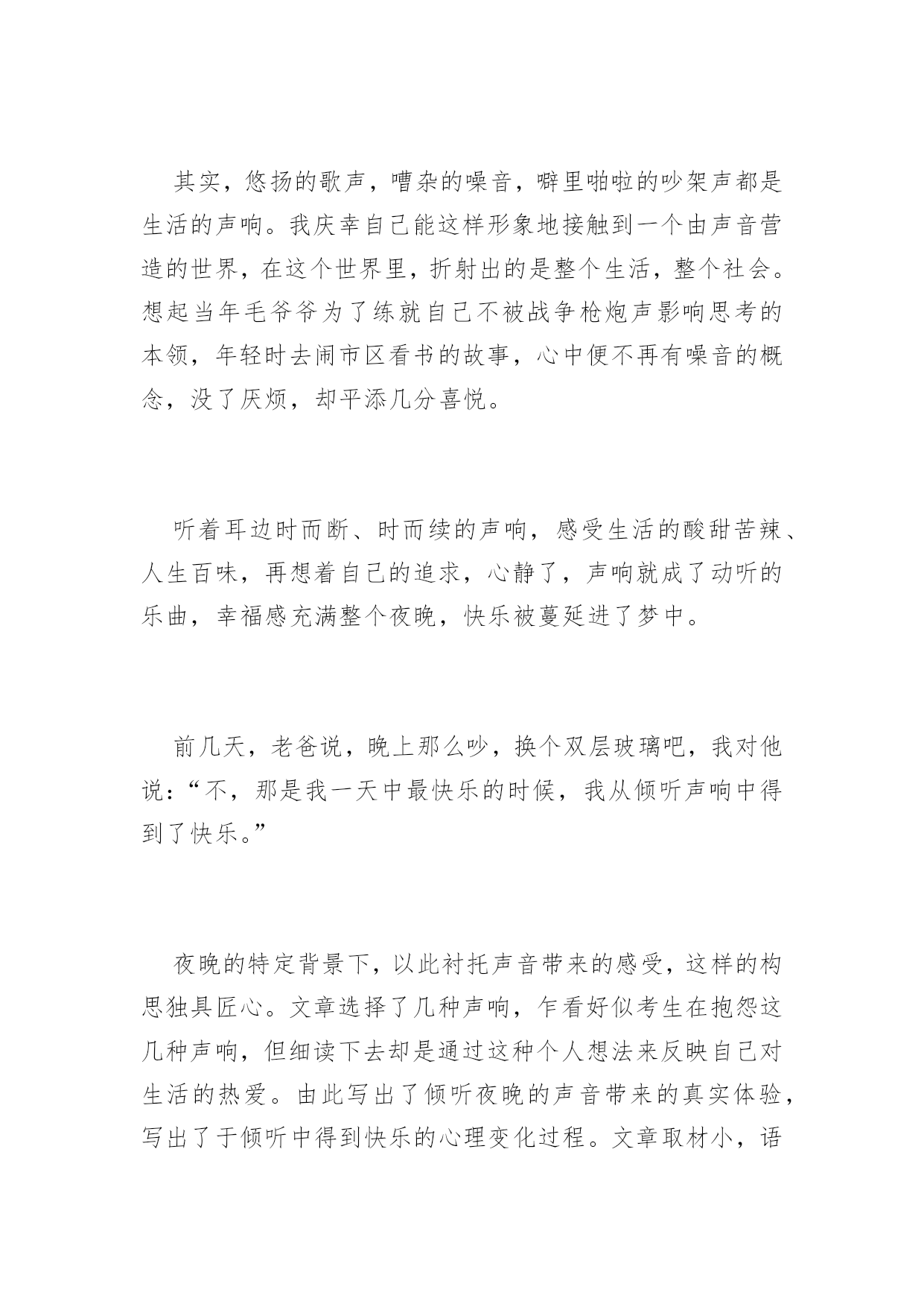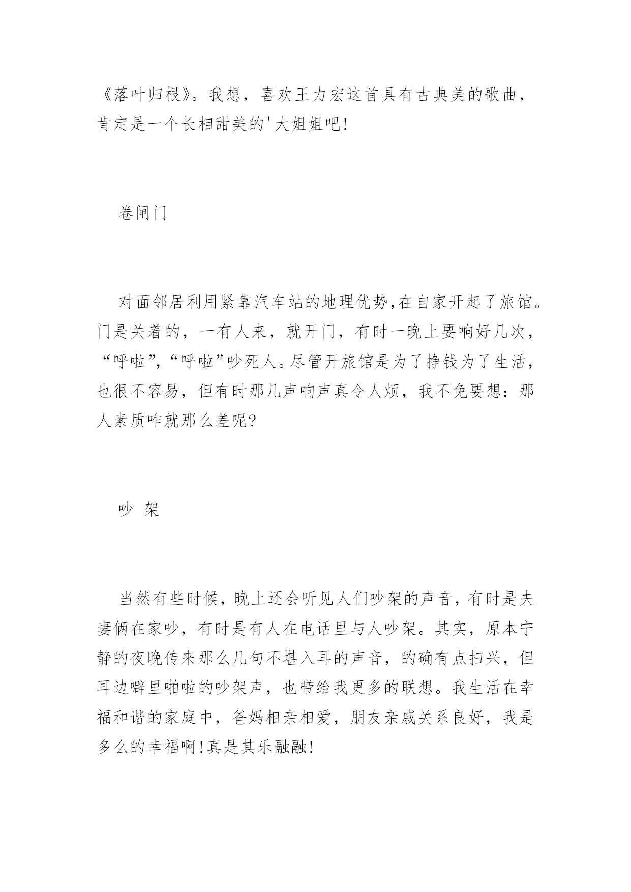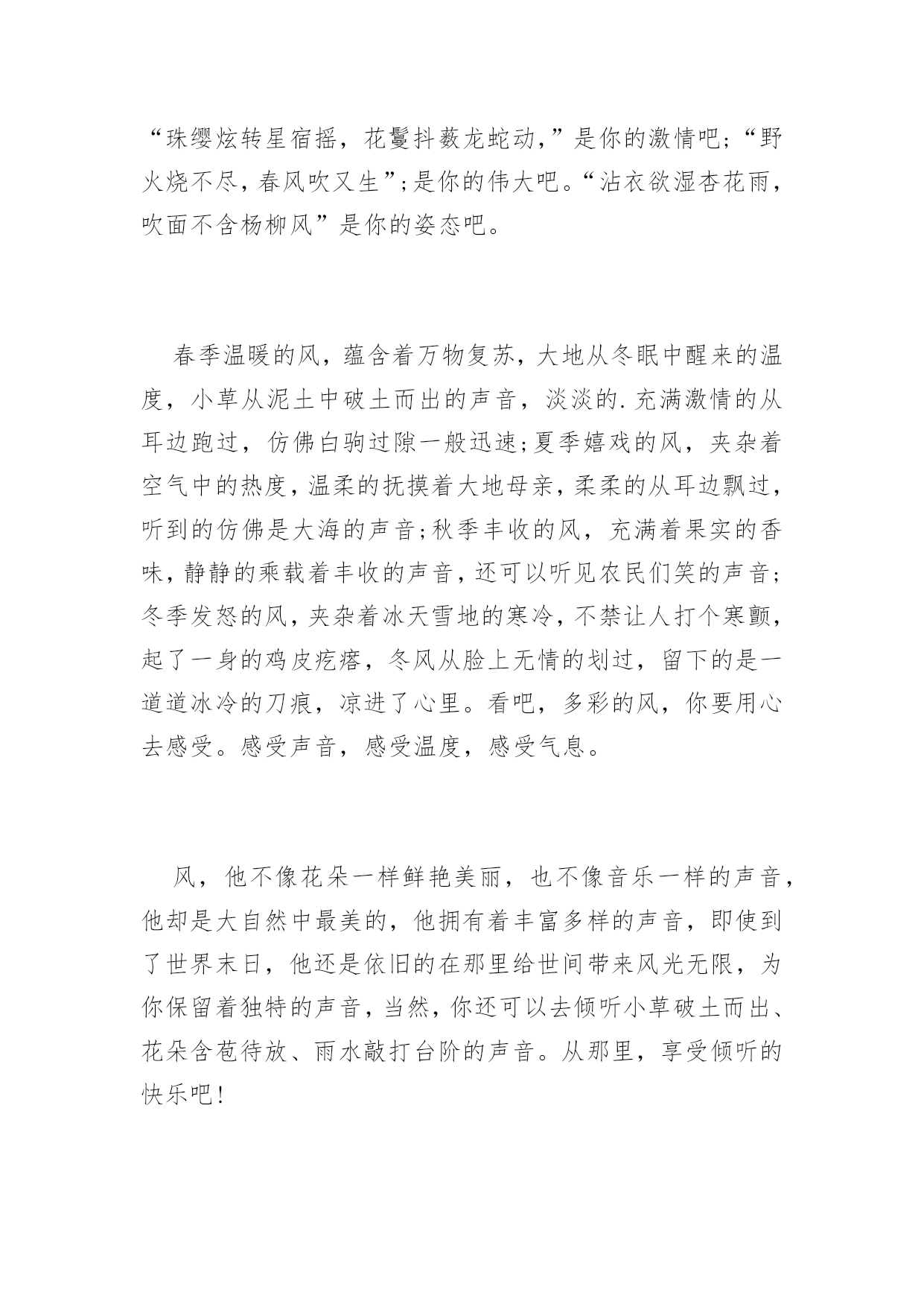 中考满分作文:倾听快乐快乐,带给我们成长,带给了我们心灵的追求。小编收集了倾听快乐的作文,欢迎阅读。第一篇:倾听快乐他,没有色彩却带给世界风光无限。——题记风,呼呼作响,有时却鸦雀无声。我喜欢风,因为他柔、他怒、他静。他有着各种各样千奇百变的姿态,我喜欢他,喜欢他从耳边吹过时的那一抺划痕;喜欢他轻佛着脸的那种凊凉;喜欢他抚摸大地的那股温柔。“昨夜星辰昨夜风,画楼西洋挂堂东。”是你的魅力吧;“珠缨炫转星宿摇,花鬘抖薮龙蛇动,”是你的激情吧;“野火烧不尽,春风吹又生”;是你的伟大吧。“沾衣欲湿杏花雨,吹面不含杨柳风”是你的姿态吧。春季温暖的风,蕴含着万物复苏,大地从冬眠中醒来的温度,小草从泥土中破土而出的声音,淡淡的.充满激情的从耳边跑过,仿佛白驹过隙一般迅速;夏季嬉戏的风,夹杂着空气中的热度,温柔的抚摸着大地母亲,柔柔的从耳边飘过,听到的仿佛是大海的声音;秋季丰收的风,充满着果实的香味,静静的乘载着丰收的声音,还可以听见农民们笑的声音;冬季发怒的风,夹杂着冰天雪地的寒冷,不禁让人打个寒颤,起了一身的鸡皮疙瘩,冬风从脸上无情的划过,留下的是一道道冰冷的刀痕,凉进了心里。看吧,多彩的风,你要用心去感受。感受声音,感受温度,感受气息。风,他不像花朵一样鲜艳美丽,也不像音乐一样的声音,他却是大自然中最美的,他拥有着丰富多样的声音,即使到了世界末日,他还是依旧的在那里给世间带来风光无限,为你保留着独特的声音,当然,你还可以去倾听小草破土而出、花朵含苞待放、雨水敲打台阶的声音。从那里,享受倾听的快乐吧!第二篇:倾听快乐快乐,带给我们成长,带给了我们心灵的追求。——题记在生活中,有许多值得快乐的事情。在小河边,我们倾听小溪快乐的流水声;在树下,我们倾听鸟儿们快乐地歌唱;在夜晚,我们倾听蝈蝈与蛐蛐的快乐伴奏;在回忆里,我们倾听快乐的童年之声……在一个阳光明媚的早晨,孩子们成群结伴地到草丛里嬉戏,他们的欢笑声笼罩了整个村庄,他们多么快乐呀!看着他们那天真的笑脸让我不由得想起了自己的童年,那时的童年生活,是天真无邪的,是自由自在的,是充满快乐音符的。慢慢地,我沉浸在快乐的.回忆中,就在这时,我的美好回忆被一个稚嫩的声音打破了。我回过神一看,在离我不远的墙角边,有一位身穿黑衣服的男孩,他坐在墙边,手里拿着拐杖,鼻梁上架着一幅眼镜,原来是一个盲孩子。我走过去,刚想跟他打招呼,却听到他说:“看他们多快乐呀!”他笑了,笑得那样灿烂,仿佛自己也奔跑在草丛里与其他孩子玩耍。看到他这样,我也笑了。我问:“小朋友,你在干什么呢?”那个男孩笑声忽然停了下来,声音有些发颤地说:“你是谁?”我意识到了他很害怕,温柔亲切地对他说:“我在旁边看你很久了,你为什么笑呢?”那个小男孩慢慢地说:“我在听哥哥姐姐们一起玩耍的快乐,因为我看不见,不能各他们一起玩儿,所以,我只能在一旁静静地倾听他们的快乐声音。这样,我也很快乐。有时候,我还真的挺羡慕他们呢?”说完又露出了笑脸,他的笑声随着孩子们的笑声在空中飘扬,消失在云里。看不见,我们可以听见,带着微笑用心去听,去倾听他人的快乐,这是一个小男孩来自内心深处的呼喊,也是他带给我们的感悟,朋友们,学会去倾听吧,带着一颗爱心,带着一颗真诚的心,带着一颗宽容之心,去倾听来自小男孩心中的那份快乐。学会倾听,你会发现,你很快乐,学会倾听,你会发现,你得到了一份心灵的宁静。在草丛里,倾听着孩子们快乐嬉戏的声音;在墙边,倾听着盲孩子发自内心的那一份快乐之声,不也是一种快乐吗?第三篇:倾听快乐每晚入眠前,会有那么一段空白的时间可供我消遣,那段时间,是一天中最快乐的时光。由于房间隔音效果不大好,楼下什么小动静都能听见,起初总认为这是些扰人烦闷的噪音,然而,时至今日,才觉得那些声音正是生活最真实的反映。歌声每天晚上10点多钟,总能听到美妙的歌声,那是手机中的音乐播放器发出的。一般放着时下最流行的歌,肯定是一群年轻人在彰显属于自己的个性。那些歌在我听来,是一天中接触新鲜事物、体味年轻的一种途径。记得有一段时间,有个人每晚都在10点多时从我家楼下走过,播放器里放着《落叶归根》。我想,喜欢王力宏这首具有古典美的歌曲,肯定是一个长相甜美的'大姐姐吧!卷闸门对面邻居利用紧靠汽车站的地理优势,在自家开起了旅馆。门是关着的,一有人来,就开门,有时一晚上要响好几次,“呼啦”,“呼啦”吵死人。尽管开旅馆是为了挣钱为了生活,也很不容易,但有时那几声响声真令人烦,我不免要想:那人素质咋就那么差呢?吵架当然有些时候,晚上还会听见人们吵架的声音,有时是夫妻俩在家吵,有时是有人在电话里与人吵架。其实,原本宁静的夜晚传来那么几句不堪入耳的声音,的确有点扫兴,但耳边噼里啪啦的吵架声,也带给我更多的联想。我生活在幸福和谐的家庭中,爸