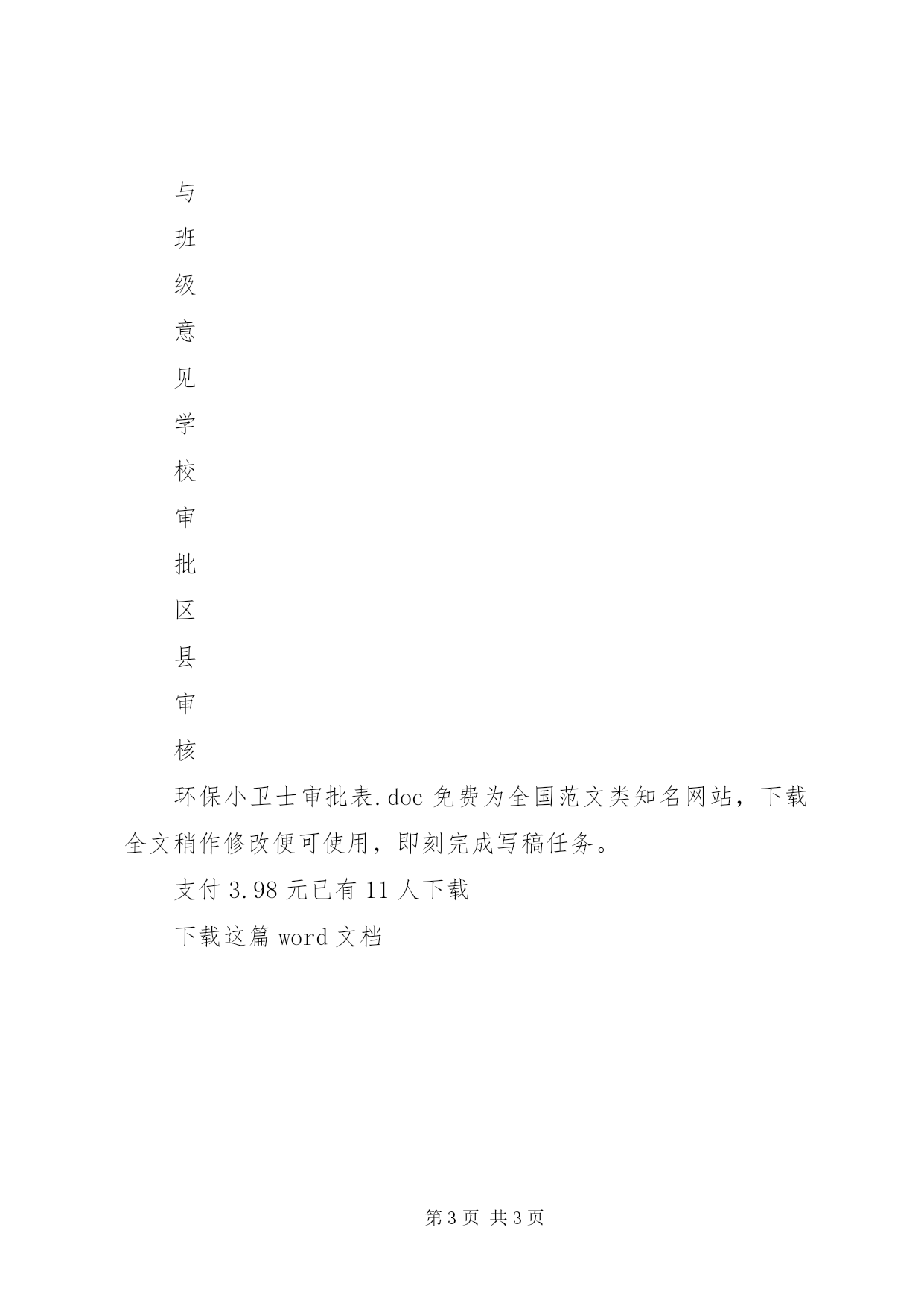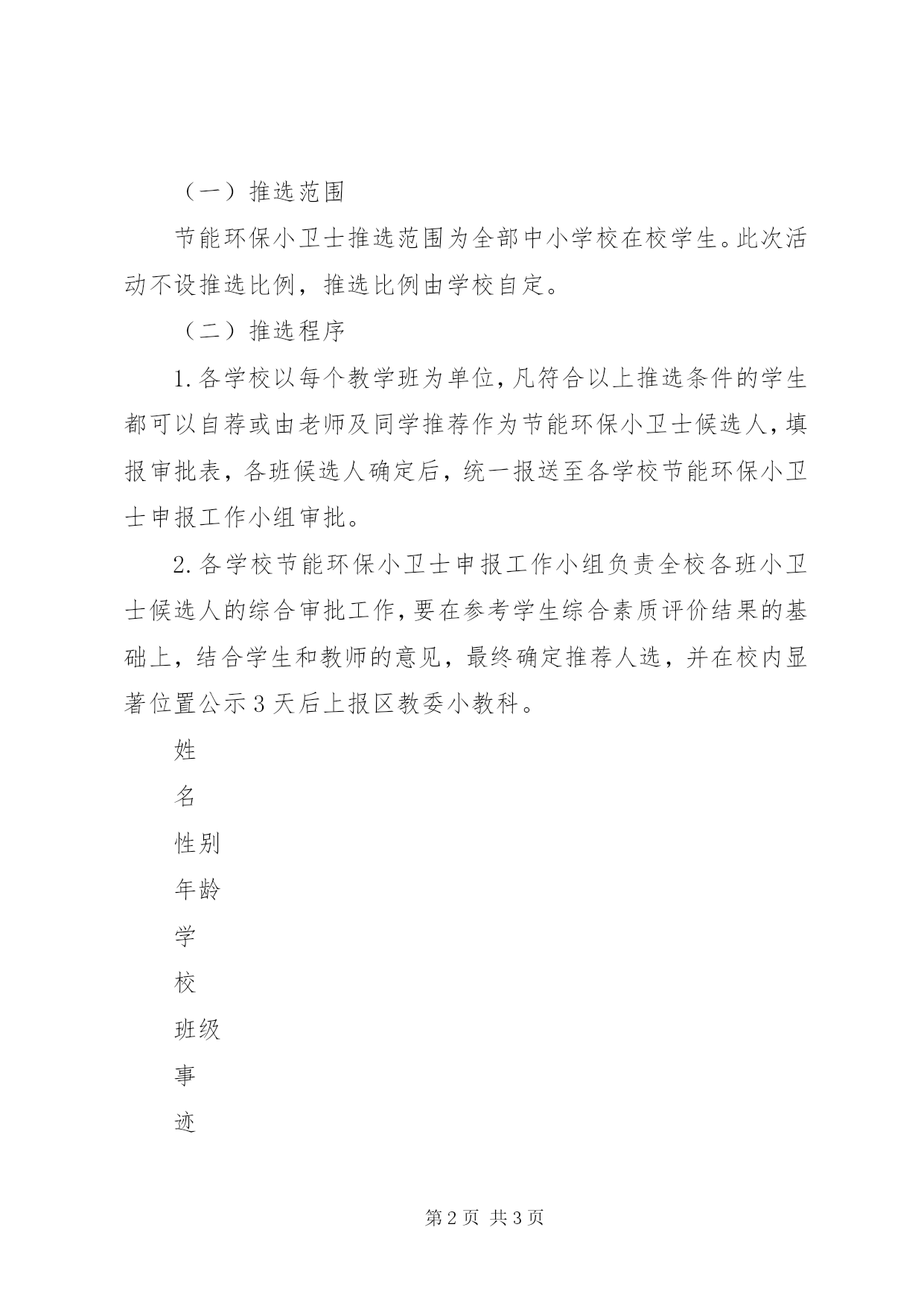 第PAGE\*Arabic\*MERGEFORMAT3页共NUMPAGES\*MERGEFORMAT3页环保小卫士审批表xx市中小学生节能环保小卫士审批表一、评选条件(一)小学节能环保小卫士评选条件1.自觉遵守《中小学生守则》和《小学生日常行为规范》,积极参加社会实践活动和公益活动,表现突出。2.具有一定的节约与环保意识,初步养成良好的节水、节能、节材、节粮等节约环保习惯,并获得同学、教师的认可。3.对节约环保课程及相关学习内容兴趣浓厚,学习过程中善于提问,乐于探索,能将所学知识应用到生活和实践中。4.积极参加校内外组织的节能环保活动,表现突出。(二)中学节能环保小卫士评选条件1.自觉遵守《中小学生守则》和《中学生日常行为规范》。有服务他人、集体和社会的责任感,在志愿服务和实践活动中表现突出。2.具有较强的节约与环保意识,养成良好的节水、节能、节材、节粮等节约环保习惯,并获得同学、教师的认可。3.较好地掌握各学科中节能减排的基本知识和基本技能。善于思考,乐于探索,能将所学知识应用到生活和实践中,有较强的实践能力和一定的创新能力。4.积极参加校内外组织的节能环保活动,表现突出。二、评选办法(一)推选范围节能环保小卫士推选范围为全部中小学校在校学生。此次活动不设推选比例,推选比例由学校自定。(二)推选程序1.各学校以每个教学班为单位,凡符合以上推选条件的学生都可以自荐或由老师及同学推荐作为节能环保小卫士候选人,填报审批表,各班候选人确定后,统一报送至各学校节能环保小卫士申报工作小组审批。2.各学校节能环保小卫士申报工作小组负责全校各班小卫士候选人的综合审批工作,要在参考学生综合素质评价结果的基础上,结合学生和教师的意见,最终确定推荐人选,并在校内显著位置公示3天后上报区教委小教科。姓名性别年龄学校班级事迹与班级意见学校审批区县审核环保小卫士审批表.doc免费为全国范文类知名网站,下载全文稍作修改便可使用,即刻完成写稿任务。支付3.98元已有11人下载下载这篇word文档