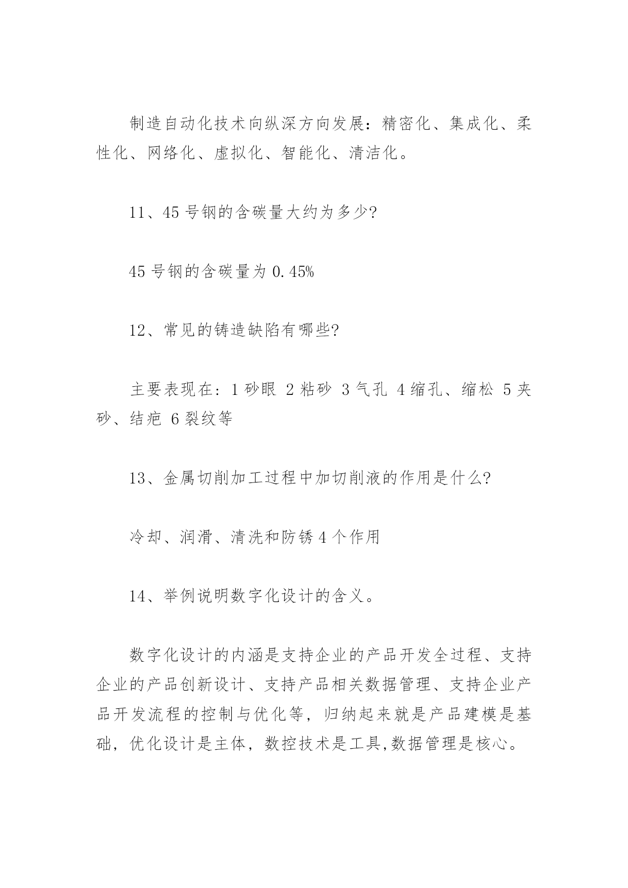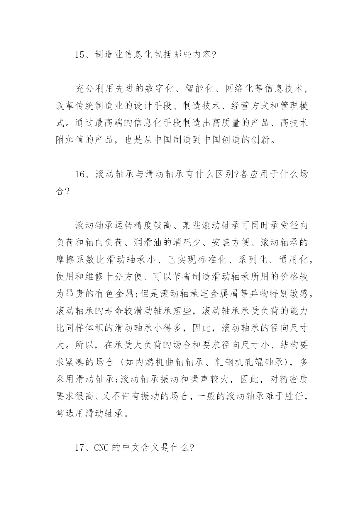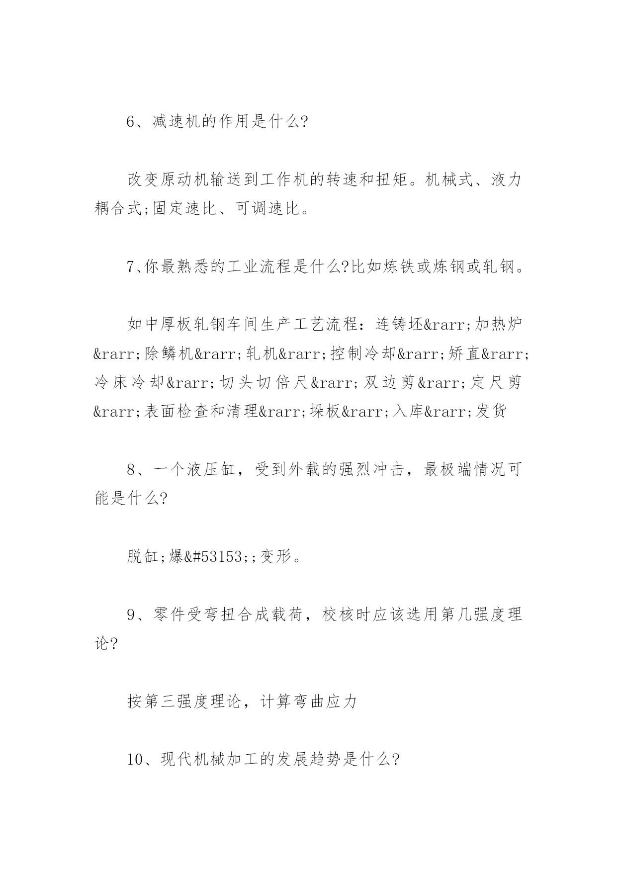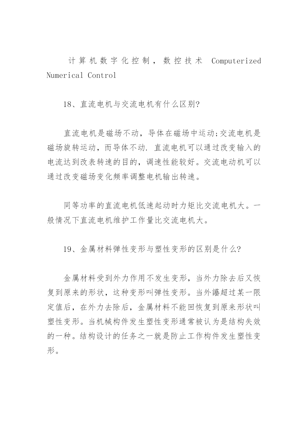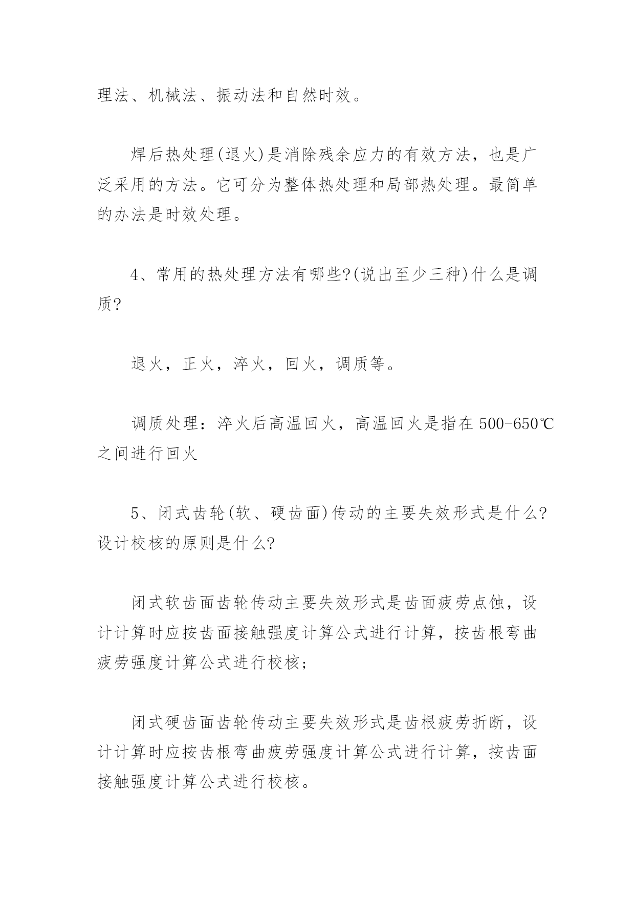 机械面试问题及答案机械面试问题及答案1、举例说明尺寸链的应用尺寸链:在零件加工或机器装配过程中,由互相联系的尺寸按一定顺序首尾相接排列而成的封闭尺寸组。组成尺寸链的各个尺寸称为尺寸链的环。其中,在装配或加工过程最终被间接保证精度的尺寸称为封闭环,其余尺寸称为组成环。利用尺寸链,可以分析确定机器零件的尺寸精度,保证加工精度和装配精度。2、常用黑色金属材料有哪几类?什么是优质碳素钢?黑色金属通常指钢和铸铁;钢分为碳素钢(简称碳钢)和合金钢两大类。碳钢按钢的质量(即按钢含有害元素S、P的多少)分为普通碳素钢、优质碳素钢、高级碳素钢三类。优质碳素钢,钢中S、P含量均≤0.040%;3、焊接件焊接应力如何消除?常用的热处理方法景什么?消除焊接应力的方法消除焊接应力的方法主要有:热处理法、机械法、振动法和自然时效。焊后热处理(退火)是消除残余应力的有效方法,也是广泛采用的方法。它可分为整体热处理和局部热处理。最简单的办法是时效处理。4、常用的热处理方法有哪些?(说出至少三种)什么是调质?退火,正火,淬火,回火,调质等。调质处理:淬火后高温回火,高温回火是指在500-650℃之间进行回火5、闭式齿轮(软、硬齿面)传动的主要失效形式是什么?设计校核的原则是什么?闭式软齿面齿轮传动主要失效形式是齿面疲劳点蚀,设计计算时应按齿面接触强度计算公式进行计算,按齿根弯曲疲劳强度计算公式进行校核;闭式硬齿面齿轮传动主要失效形式是齿根疲劳折断,设计计算时应按齿根弯曲疲劳强度计算公式进行计算,按齿面接触强度计算公式进行校核。6、减速机的作用是什么?改变原动机输送到工作机的转速和扭矩。机械式、液力耦合式;固定速比、可调速比。7、你最熟悉的工业流程是什么?比如炼铁或炼钢或轧钢。如中厚板轧钢车间生产工艺流程:连铸坯→加热炉→除鳞机→轧机→控制冷却→矫直→冷床冷却→切头切倍尺→双边剪→定尺剪→表面检查和清理→垛板→入库→发货8、一个液压缸,受到外载的强烈冲击,最极端情况可能是什么?脱缸;爆쾡;变形。9、零件受弯扭合成载荷,校核时应该选用第几强度理论?按第三强度理论,计算弯曲应力10、现代机械加工的发展趋势是什么?制造自动化技术向纵深方向发展:精密化、集成化、柔性化、网络化、虚拟化、智能化、清洁化。11、45号钢的含碳量大约为多少?45号钢的含碳量为0.45%12、常见的铸造缺陷有哪些?主要表现在:1砂眼2粘砂3气孔4缩孔、缩松5夹砂、结疤6裂纹等13、金属切削加工过程中加切削液的作用是什么?冷却、润滑、清洗和防锈4个作用14、举例说明数字化设计的含义。数字化设计的内涵是支持企业的产品开发全过程、支持企业的产品创新设计、支持产品相关数据管理、支持企业产品开发流程的控制与优化等,归纳起来就是产品建模是基础,优化设计是主体,数控技术是工具,数据管理是核心。15、制造业信息化包括哪些内容?充分利用先进的数字化、智能化、网络化等信息技术,改革传统制造业的设计手段、制造技术、经营方式和管理模式。通过最高端的信息化手段制造出高质量的产品、高技术附加值的产品,也是从中国制造到中国创造的创新。16、滚动轴承与滑动轴承有什么区别?各应用于什么场合?滚动轴承运转精度较高、某些滚动轴承可同时承受径向负荷和轴向负荷、润滑油的消耗少、安装方便、滚动轴承的摩擦系数比滑动轴承小、已实现标准化、系列化、通用化,使用和维修十分方便、可以节省制造滑动轴承所用的价格较为昂贵的有色金属;但是滚动轴承宒金属屑等异物特别敏感,滚动轴承的寿命较滑动轴承短些,滚动轴承承受负荷的能力比同样体积的滑动轴承小得多,因此,滚动轴承的径向尺寸大。所以,在承受大负荷的场合和要求径向尺寸小、结构要求紧凑的场合〈如内燃机曲轴轴承、轧钢机轧辊轴承),多采用滑动轴承;滚动轴承振动和噪声较大,因此,对精密度要求很高、又不许有振动的场合,一般的滚动轴承难于胜任,常选用滑动轴承。17、CNC的中文含义是什么?计算机数字化控制,数控技术ComputerizedNumericalControl18、直流电机与交流电机有什么区别?直流电机是磁场不动,导体在磁场中运动;交流电机是磁场旋转运动,而导体不动.直流电机可以通过改变输入的电流达到改表转速的目的,调速性能较好。交流电动机可以通过改变磁场变化频率调整电机输出转速。同等功率的直流电机低速起动时力矩比交流电机大。一般情况下直流电机维护工作量比交流电机大。19、金属材料弹性变形与塑性变形的区别是什么?金属材料受到外力作用不发生变形,当外力除去后又恢复到原来的形状,这种变形叫弹性变形。当外讛超过某一限定值后,在外力去除后,金属材料不能回恢复到原来形状