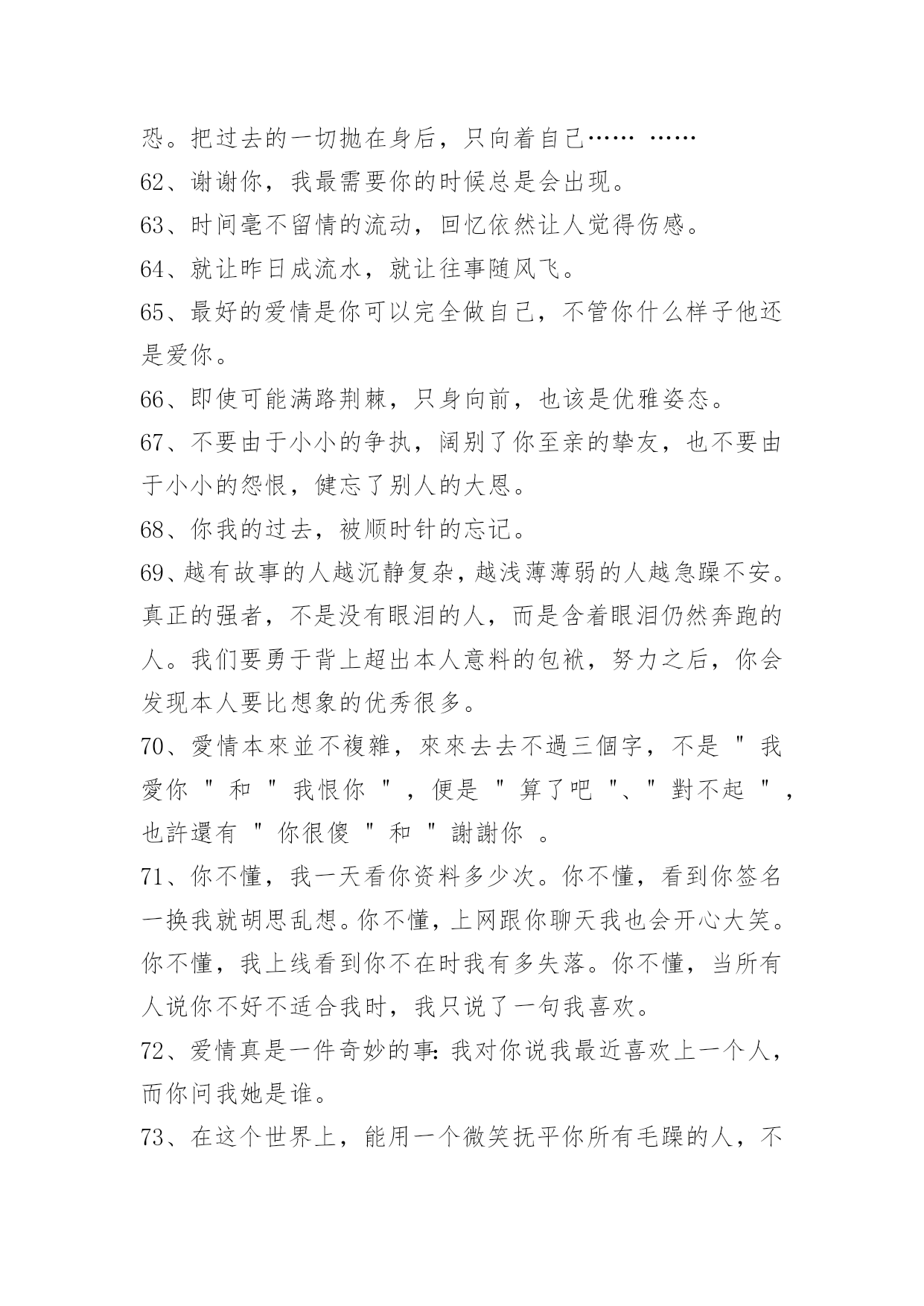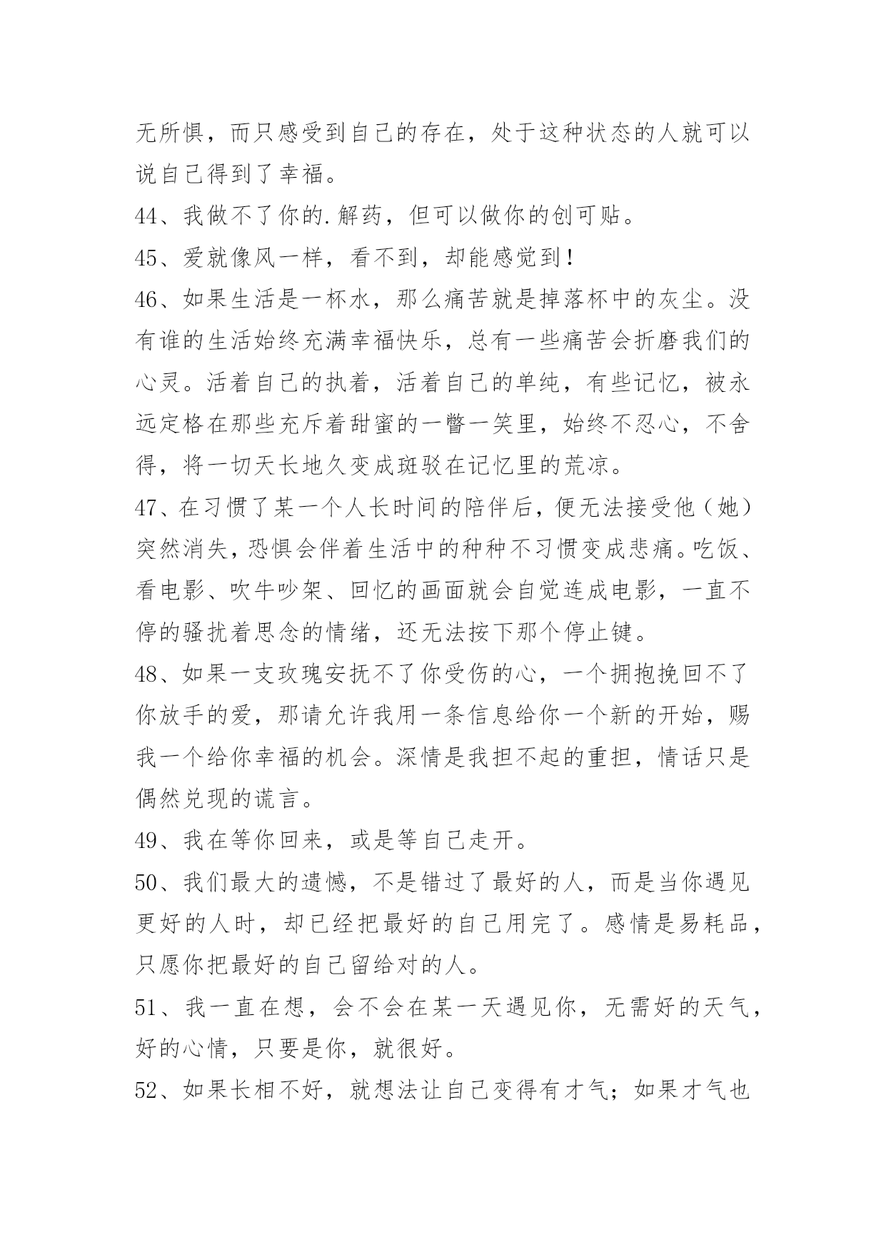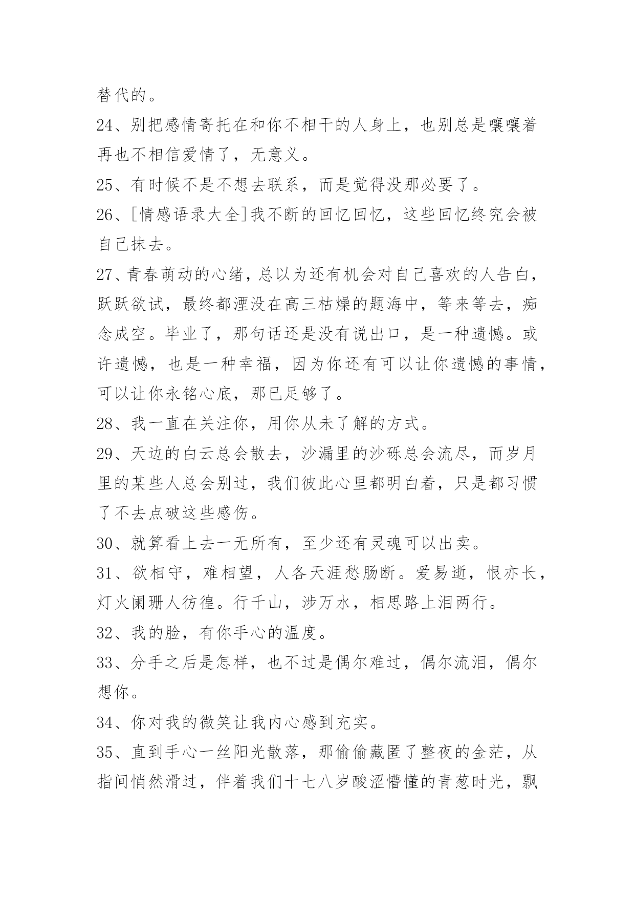 情感语录摘录76条精选情感语录摘录76条人的一生,本就是一个认人、识人的过程。有的人起始于相逢,终止于相处;有的人曾经入了眼,如今离了心。以下是关于情感语录76条,仅供参考,欢迎大家阅读。1、←¢東方有火紅的希朢,南方有温煖的巢牀,向西逐退成陽,向北唤醒芬芳。☆2、告诉,自己忘记那些回忆吧,让一切都顺其自然。3、回忆起绽放的那一个宁夏,仿佛可以触摸彩虹。4、每天晚上他怕我偷偷玩电脑不乖乖睡觉,都会远程控制我电脑亲自给我关机。5、没能参与你的过去。也错过了你的未来。6、我怕冬天、可最喜欢冬天,因为冬天是回家的季节,是唯一在家过的季节。7、有时候我经常问你在哪里?在做什么?并不是想窥探你。而是想通过一次又一次的答案,拼凑还原出一个我并不了解的,生活和世界。8、渴望像孩子一样的生活,高兴时可以毫不掩饰的笑,悲伤时可以无所顾忌地哭,可以快乐的唱歌,可以率真的画画,可以用一颗童真的心去感受生活,可以用一双清澈的眼去观察时间……9、对不起,没想到我对你的问候成了打扰。10、有时候事情会如你所愿,有时候则事与愿违,但你要坚持。11、时间总是教人,把好的都记得,当初为什么,没好好再见呢。12、你怎么会知道,有那么多个瞬间,我是多么想要回到过去重来一遍。13、心、那么那么痛,可是那个人还是不停的在你伤口上撒盐、多么悲哀的。14、刚刚上男朋友扣,找半天没有我,然后一看我竟然在陌生人里。我笑了,笑哭了。15、有些事情放在心底的最深处就好,不要轻易的去拾起来品味,伤口会再次裂开的。16、如果可以彼此进入对方的心里,你会哭,因为里面全是对你的思念;我也会哭,因为里面全是你的无所谓。17、去爱吧,就像不曾受伤一样。18、我生气的时候不要逗我笑,这样一点都不酷。19、原以为是因为爱我才那么包容,搞到最后原来是你跟本就不在意。20、一直喜欢的都是你,只是你的心里到底有没有属于我的一席之地。21、我说亲爱的你怎么不在我身边。22、不属于自己的感情,就象握在手里的沙子,不管握多紧,都会有流逝的风险。23、世上或许有一段不可替代的感情,却没有一个人是不可替代的。24、别把感情寄托在和你不相干的人身上,也别总是嚷嚷着再也不相信爱情了,无意义。25、有时候不是不想去联系,而是觉得没那必要了。26、[情感语录大全]我不断的回忆回忆,这些回忆终究会被自己抹去。27、青春萌动的心绪,总以为还有机会对自己喜欢的人告白,跃跃欲试,最终都湮没在高三枯燥的题海中,等来等去,痴念成空。毕业了,那句话还是没有说出口,是一种遗憾。或许遗憾,也是一种幸福,因为你还有可以让你遗憾的事情,可以让你永铭心底,那已足够了。28、我一直在关注你,用你从未了解的方式。29、天边的白云总会散去,沙漏里的沙砾总会流尽,而岁月里的某些人总会别过,我们彼此心里都明白着,只是都习惯了不去点破这些感伤。30、就算看上去一无所有,至少还有灵魂可以出卖。31、欲相守,难相望,人各天涯愁肠断。爱易逝,恨亦长,灯火阑珊人彷徨。行千山,涉万水,相思路上泪两行。32、我的脸,有你手心的温度。33、分手之后是怎样,也不过是偶尔难过,偶尔流泪,偶尔想你。34、你对我的微笑让我内心感到充实。35、直到手心一丝阳光散落,那偷偷藏匿了整夜的金茫,从指间悄然滑过,伴着我们十七八岁酸涩懵懂的青葱时光,飘过四季,梦幻般带来一片暖色系的美好向往。36、生活就是这样,总是在猝不及防间打碎你心中最精彩的梦,又在黑暗时给你一缕阳光。37、真实的牛逼不是你认识多少人,而是你祸患的时分还有多少人认识你。38、我在时光中穿梭,只为找回曾经美好的时光。39、请允许我满城风雨,用泪水淹没了过去。许多风景,我忘了珍惜。许多诺言,让我从此清醒。40、不要老对女友强调要婚后孝顺你的父母,人与人之间,情理是是相互的,只要你对她父母孝顺了,她也一定会孝顺你的父母。不要才开始相处就提出结婚,也不要处了一年还不提结婚。41、人在福中不知福,直到有一天苦了,才对比出以前的甜。所以甜中总有苦,福中总有祸的人,最能感受幸福。所以,淡淡的君子之交最能长久,若即若离的爱情最堪回味。人生的选择其实很简单:往自己心里感到踏实的地方走不会错。尽量不去对一些或有或无的事动心,静下心听自己的声音。42、我喜欢你喜欢你的每一个微笑只是因为你是我的闺蜜我想把最好的给你我想看到你笑看到你发疯那样的你最可爱我只是想你只有我我只有你就这样而已友情也是有小三的我是很吃醋你和她在一起只是因为你是淇!43、如果世间真有这么一种状态,心灵十分充实和宁静,既不怀恋过去也不奢望将来。放任光阴的流逝而仅仅掌握现在,无匮乏之感也无享受之感,不快乐也不忧愁。既不无所求也无所惧,而只感受到自己的存在,处于这种状态的人就可以说自己得到了幸福。44、我做不了你的.解药,但可以做你的创可贴。45、爱就像风一样,看不到,却能