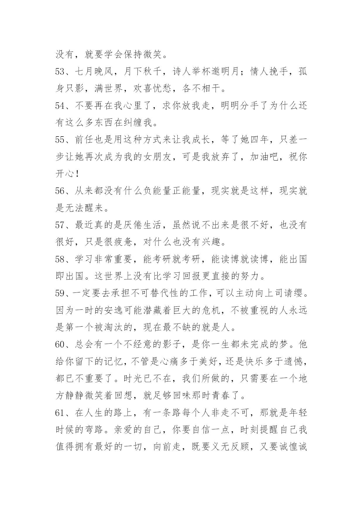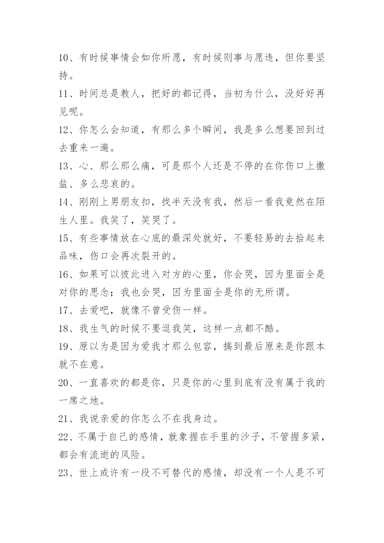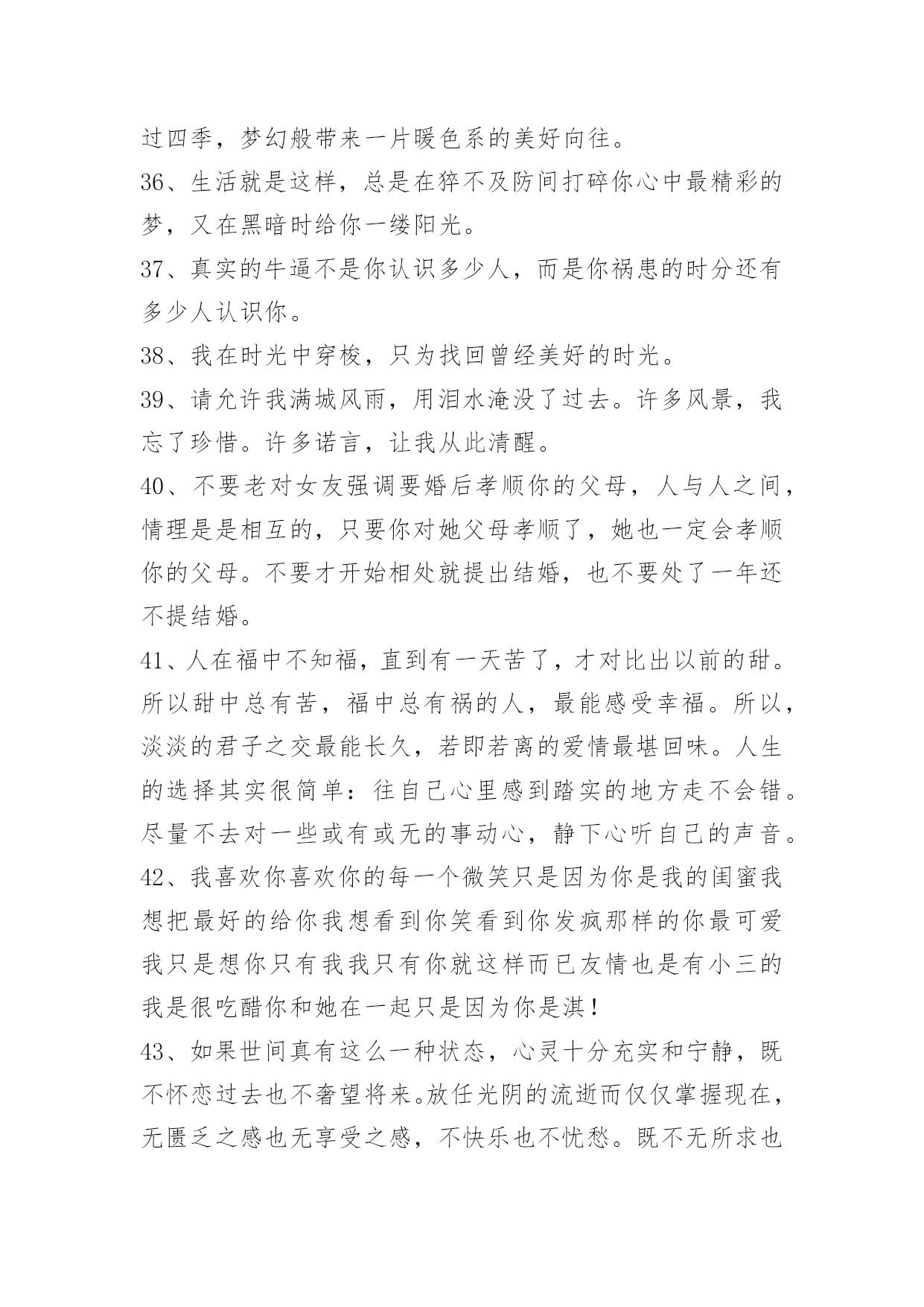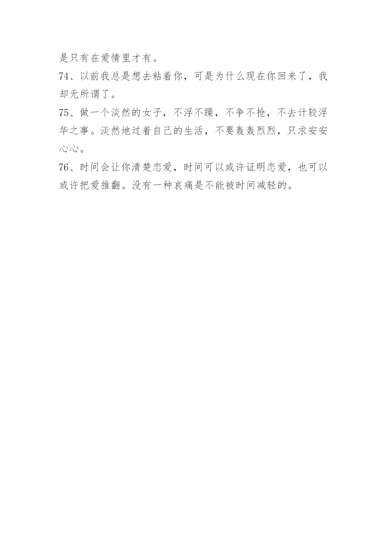 情感语录摘录76条精选情感语录摘录76条人的一生,本就是一个认人、识人的过程。有的人起始于相逢,终止于相处;有的人曾经入了眼,如今离了心。以下是关于情感语录76条,仅供参考,欢迎大家阅读。1、←¢東方有火紅的希朢,南方有温煖的巢牀,向西逐退成陽,向北唤醒芬芳。☆2、告诉,自己忘记那些回忆吧,让一切都顺其自然。3、回忆起绽放的那一个宁夏,仿佛可以触摸彩虹。4、每天晚上他怕我偷偷玩电脑不乖乖睡觉,都会远程控制我电脑亲自给我关机。5、没能参与你的过去。也错过了你的未来。6、我怕冬天、可最喜欢冬天,因为冬天是回家的季节,是唯一在家过的季节。7、有时候我经常问你在哪里?在做什么?并不是想窥探你。而是想通过一次又一次的答案,拼凑还原出一个我并不了解的,生活和世界。8、渴望像孩子一样的生活,高兴时可以毫不掩饰的笑,悲伤时可以无所顾忌地哭,可以快乐的唱歌,可以率真的画画,可以用一颗童真的心去感受生活,可以用一双清澈的眼去观察时间……9、对不起,没想到我对你的问候成了打扰。10、有时候事情会如你所愿,有时候则事与愿违,但你要坚持。11、时间总是教人,把好的都记得,当初为什么,没好好再见呢。12、你怎么会知道,有那么多个瞬间,我是多么想要回到过去重来一遍。13、心、那么那么痛,可是那个人还是不停的在你伤口上撒盐、多么悲哀的。14、刚刚上男朋友扣,找半天没有我,然后一看我竟然在陌生人里。我笑了,笑哭了。15、有些事情放在心底的最深处就好,不要轻易的去拾起来品味,伤口会再次裂开的。16、如果可以彼此进入对方的心里,你会哭,因为里面全是对你的思念;我也会哭,因为里面全是你的无所谓。17、去爱吧,就像不曾受伤一样。18、我生气的时候不要逗我笑,这样一点都不酷。19、原以为是因为爱我才那么包容,搞到最后原来是你跟本就不在意。20、一直喜欢的都是你,只是你的心里到底有没有属于我的一席之地。21、我说亲爱的你怎么不在我身边。22、不属于自己的感情,就象握在手里的沙子,不管握多紧,都会有流逝的风险。23、世上或许有一段不可替代的感情,却没有一个人是不可替代的。24、别把感情寄托在和你不相干的人身上,也别总是嚷嚷着再也不相信爱情了,无意义。25、有时候不是不想去联系,而是觉得没那必要了。26、[情感语录大全]我不断的回忆回忆,这些回忆终究会被自己抹去。27、青春萌动的心绪,总以为还有机会对自己喜欢的人告白,跃跃欲试,最终都湮没在高三枯燥的题海中,等来等去,痴念成空。毕业了,那句话还是没有说出口,是一种遗憾。或许遗憾,也是一种幸福,因为你还有可以让你遗憾的事情,可以让你永铭心底,那已足够了。28、我一直在关注你,用你从未了解的方式。29、天边的白云总会散去,沙漏里的沙砾总会流尽,而岁月里的某些人总会别过,我们彼此心里都明白着,只是都习惯了不去点破这些感伤。30、就算看上去一无所有,至少还有灵魂可以出卖。31、欲相守,难相望,人各天涯愁肠断。爱易逝,恨亦长,灯火阑珊人彷徨。行千山,涉万水,相思路上泪两行。32、我的脸,有你手心的温度。33、分手之后是怎样,也不过是偶尔难过,偶尔流泪,偶尔想你。34、你对我的微笑让我内心感到充实。35、直到手心一丝阳光散落,那偷偷藏匿了整夜的金茫,从指间悄然滑过,伴着我们十七八岁酸涩懵懂的青葱时光,飘过四季,梦幻般带来一片暖色系的美好向往。36、生活就是这样,总是在猝不及防间打碎你心中最精彩的梦,又在黑暗时给你一缕阳光。37、真实的牛逼不是你认识多少人,而是你祸患的时分还有多少人认识你。38、我在时光中穿梭,只为找回曾经美好的时光。39、请允许我满城风雨,用泪水淹没了过去。许多风景,我忘了珍惜。许多诺言,让我从此清醒。40、不要老对女友强调要婚后孝顺你的父母,人与人之间,情理是是相互的,只要你对她父母孝顺了,她也一定会孝顺你的父母。不要才开始相处就提出结婚,也不要处了一年还不提结婚。41、人在福中不知福,直到有一天苦了,才对比出以前的甜。所以甜中总有苦,福中总有祸的人,最能感受幸福。所以,淡淡的君子之交最能长久,若即若离的爱情最堪回味。人生的选择其实很简单:往自己心里感到踏实的地方走不会错。尽量不去对一些或有或无的事动心,静下心听自己的声音。42、我喜欢你喜欢你的每一个微笑只是因为你是我的闺蜜我想把最好的给你我想看到你笑看到你发疯那样的你最可爱我只是想你只有我我只有你就这样而已友情也是有小三的我是很吃醋你和她在一起只是因为你是淇!43、如果世间真有这么一种状态,心灵十分充实和宁静,既不怀恋过去也不奢望将来。放任光阴的流逝而仅仅掌握现在,无匮乏之感也无享受之感,不快乐也不忧愁。既不无所求也无所惧,而只感受到自己的存在,处于这种状态的人就可以说自己得到了幸福。44、我做不了你的.解药,但可以做你的创可贴。45、爱就像风一样,看不到,却能