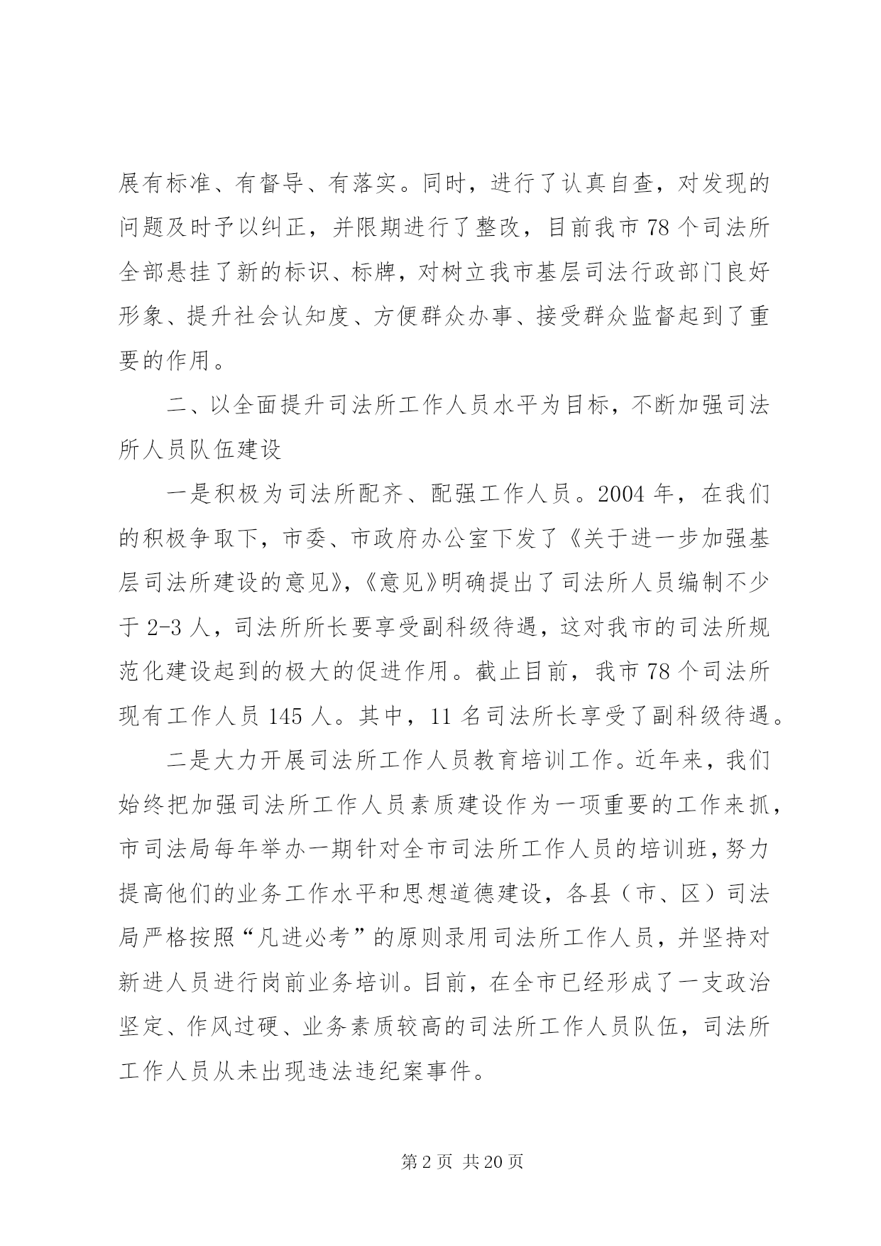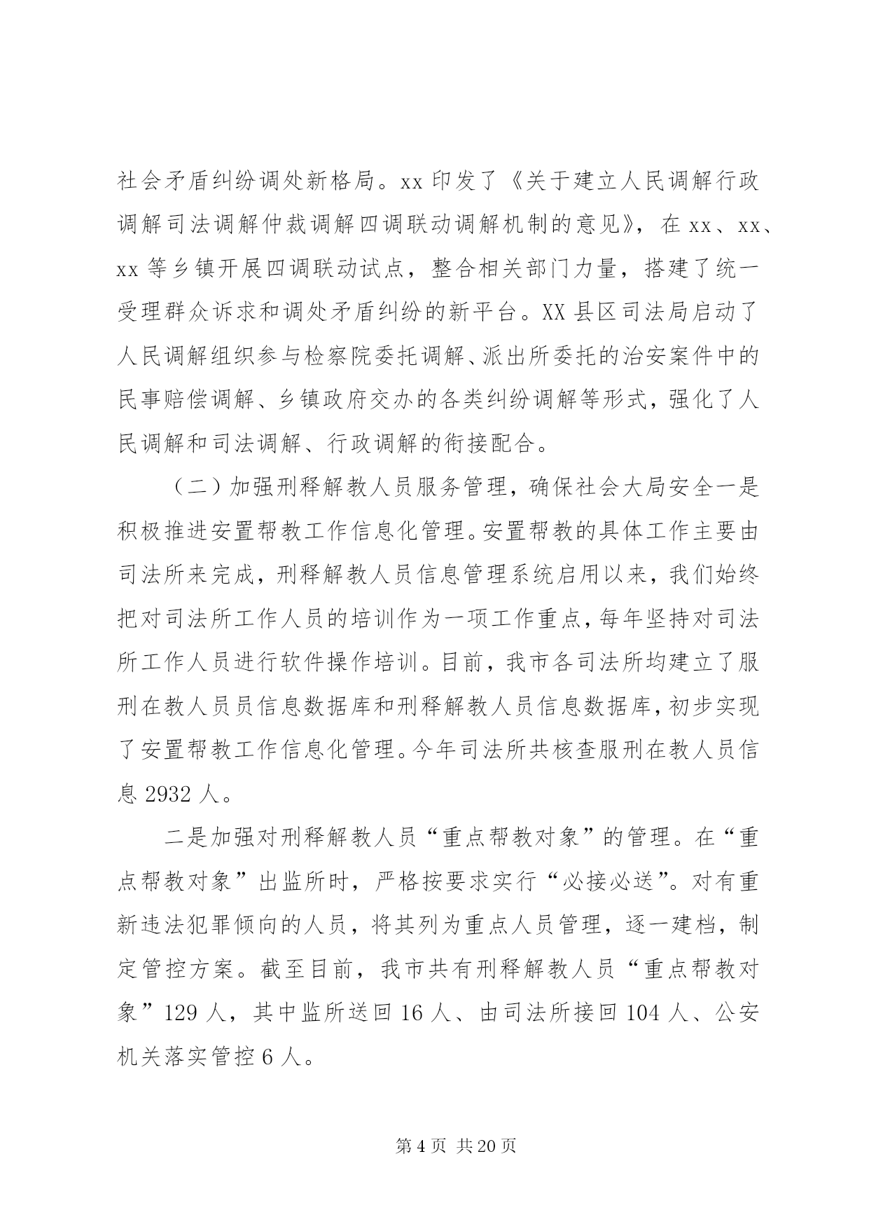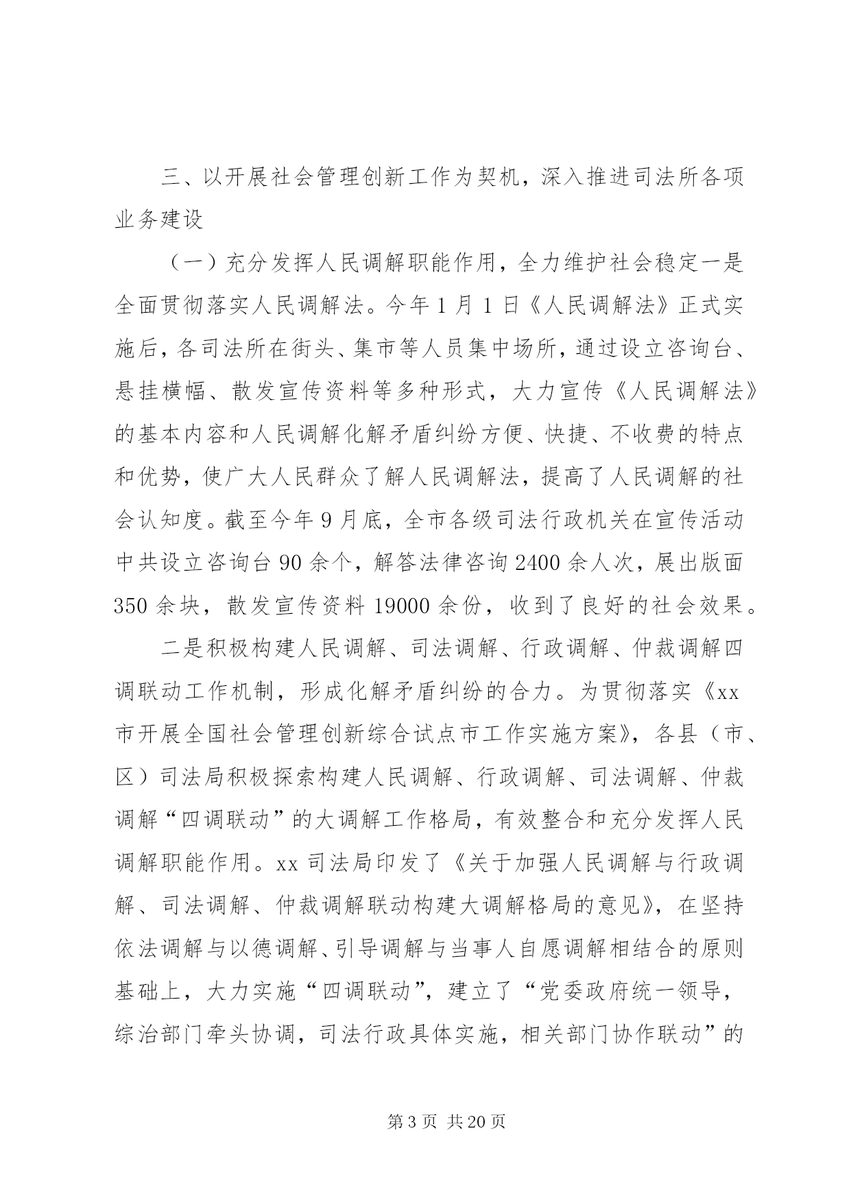 第PAGE\*Arabic\*MERGEFORMAT20页共NUMPAGES\*MERGEFORMAT20页司法所规范化建设总结[大全]为推动我市司法所规范化建设工作的开展,我们严格按照《XX省司法所范化建设实施意见》的要求,进一步强化我市的司法所基础设施建设、人员队伍建设和各项业务建设,取得了一定的成效。一、以司法所国债建设项目为基础,全面推进司法所基础设施建设一是积极争取党委政府支持,积极为司法所配置各类办公设施。截止2008年底,我市前4批67个国债司法所建设项目全部建设完成并投入使用,占全市司法所总数的86%,司法所工作人员的办公环境得到了极大的改善。在此基础上,我市各级司法行政机关利用新所建成的有利时机,积极争取资金,在几年的时间里,为司法所配备了新的办公桌椅、电脑、打印机等办公设施,条件好的县(市、区)还为司法所配备了汽车、摩托车等交通工具,现在我市78个司法所拥有汽车20辆,摩托车28辆,电脑80余台,极大的提高了司法所工作人员的工作积极性。二是统一规范司法所标识,全力打造司法所新形象。司法所标识直接关系司法所的外在形象,从一定程度反映了司法所的管理体制、工作机制和业务开展。我们将司法所标识工作作为规范化司法所建设的重要内容,纳入全年责任目标进行考核,下发了《关于司法所标识统一规范使用有关情况的通知》,确保工作开展有标准、有督导、有落实。同时,进行了认真自查,对发现的问题及时予以纠正,并限期进行了整改,目前我市78个司法所全部悬挂了新的标识、标牌,对树立我市基层司法行政部门良好形象、提升社会认知度、方便群众办事、接受群众监督起到了重要的作用。二、以全面提升司法所工作人员水平为目标,不断加强司法所人员队伍建设一是积极为司法所配齐、配强工作人员。2004年,在我们的积极争取下,市委、市政府办公室下发了《关于进一步加强基层司法所建设的意见》,《意见》明确提出了司法所人员编制不少于2-3人,司法所所长要享受副科级待遇,这对我市的司法所规范化建设起到的极大的促进作用。截止目前,我市78个司法所现有工作人员145人。其中,11名司法所长享受了副科级待遇。二是大力开展司法所工作人员教育培训工作。近年来,我们始终把加强司法所工作人员素质建设作为一项重要的工作来抓,市司法局每年举办一期针对全市司法所工作人员的培训班,努力提高他们的业务工作水平和思想道德建设,各县(市、区)司法局严格按照“凡进必考”的原则录用司法所工作人员,并坚持对新进人员进行岗前业务培训。目前,在全市已经形成了一支政治坚定、作风过硬、业务素质较高的司法所工作人员队伍,司法所工作人员从未出现违法违纪案事件。三、以开展社会管理创新工作为契机,深入推进司法所各项业务建设(一)充分发挥人民调解职能作用,全力维护社会稳定一是全面贯彻落实人民调解法。今年1月1日《人民调解法》正式实施后,各司法所在街头、集市等人员集中场所,通过设立咨询台、悬挂横幅、散发宣传资料等多种形式,大力宣传《人民调解法》的基本内容和人民调解化解矛盾纠纷方便、快捷、不收费的特点和优势,使广大人民群众了解人民调解法,提高了人民调解的社会认知度。截至今年9月底,全市各级司法行政机关在宣传活动中共设立咨询台90余个,解答法律咨询2400余人次,展出版面350余块,散发宣传资料19000余份,收到了良好的社会效果。二是积极构建人民调解、司法调解、行政调解、仲裁调解四调联动工作机制,形成化解矛盾纠纷的合力。为贯彻落实《xx市开展全国社会管理创新综合试点市工作实施方案》,各县(市、区)司法局积极探索构建人民调解、行政调解、司法调解、仲裁调解“四调联动”的大调解工作格局,有效整合和充分发挥人民调解职能作用。xx司法局印发了《关于加强人民调解与行政调解、司法调解、仲裁调解联动构建大调解格局的意见》,在坚持依法调解与以德调解、引导调解与当事人自愿调解相结合的原则基础上,大力实施“四调联动”,建立了“党委政府统一领导,综治部门牵头协调,司法行政具体实施,相关部门协作联动”的社会矛盾纠纷调处新格局。xx印发了《关于建立人民调解行政调解司法调解仲裁调解四调联动调解机制的意见》,在xx、xx、xx等乡镇开展四调联动试点,整合相关部门力量,搭建了统一受理群众诉求和调处矛盾纠纷的新平台。XX县区司法局启动了人民调解组织参与检察院委托调解、派出所委托的治安案件中的民事赔偿调解、乡镇政府交办的各类纠纷调解等形式,强化了人民调解和司法调解、行政调解的衔接配合。(二)加强刑释解教人员服务管理,确保社会大局安全一是积极推进安置帮教工作信息化管理。安置帮教的具体工作主要由司法所来完成,刑释解教人员信息管理系统启用以来,我们始终把对司法所工作人员的培训作为一项工作重点,每年坚持对司法所工作人员进行软件操作培训。目前,我市各
