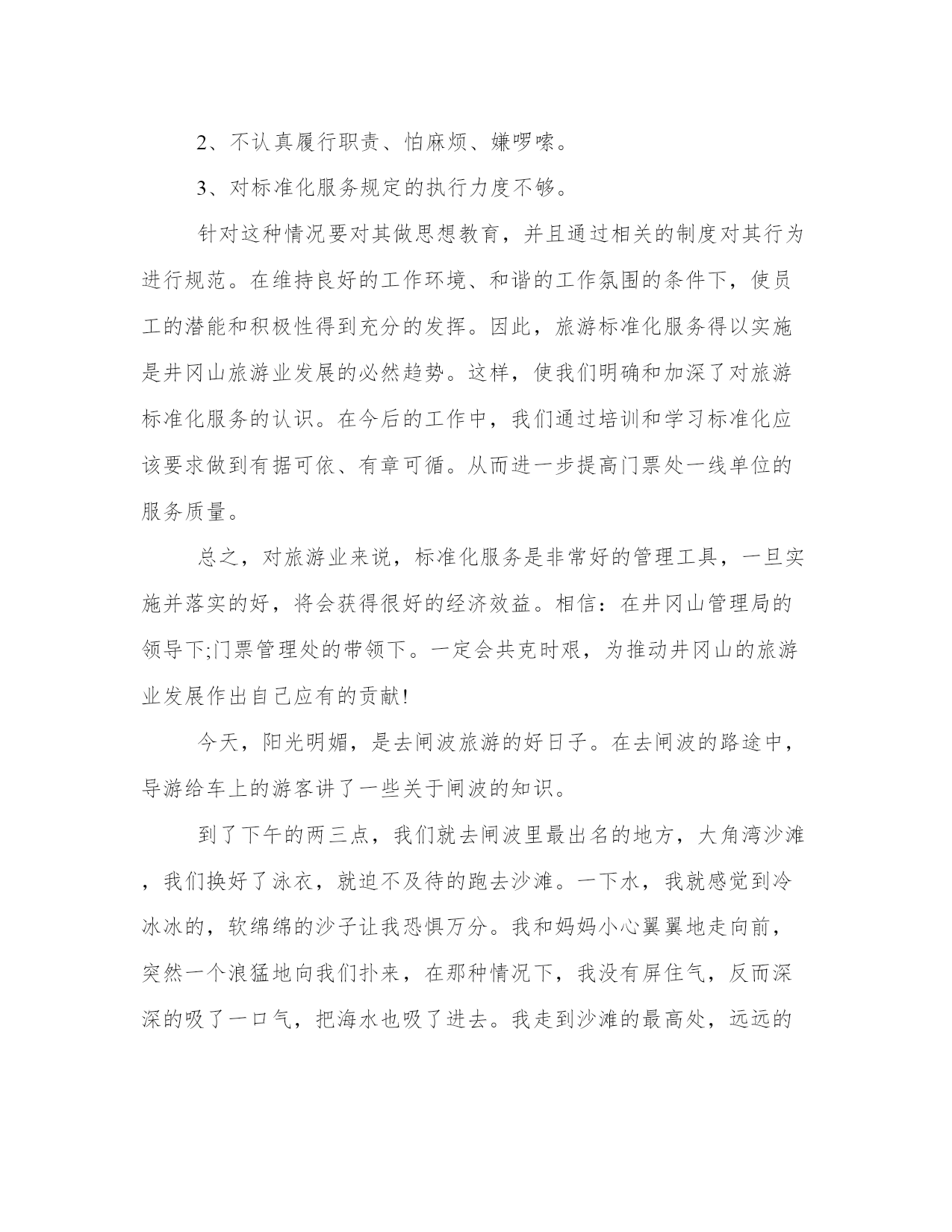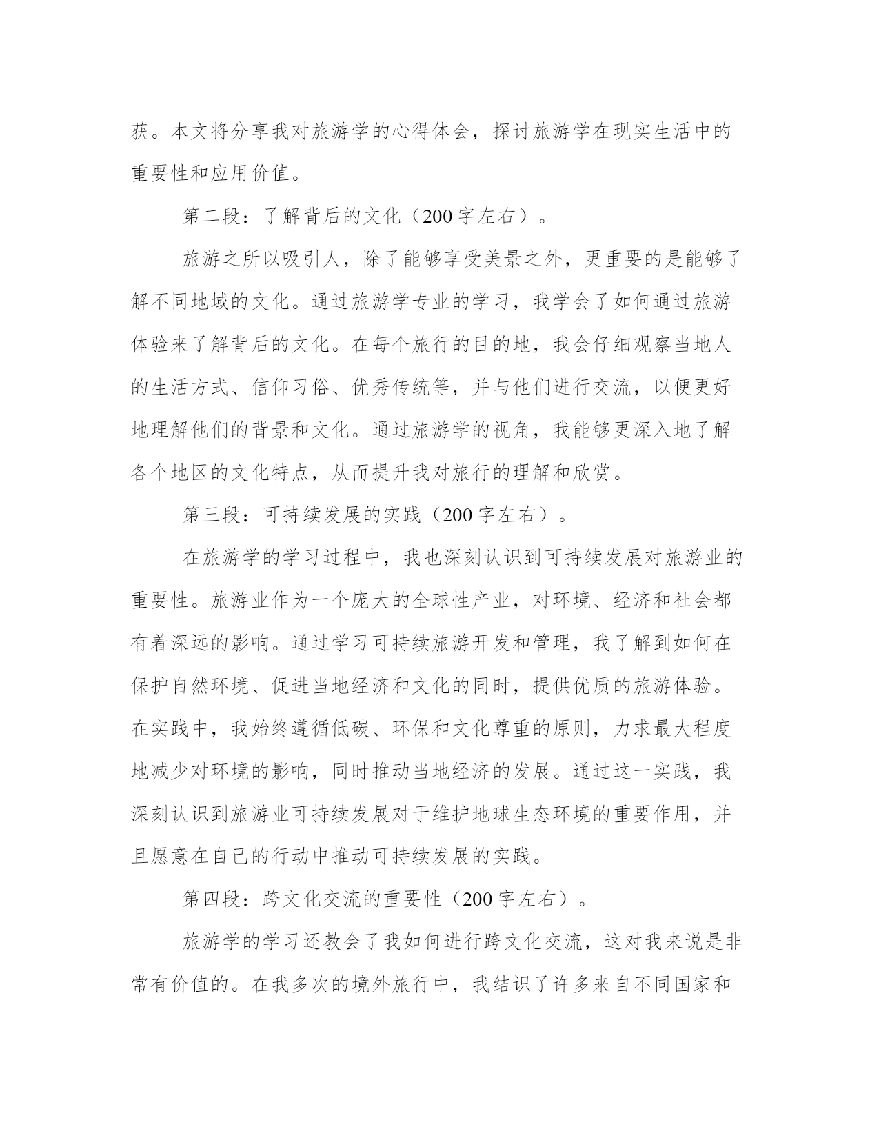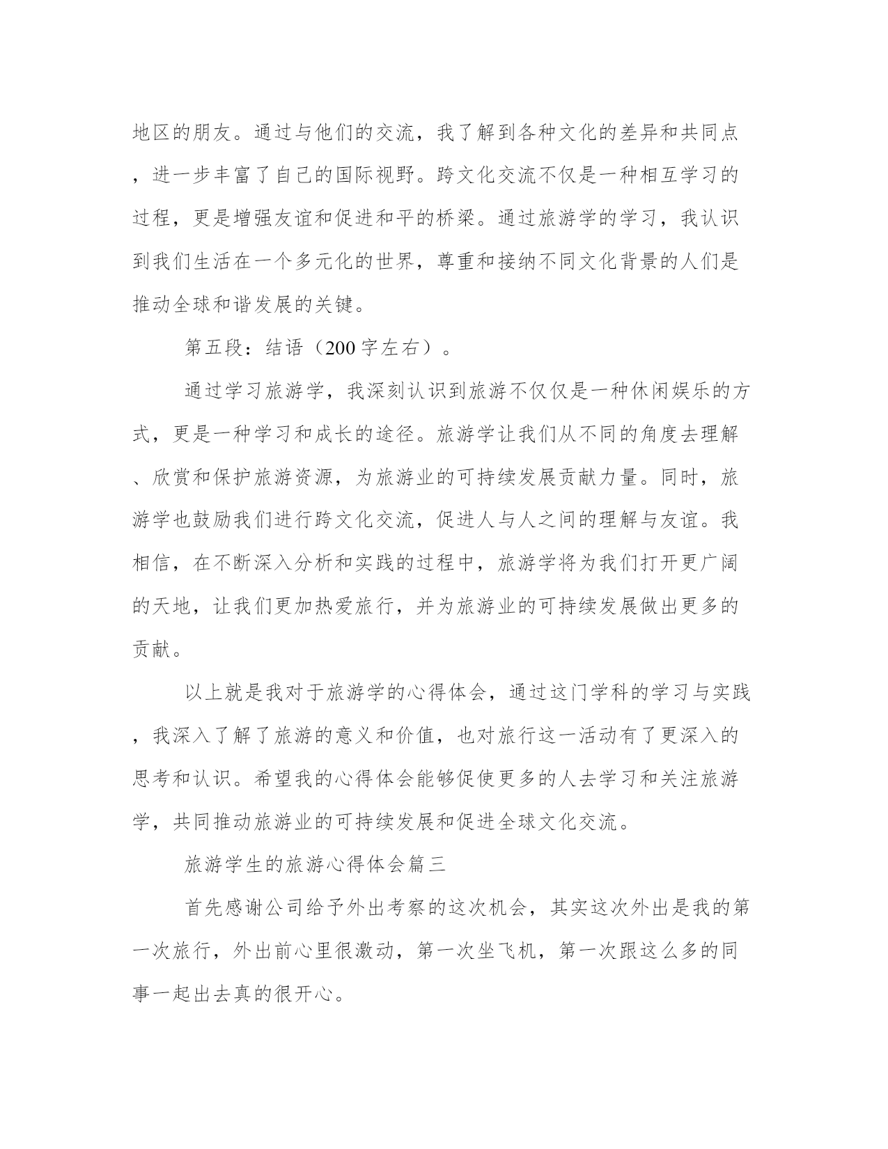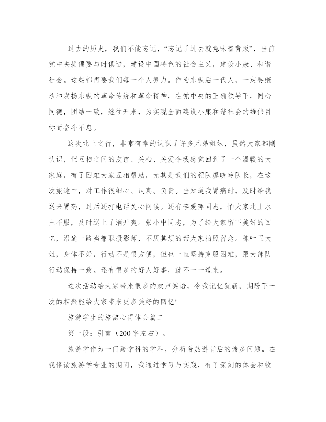 旅游学生的旅游心得体会范文(22篇)我经历了一些挑战,但最终取得了成功。在写心得体会时,可以适当运用一些图表和数据,使文章更加具体和可信。下面是一些名人的心得体会,希望能给大家的思考带来新的角度。旅游学生的旅游心得体会篇一这次参加东江纵队后代东战役红色之旅,沿着先辈们北上战斗的足迹,我们参观了淮海战役纪念馆、台儿庄战役纪念馆、微山湖铁道游击队纪念馆等,缅怀那些为了争取民族独立,而英勇献身的烈士们。这些纪念馆,是一座座历史丰碑,它记载了中国共产党抗日救国的宏伟历程,它焕发出凛然正气,永远激励我们这些子孙后代为中华民族的振兴发展而努力奋斗。我的父亲,当年服从组织安排留下坚持战斗,东纵北撤后,他们远离部队主力,在敌、伪顽固夹击的情况下,紧密依靠群众,坚持独立自主的游击战争方针,英勇打击敌人,深入开辟敌后战场,激发人民抗战热情,使部队不断的发展壮大,为中华民族的解放事业做出了不可磨灭的贡献。我们是生在新中国,长在红旗下,在党的教育培养下成长起来的一代,肩负着祖国承前启后的重任,为国家的发展壮大,负有不可推卸的责任。过去的历史,我们不能忘记,“忘记了过去就意味着背叛”,当前党中央提倡要与时俱进,建设中国特色的社会主义,建设小康、和谐社会。这些都需要我们每一个人努力。作为东纵后一代人,一定要继承和发扬东纵的革命传统和革命精神,在党中央的正确领导下,同心同德,团结一致,继往开来,为实现全面建设小康和谐社会的雄伟目标而奋斗不息。这次北上之行,非常有幸的认识了许多兄弟姐妹,虽然大家都刚认识,但互相之间的友谊、关心、关爱令我感觉回到了一个温暖的大家庭,有了困难大家互相帮助,尤其是我们的领队廖晓玲队长,在这次旅途中,对工作很细心、认真、负责。当知道我胃痛时,及时给我送来胃药,过后还打电话关心问候。还有李爱萍同志,怕大家北上水土不服,及时送上了消开爽。张小中同志,为了给大家留下美好的回忆,沿途一路当兼职摄影师,不厌其烦的帮大家拍照留念。陈叶卫大姐,身体不好,行动不是很方便,但也一直坚持克服困难,跟大部队行动保持一致。还有很多的好人好事,就不一一道来。这次活动给大家带来很多的欢声笑语,令我记忆犹新。期盼下一次的相聚能给大家带来更多美好的回忆!旅游学生的旅游心得体会篇二第一段:引言(200字左右)。旅游学作为一门跨学科的学科,分析着旅游背后的诸多问题。在我修读旅游学专业的期间,我通过学习与实践,有了深刻的体会和收获。本文将分享我对旅游学的心得体会,探讨旅游学在现实生活中的重要性和应用价值。第二段:了解背后的文化(200字左右)。旅游之所以吸引人,除了能够享受美景之外,更重要的是能够了解不同地域的文化。通过旅游学专业的学习,我学会了如何通过旅游体验来了解背后的文化。在每个旅行的目的地,我会仔细观察当地人的生活方式、信仰习俗、优秀传统等,并与他们进行交流,以便更好地理解他们的背景和文化。通过旅游学的视角,我能够更深入地了解各个地区的文化特点,从而提升我对旅行的理解和欣赏。第三段:可持续发展的实践(200字左右)。在旅游学的学习过程中,我也深刻认识到可持续发展对旅游业的重要性。旅游业作为一个庞大的全球性产业,对环境、经济和社会都有着深远的影响。通过学习可持续旅游开发和管理,我了解到如何在保护自然环境、促进当地经济和文化的同时,提供优质的旅游体验。在实践中,我始终遵循低碳、环保和文化尊重的原则,力求最大程度地减少对环境的影响,同时推动当地经济的发展。通过这一实践,我深刻认识到旅游业可持续发展对于维护地球生态环境的重要作用,并且愿意在自己的行动中推动可持续发展的实践。第四段:跨文化交流的重要性(200字左右)。旅游学的学习还教会了我如何进行跨文化交流,这对我来说是非常有价值的。在我多次的境外旅行中,我结识了许多来自不同国家和地区的朋友。通过与他们的交流,我了解到各种文化的差异和共同点,进一步丰富了自己的国际视野。跨文化交流不仅是一种相互学习的过程,更是增强友谊和促进和平的桥梁。通过旅游学的学习,我认识到我们生活在一个多元化的世界,尊重和接纳不同文化背景的人们是推动全球和谐发展的关键。第五段:结语(200字左右)。通过学习旅游学,我深刻认识到旅游不仅仅是一种休闲娱乐的方式,更是一种学习和成长的途径。旅游学让我们从不同的角度去理解、欣赏和保护旅游资源,为旅游业的可持续发展贡献力量。同时,旅游学也鼓励我们进行跨文化交流,促进人与人之间的理解与友谊。我相信,在不断深入分析和实践的过程中,旅游学将为我们打开更广阔的天地,让我们更加热爱旅行,并为旅游业的可持续发展做出更多的贡献。以上就是我对于旅游学的心得体会,通过这门学科的学习与实践,我深入了解了旅游的意义和价值,也对旅行这一活动有了更深入的思考和认识。希望我的心得体会能够促使更多的