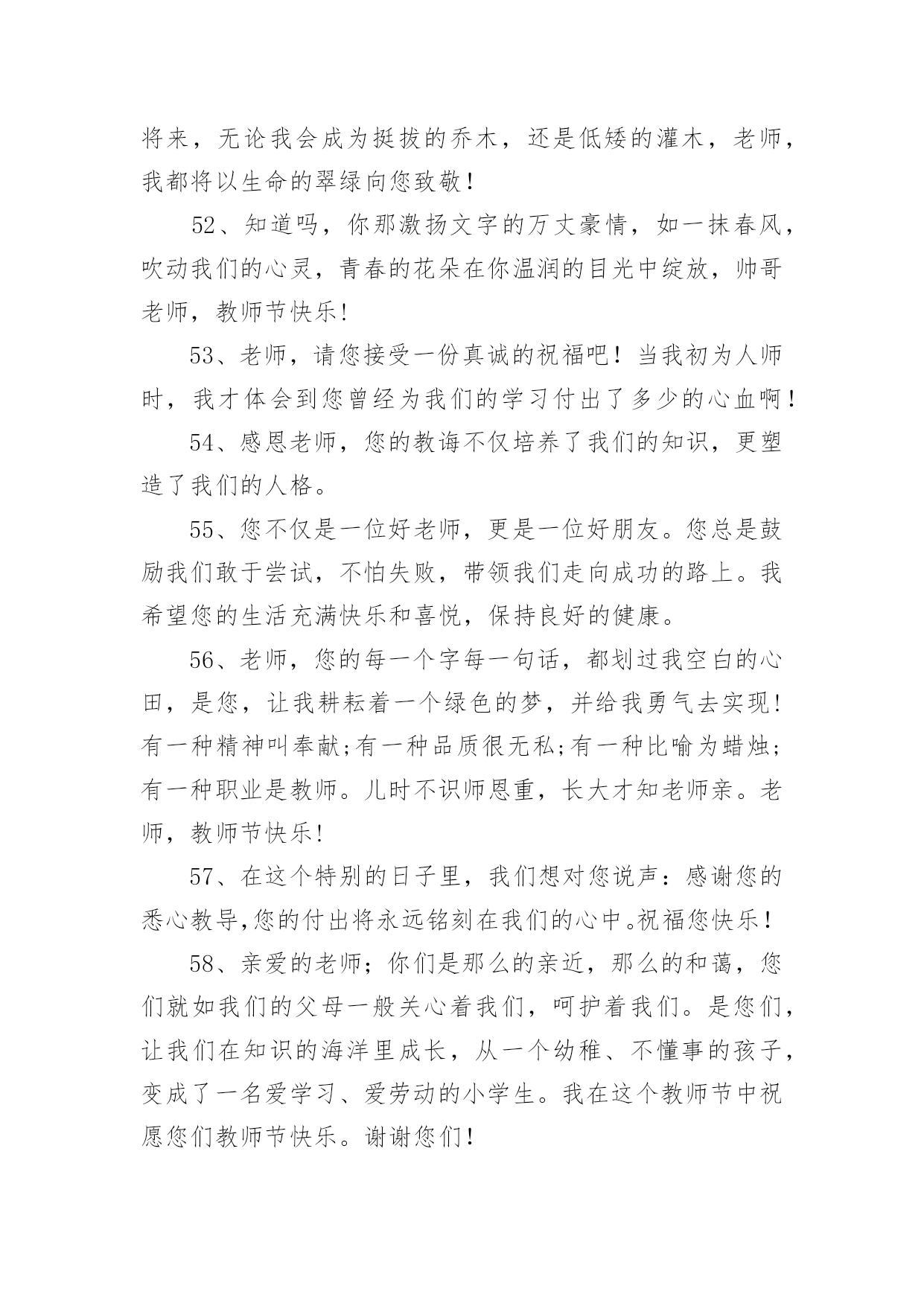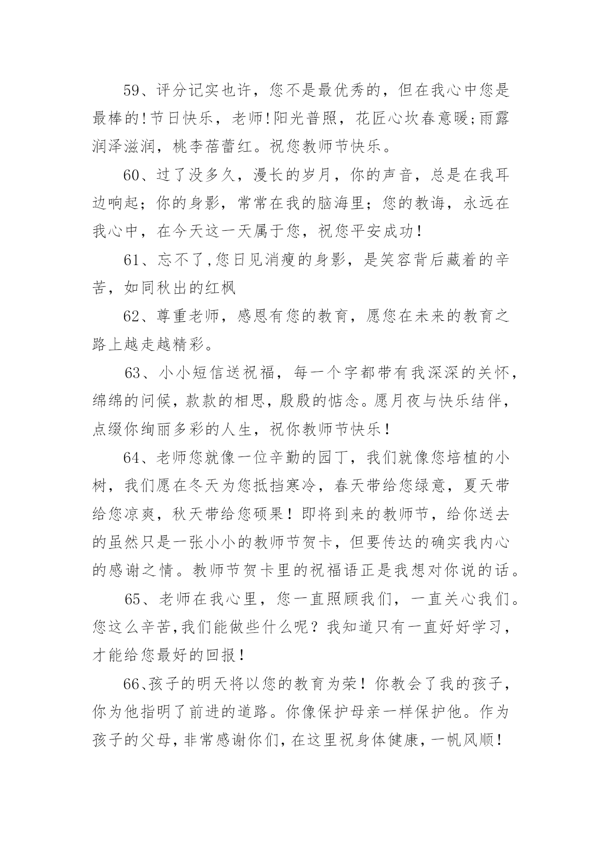学生给教师节祝福语文案学生给教师节祝福语文案在日复一日的学习、工作或生活中,大家都有写祝福语的经历,对祝福语很是熟悉吧,祝福语是指对人们的美好祝福的语句。你所见过的祝福语是什么样的呢?下面是小编收集整理的学生给教师节祝福语文案,仅供参考,大家一起来看看吧。1、在这个神圣的日子里,深深的祝福您:节日快乐。2、老师们,岁月如梭,原来在不经意,我与您们分别了许久。在翻阅曾经的照片,我突然发现您们与同学的合影,看到了您的和蔼可亲的面容,不禁想起您的教导,老师,你辛苦了。祝您教师节快乐。3、导师教诲如春风,让中职学生的心田绽放美丽;感恩之情如江河,滋润我们一生。教师节快乐!4、如果我是一个诗人,我会用满腔的热情写下千千万万首美丽的诗篇,赞美我亲爱的老师。我是诗人吗?没有,所以我只能借这条短信来表达我的祝福:老师,节日快乐!5、小学里是一杯饮料,我很淘气,你也就宠溺;中学里是一杯烈酒,我爱叛逆,你倒也洒脱;大学里是一杯啤酒,我有话说,你自愿聆听;毕业后是一杯清茶,我差不多沉淀,您也要健康。友爱的老师,教师节来到,愿你工作顺利,躯体安康!6、祝走过风雨的您,在老师节这个特别的日子里找到快乐和幸福!7、曾经数得尽分数,却数不尽您的教诲;如今数得尽钞票,却数不尽您的恩情;谆谆教诲,如影随形,伴我今生,刻骨铭心。在节日里想对您说声:谢谢您,您辛苦了!教师节快乐!!8、为什么从前的我不珍惜时间呢?老师有什么要我们给您办的事情吗?有的话,快说吧,千万别客气哟。其实这对我们来说是一种安慰呢,真的!9、阳光普照,园丁心坎春意浓;甘雨滋润,桃李枝头蓓蕾红。无尽的恩情,永远铭记心中。每个成长的日子里,我都要祝福你,我的老师。祝您节日愉快!10、宋朝时,岳武穆王的老师周同的力气很大,可以拉开三百斤的弓箭。当周同死了之后,每到初一、十五,岳武穆王一定到老师的墓前祭拜,并且痛哭一番。在痛哭后,必定会拿起老师所送的三百斤的弓发出三支箭才回去。他这份念念不忘师恩的真情,正是他日后精忠报国的忠心。11、如果没有您,我无法知道自己的不足;如果没有您,我无法领略知识的快乐;如果没有您,我无法憧憬美好的明天。12、您是一把伞,为我们撑出一片天;您是一盏灯,为我们照亮人生路;您是智慧的源泉,您是进步的灵魂!教师节来临之际,祝您身体健康,幸福无疆!57是您,传授给我知识;是您,教我读懂人生;是您,为我指明方向!如今,我用您教会我的一笔一划,编织一条充满祝福的短信:老师,节日快乐!13、身为中职学生的我们,感谢每一位教师,因为您们让我们自信满满地迎接未来的挑战。祝教师节愉快!14、祝您度过一个愉快的老师节,永远充满自信和勇气!15、老师,您让我们品尝到知识的甘甜,感受到了成长的快乐。祝福您,节日快乐,永远青春美丽!16、老师,您好吗?很想您,但请相信:无论我们身在何方都不会忘记您--我最亲爱的老师!17、没有你就没有我的今天,谢谢你,老师。祝您教师节快乐!18、祝老师们永远健康平安,不断发扬伟大的教育事业!19、亲爱的老师,今天是教师节,我想对您说一声感谢,让您知道我一直很感激您对我的关心和指导。20、时间:教师节;地点:世界每一个角落;人物:学生、家长和老师;事情:送上最真诚的最温馨的最甜蜜的最感激的祝福;目的:感谢老师的教导,祝老师节日快乐!不计辛劳只奉献,三尺讲台,夜灯长明,两鬓飞白混不见,赤诚之心不一般,桃李天下,香满人间,英才济济笑开颜,教师节感恩无限,真挚祝福,真心相传,唯愿您安康永远!21、人生旅程上您为我点燃希望的光芒丰富我的心灵,增添我的智慧谢谢您!老师,愿您永远健康!愉快!幸福22、你总说没有学可不能的知识,可是,这么多年,你依然学可不能歇息;你总说没有过别去的坎,可是,这么多年,你依然每天疲乏了深夜;我们最友爱的老师啊,教师节来到,愿你学会歇息,放下疲乏。23、对于我来说,您就像一位能教会我生活的老师。无论我面对什么问题,您总是能够给我支持和指引。感谢您的教诲,让我比以前更懂得在生活中如何做出正确的选择。24、没有任何困难对我们来说是困难的,因为我们的意志变得坚强了;任何挫折都不能击退我们,因为我们的心态成熟了;让我们茁壮成长,让我们绽放芬芳的,是您我亲爱的老师,教师节就要到了,我非常想念您,祝您永远年轻,永远健康。25、今天教师节,教你盖世神功:教你养生—天天保持好心情;教你工作—一张一弛懂休息;教你煅炼—找个时间多运动;教你尊师重教,快跟为师说声节日快乐!26、亲爱的老师,我已经忙了一年了。你们的节日又到了。同学们想对您说,无论何时何地,您永远是我的老师!我们爱你。请接受同学们最美好的祝愿,祝教师节快乐,天天快乐,幸福安康。27、加、减、乘、除,他们付出了辛勤的劳动;诗和赋,赞美他们的贡献;ABCD,感谢他们孜孜不倦的指导;东与西,南与北,不向自己祝福