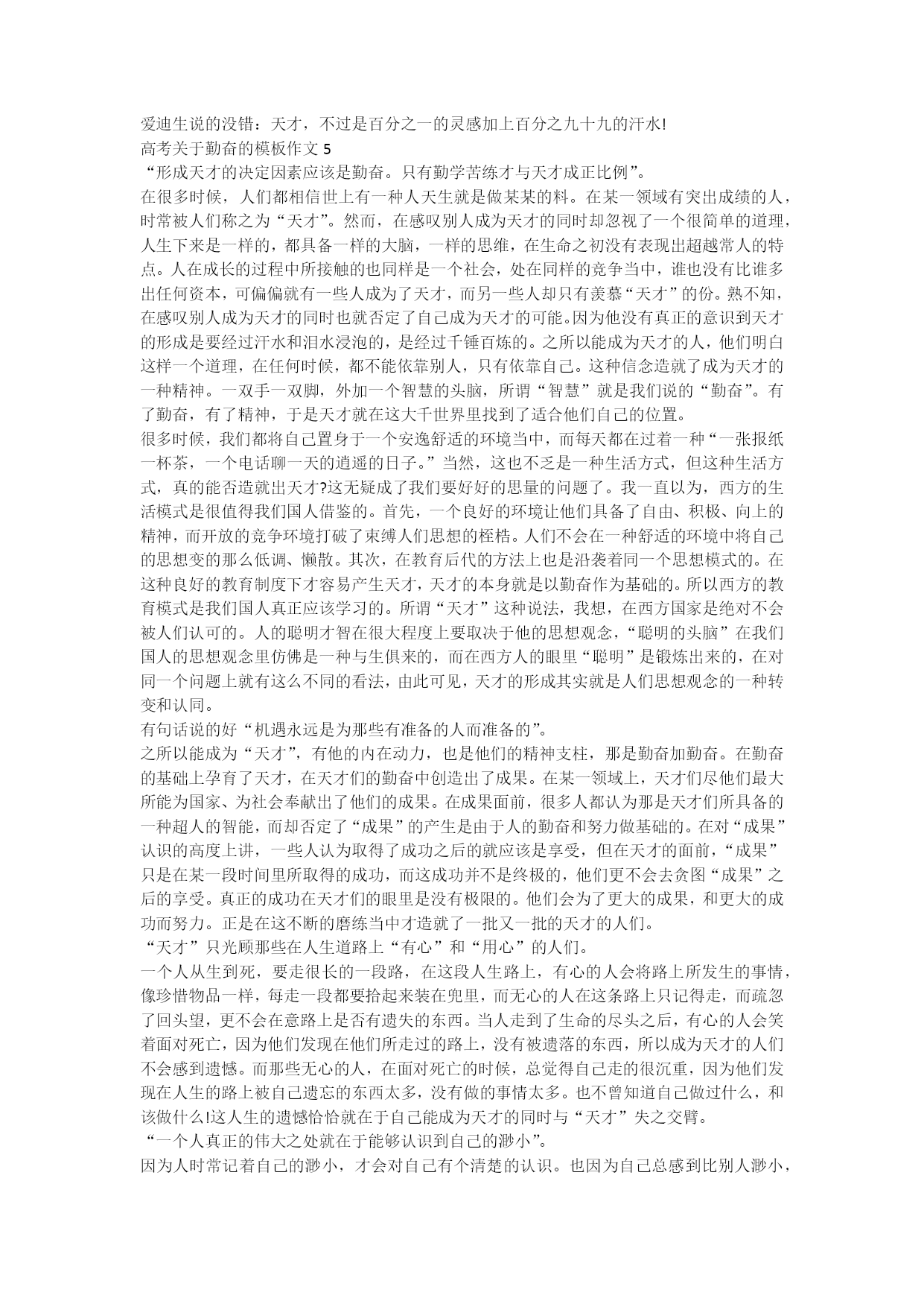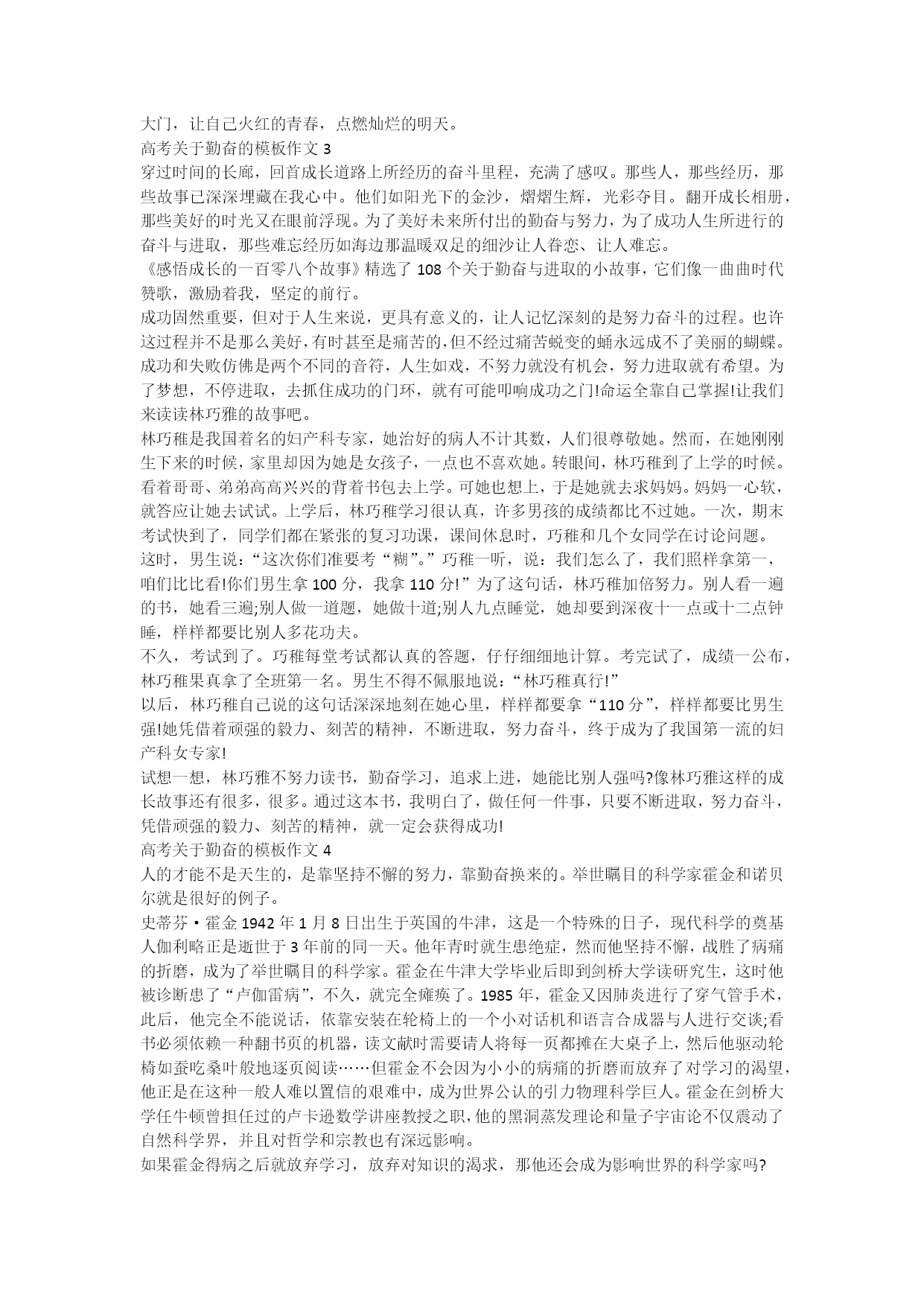 高考关于勤奋的模板作文古人云:“一勤天下无难事。”只要我们好好学习,什么事难不到我们,否则咋会有天才呢?若谈“勤能补拙”,倒是如此。勤,勤奋;拙,笨拙。只要勤奋,就会“水滴石穿,绳锯木断”。让我们一起来看看关于高考关于勤奋的模板作文,希望能对您有所帮助,欢迎大家查阅学习!高考关于勤奋的模板作文1财富有很多种,善良是一种财富,聪明是一种财富,而勤奋也是一种财富。一次学校要大扫除,那是我正读五年级,是班上的劳动委员,在大扫除的前一节课老师让我分配人手,并让我提高一下我们班上的土气,我说:“为了班上的荣誉,让我们一起努力。勤奋一点。”大扫除的时候大家果然很卖力,那一次我们班的卫生评比是排第一,当老师表扬我们的时候我们收获了勤奋的财富。还有一次,我爸爸去吉安参加比赛,所以他要在家备赛,而当时妈妈又去出差了,那时我为了让爸爸安心备赛,保好包了所有的家务活,甚至是做饭菜,而爸爸他每天都要读到十二点钟,而我只能和他一起背水一战了,当时我们的勤奋使爸爸能安心备赛,而爸爸的勤奋使他得到了“荣誉证书”,同时也得到勤奋的财富。在六年级时,我要去参加数学竞赛,为了能夺得第一名的好成绩我就买了一本竞赛的书,天天写,天天练,吃饭时也写,上厕所时也看,而这些题目好难呀,所以每天要很晚去睡,那时真的好累呀,但我去拿回了第一名的成绩,那时我才真正体会到勤奋的财富,真的好重呀!勤奋也是一种财富,就看你能不能得到这些财富?看你是不是能发现更多勤奋的财富吧,努力吧,加油吧,让我们得到更多勤奋的财富吧。高考关于勤奋的模板作文2成功与勤奋是密不可分的,如果想获得成功就必须通过勤奋的努力,俗话说的好:“一份耕耘,一份收获。”没有辛勤的付出哪能有成功的源泉。成功的路上无捷径,只有勤奋才是成功的源泉。东晋大书法家王羲之,为了练好书法,他每天都要求自己练字,练完后就在家边的一口池塘里洗毛笔,就这样日复一日,竟将整口池塘的水染成了黑色。正是因为王羲之的坚持与勤奋,他才被人称为“书圣”。苏秦,因为求官不成,回家后被人家看不起,他就将太公《六韬》、《阴符》等兵法书籍,不分白天黑夜的勤奋苦读。每当到了夜深人静,头昏脑胀,眼睛发涩,总想睡觉的时候,他就用锥子狠刺自己的大腿,使自己清醒后在读书。正是由于苏秦的勤奋,终于他学有所成,成为战国时期着名的政治活动家。从古人的实例中我们知道了要想成功就必须要勤奋刻苦,因为勤奋是成功的基础。我国着名的生物学家童第周,上中学时,考试不及格,老师要让他留级,同学们也笑话他,但他却不悲观失望,而是发奋学习,最后取得了优异成绩。出国留学时他又刻苦钻研,为中国人争了气,成了我国着名的生物学家。科学家居里夫人也是孜孜不倦,勤奋探索才发现了“镭”,为人类做出了巨大的贡献。身残志坚的张海迪虽然没有上过学,但她勤奋刻苦,克服了常人无法想象的困难,硬是攻克了几门外语。他们能取得这样的成就不就是勤奋的结果吗?试问,如过他们不勤奋,他们会有今天的成就吗?成功总是与勤奋形影不离,正如高尔基所言:“天才源于勤奋”。正是由于勤奋司马迁才写成震古烁今的文学巨着《史记》。正是由于勤奋陈景润才摘取了“皇冠上的明珠”,成为着名的数学家。正是由于勤奋居里夫人才发现了“镭”。勤奋是通往成功的重要保障,俗话说“一勤天下无难事。”只要勤奋就没有办不到的事情。所以,让我们一起来勤奋学习吧!为将来打下良好的基础!朋友,让我们扬起自信的风帆,用勤奋去攀登智慧的巅峰,用勤奋这把金钥匙去打开成功的大门,让自己火红的青春,点燃灿烂的明天。高考关于勤奋的模板作文3穿过时间的长廊,回首成长道路上所经历的奋斗里程,充满了感叹。那些人,那些经历,那些故事已深深埋藏在我心中。他们如阳光下的金沙,熠熠生辉,光彩夺目。翻开成长相册,那些美好的时光又在眼前浮现。为了美好未来所付出的勤奋与努力,为了成功人生所进行的奋斗与进取,那些难忘经历如海边那温暖双足的细沙让人眷恋、让人难忘。《感悟成长的一百零八个故事》精选了108个关于勤奋与进取的小故事,它们像一曲曲时代赞歌,激励着我,坚定的前行。成功固然重要,但对于人生来说,更具有意义的,让人记忆深刻的是努力奋斗的过程。也许这过程并不是那么美好,有时甚至是痛苦的,但不经过痛苦蜕变的蛹永远成不了美丽的蝴蝶。成功和失败仿佛是两个不同的音符,人生如戏,不努力就没有机会,努力进取就有希望。为了梦想,不停进取,去抓住成功的门环,就有可能叩响成功之门!命运全靠自己掌握!让我们来读读林巧雅的故事吧。林巧稚是我国着名的妇产科专家,她治好的病人不计其数,人们很尊敬她。然而,在她刚刚生下来的时候,家里却因为她是女孩子,一点也不喜欢她。转眼间,林巧稚到了上学的时候。看着哥哥、弟弟高高兴兴的背着书包去上学。可她也想上,于是她就去求妈妈。妈妈一心软,就答应让她去试试。上