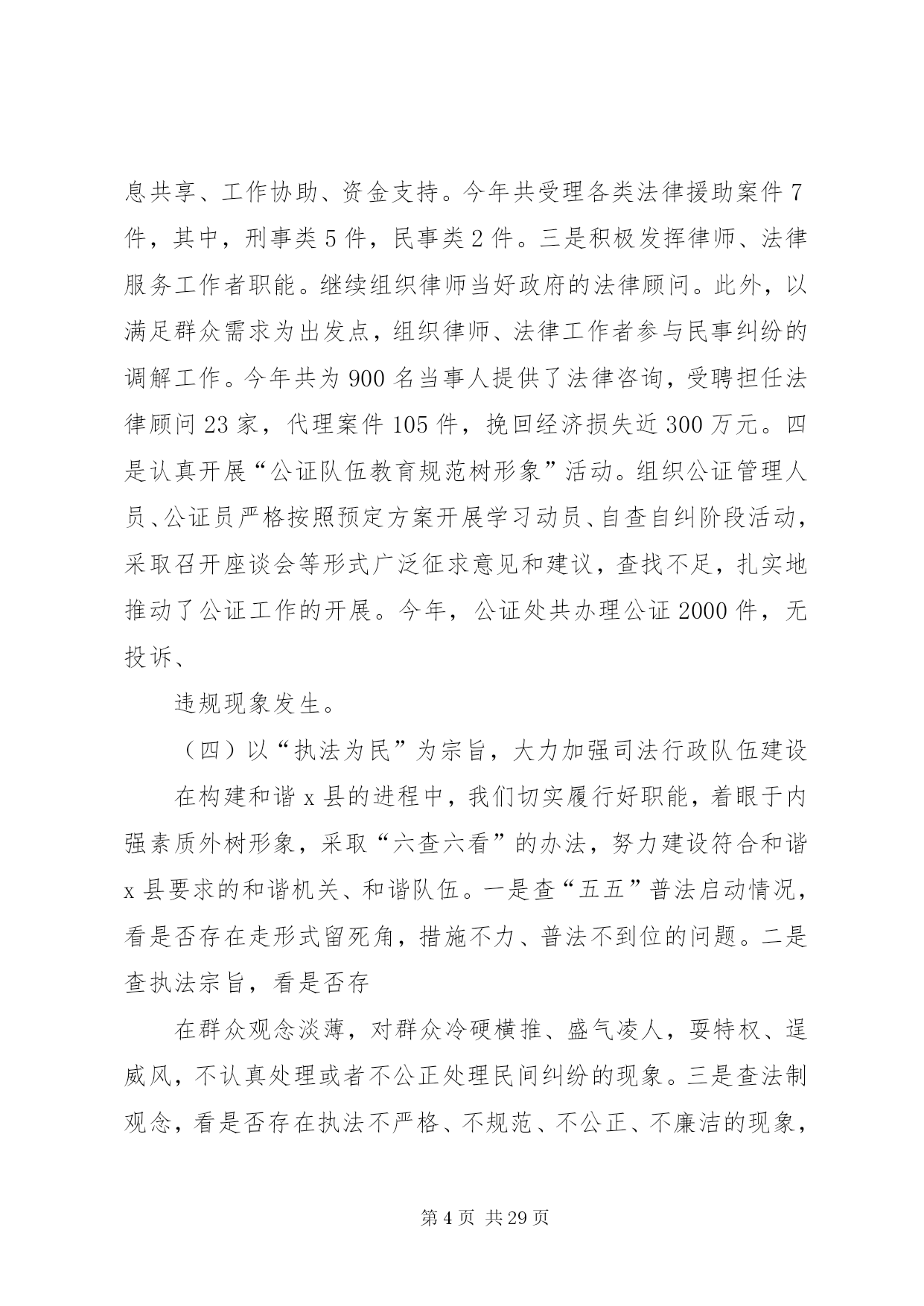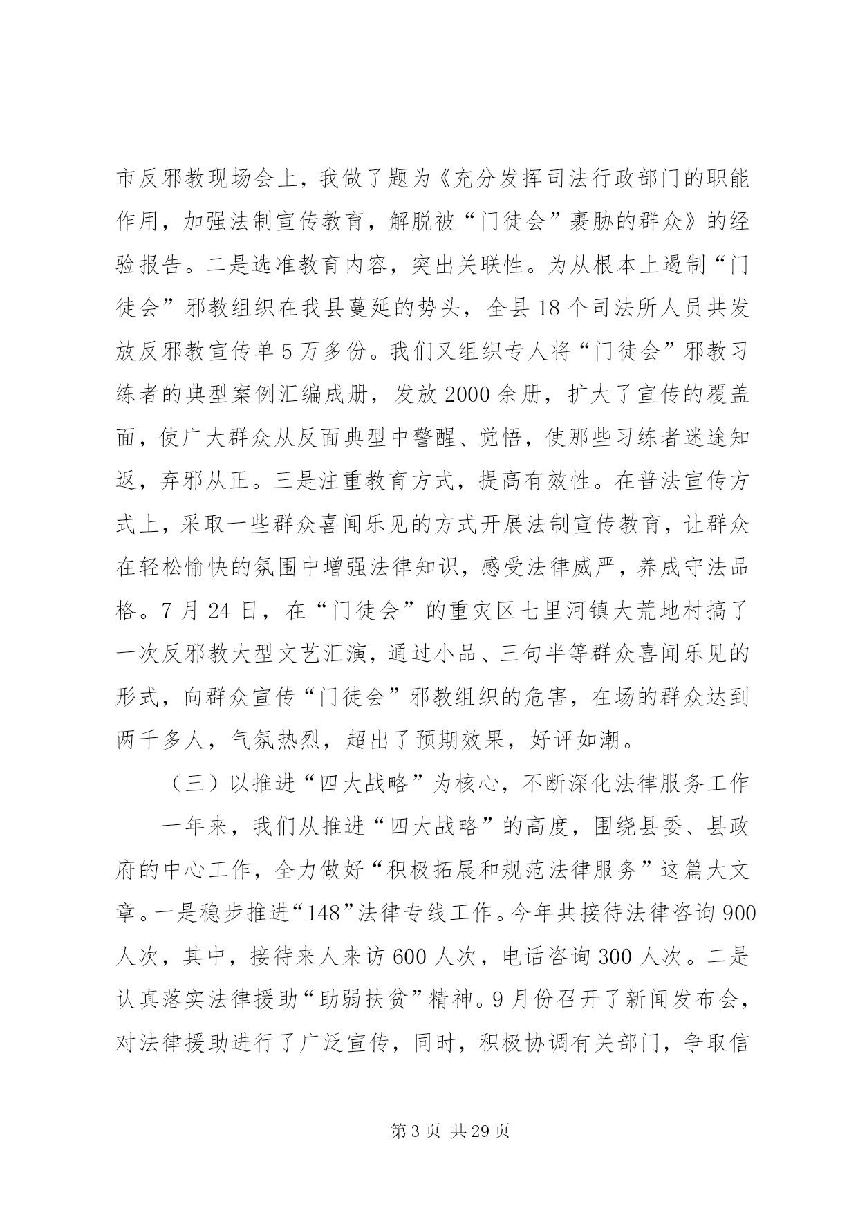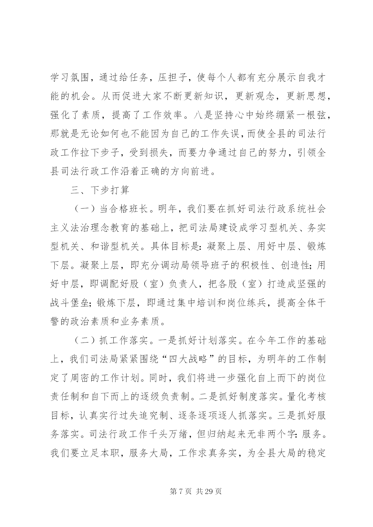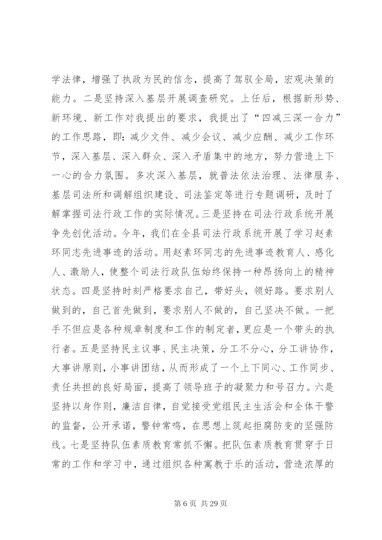 第PAGE\*Arabic\*MERGEFORMAT29页共NUMPAGES\*MERGEFORMAT29页县司法局局长个人述职报告现将本人2006年履行x县司法局局长岗位职责的情况向各位领导、同志们简要汇报如下:一、主要工作我是2006年4月被任命为县司法局局长的,到任这几个月里,我坚持以邓小平理论为指导,积极实践“三个代表”重要思想,在县委、县政府的领导下,带领全县司法行政系统广大干警,大力弘扬“五种精神”,严格依法办事,积极开拓进取,圆满地完成了司法行政的各项工作,为维护全县社会稳定,保证“四大战略”的推进做出了积极的贡献。(一)以维护基层稳定为重点,充分发挥人民调解“第一道防线”的作用为充分发挥人民调解“第一道防线”的作用,我们始终坚持抓基层、抓基础、抓队伍,大力加强司法所规范化建设,建立矛盾纠纷排查、收案登记、督查督办以及调解人员持证上岗、责任追究等一系列行之有效的制度规范,重点完善因人预防、因地预防、因时预防、因事预防的预警机制,健全排查分析机制,落实联动联调机制,强化应急处置机制,切实提高矛盾纠纷化解效能。充分发挥贴近基层、贴近群众、了解民意的优势,坚持“调防结合、以防为主”的方针,注重抓早、抓小、抓苗头,在做好多发性、常见性民间纠纷调解的同时,紧紧围绕县委、县政府的中心工作,以化解群体性、复杂性、易激化以及跨行业、跨部门等影响稳定的矛盾纠纷为重点,深入开展排查调处活动,把问题解决在当地、解决在基层,解决在萌芽状态,真正做到发现得早,化解得了,控制得住,处置得好。今年共调处各类民间纠纷870件,防止矛盾激化40件,防止群体性上访10件,避免、挽回经济损失123万元。此外,对刑释解教人员安置帮教工作也是我们非常重视的一项工作。今年,在进一步加强全县安置帮教组织建设的同时,我们重点对历年排查中一些释解人员情况不明和当年回归的释解人员进行了排查。截至目前,今年我县共回归刑释解教人员112人,帮教率达到100,重新犯罪率始终控制在7以下。(二)以“五五”普法为契机,深入开展法制宣传教育和依法治理工作面对新的形势和任务,围绕提高法制宣传教育和依法治理工作的针对性、关联性、有效性,在以下三个方面花气力,下功夫:一是瞄准教育对象,加强针对性。5月27日,依法治县领导小组在全县集中组织开展了一次大型的法制宣传日活动,共设立法律咨询服务站42个、出动宣传车40辆、发放标语8万条、解答法律咨询2000人次。针对一些被拘留起来的“门徒会”习练者,我们组织司法所人员深入到看守所,面对面地开展帮教活动,以情动人,以理服人。在法理和情理的感召下,当场就有48名习练者表示悔过,并写下了保证书,效果非常明显。9月份,在全市反邪教现场会上,我做了题为《充分发挥司法行政部门的职能作用,加强法制宣传教育,解脱被“门徒会”裹胁的群众》的经验报告。二是选准教育内容,突出关联性。为从根本上遏制“门徒会”邪教组织在我县蔓延的势头,全县18个司法所人员共发放反邪教宣传单5万多份。我们又组织专人将“门徒会”邪教习练者的典型案例汇编成册,发放2000余册,扩大了宣传的覆盖面,使广大群众从反面典型中警醒、觉悟,使那些习练者迷途知返,弃邪从正。三是注重教育方式,提高有效性。在普法宣传方式上,采取一些群众喜闻乐见的方式开展法制宣传教育,让群众在轻松愉快的氛围中增强法律知识,感受法律威严,养成守法品格。7月24日,在“门徒会”的重灾区七里河镇大荒地村搞了一次反邪教大型文艺汇演,通过小品、三句半等群众喜闻乐见的形式,向群众宣传“门徒会”邪教组织的危害,在场的群众达到两千多人,气氛热烈,超出了预期效果,好评如潮。(三)以推进“四大战略”为核心,不断深化法律服务工作一年来,我们从推进“四大战略”的高度,围绕县委、县政府的中心工作,全力做好“积极拓展和规范法律服务”这篇大文章。一是稳步推进“148”法律专线工作。今年共接待法律咨询900人次,其中,接待来人来访600人次,电话咨询300人次。二是认真落实法律援助“助弱扶贫”精神。9月份召开了新闻发布会,对法律援助进行了广泛宣传,同时,积极协调有关部门,争取信息共享、工作协助、资金支持。今年共受理各类法律援助案件7件,其中,刑事类5件,民事类2件。三是积极发挥律师、法律服务工作者职能。继续组织律师当好政府的法律顾问。此外,以满足群众需求为出发点,组织律师、法律工作者参与民事纠纷的调解工作。今年共为900名当事人提供了法律咨询,受聘担任法律顾问23家,代理案件105件,挽回经济损失近300万元。四是认真开展“公证队伍教育规范树形象”活动。组织公证管理人员、公证员严格按照预定方案开展学习动员、自查自纠阶段活动,采取召开座谈会等形式广泛征求意见和建议,查找不足,扎实地推动了公证工作的开展。今年,公证处共办理公证2
