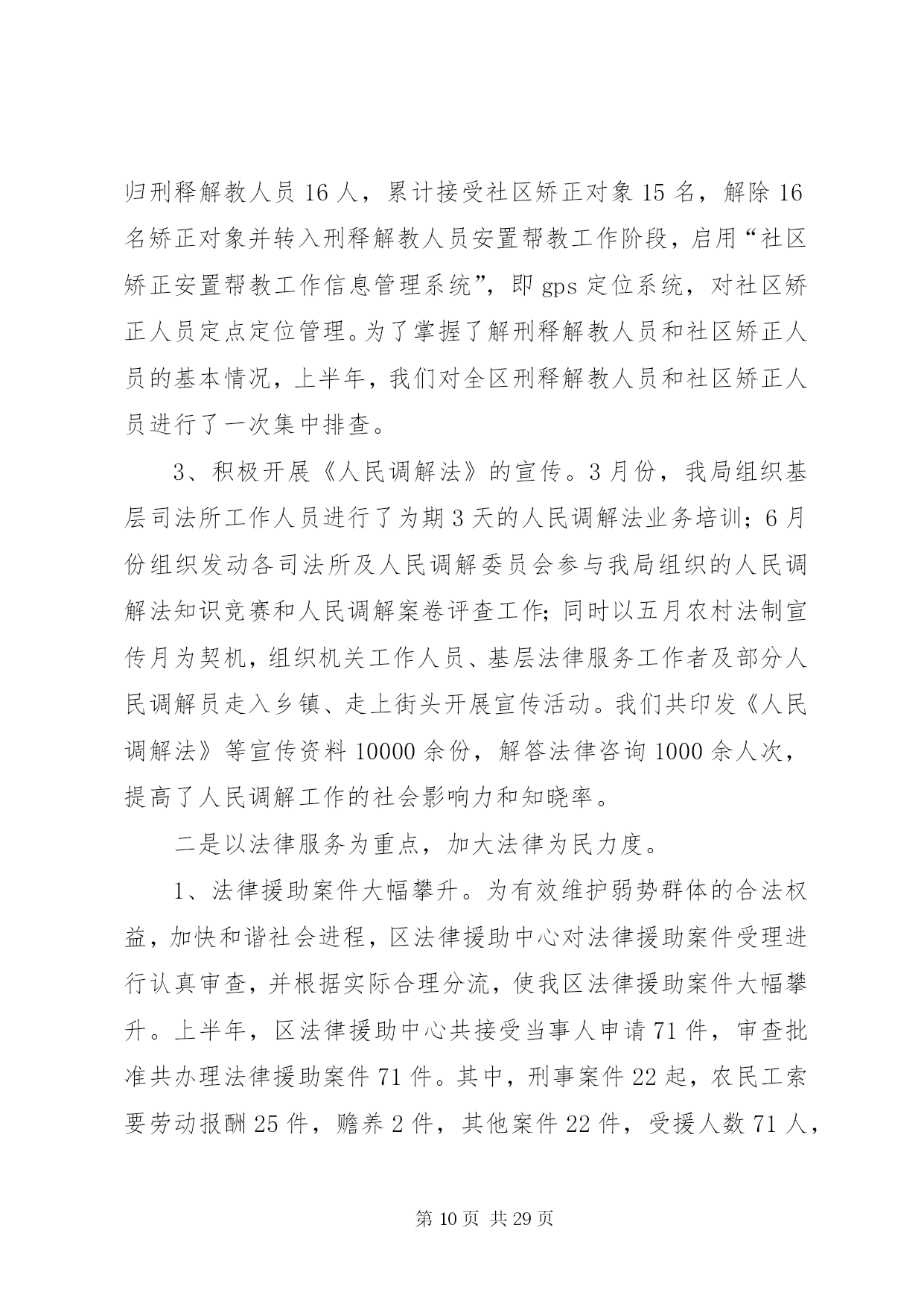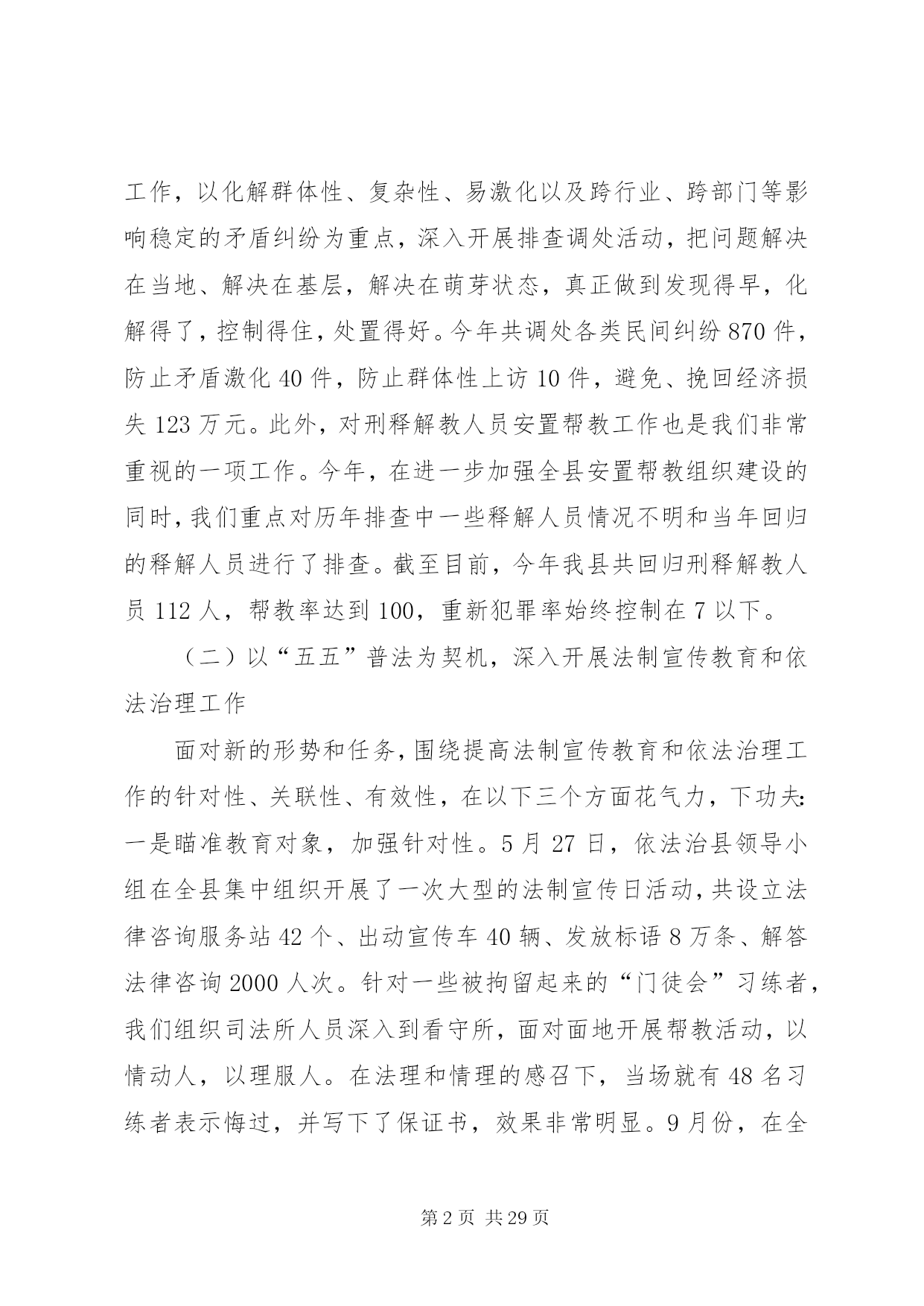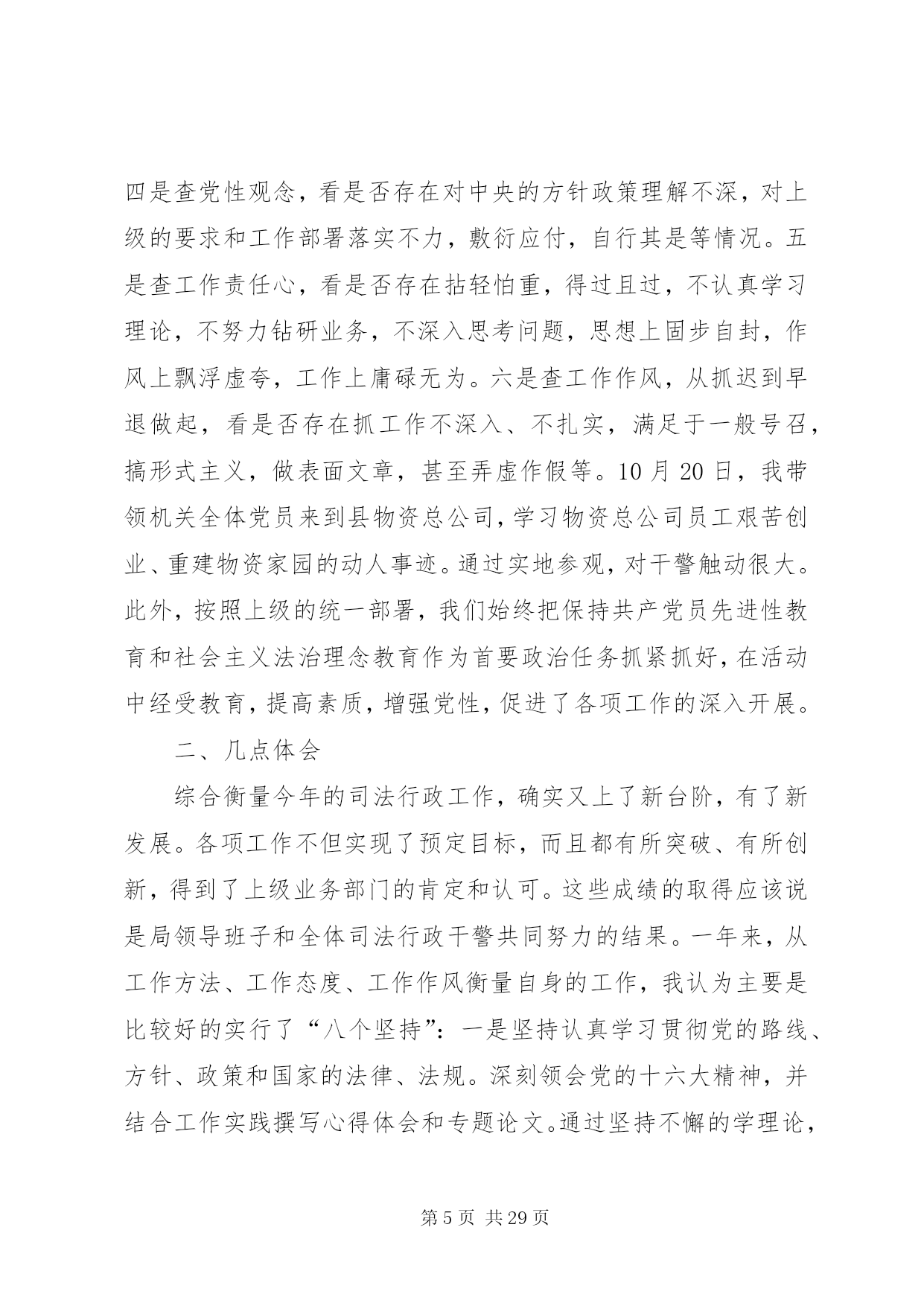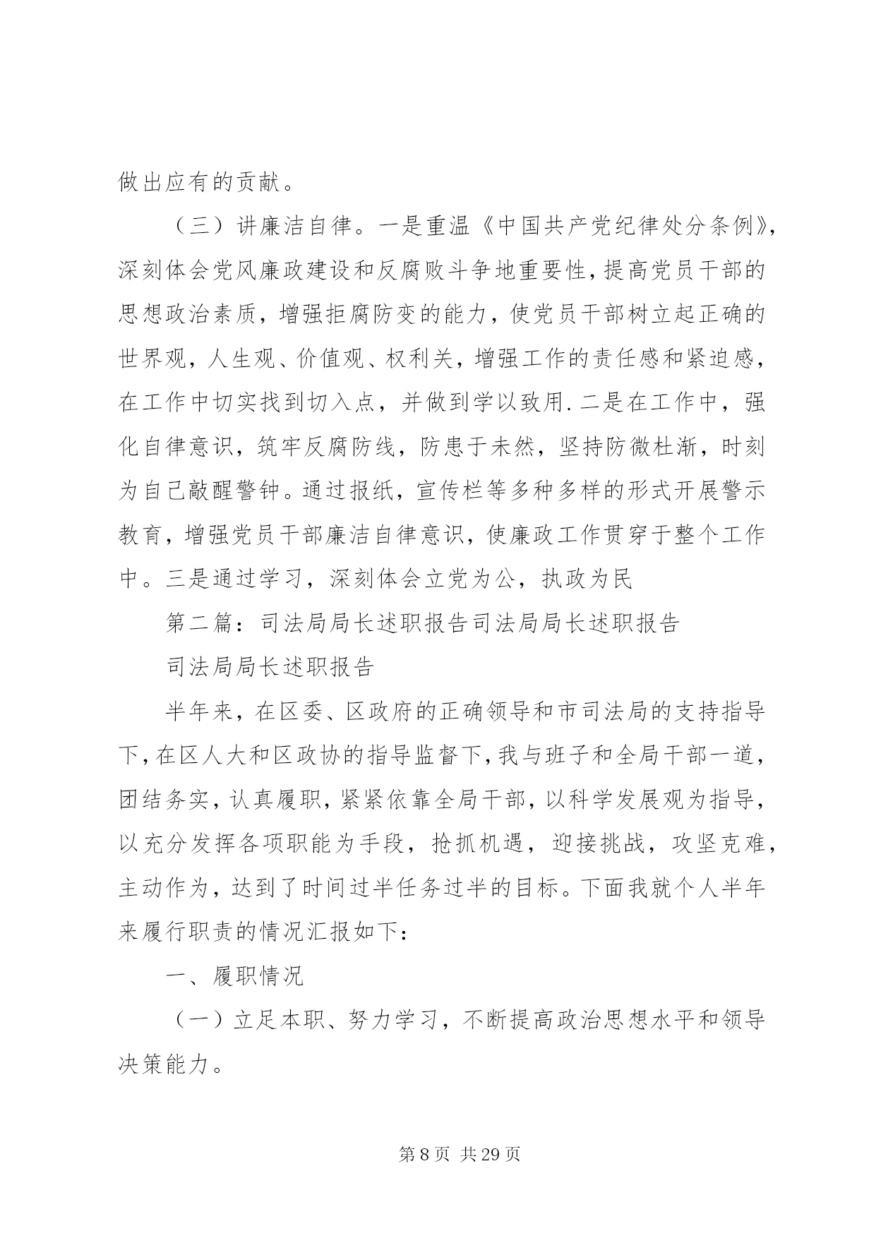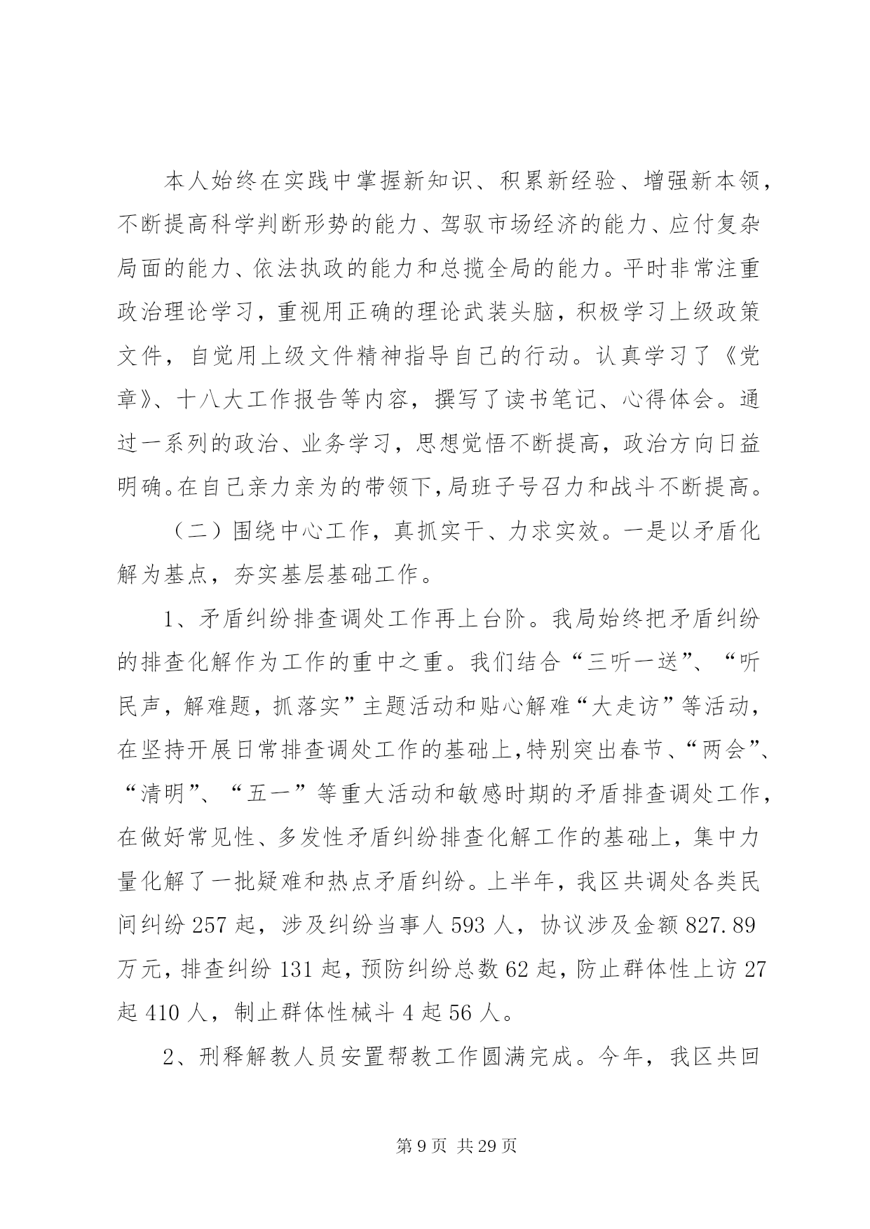 第PAGE\*Arabic\*MERGEFORMAT29页共NUMPAGES\*MERGEFORMAT29页县司法局局长个人述职报告现将本人2006年履行x县司法局局长岗位职责的情况向各位领导、同志们简要汇报如下:一、主要工作我是2006年4月被任命为县司法局局长的,到任这几个月里,我坚持以邓小平理论为指导,积极实践“三个代表”重要思想,在县委、县政府的领导下,带领全县司法行政系统广大干警,大力弘扬“五种精神”,严格依法办事,积极开拓进取,圆满地完成了司法行政的各项工作,为维护全县社会稳定,保证“四大战略”的推进做出了积极的贡献。(一)以维护基层稳定为重点,充分发挥人民调解“第一道防线”的作用为充分发挥人民调解“第一道防线”的作用,我们始终坚持抓基层、抓基础、抓队伍,大力加强司法所规范化建设,建立矛盾纠纷排查、收案登记、督查督办以及调解人员持证上岗、责任追究等一系列行之有效的制度规范,重点完善因人预防、因地预防、因时预防、因事预防的预警机制,健全排查分析机制,落实联动联调机制,强化应急处置机制,切实提高矛盾纠纷化解效能。充分发挥贴近基层、贴近群众、了解民意的优势,坚持“调防结合、以防为主”的方针,注重抓早、抓小、抓苗头,在做好多发性、常见性民间纠纷调解的同时,紧紧围绕县委、县政府的中心工作,以化解群体性、复杂性、易激化以及跨行业、跨部门等影响稳定的矛盾纠纷为重点,深入开展排查调处活动,把问题解决在当地、解决在基层,解决在萌芽状态,真正做到发现得早,化解得了,控制得住,处置得好。今年共调处各类民间纠纷870件,防止矛盾激化40件,防止群体性上访10件,避免、挽回经济损失123万元。此外,对刑释解教人员安置帮教工作也是我们非常重视的一项工作。今年,在进一步加强全县安置帮教组织建设的同时,我们重点对历年排查中一些释解人员情况不明和当年回归的释解人员进行了排查。截至目前,今年我县共回归刑释解教人员112人,帮教率达到100,重新犯罪率始终控制在7以下。(二)以“五五”普法为契机,深入开展法制宣传教育和依法治理工作面对新的形势和任务,围绕提高法制宣传教育和依法治理工作的针对性、关联性、有效性,在以下三个方面花气力,下功夫:一是瞄准教育对象,加强针对性。5月27日,依法治县领导小组在全县集中组织开展了一次大型的法制宣传日活动,共设立法律咨询服务站42个、出动宣传车40辆、发放标语8万条、解答法律咨询2000人次。针对一些被拘留起来的“门徒会”习练者,我们组织司法所人员深入到看守所,面对面地开展帮教活动,以情动人,以理服人。在法理和情理的感召下,当场就有48名习练者表示悔过,并写下了保证书,效果非常明显。9月份,在全市反邪教现场会上,我做了题为《充分发挥司法行政部门的职能作用,加强法制宣传教育,解脱被“门徒会”裹胁的群众》的经验报告。二是选准教育内容,突出关联性。为从根本上遏制“门徒会”邪教组织在我县蔓延的势头,全县18个司法所人员共发放反邪教宣传单5万多份。我们又组织专人将“门徒会”邪教习练者的典型案例汇编成册,发放2000余册,扩大了宣传的覆盖面,使广大群众从反面典型中警醒、觉悟,使那些习练者迷途知返,弃邪从正。三是注重教育方式,提高有效性。在普法宣传方式上,采取一些群众喜闻乐见的方式开展法制宣传教育,让群众在轻松愉快的氛围中增强法律知识,感受法律威严,养成守法品格。7月24日,在“门徒会”的重灾区七里河镇大荒地村搞了一次反邪教大型文艺汇演,通过小品、三句半等群众喜闻乐见的形式,向群众宣传“门徒会”邪教组织的危害,在场的群众达到两千多人,气氛热烈,超出了预期效果,好评如潮。(三)以推进“四大战略”为核心,不断深化法律服务工作一年来,我们从推进“四大战略”的高度,围绕县委、县政府的中心工作,全力做好“积极拓展和规范法律服务”这篇大文章。一是稳步推进“148”法律专线工作。今年共接待法律咨询900人次,其中,接待来人来访600人次,电话咨询300人次。二是认真落实法律援助“助弱扶贫”精神。9月份召开了新闻发布会,对法律援助进行了广泛宣传,同时,积极协调有关部门,争取信息共享、工作协助、资金支持。今年共受理各类法律援助案件7件,其中,刑事类5件,民事类2件。三是积极发挥律师、法律服务工作者职能。继续组织律师当好政府的法律顾问。此外,以满足群众需求为出发点,组织律师、法律工作者参与民事纠纷的调解工作。今年共为900名当事人提供了法律咨询,受聘担任法律顾问23家,代理案件105件,挽回经济损失近300万元。四是认真开展“公证队伍教育规范树形象”活动。组织公证管理人员、公证员严格按照预定方案开展学习动员、自查自纠阶段活动,采取召开座谈会等形式广泛征求意见和建议,查找不足,扎实地推动了公证工作的开展。今年,公证处共办理公证2