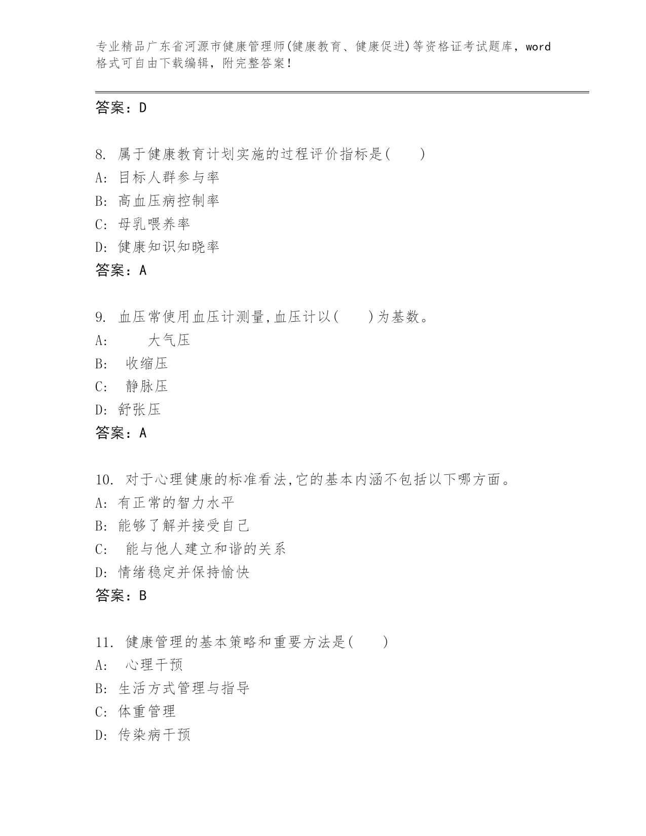 优选广东省河源市健康管理师(健康教育、健康促进)等资格证考试通用题库及答案(最新)